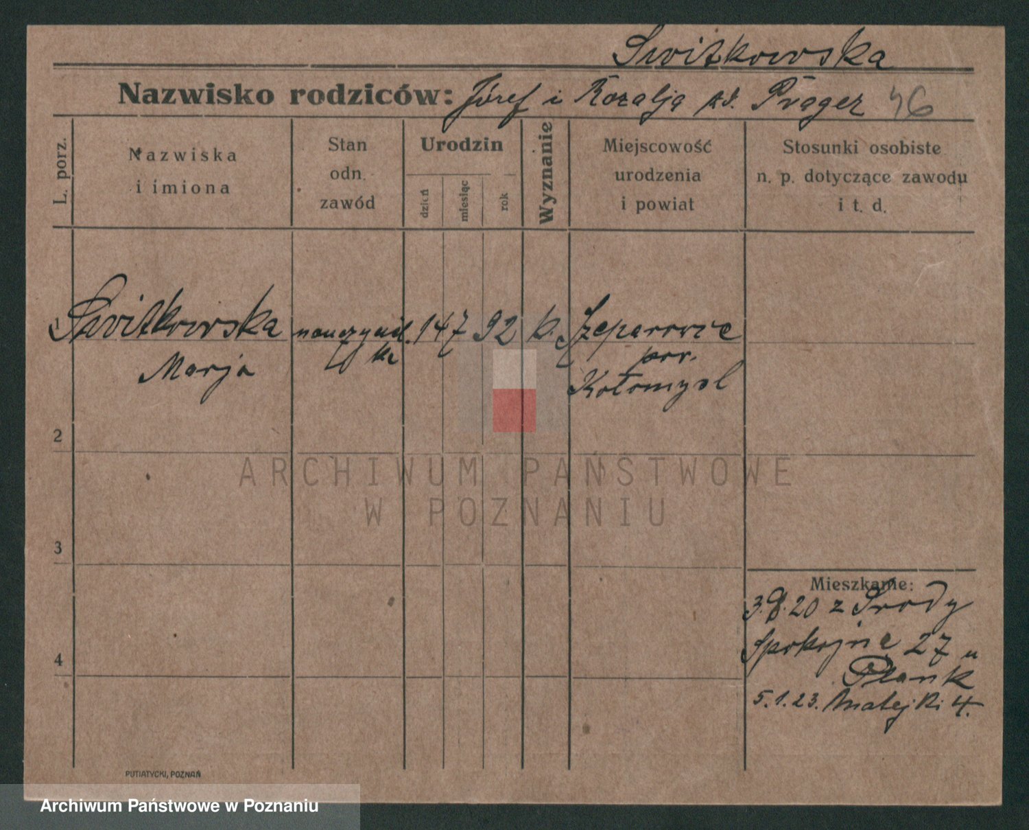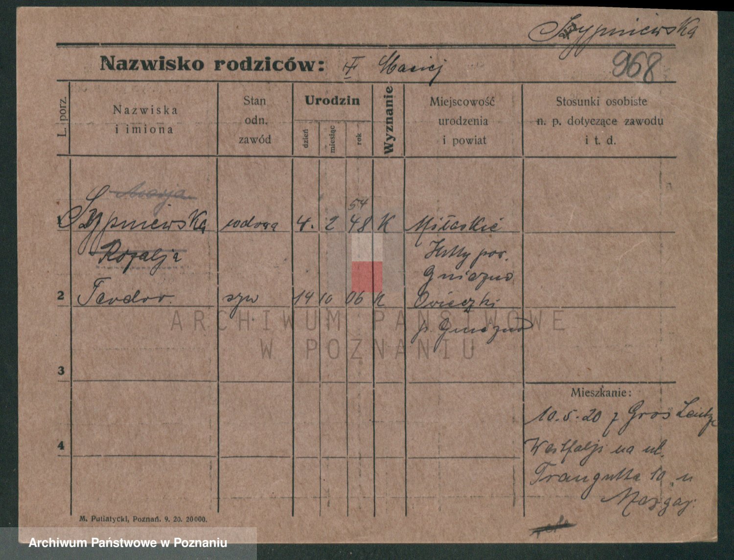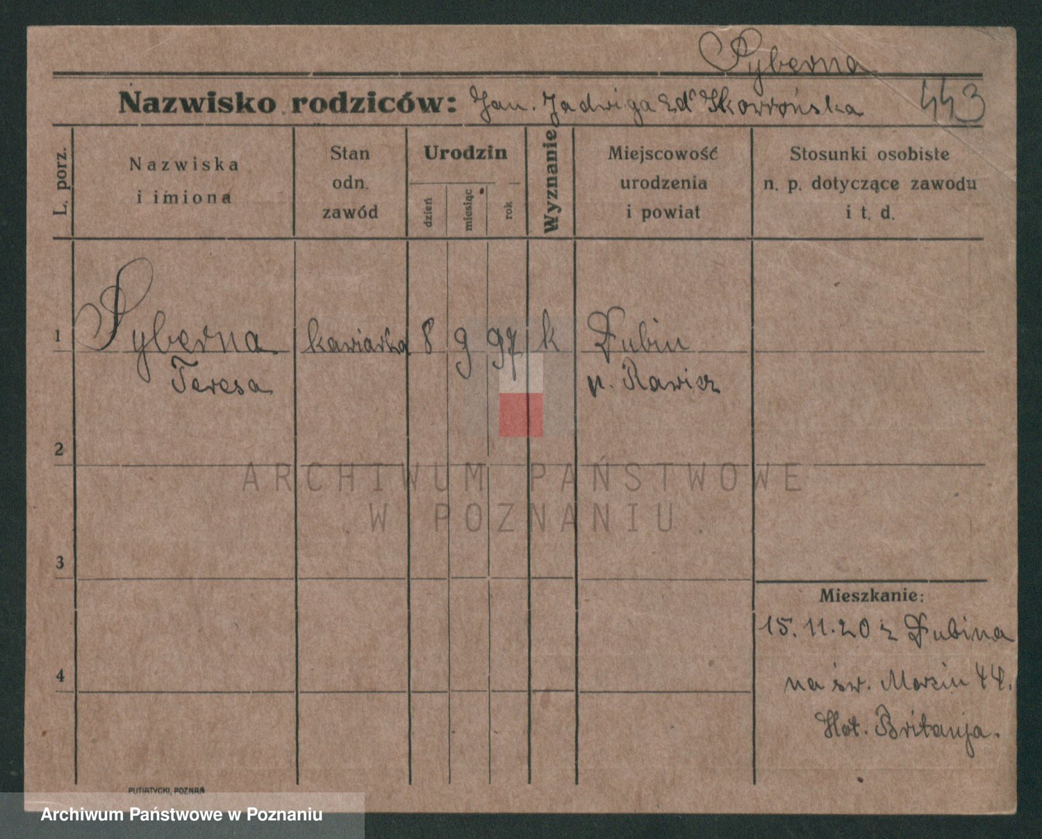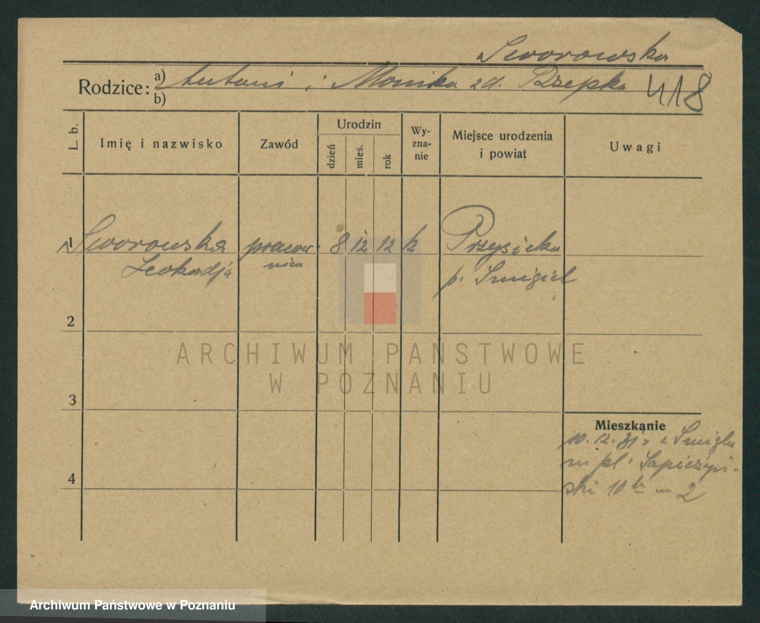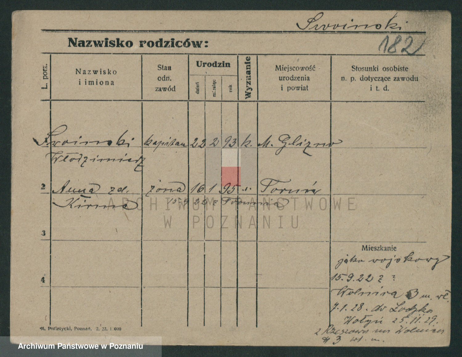 Podgląd karty osobowej dostępny jest po kliknięciu na nazwisko lub ikonkę karty. Można dokonywać powiększenia (ikony na górze) lub przechodzić między kolejnymi skanami (strzałki po bokach).