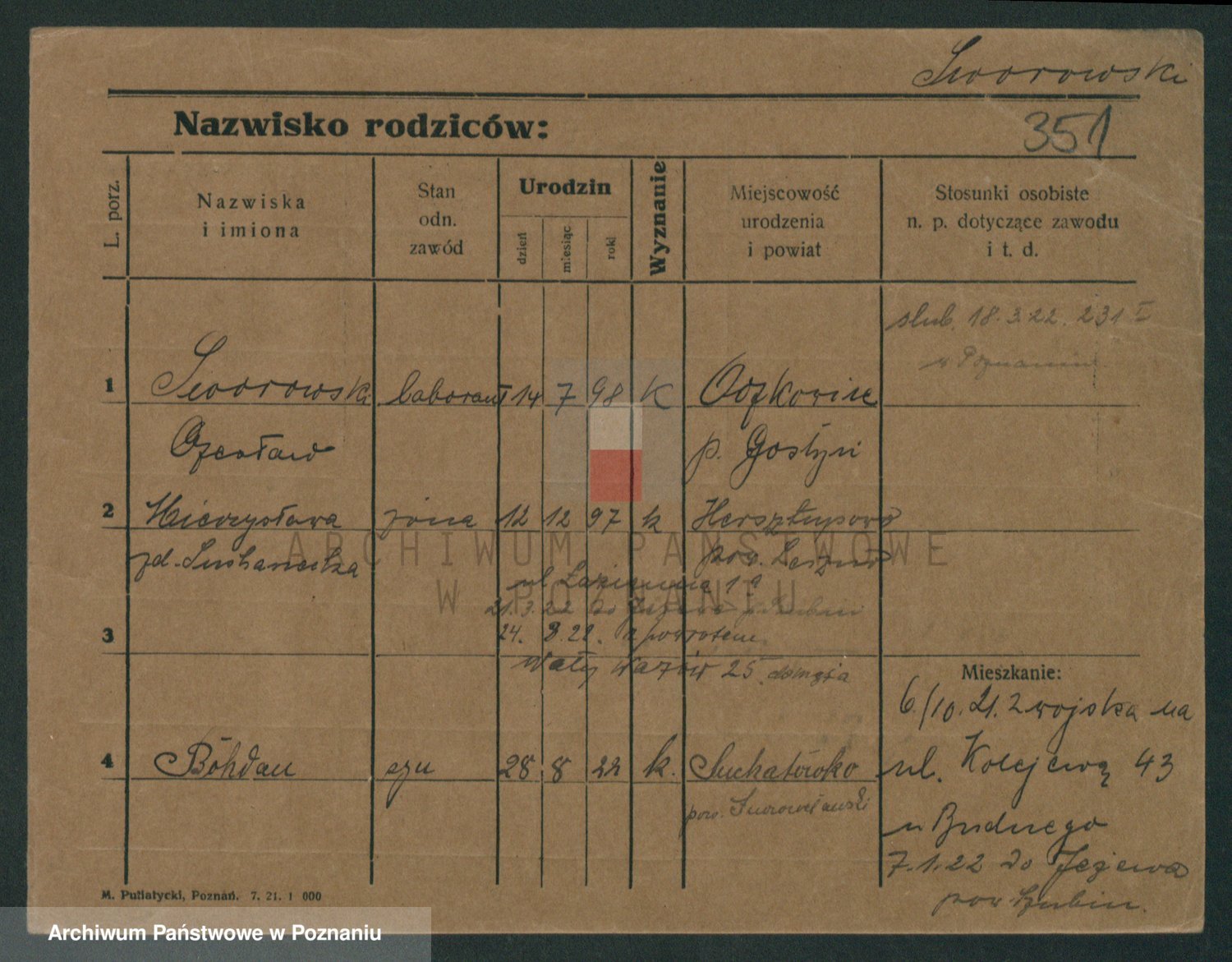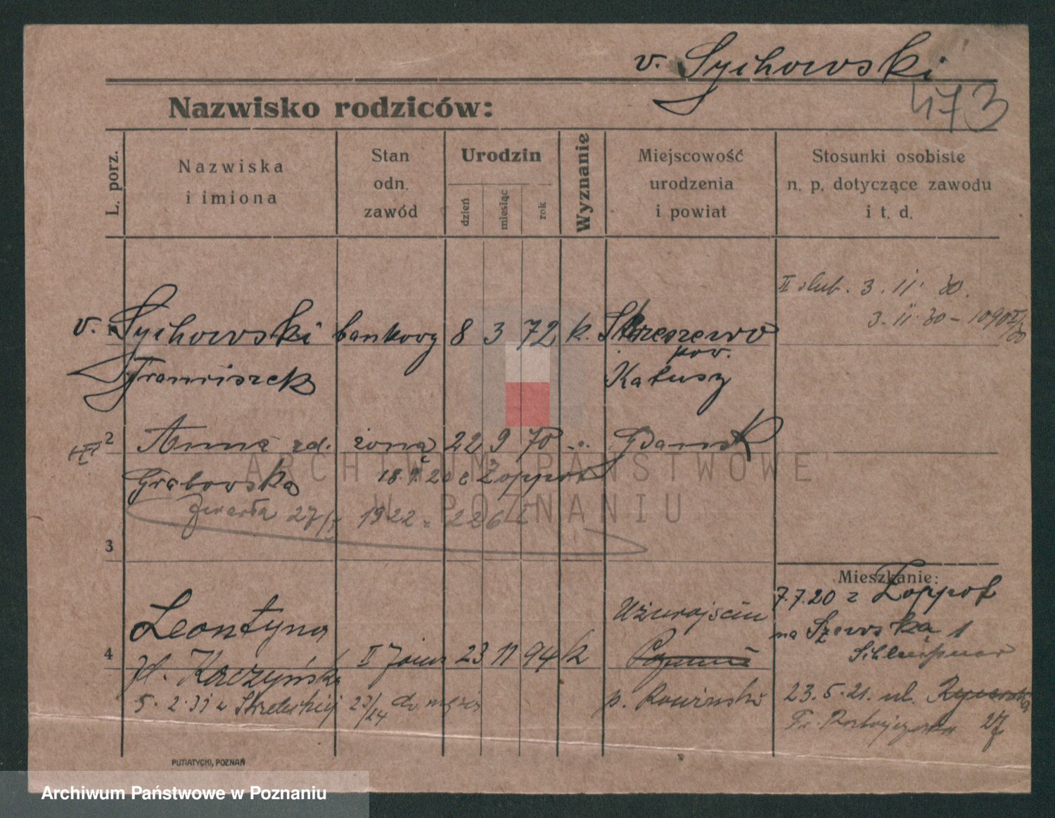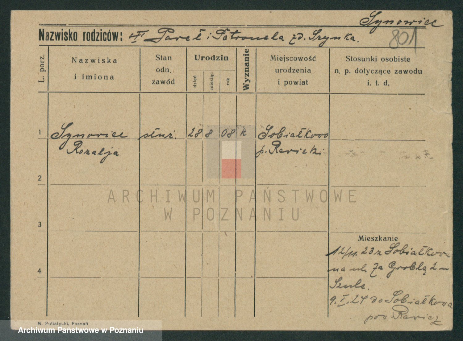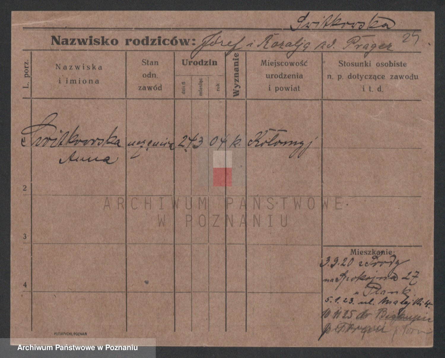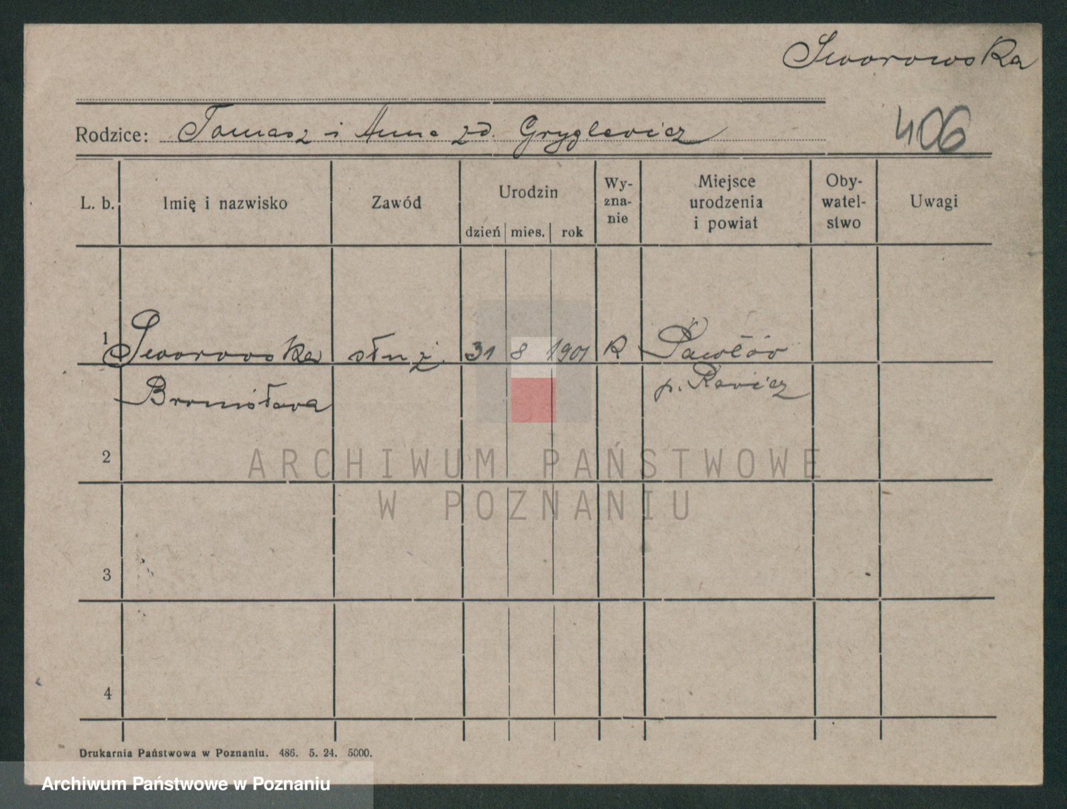 Podgląd karty osobowej dostępny jest po kliknięciu na nazwisko lub ikonkę karty. Można dokonywać powiększenia (ikony na górze) lub przechodzić między kolejnymi skanami (strzałki po bokach).