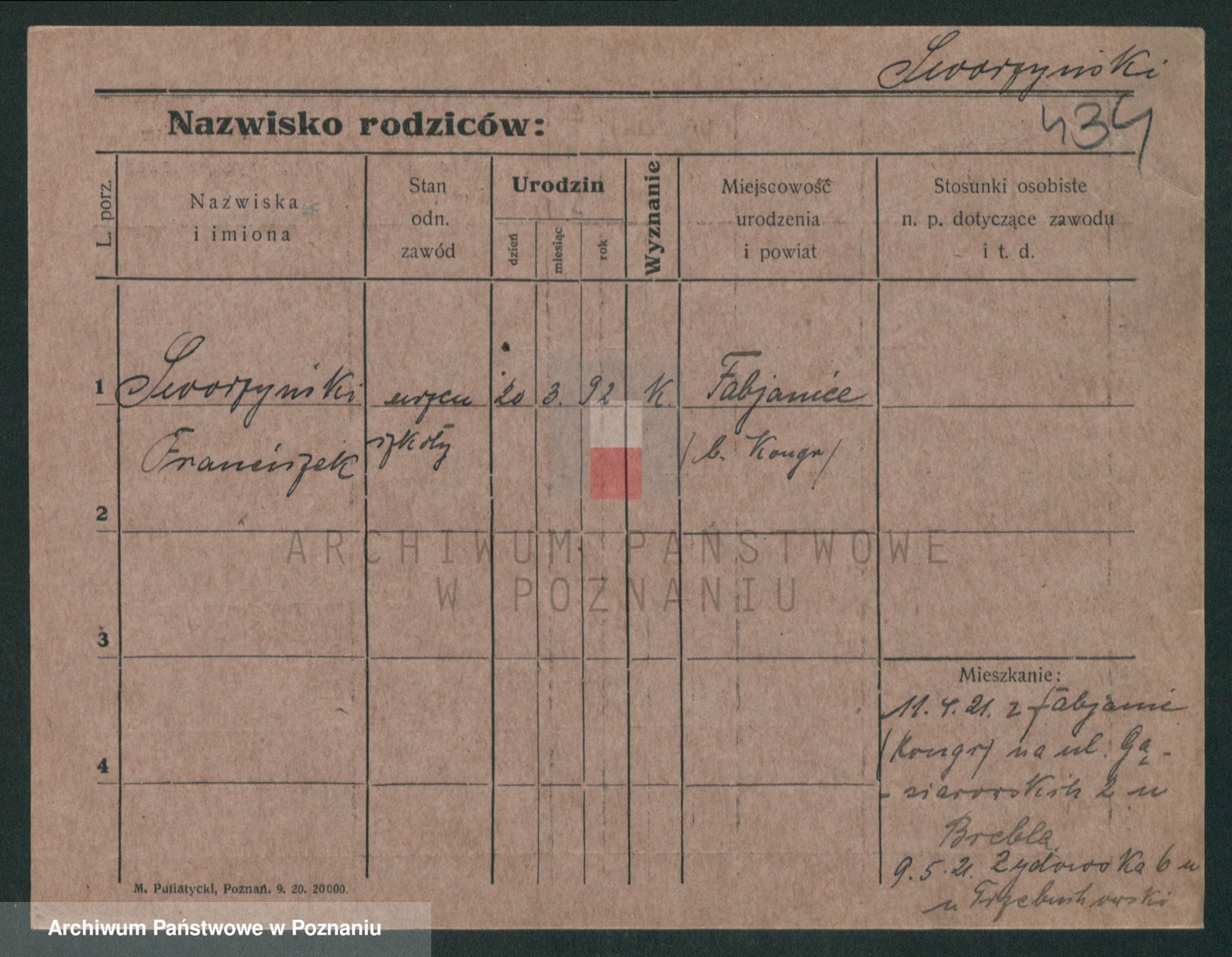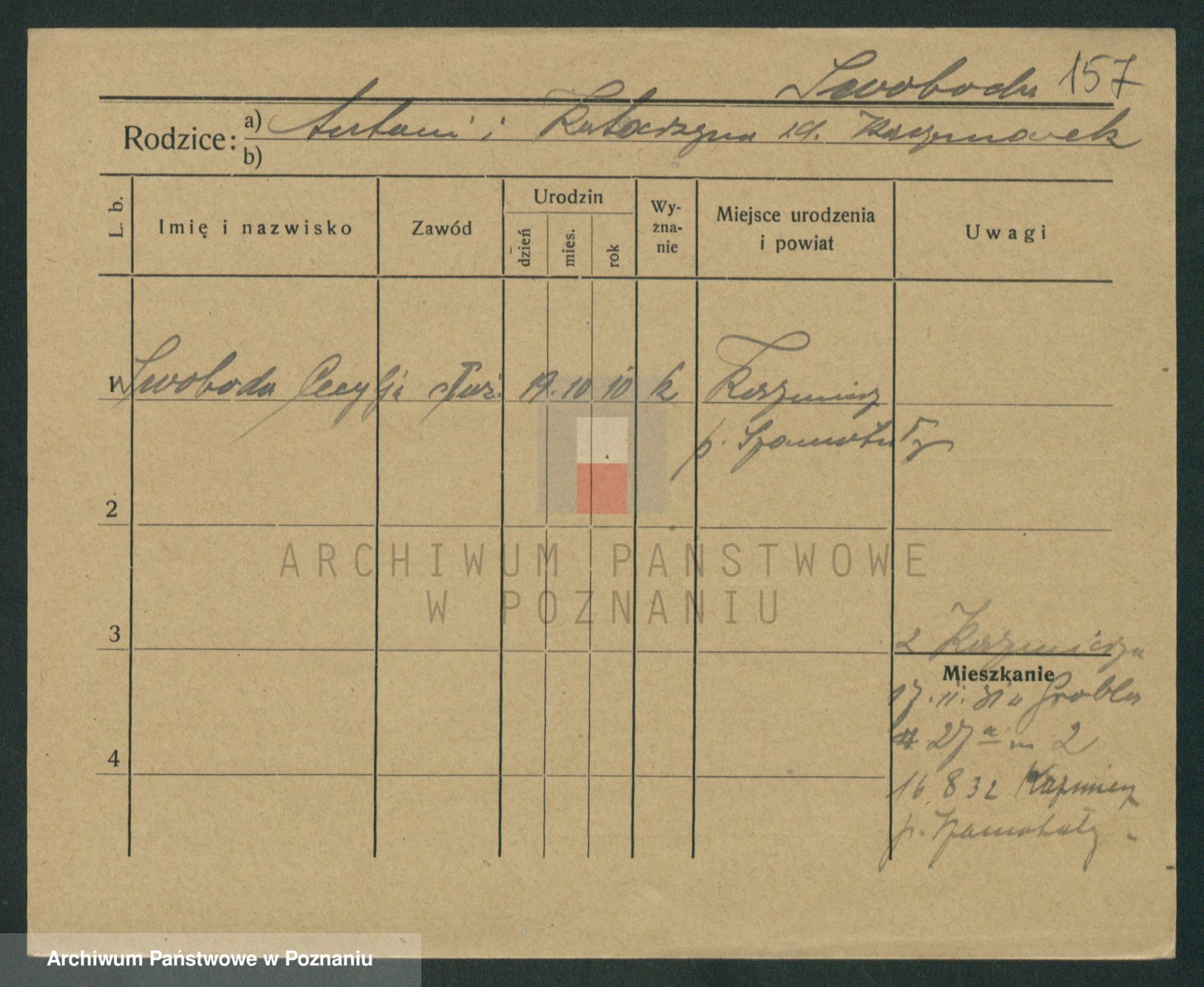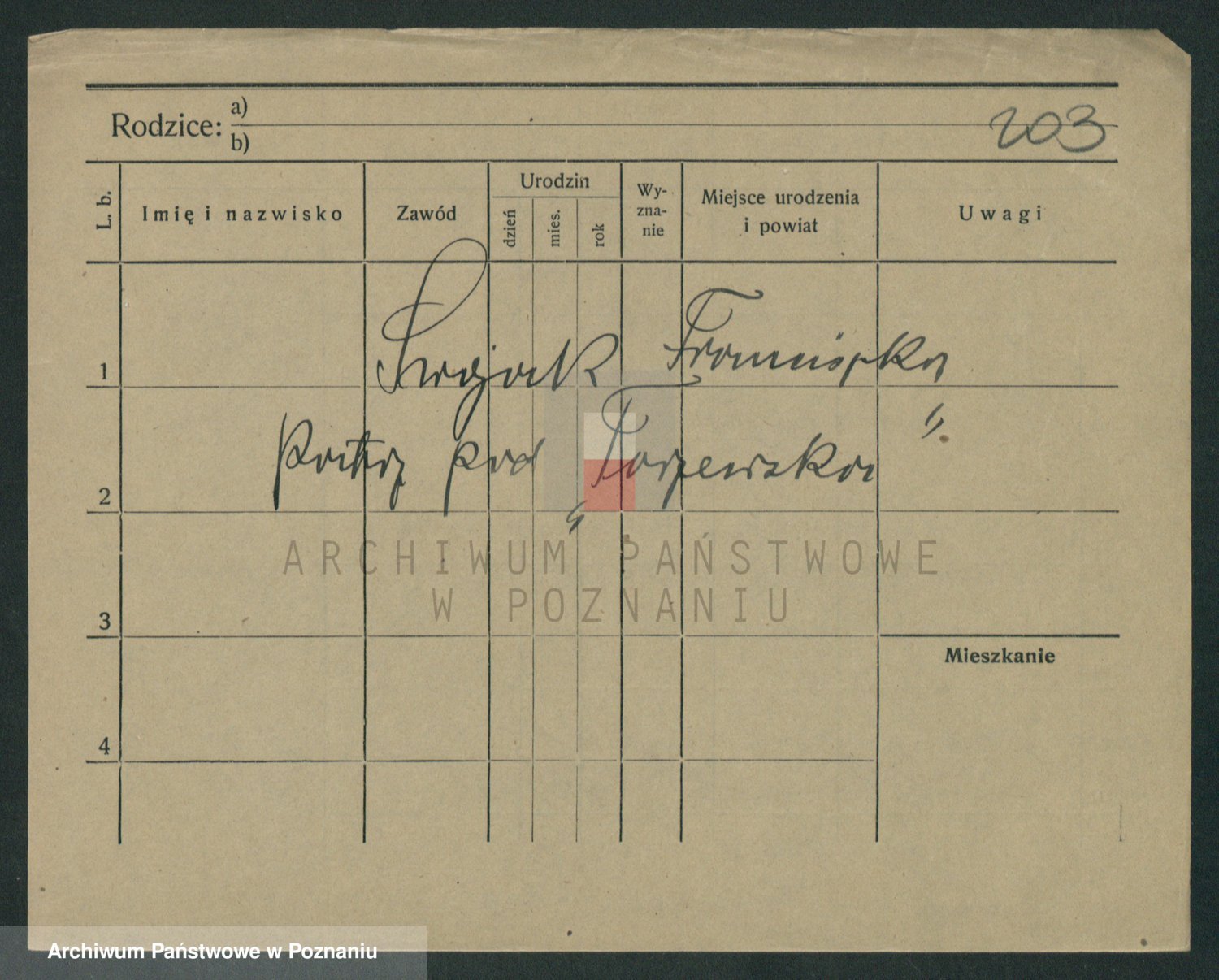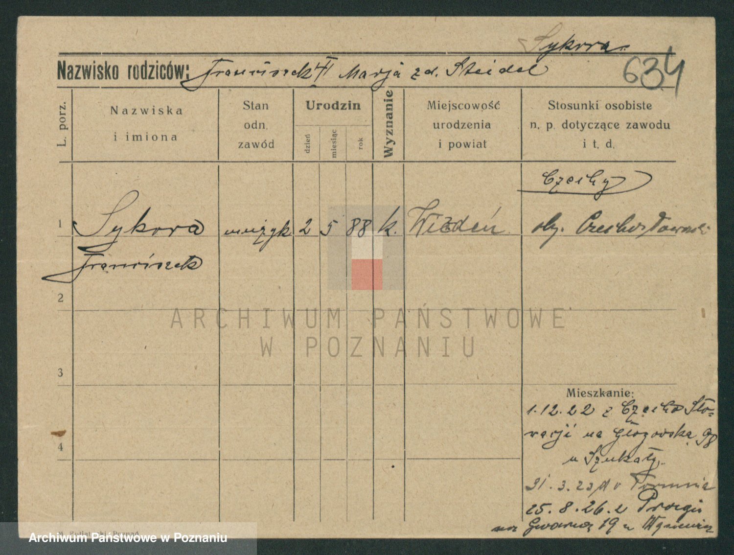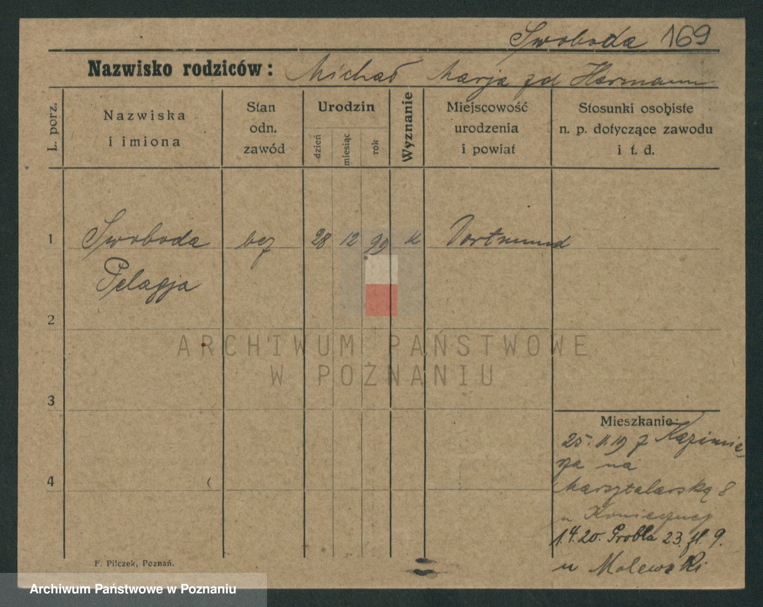 Podgląd karty osobowej dostępny jest po kliknięciu na nazwisko lub ikonkę karty. Można dokonywać powiększenia (ikony na górze) lub przechodzić między kolejnymi skanami (strzałki po bokach).