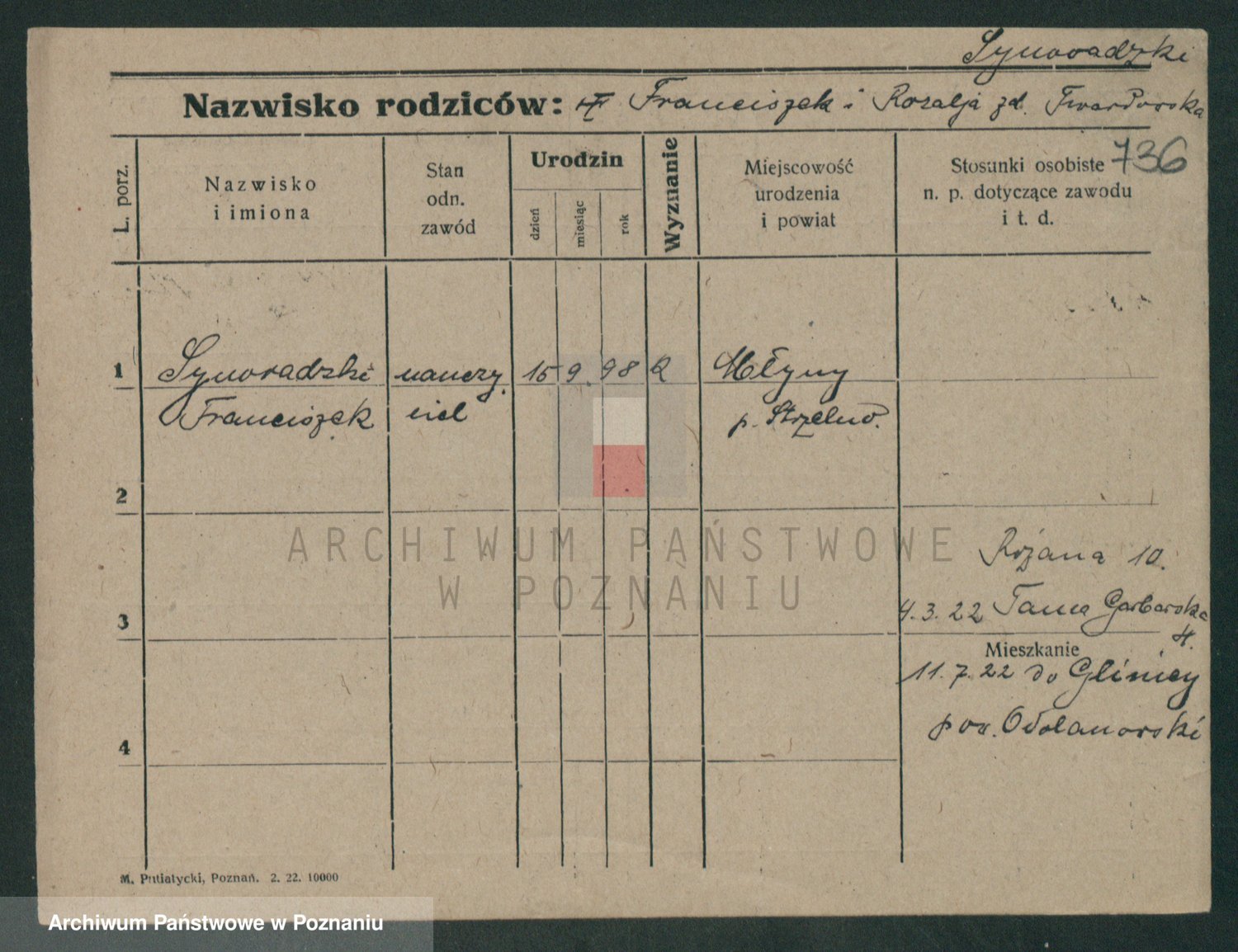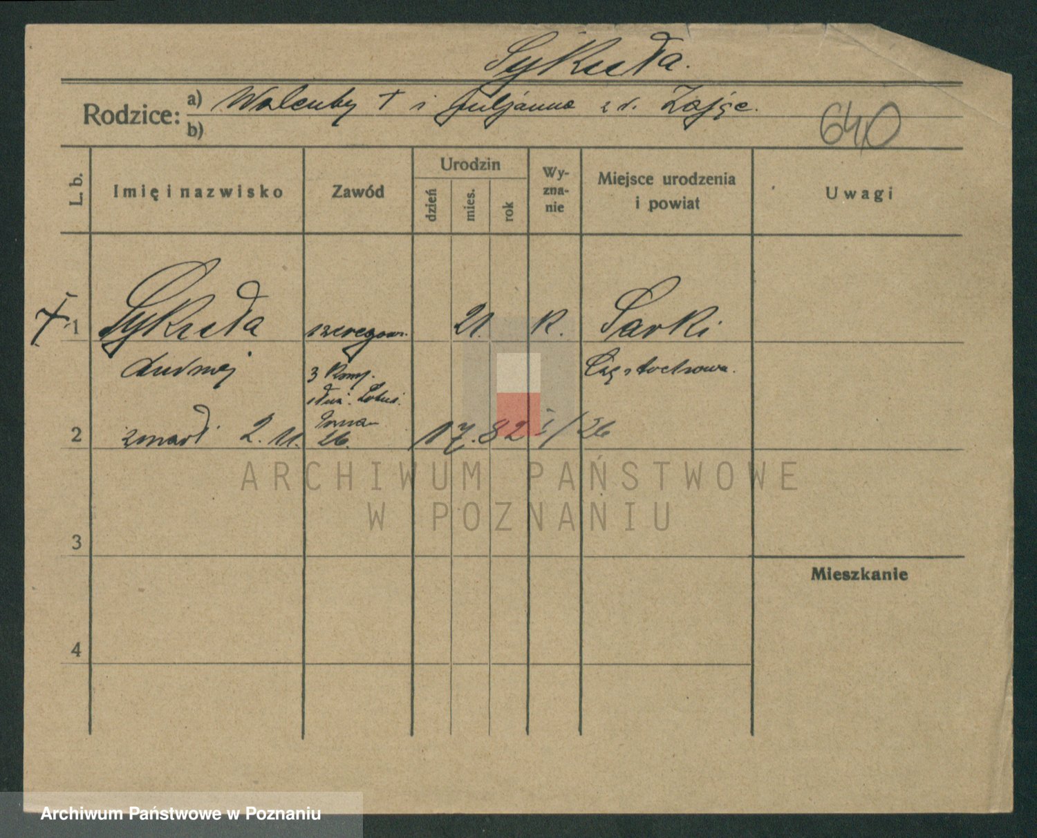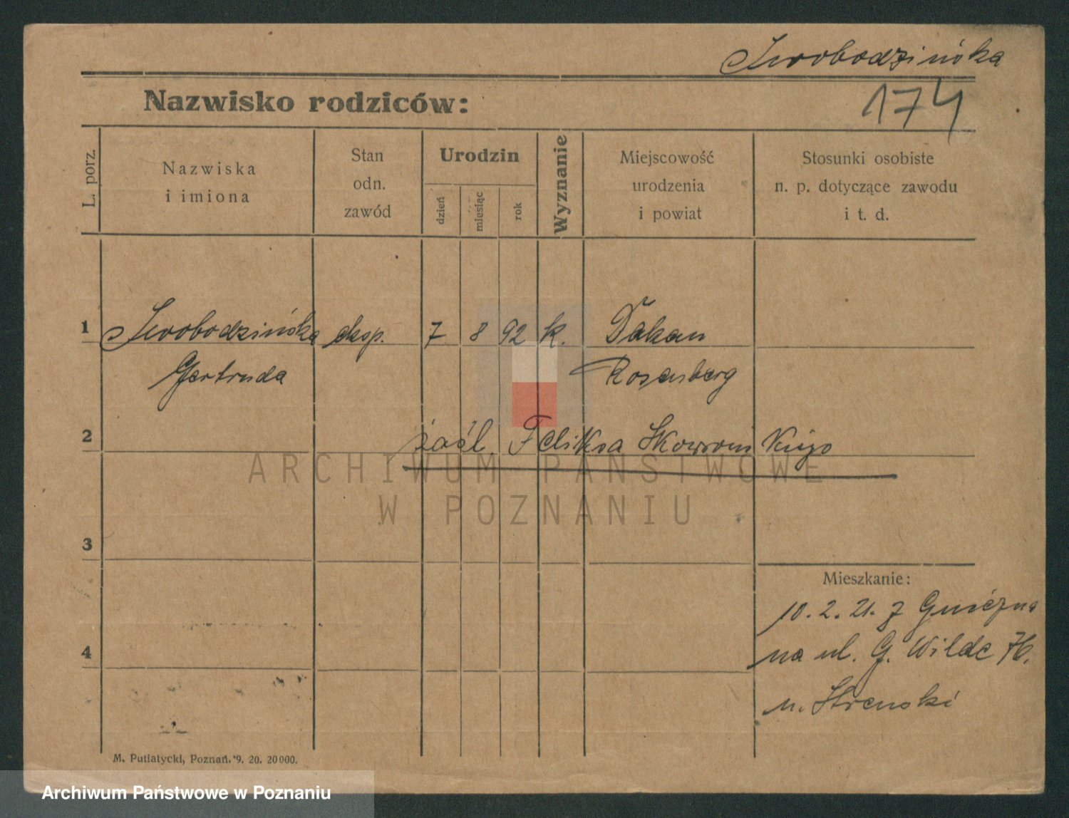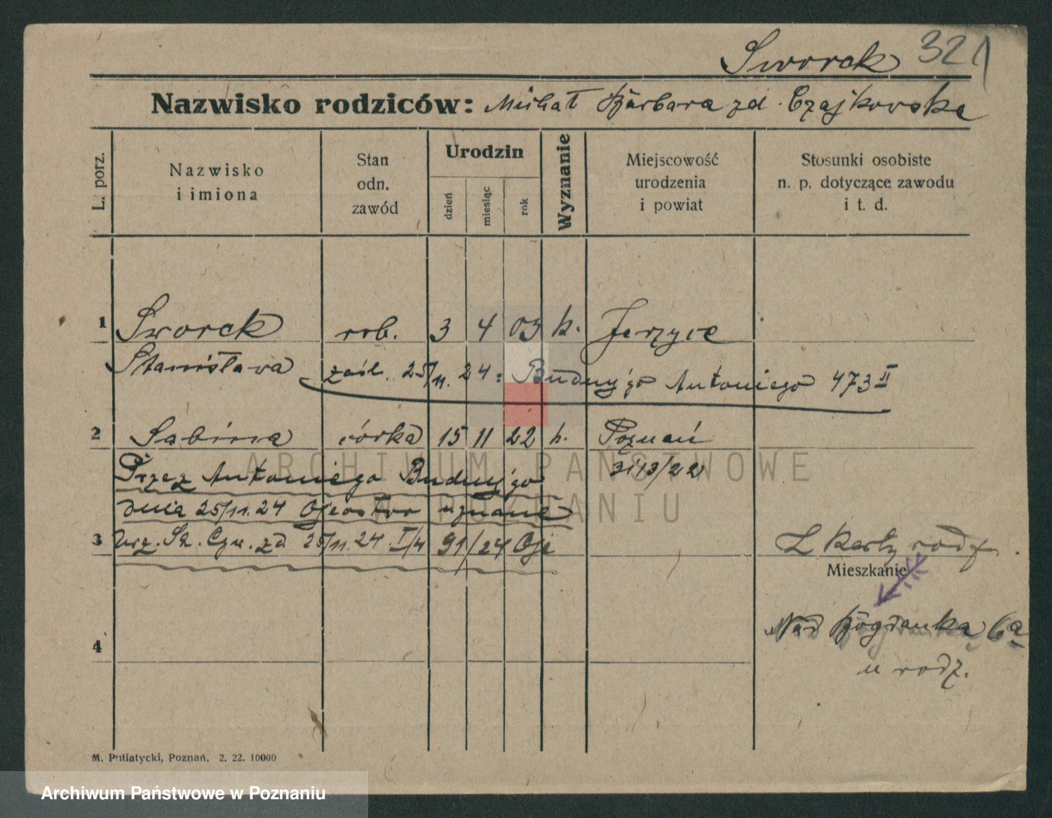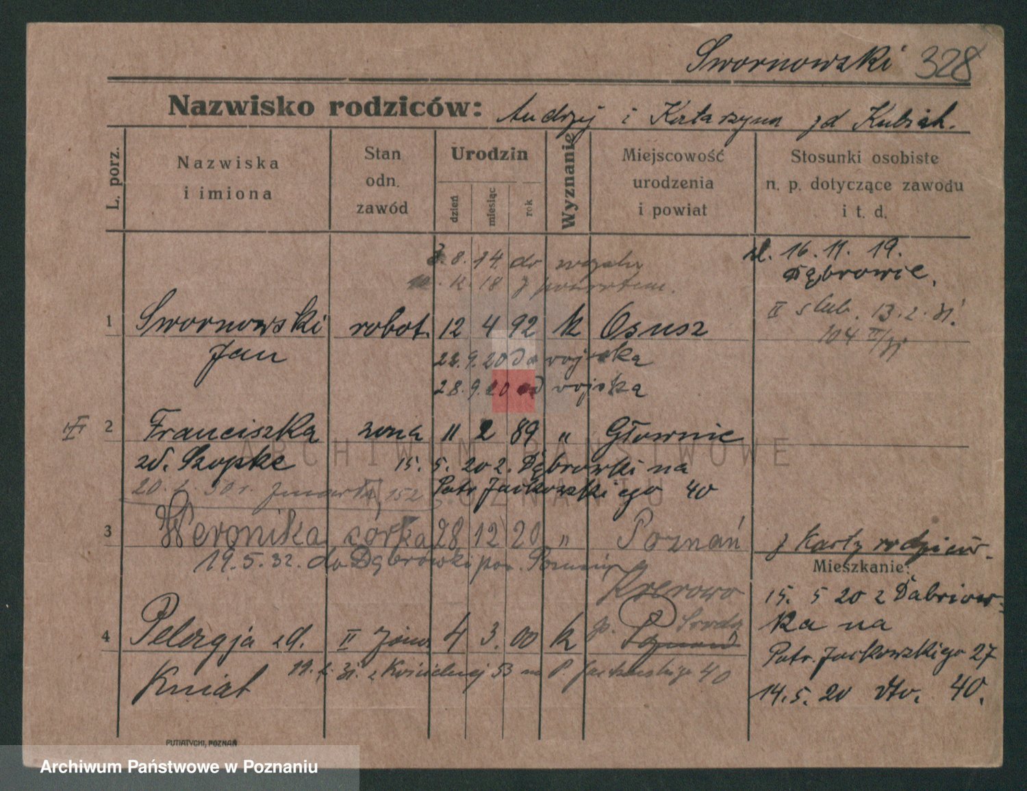 Podgląd karty osobowej dostępny jest po kliknięciu na nazwisko lub ikonkę karty. Można dokonywać powiększenia (ikony na górze) lub przechodzić między kolejnymi skanami (strzałki po bokach).