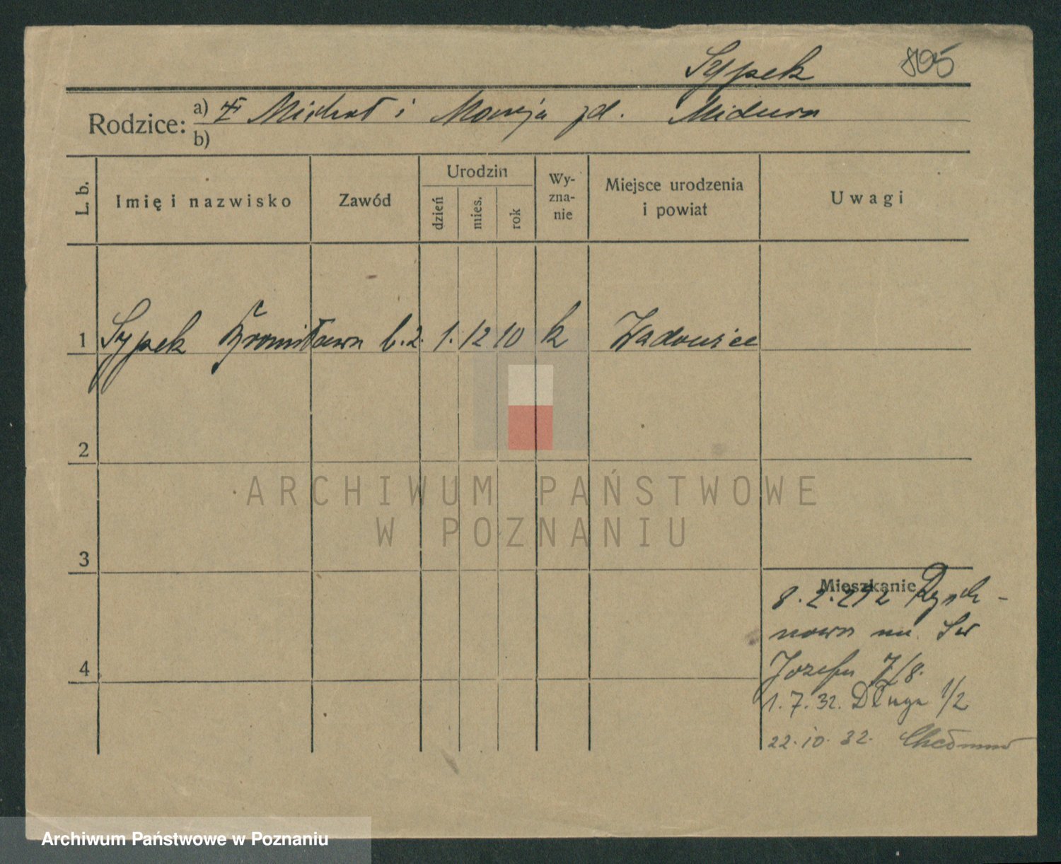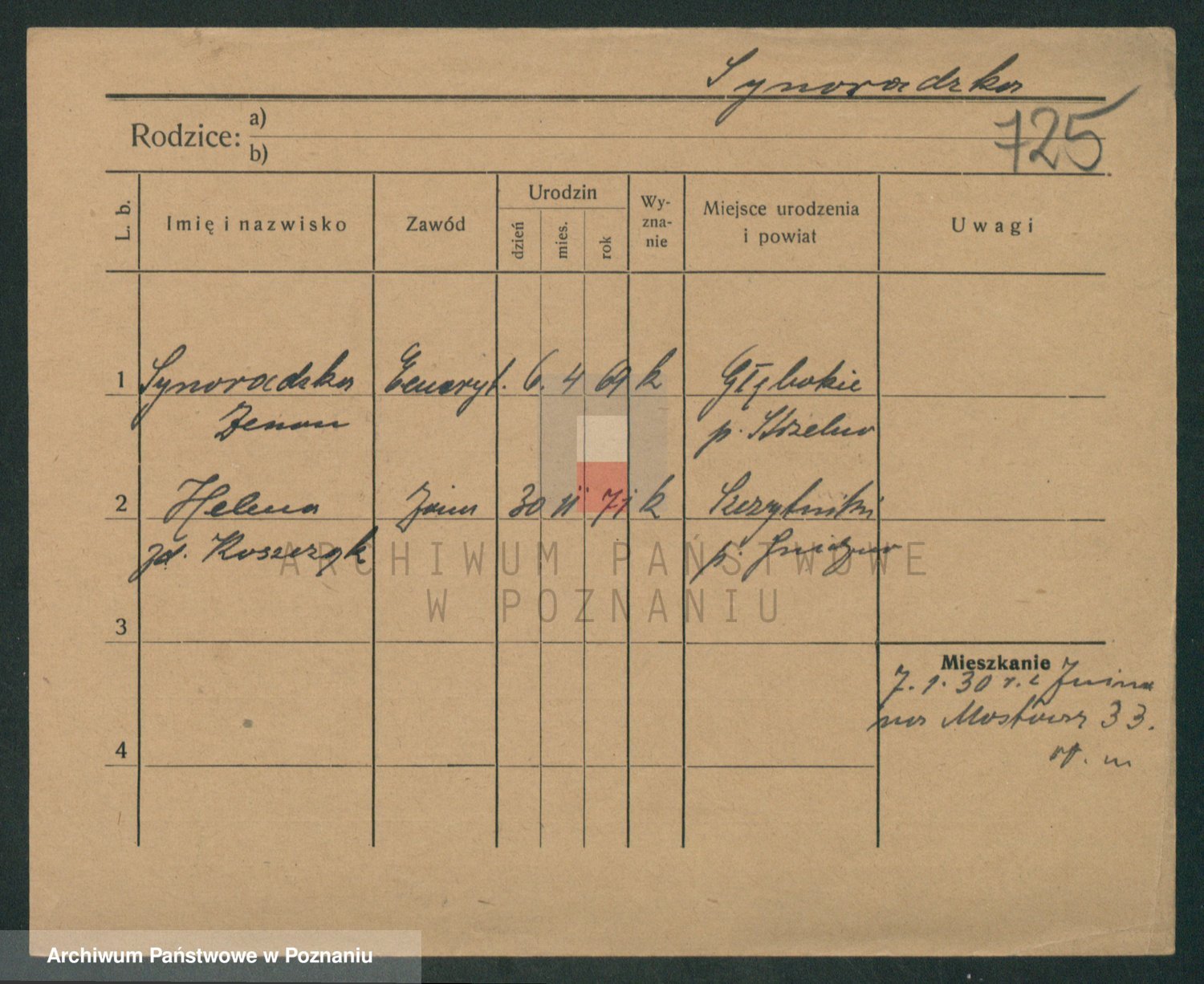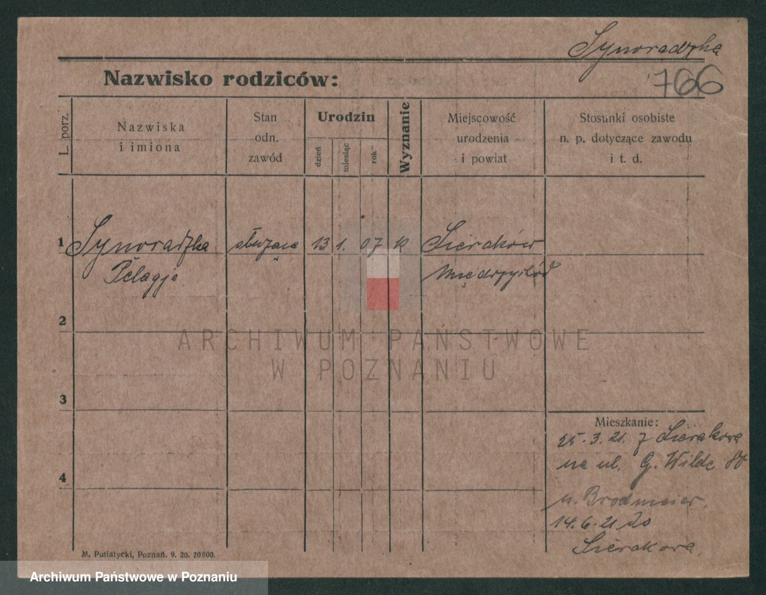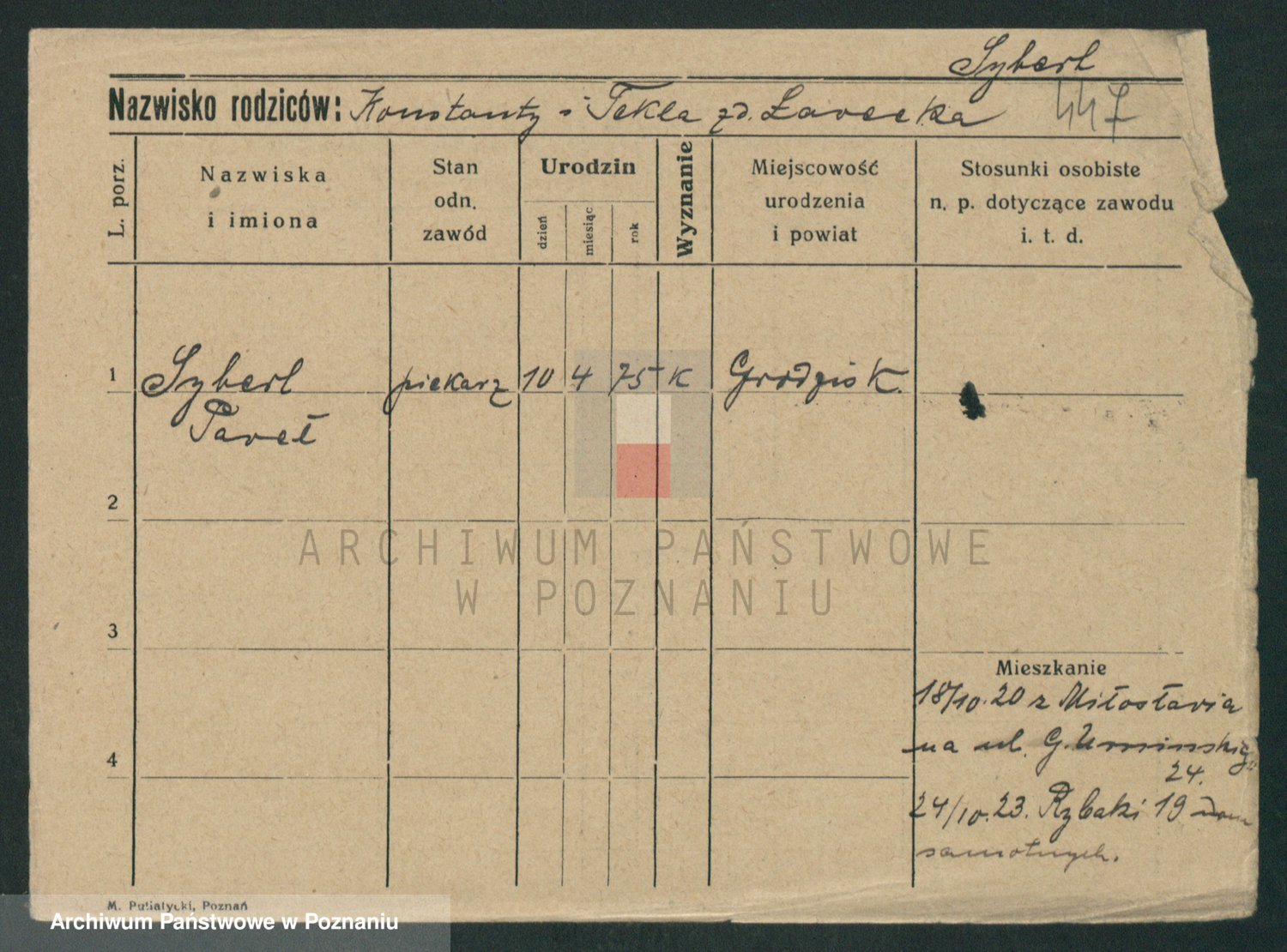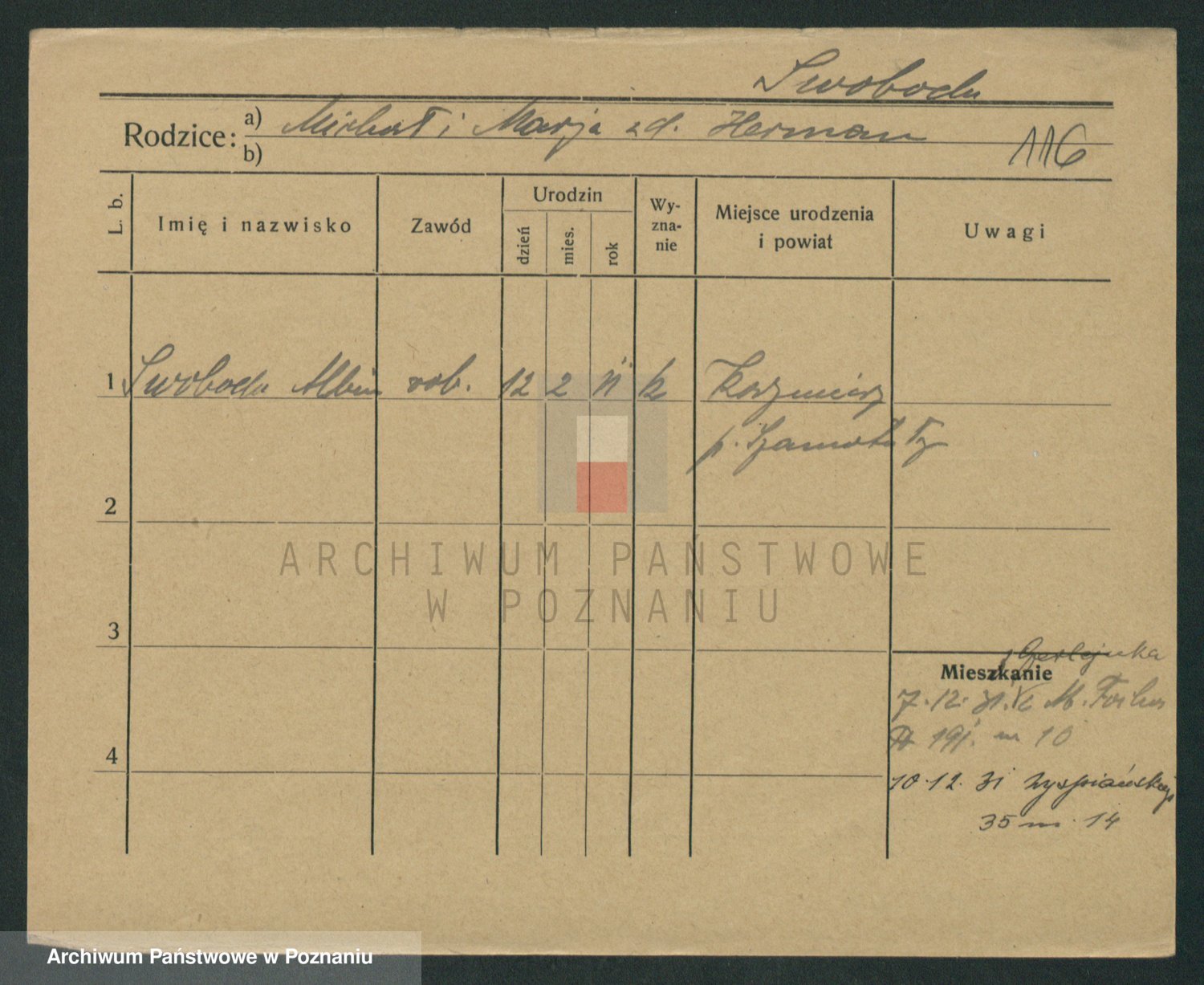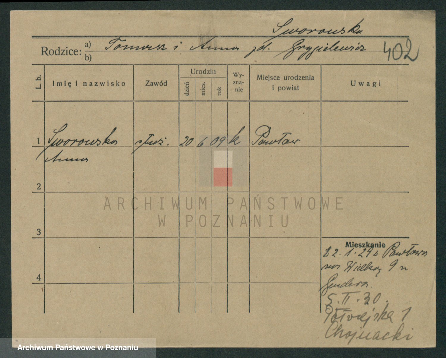 Podgląd karty osobowej dostępny jest po kliknięciu na nazwisko lub ikonkę karty. Można dokonywać powiększenia (ikony na górze) lub przechodzić między kolejnymi skanami (strzałki po bokach).