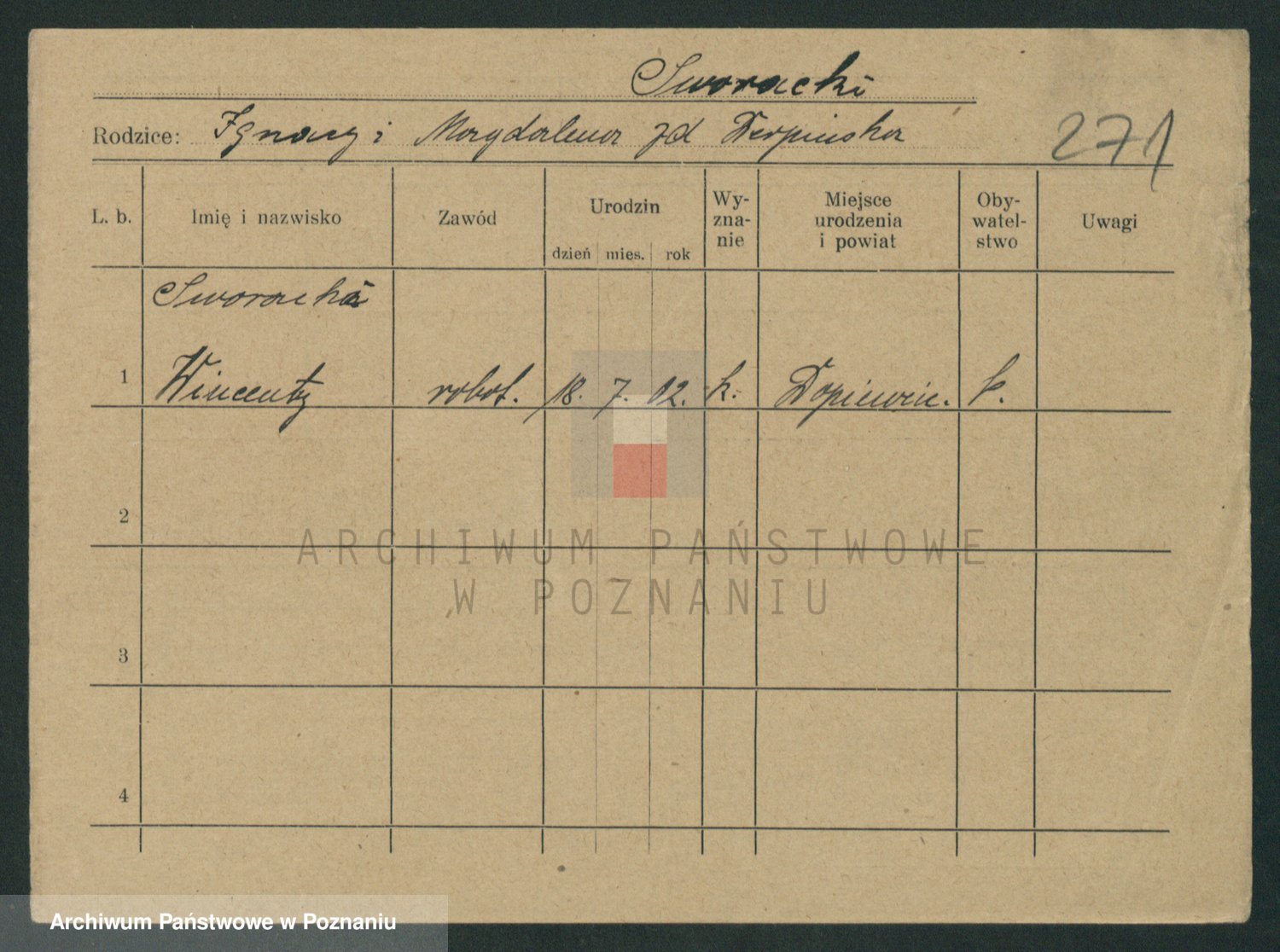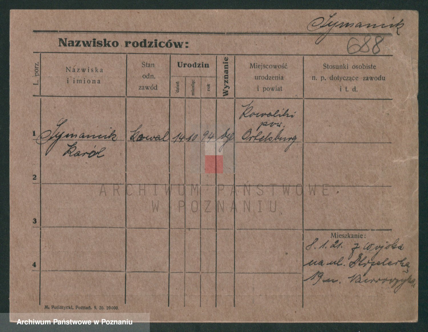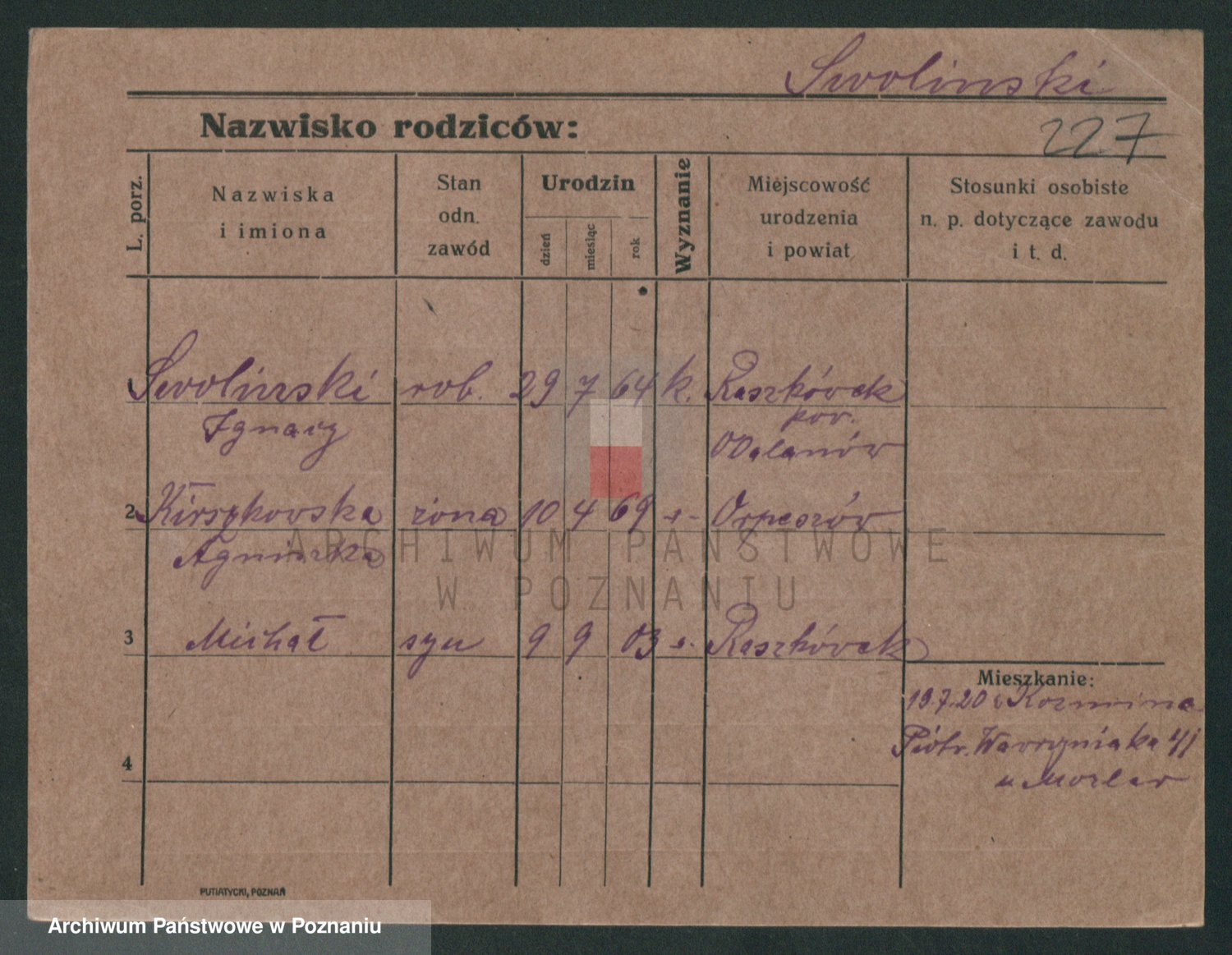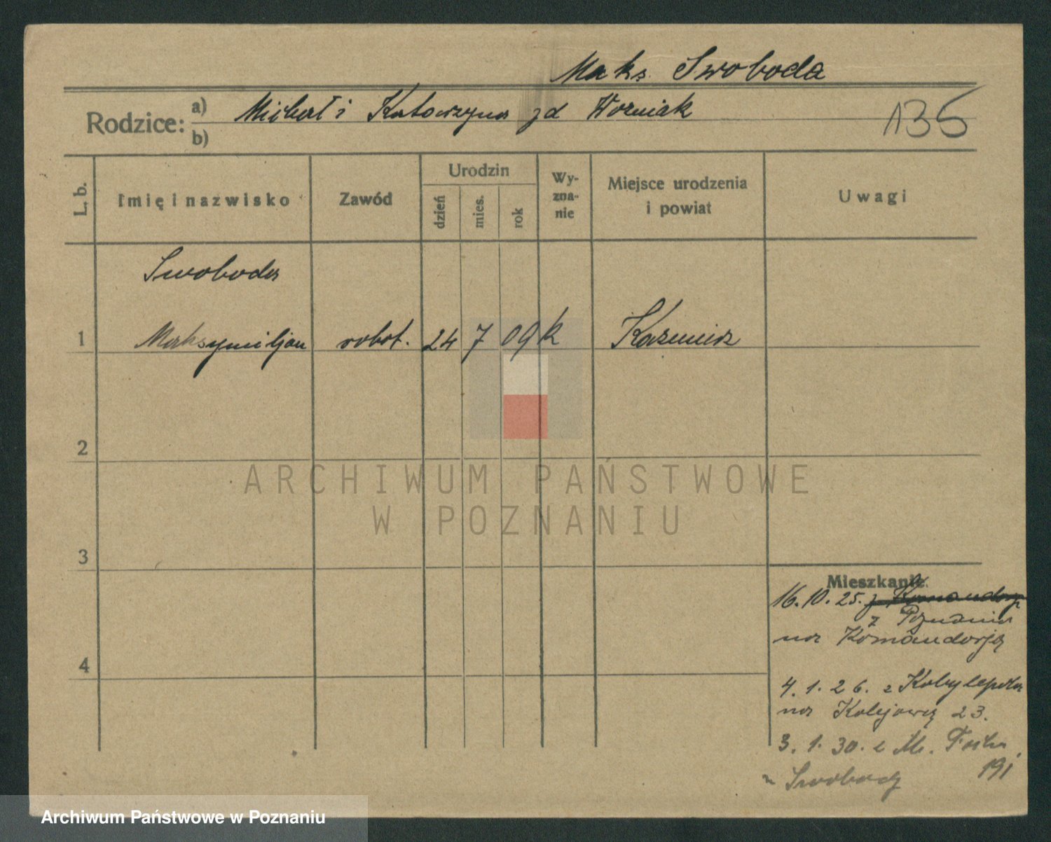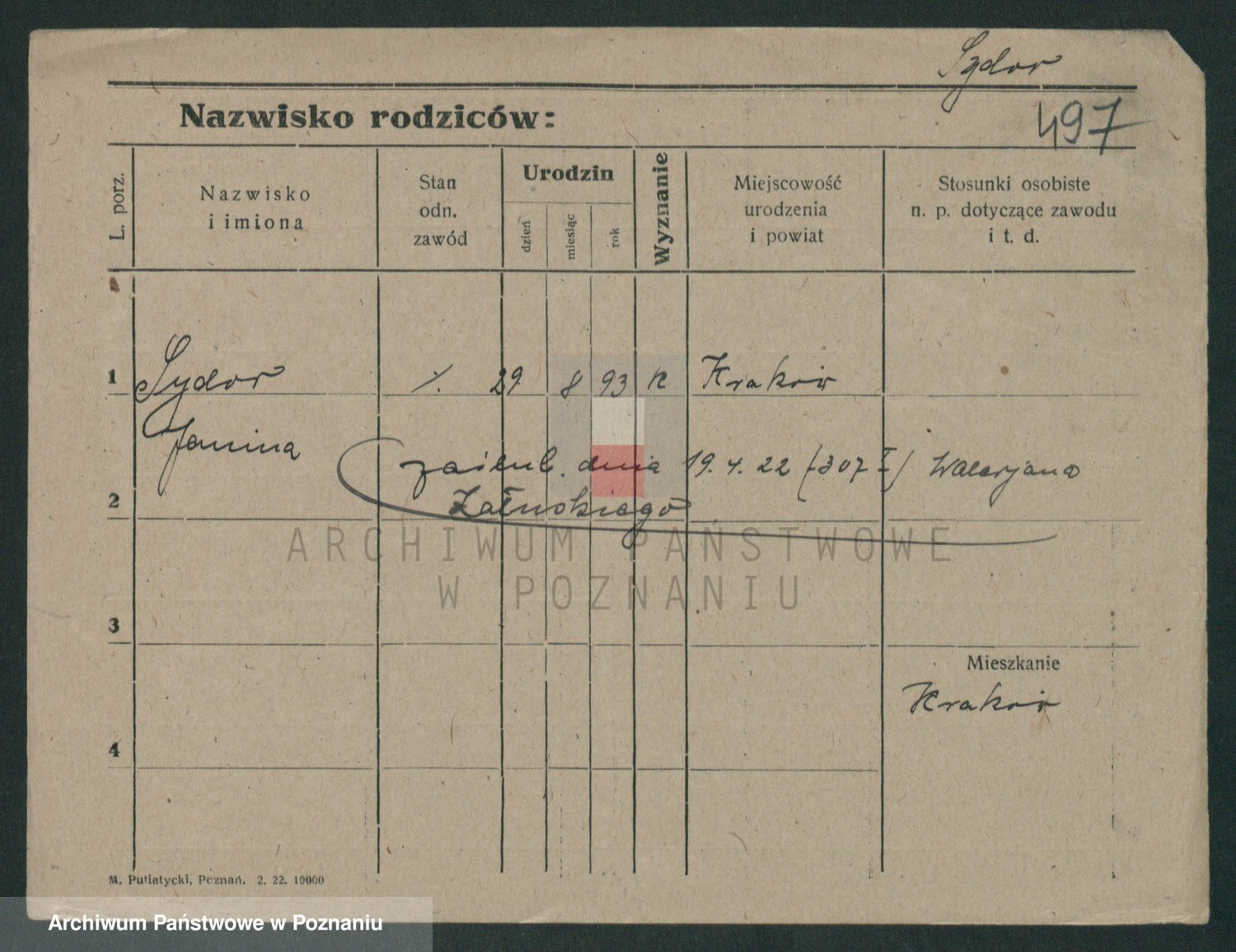 Podgląd karty osobowej dostępny jest po kliknięciu na nazwisko lub ikonkę karty. Można dokonywać powiększenia (ikony na górze) lub przechodzić między kolejnymi skanami (strzałki po bokach).
