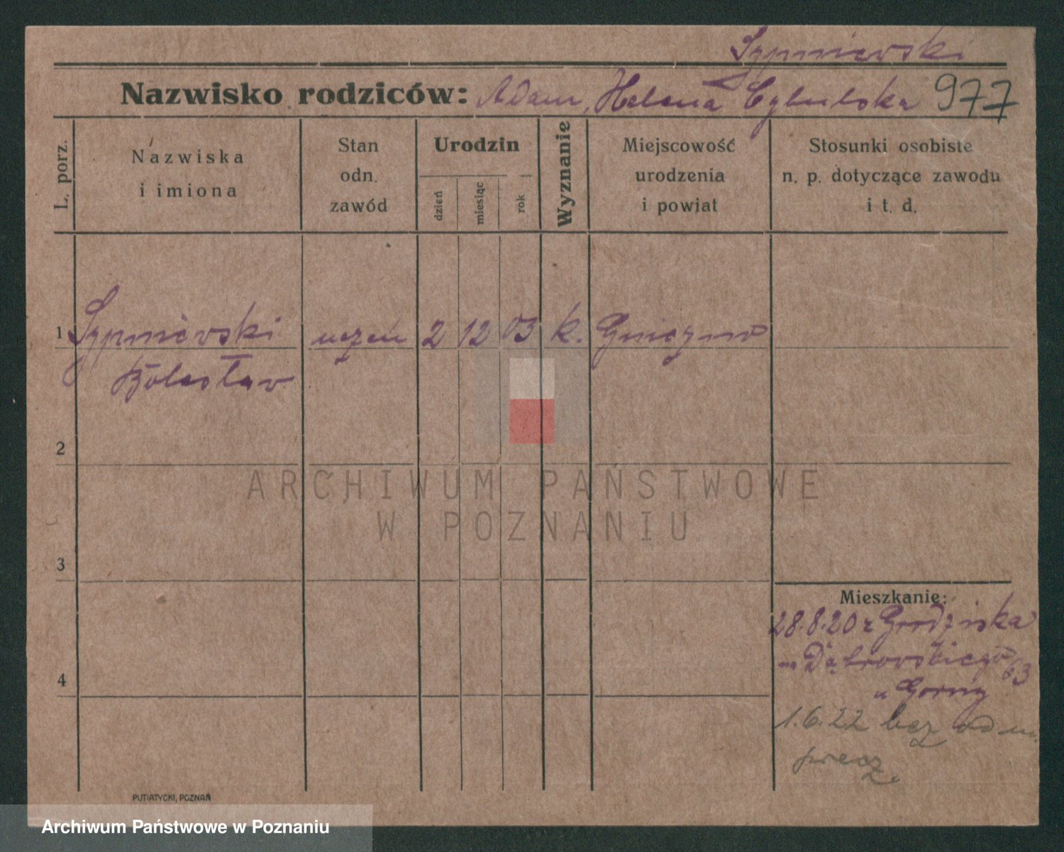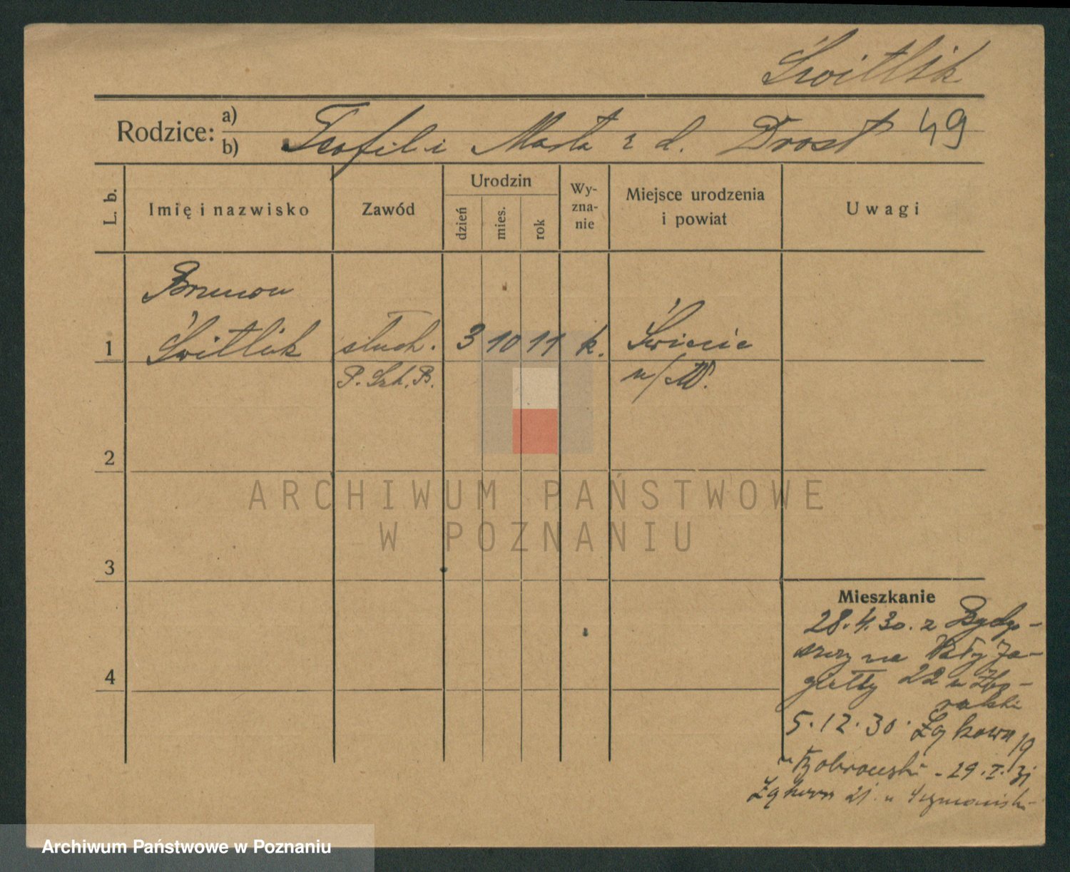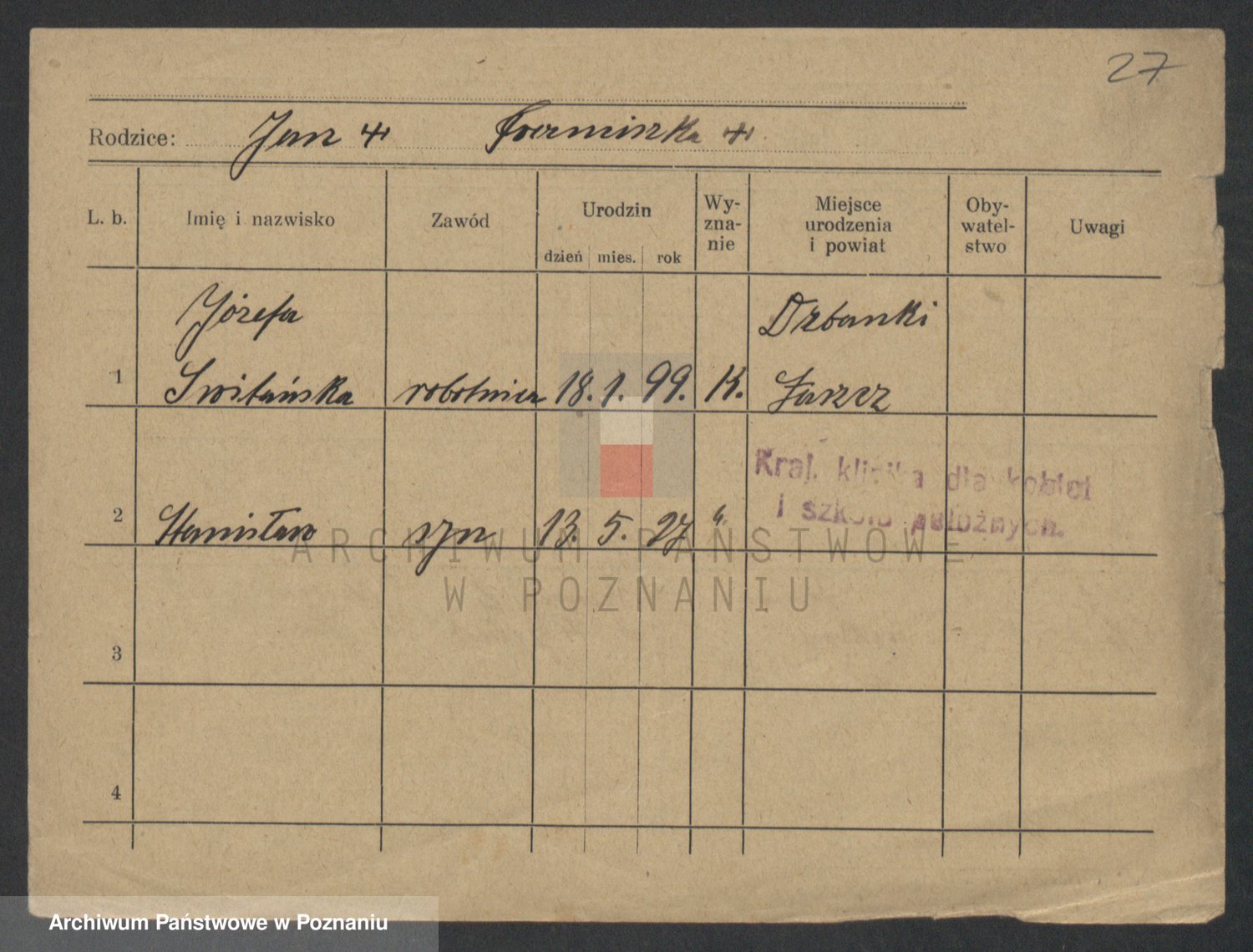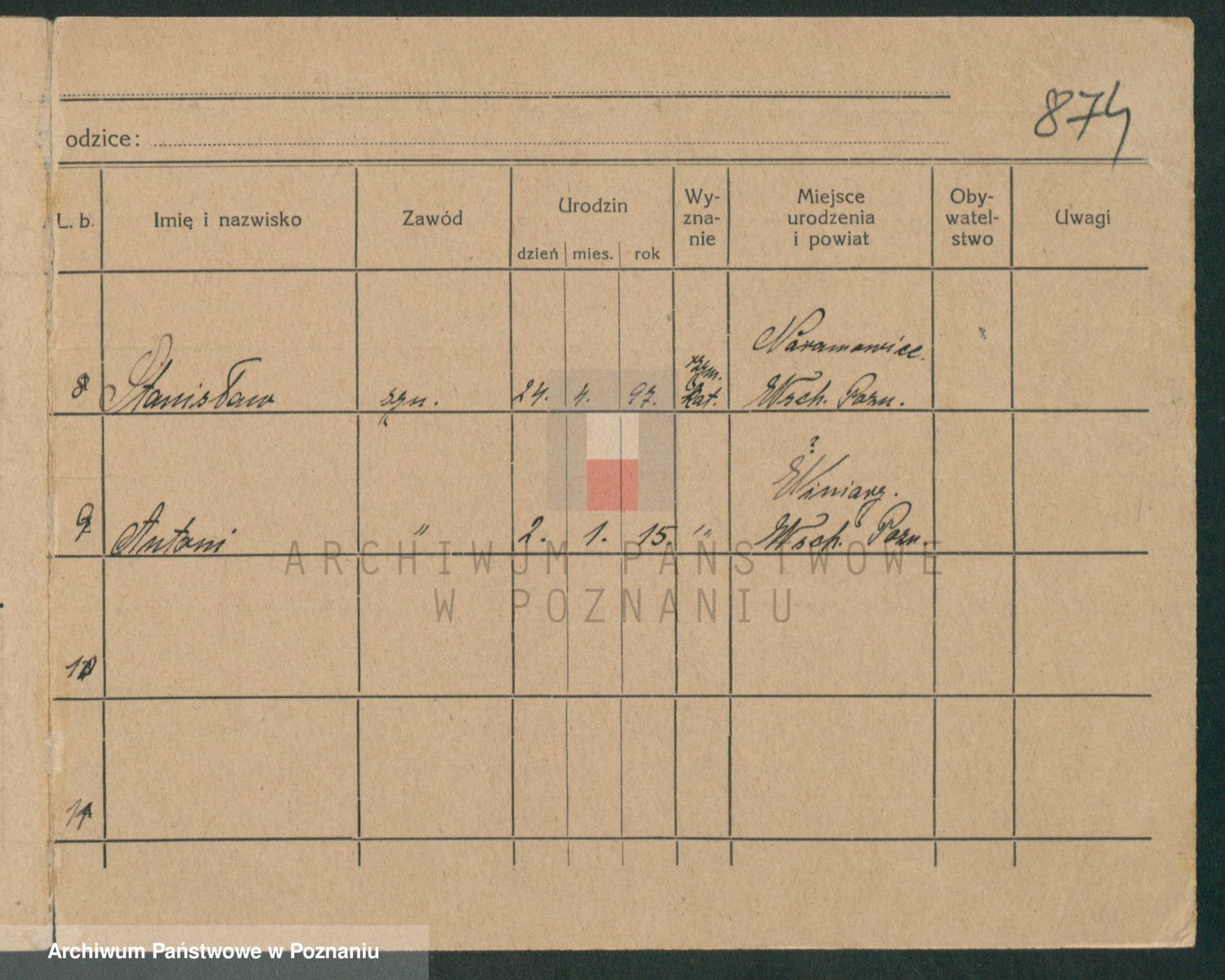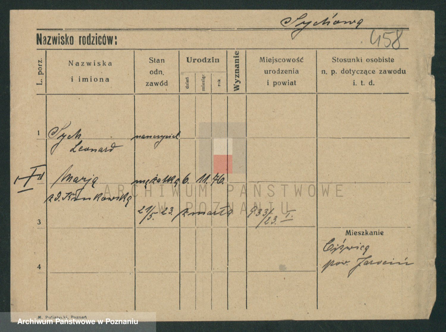 Podgląd karty osobowej dostępny jest po kliknięciu na nazwisko lub ikonkę karty. Można dokonywać powiększenia (ikony na górze) lub przechodzić między kolejnymi skanami (strzałki po bokach).