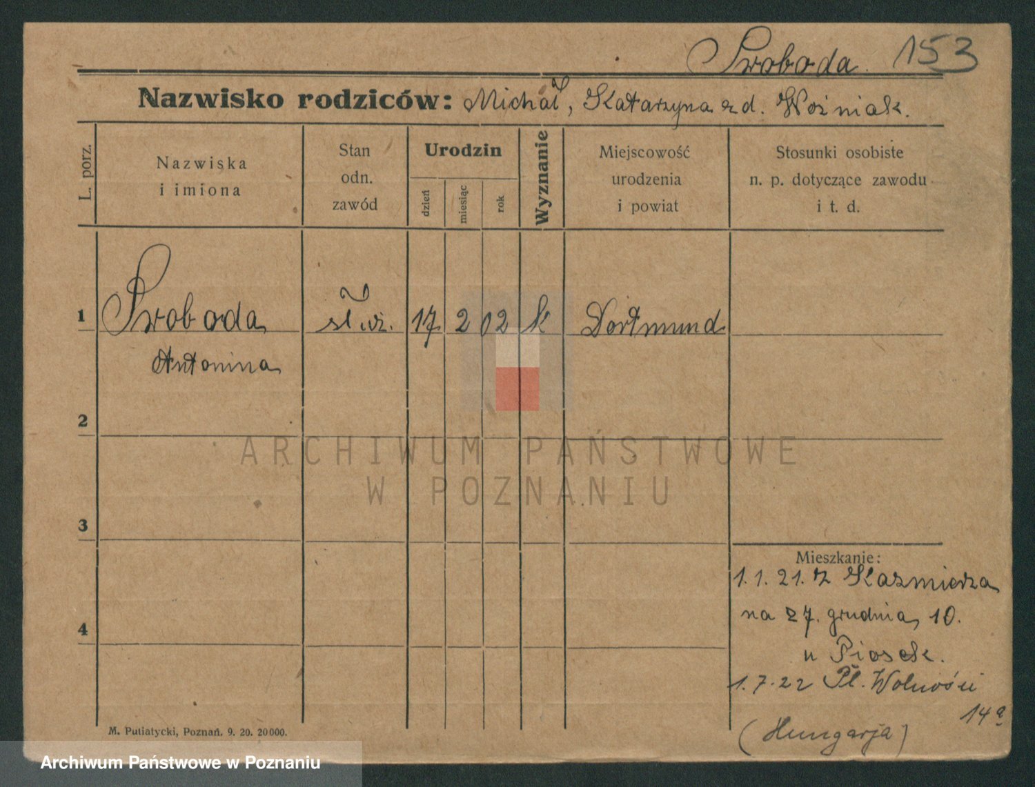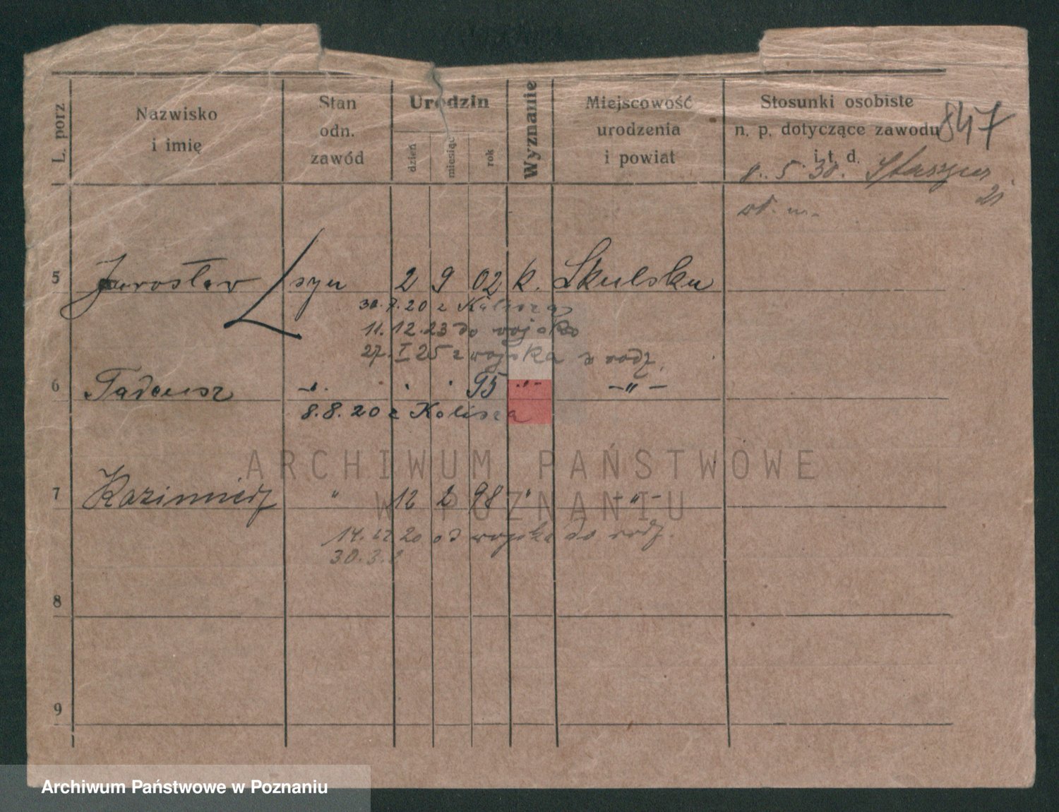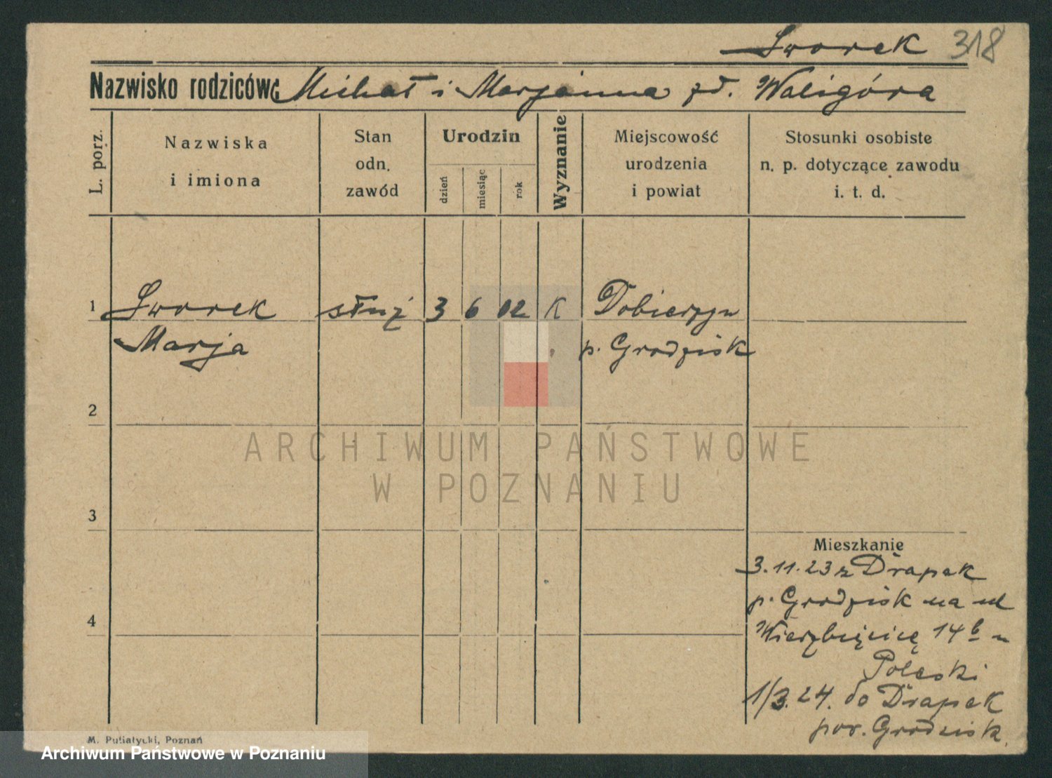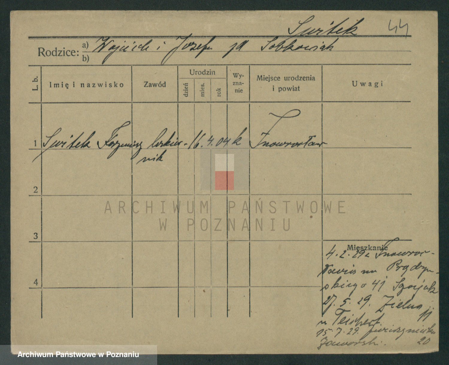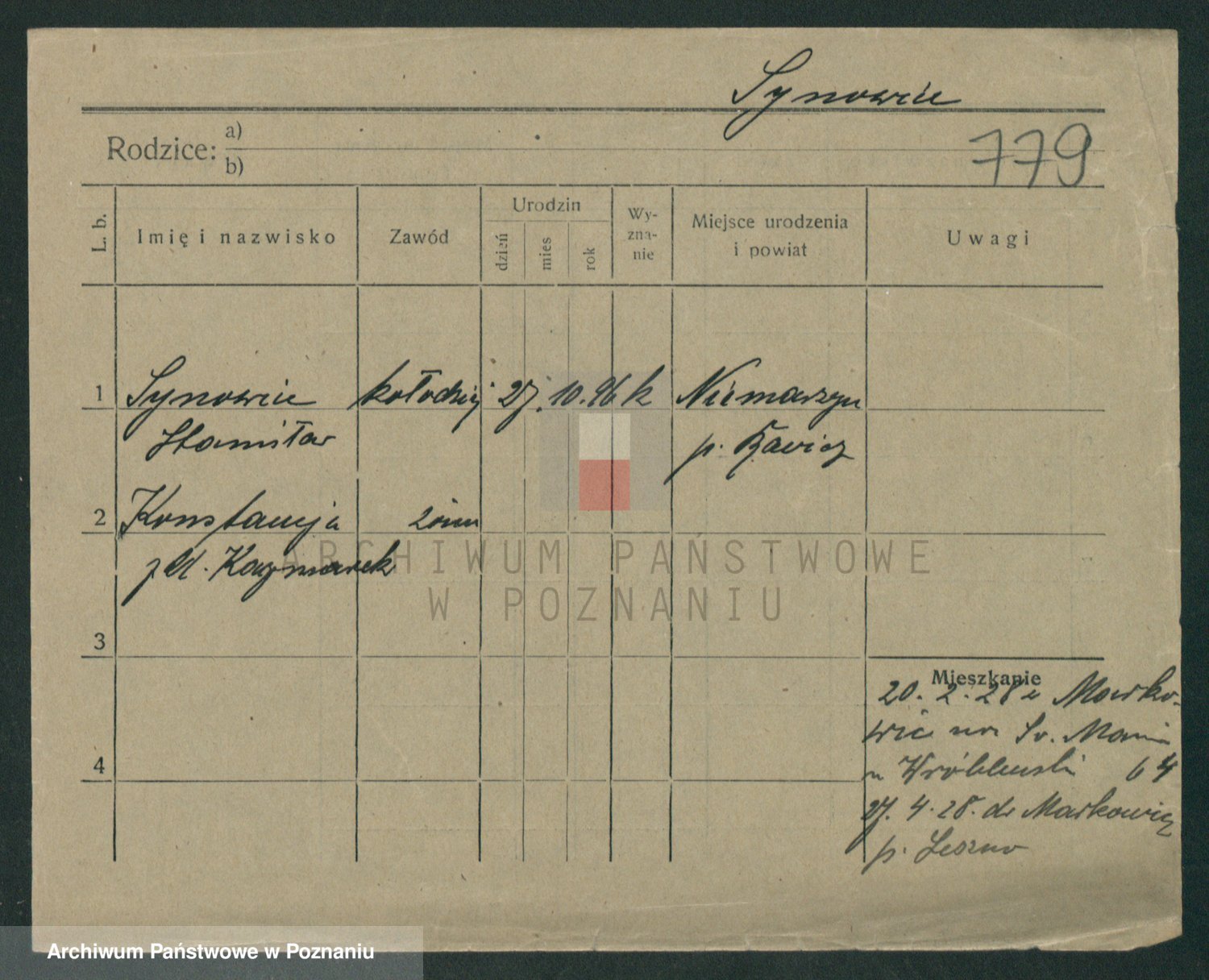Podgląd karty osobowej dostępny jest po kliknięciu na nazwisko lub ikonkę karty. Można dokonywać powiększenia (ikony na górze) lub przechodzić między kolejnymi skanami (strzałki po bokach).