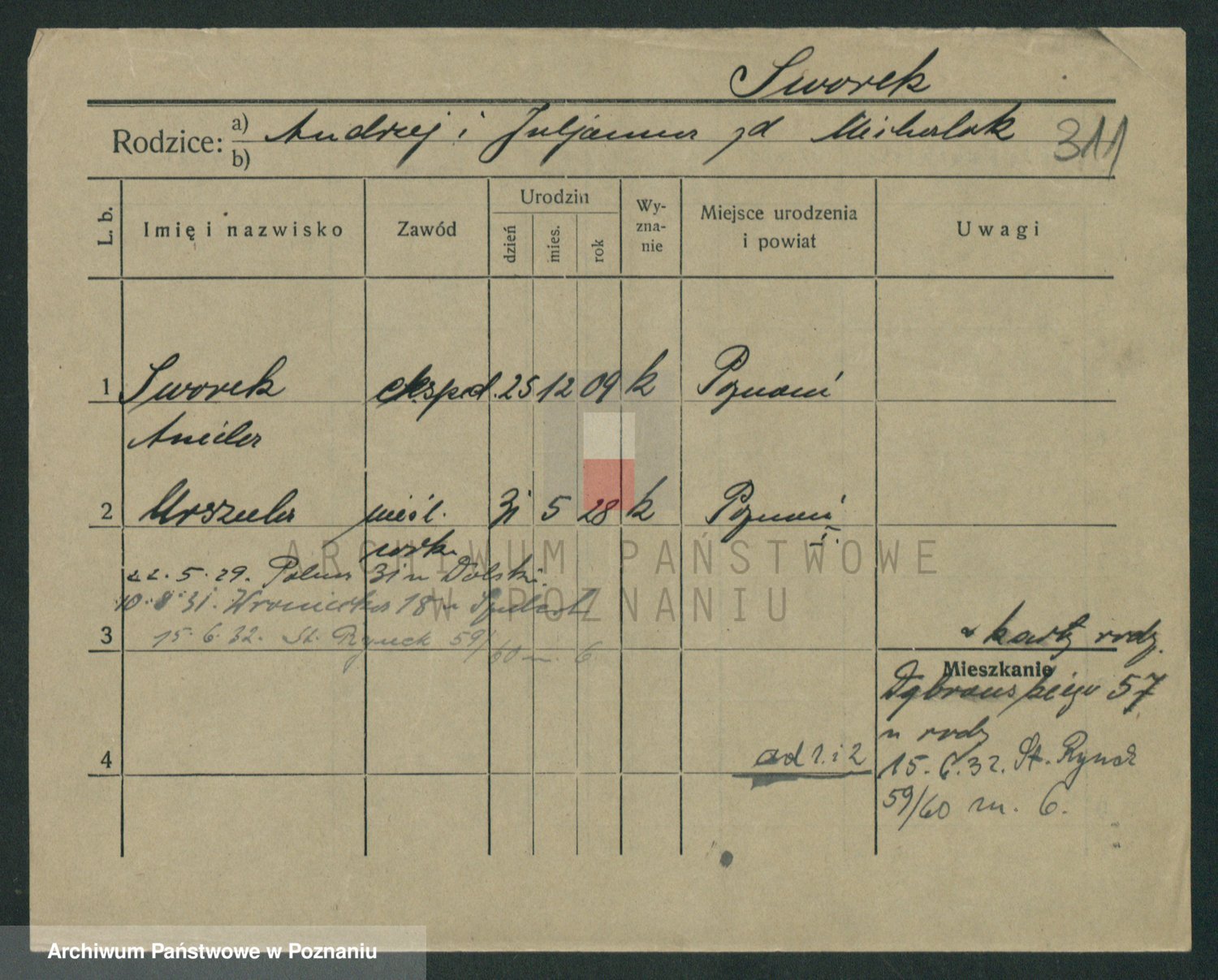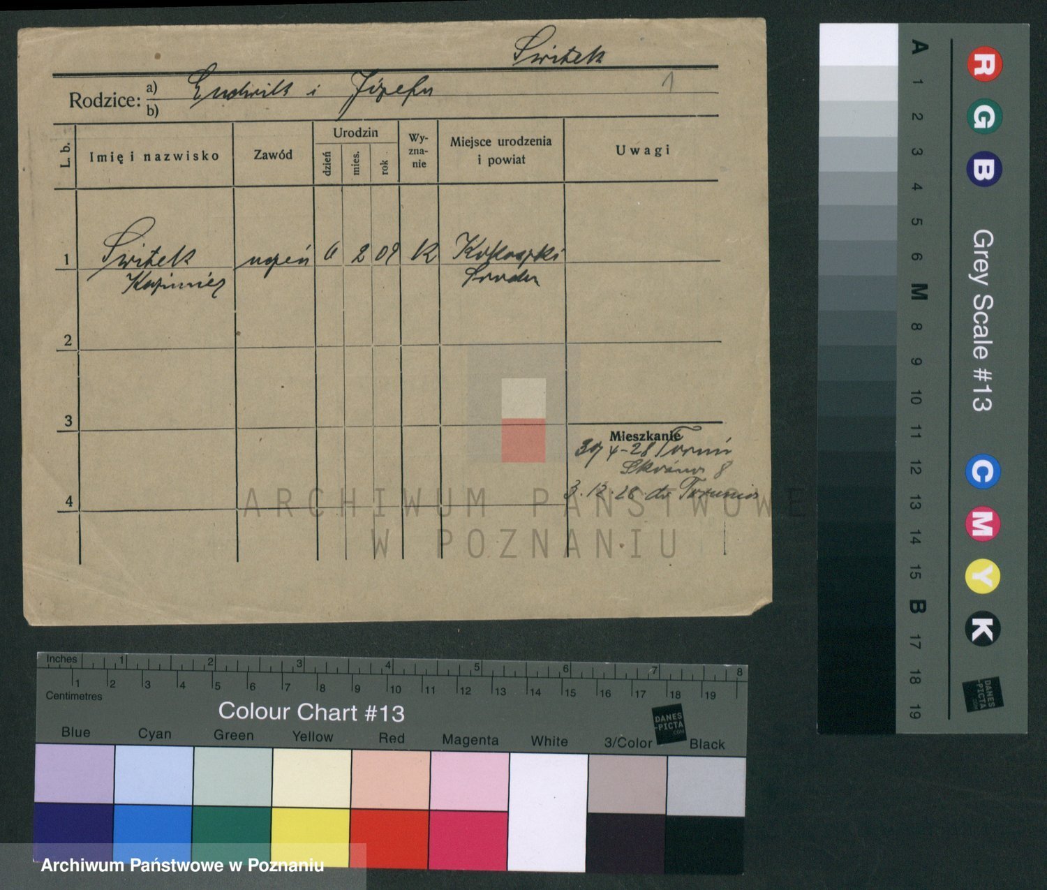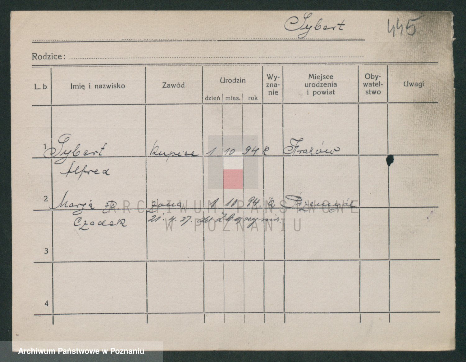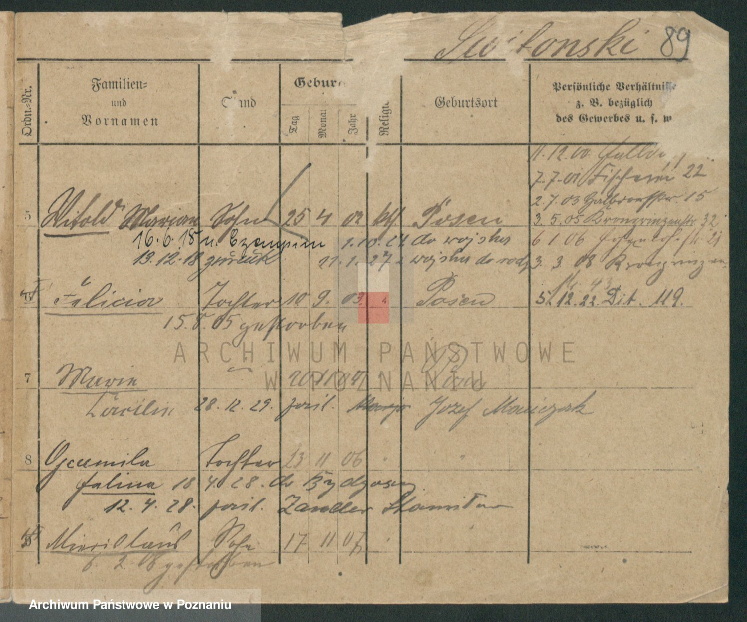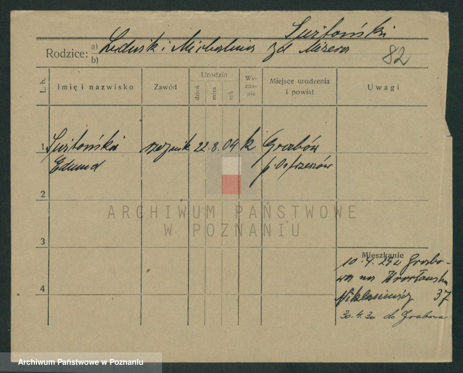 Podgląd karty osobowej dostępny jest po kliknięciu na nazwisko lub ikonkę karty. Można dokonywać powiększenia (ikony na górze) lub przechodzić między kolejnymi skanami (strzałki po bokach).