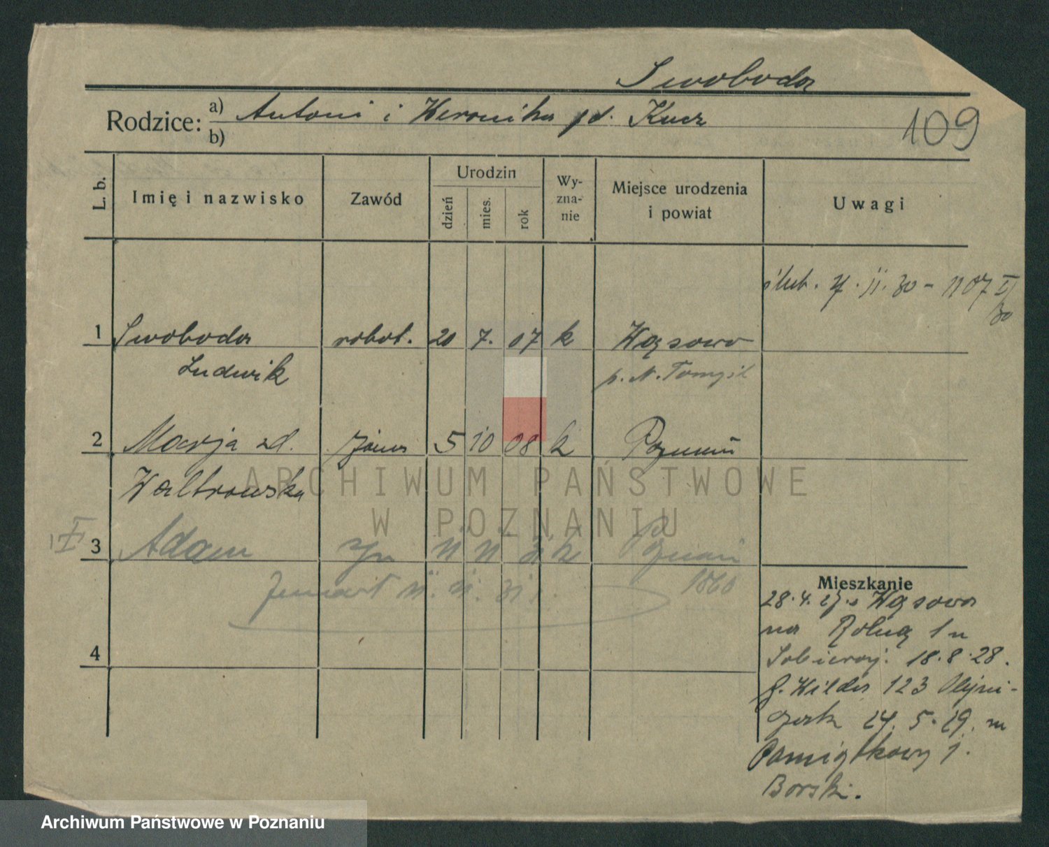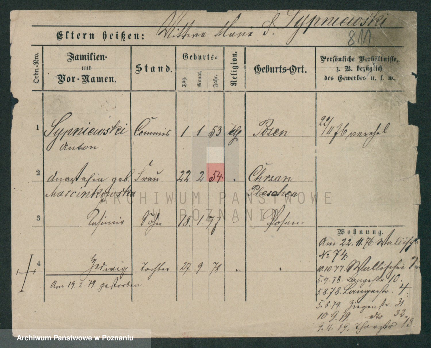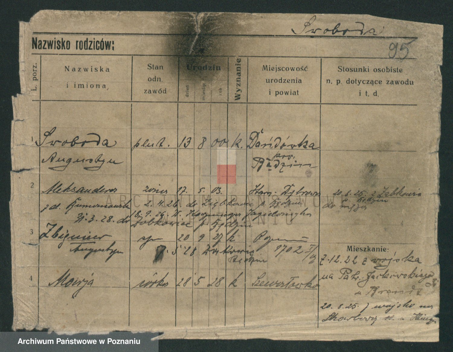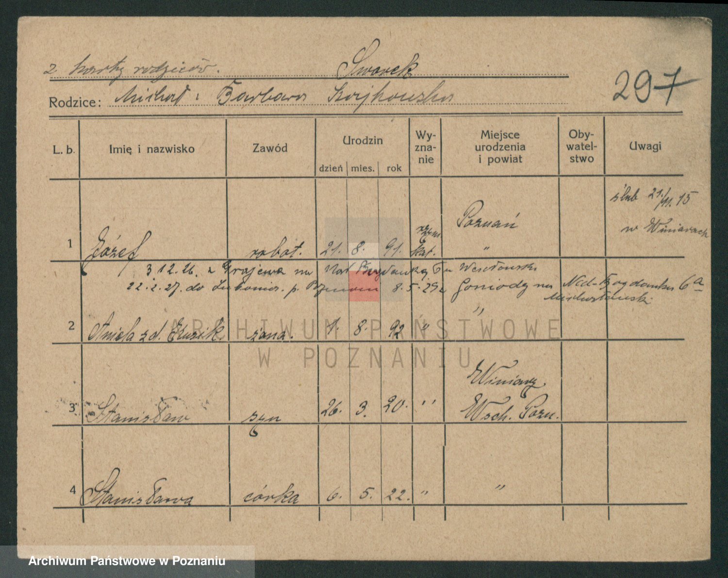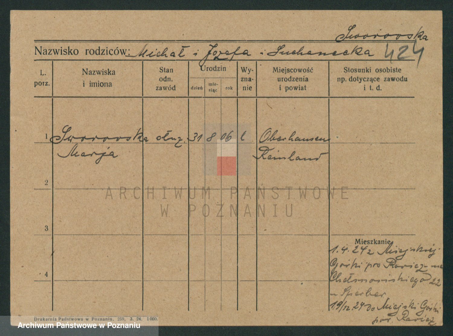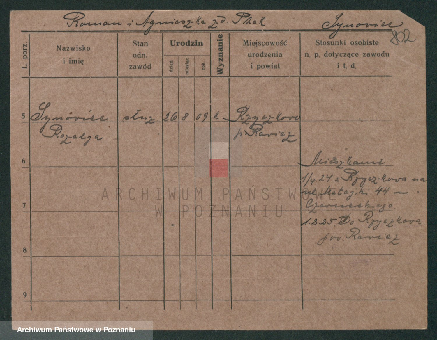Podgląd karty osobowej dostępny jest po kliknięciu na nazwisko lub ikonkę karty. Można dokonywać powiększenia (ikony na górze) lub przechodzić między kolejnymi skanami (strzałki po bokach).
