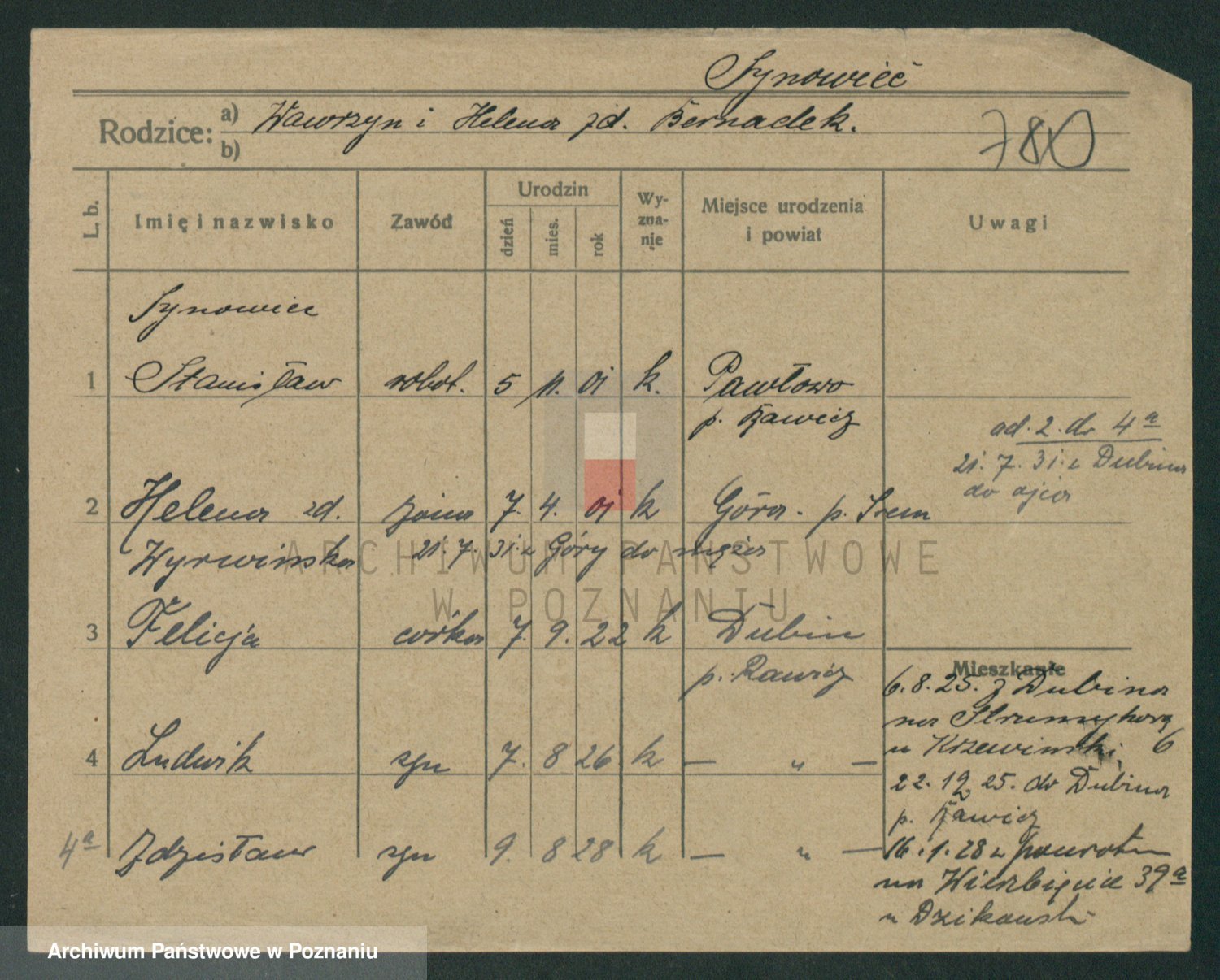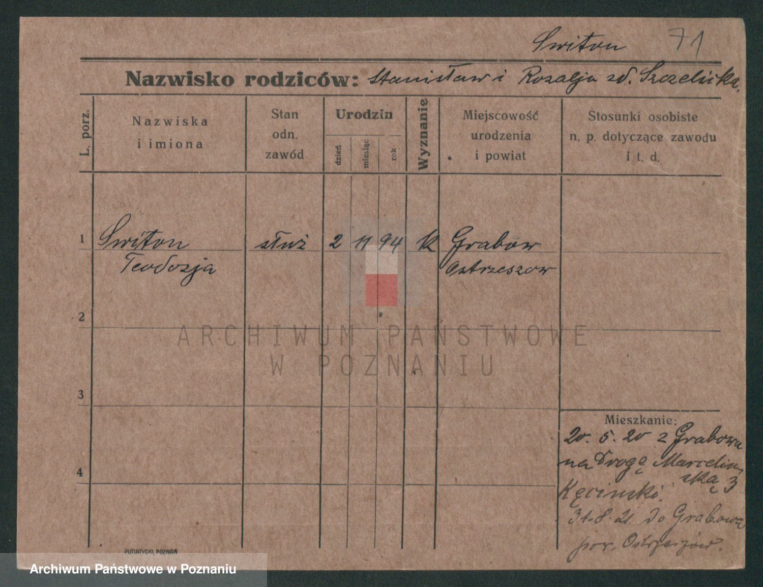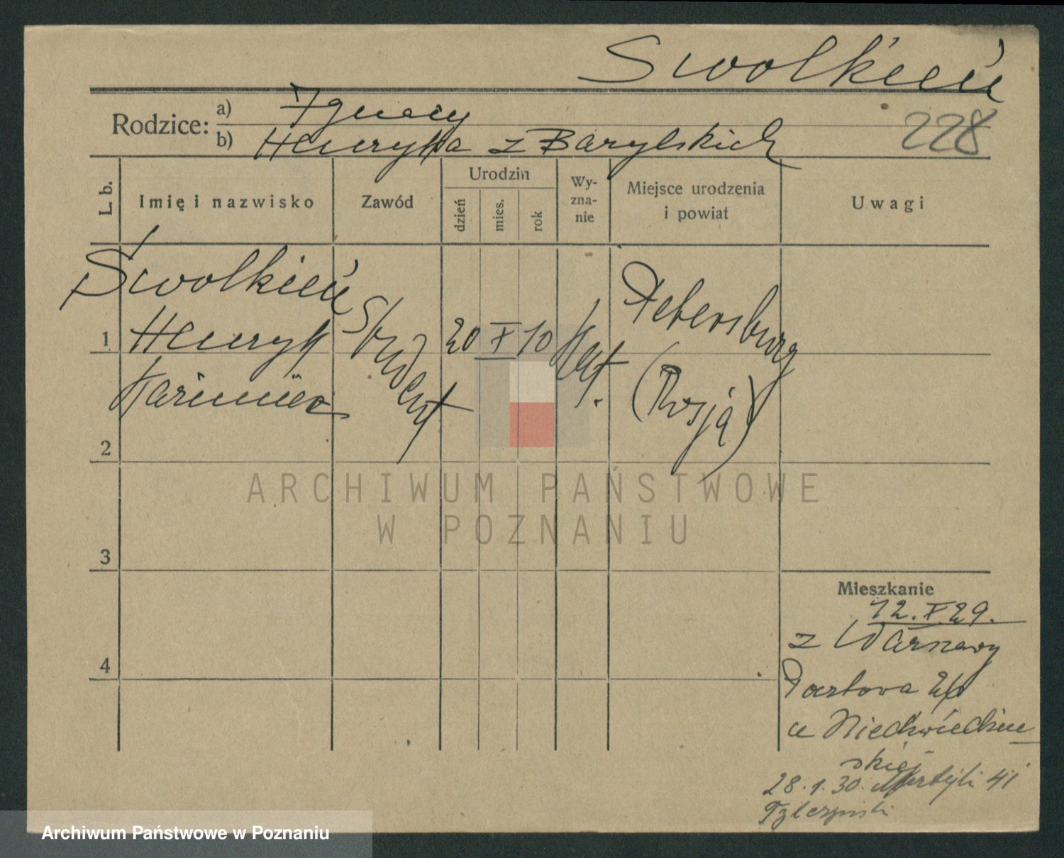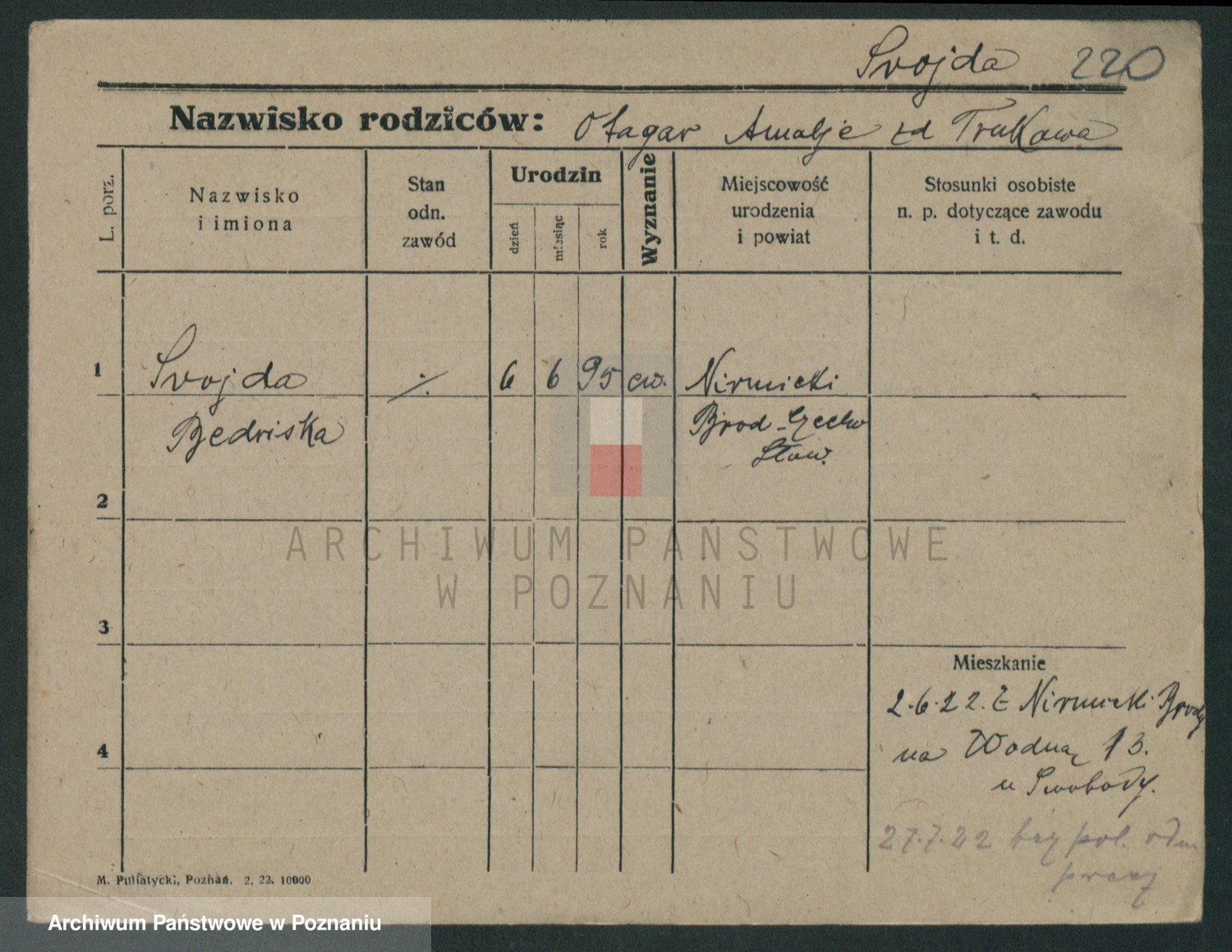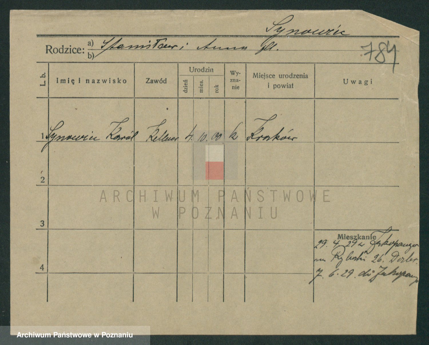 Podgląd karty osobowej dostępny jest po kliknięciu na nazwisko lub ikonkę karty. Można dokonywać powiększenia (ikony na górze) lub przechodzić między kolejnymi skanami (strzałki po bokach).