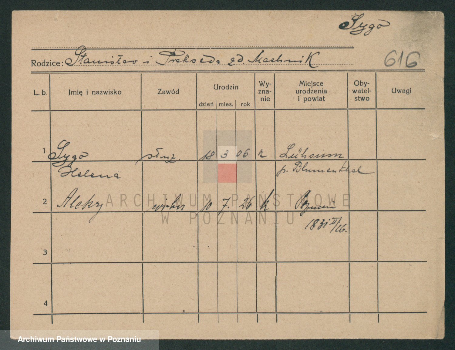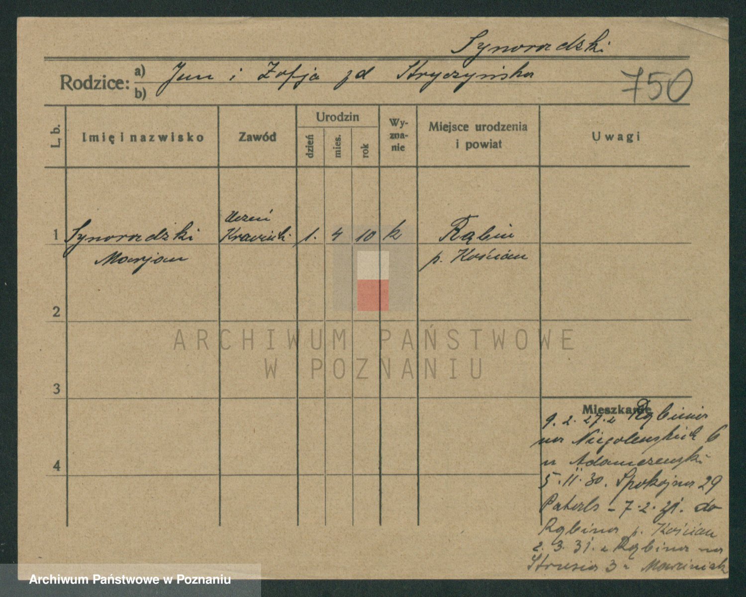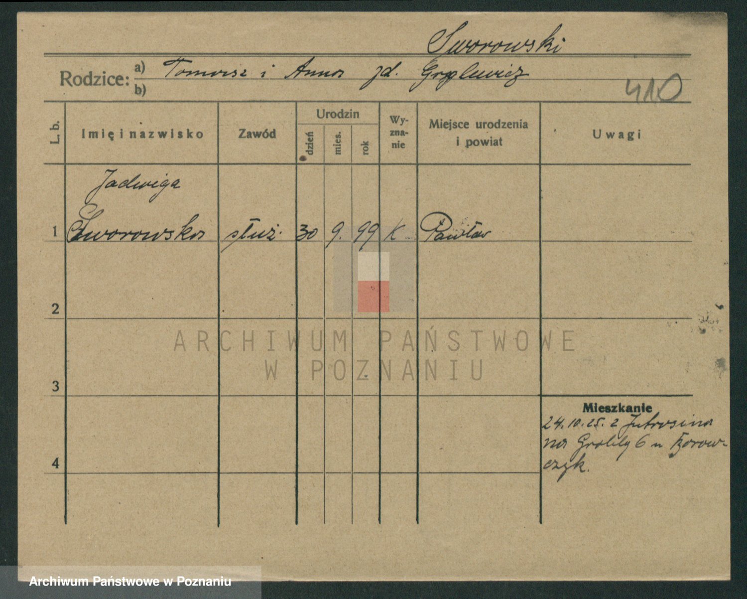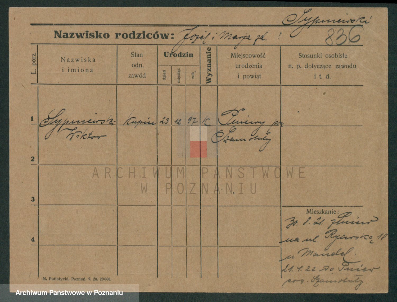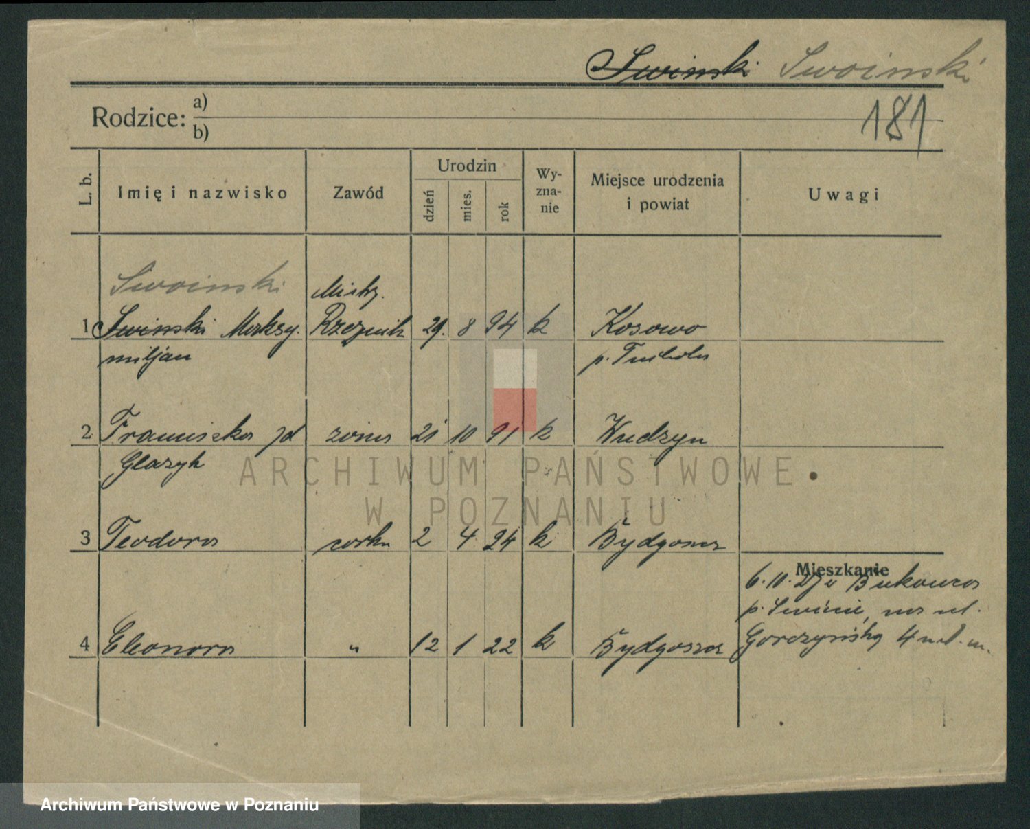 Podgląd karty osobowej dostępny jest po kliknięciu na nazwisko lub ikonkę karty. Można dokonywać powiększenia (ikony na górze) lub przechodzić między kolejnymi skanami (strzałki po bokach).