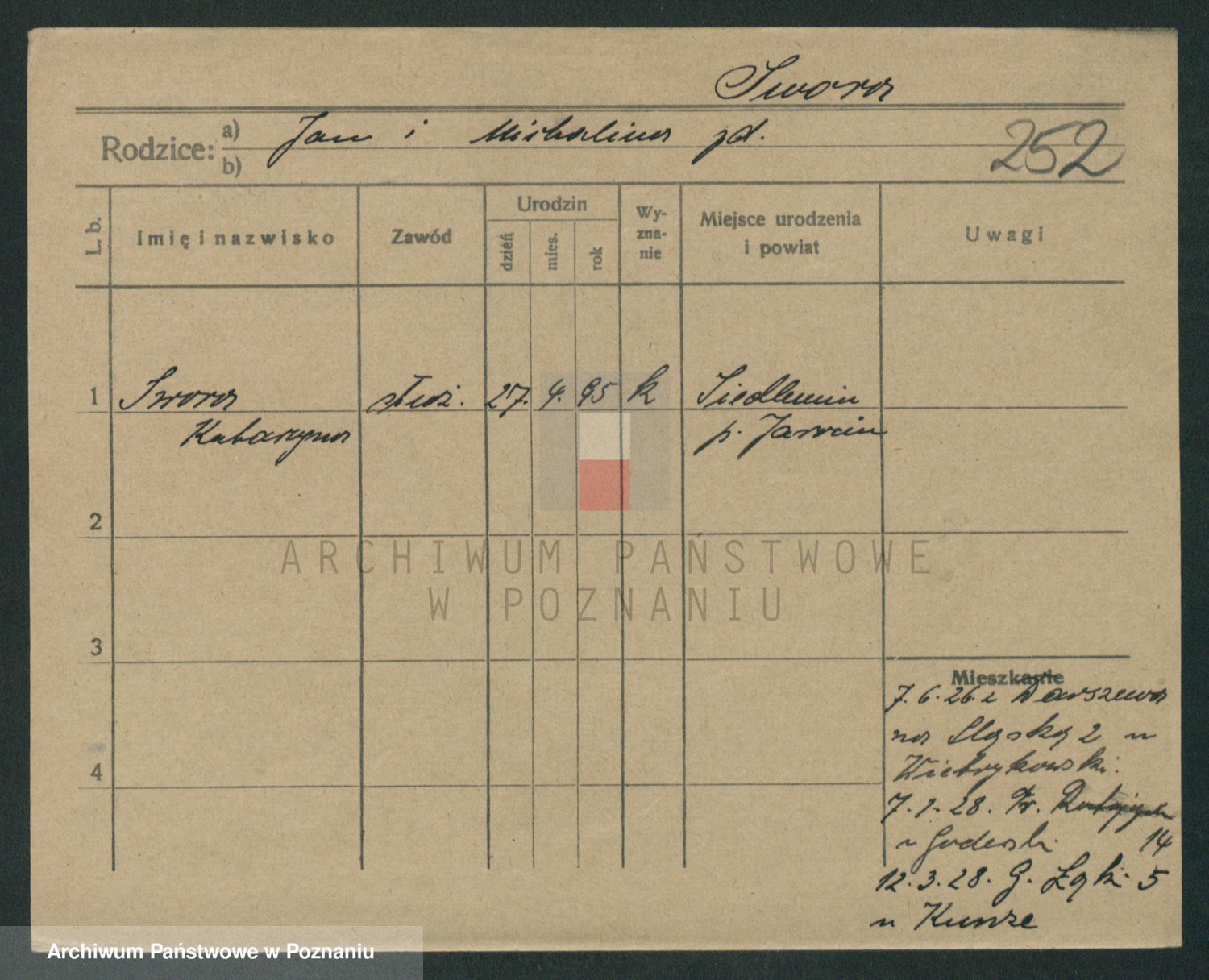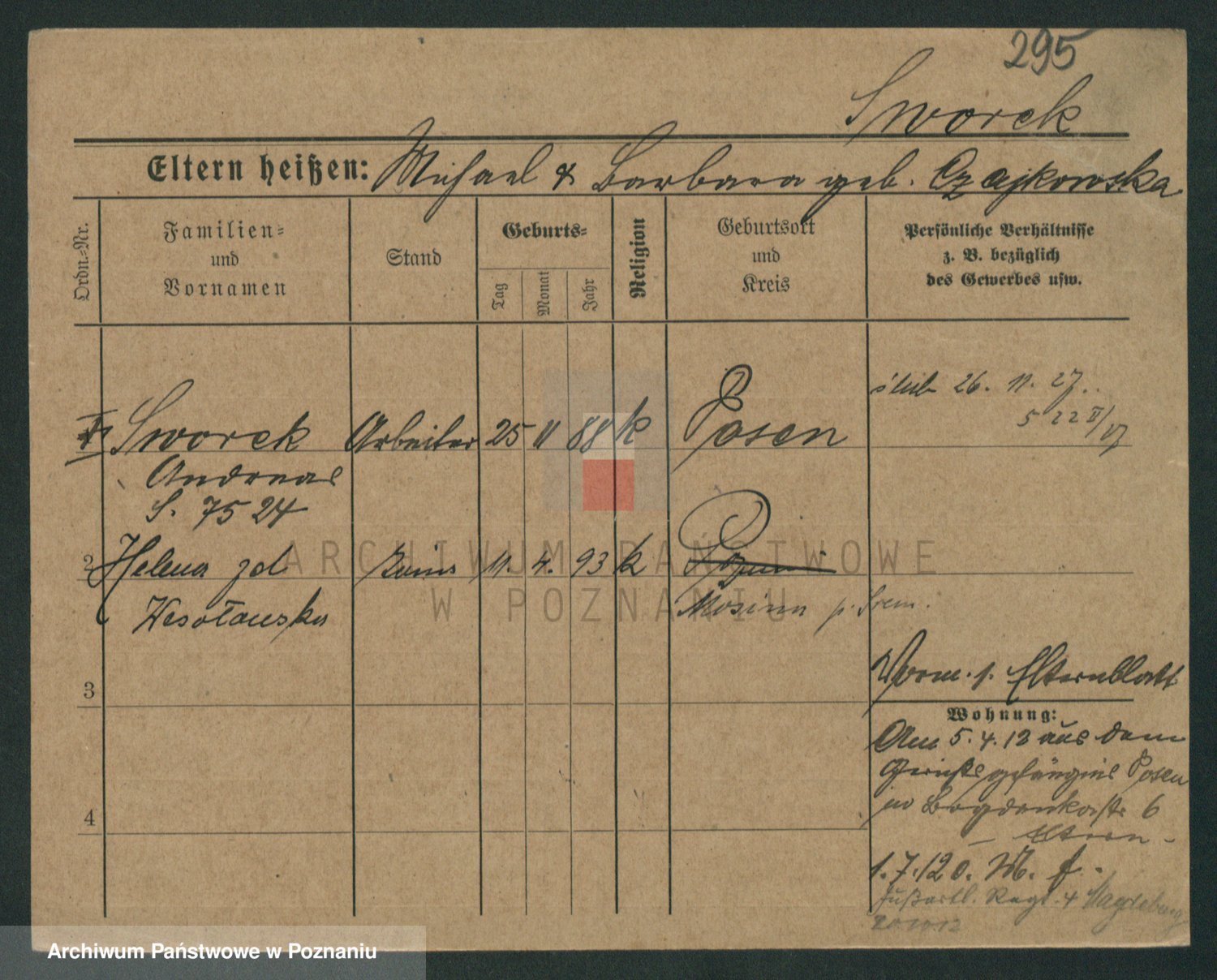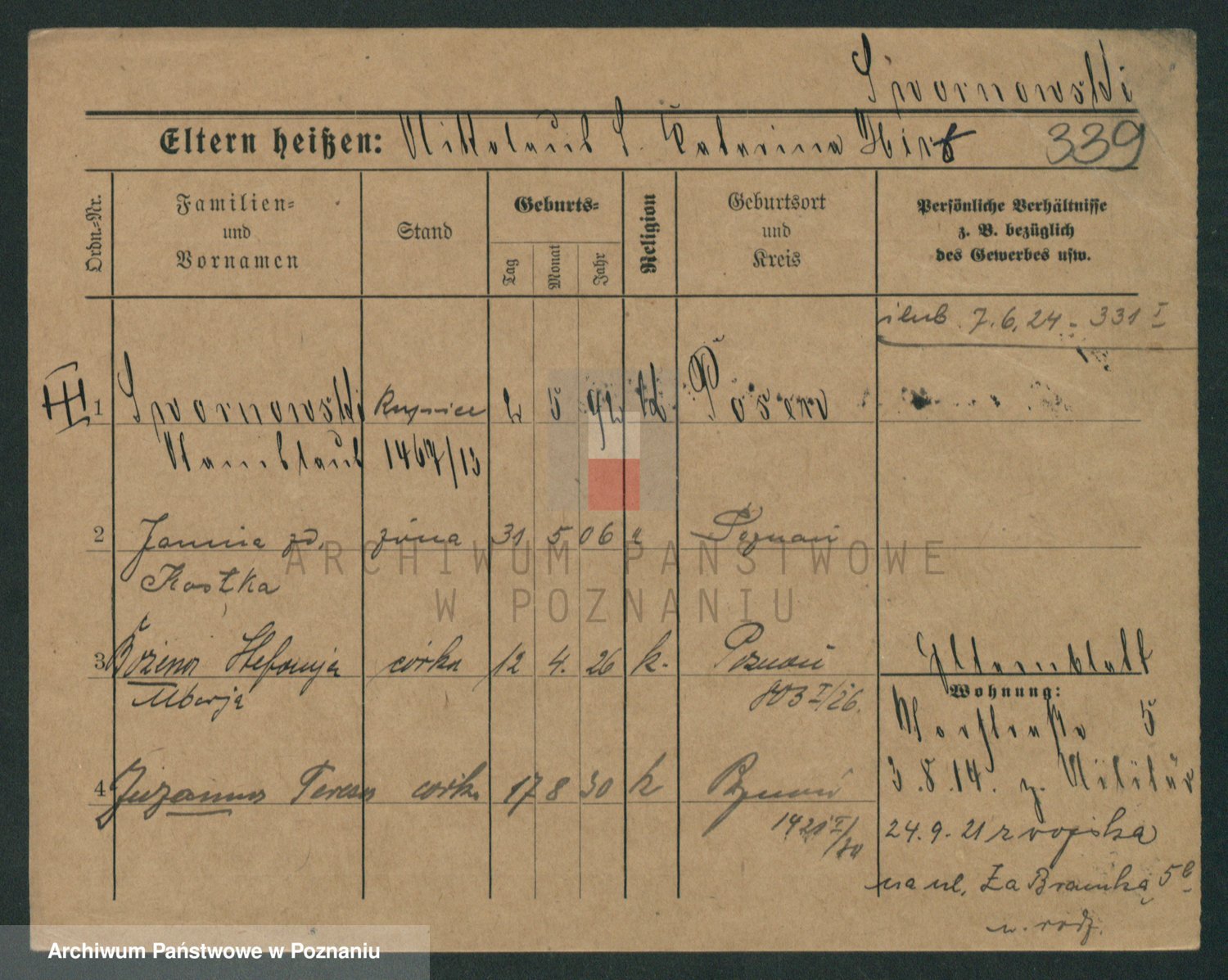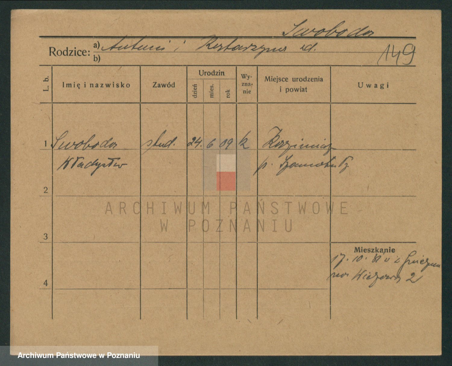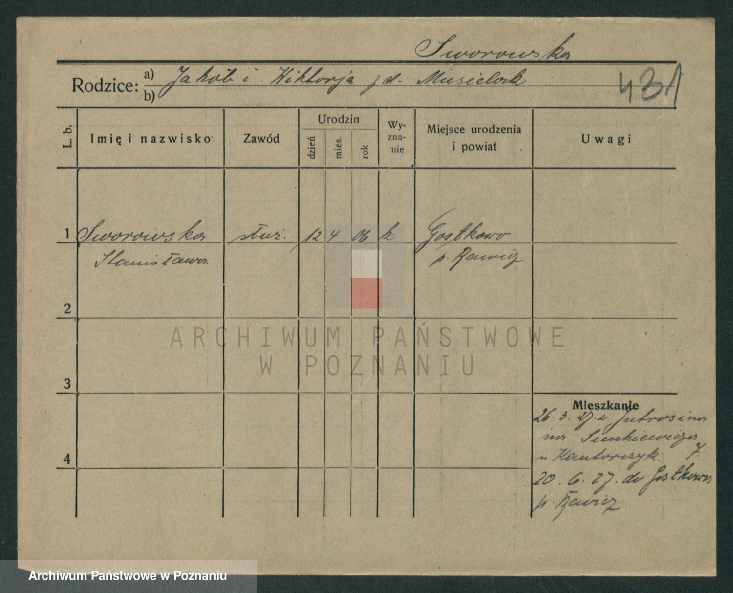Podgląd karty osobowej dostępny jest po kliknięciu na nazwisko lub ikonkę karty. Można dokonywać powiększenia (ikony na górze) lub przechodzić między kolejnymi skanami (strzałki po bokach).
