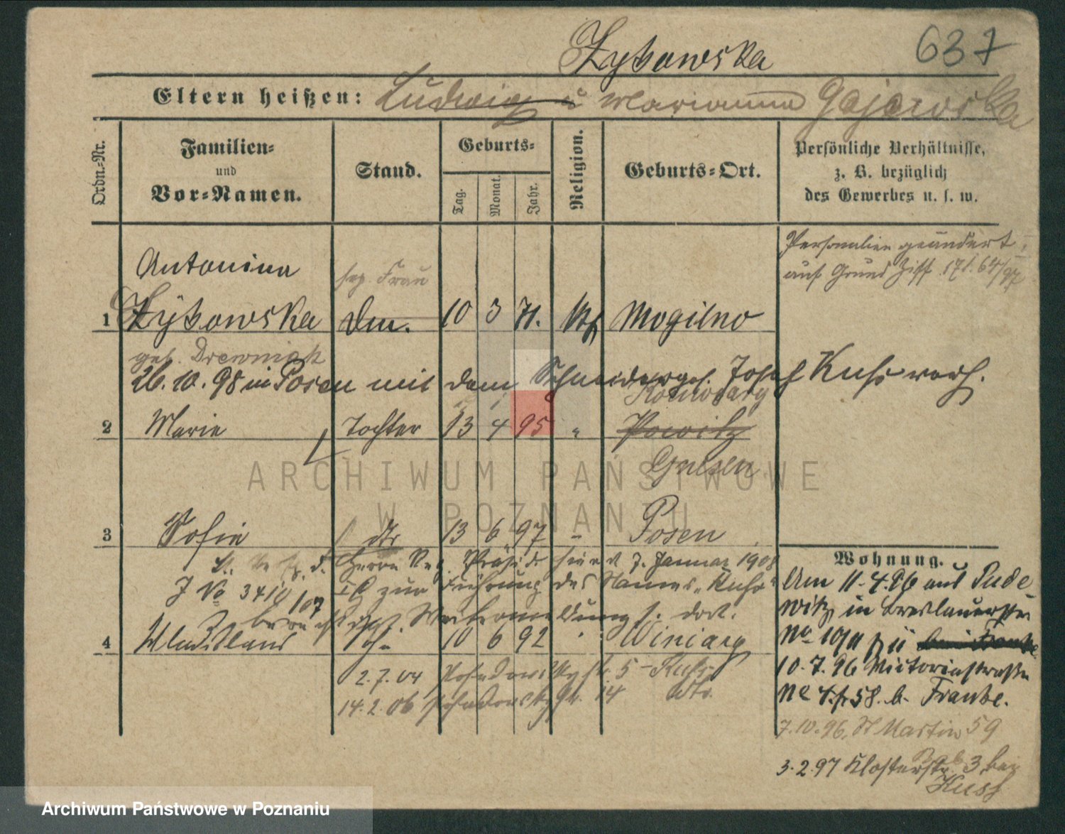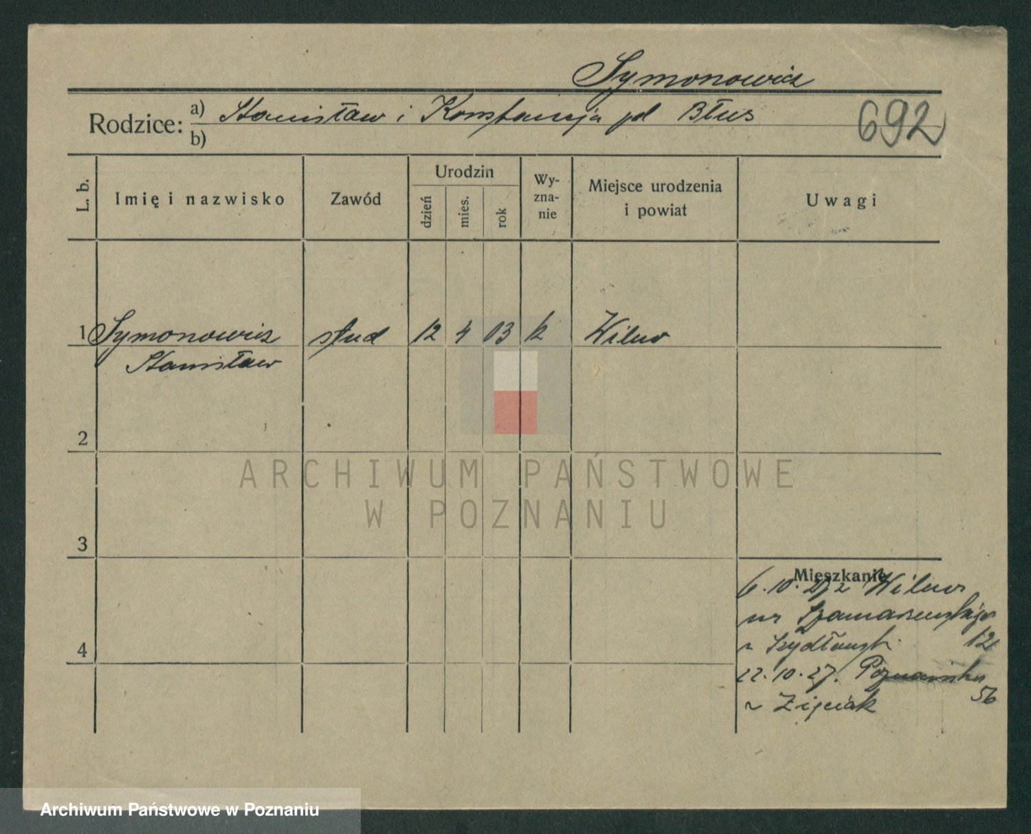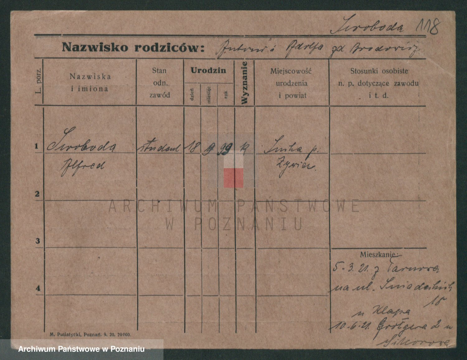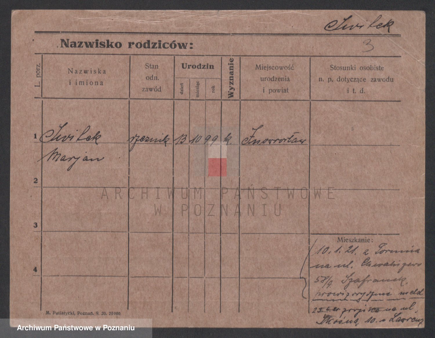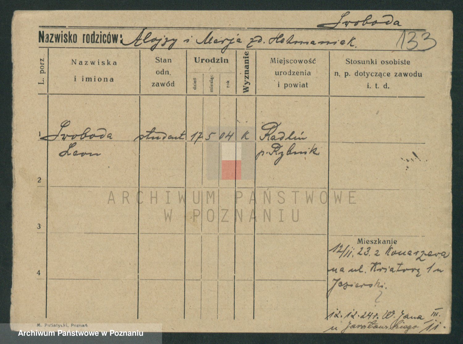 Podgląd karty osobowej dostępny jest po kliknięciu na nazwisko lub ikonkę karty. Można dokonywać powiększenia (ikony na górze) lub przechodzić między kolejnymi skanami (strzałki po bokach).