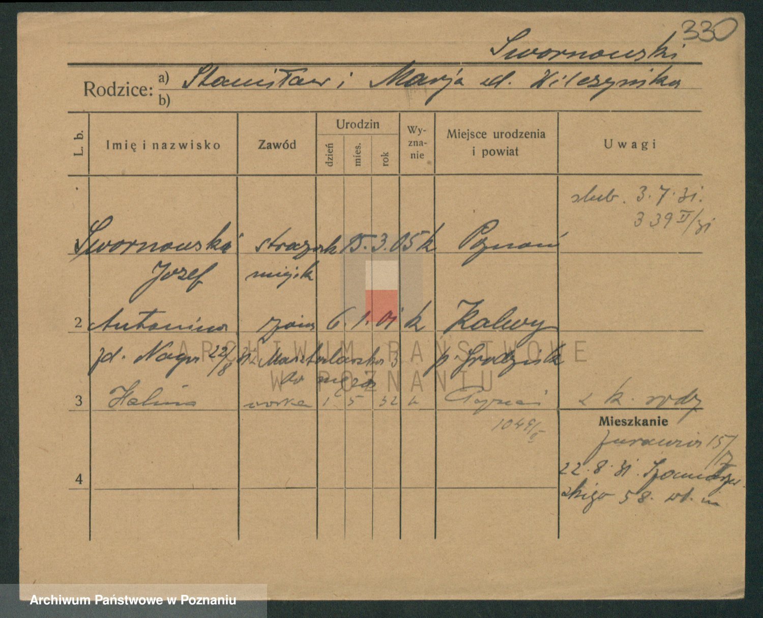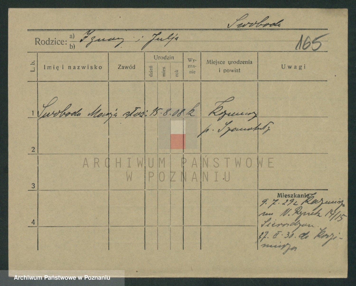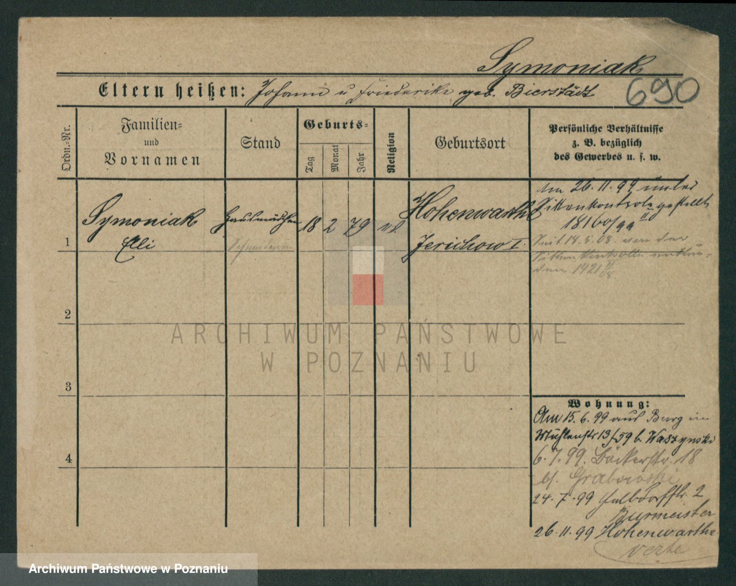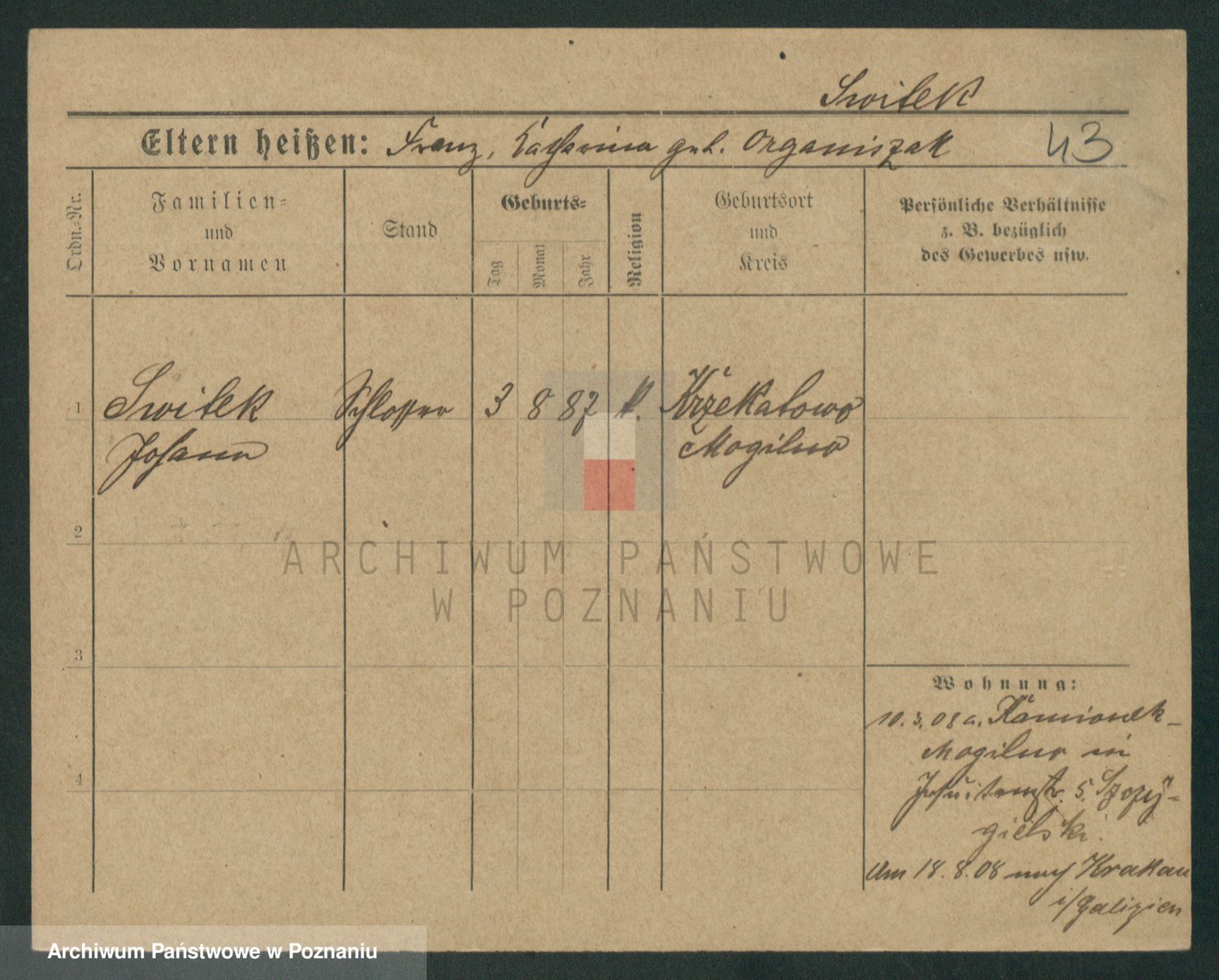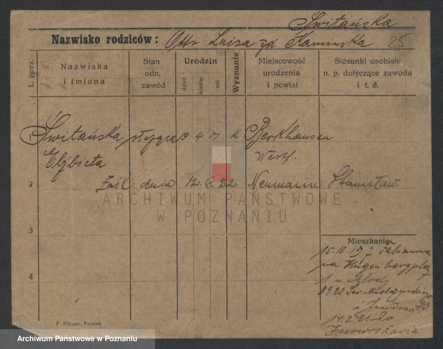 Podgląd karty osobowej dostępny jest po kliknięciu na nazwisko lub ikonkę karty. Można dokonywać powiększenia (ikony na górze) lub przechodzić między kolejnymi skanami (strzałki po bokach).
