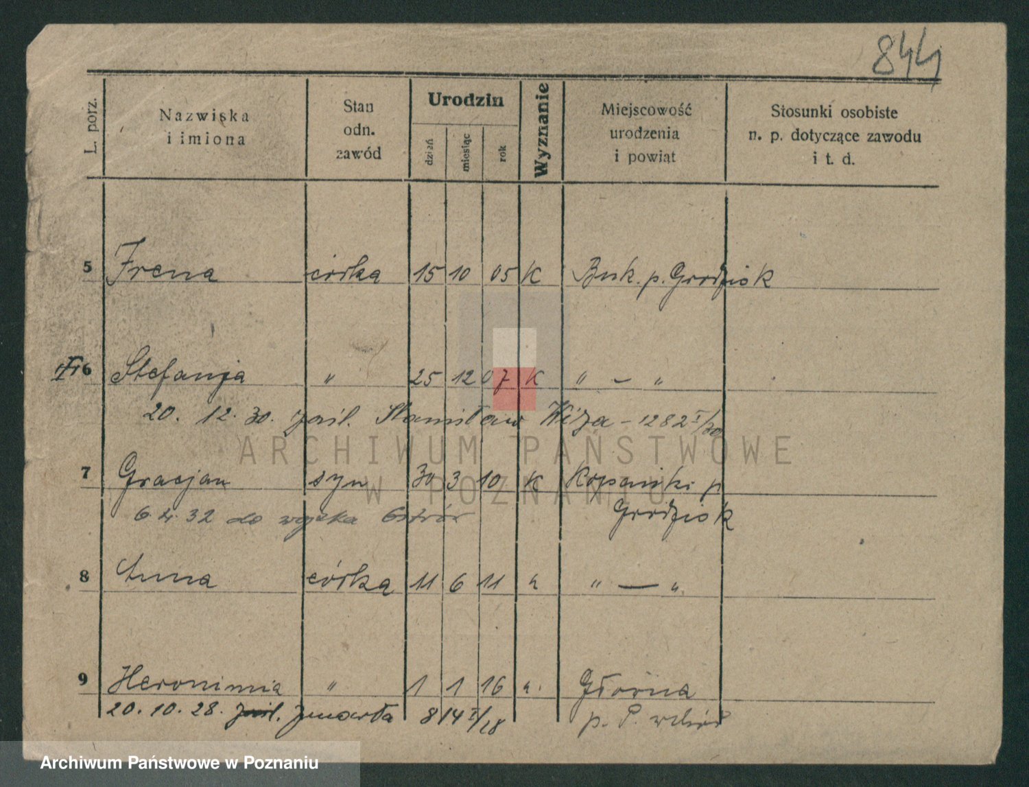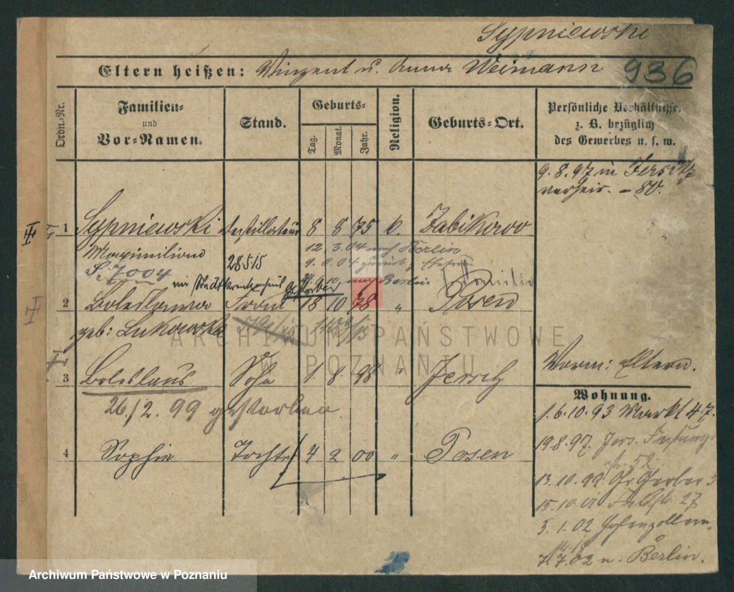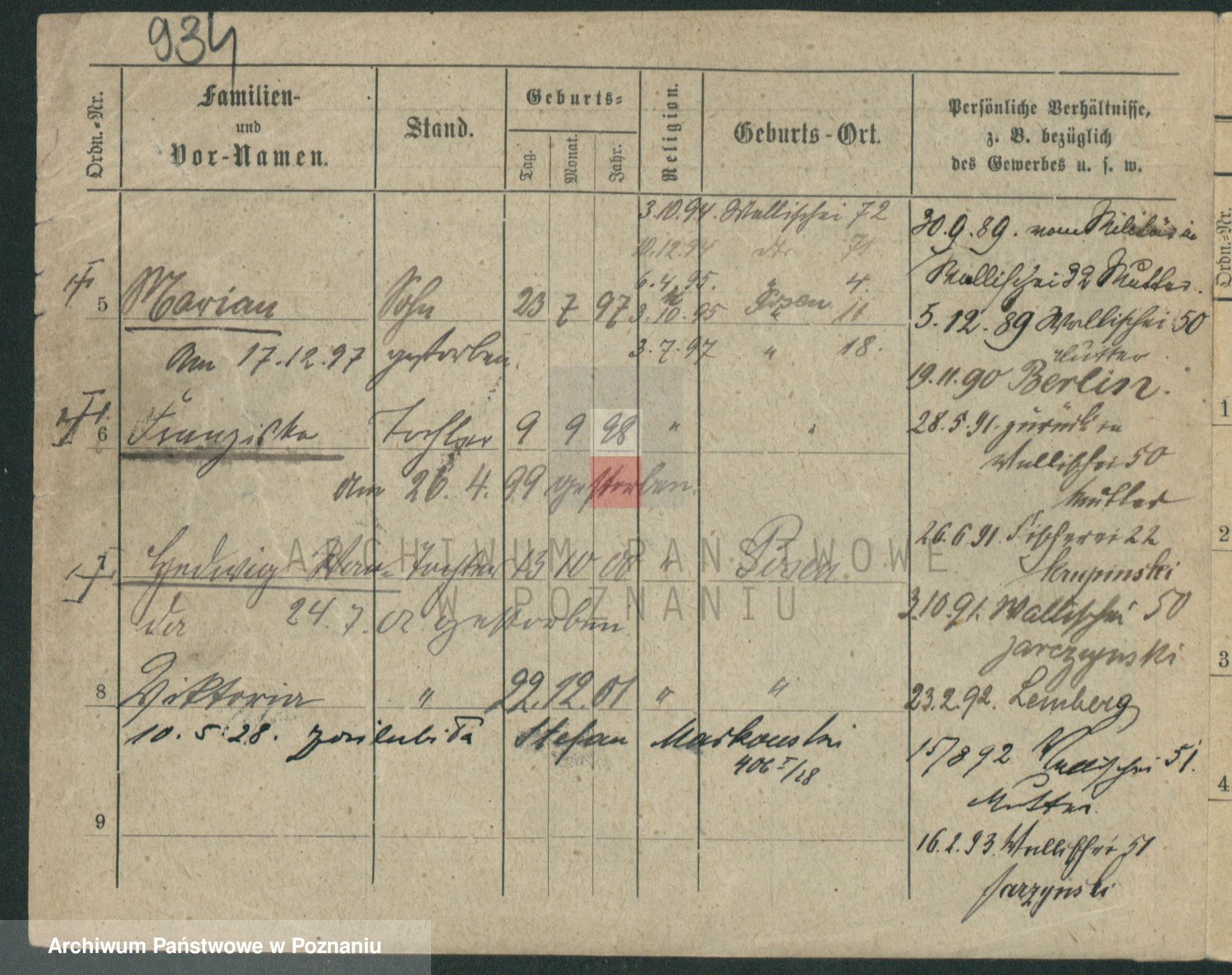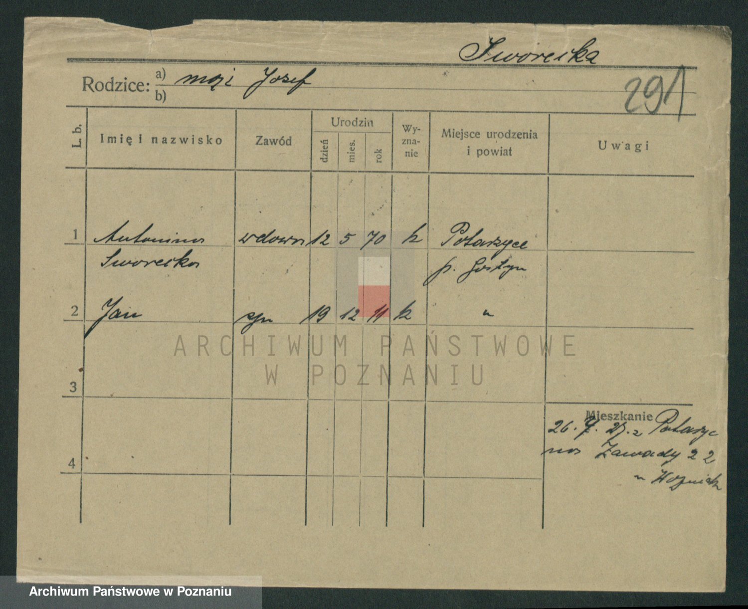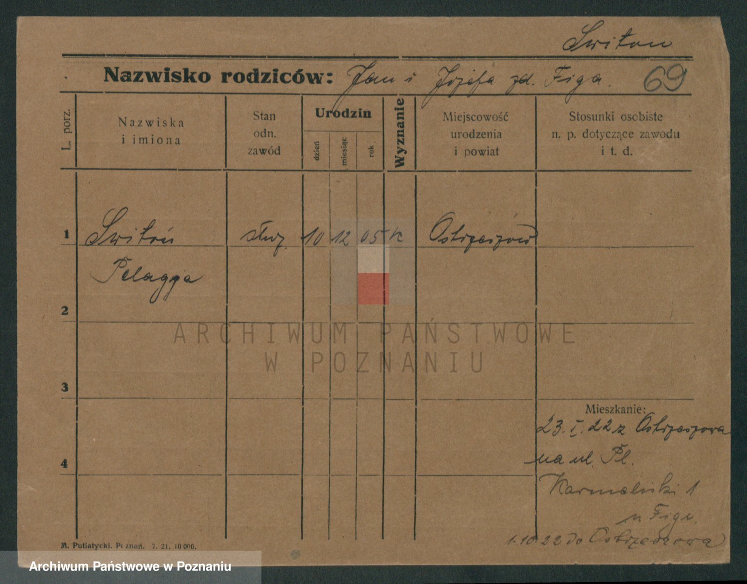 Podgląd karty osobowej dostępny jest po kliknięciu na nazwisko lub ikonkę karty. Można dokonywać powiększenia (ikony na górze) lub przechodzić między kolejnymi skanami (strzałki po bokach).