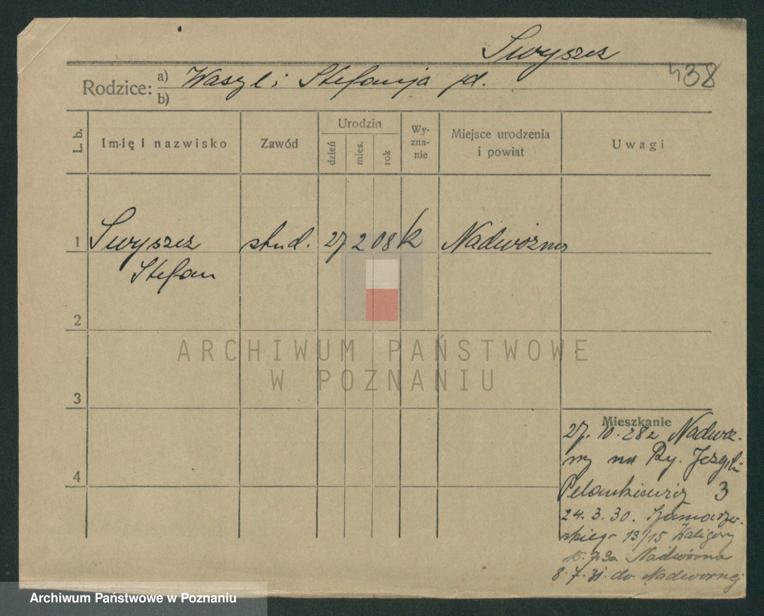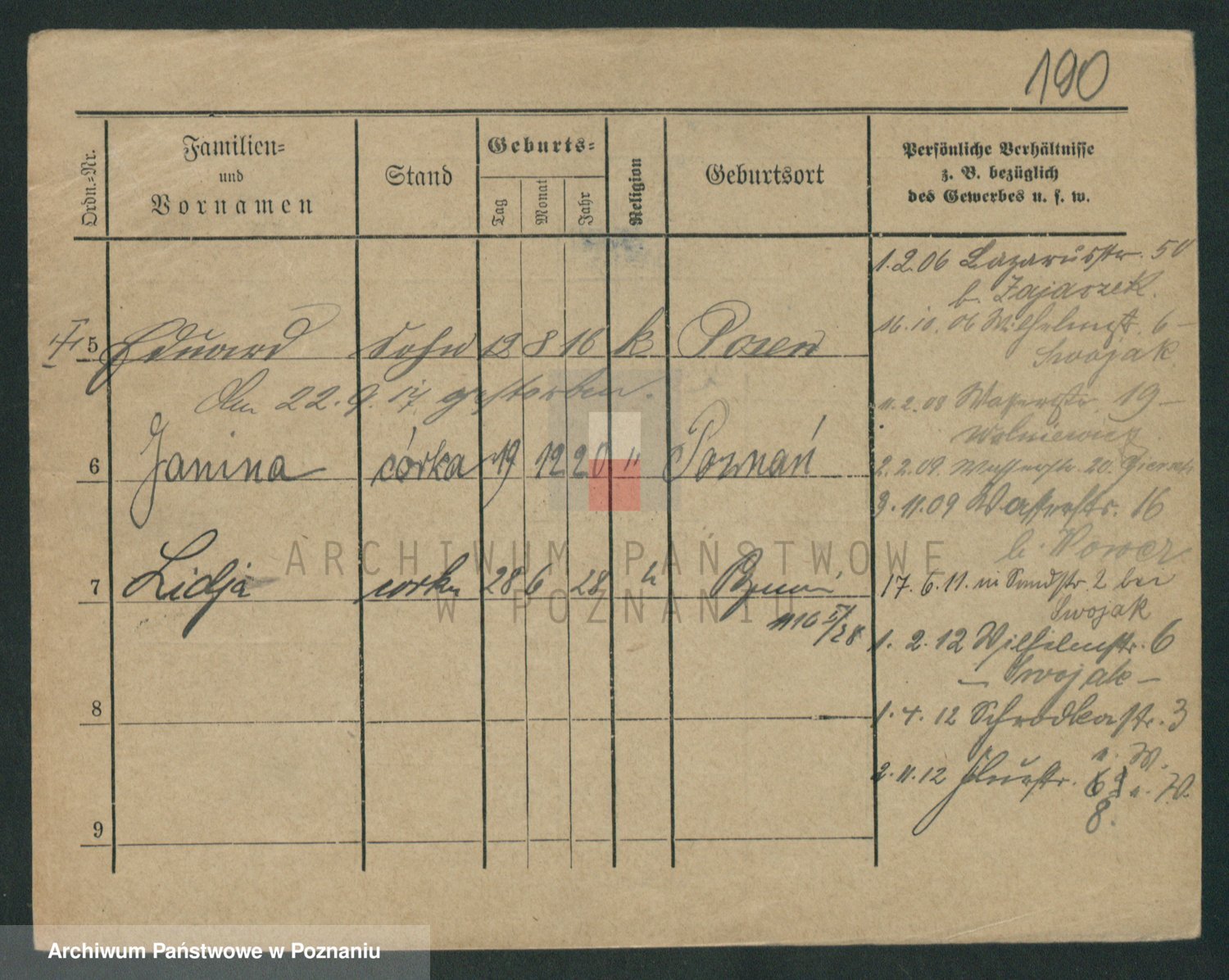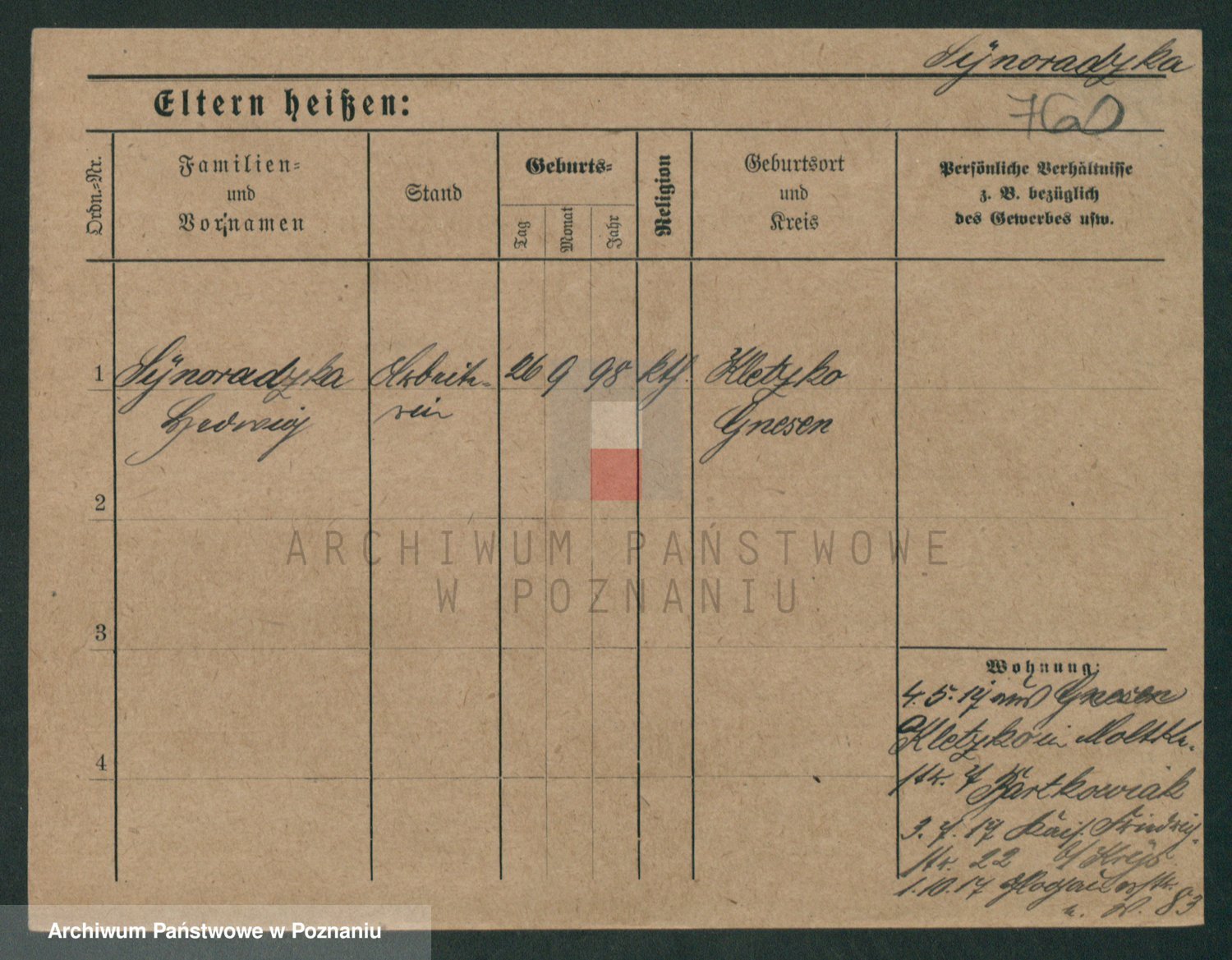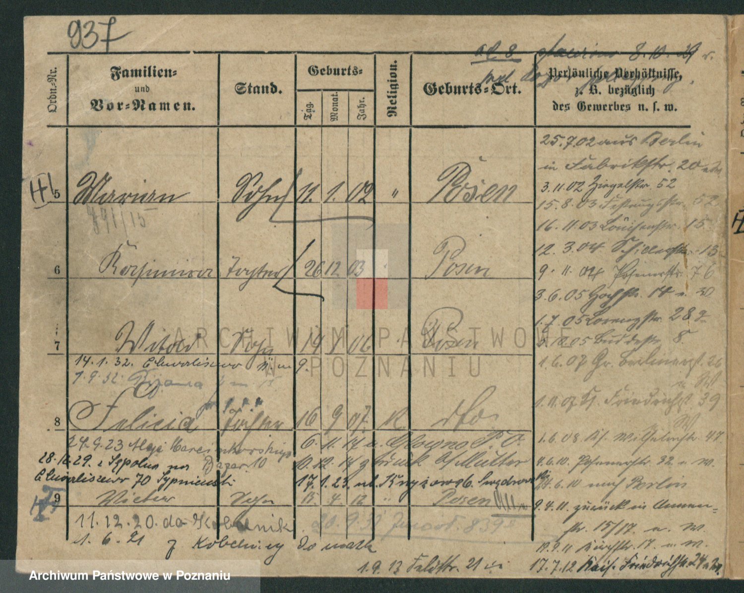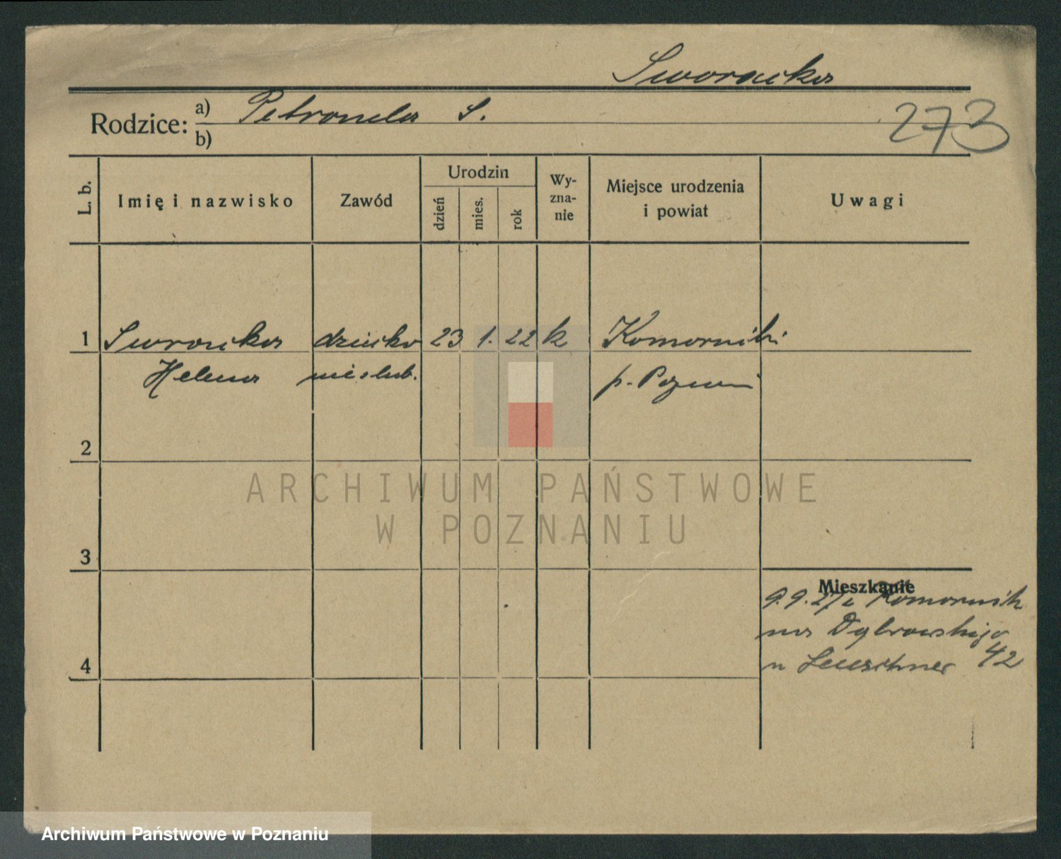 Podgląd karty osobowej dostępny jest po kliknięciu na nazwisko lub ikonkę karty. Można dokonywać powiększenia (ikony na górze) lub przechodzić między kolejnymi skanami (strzałki po bokach).