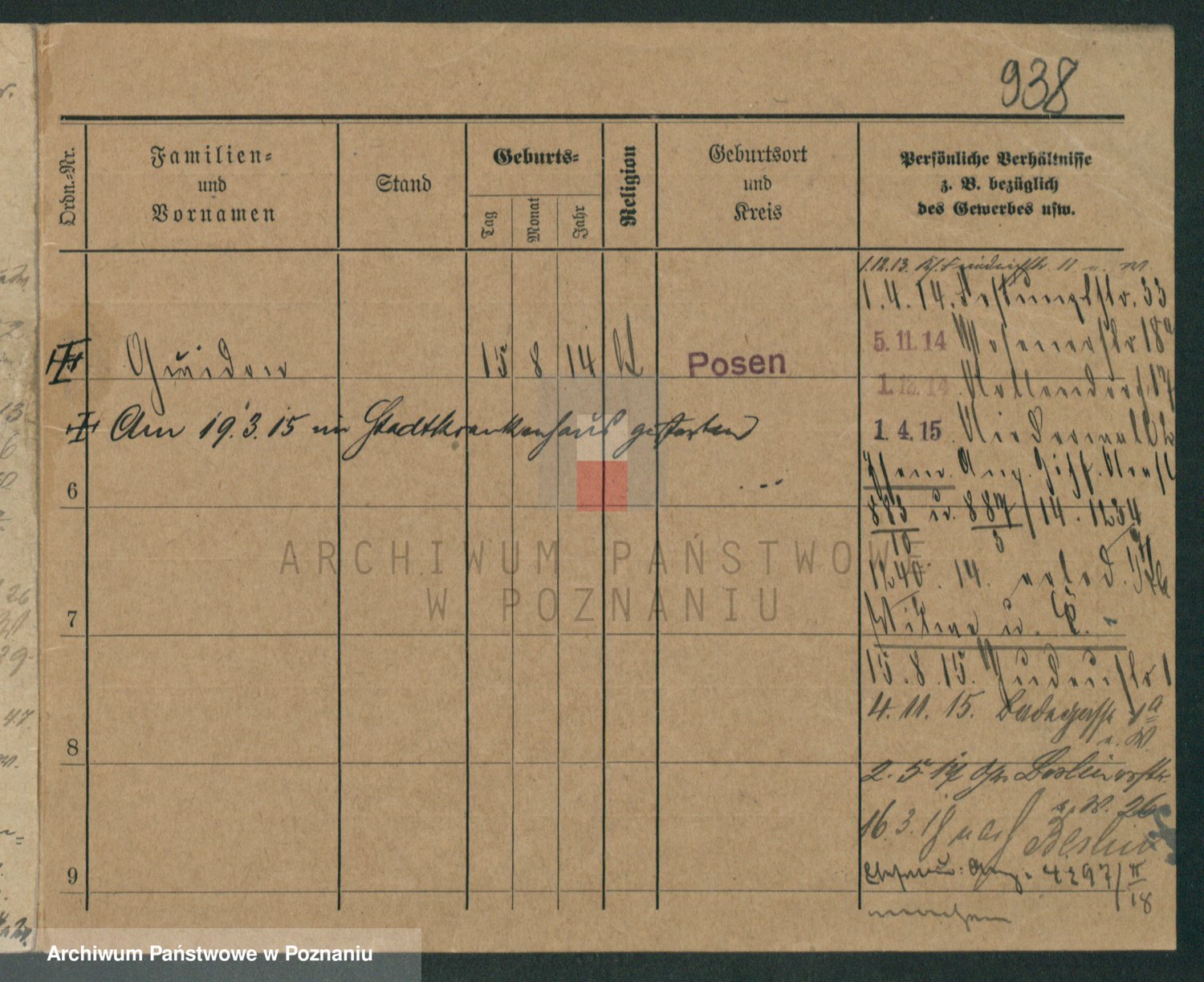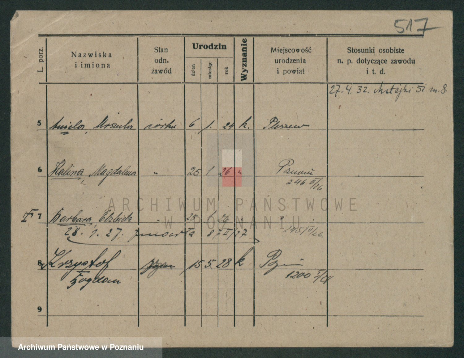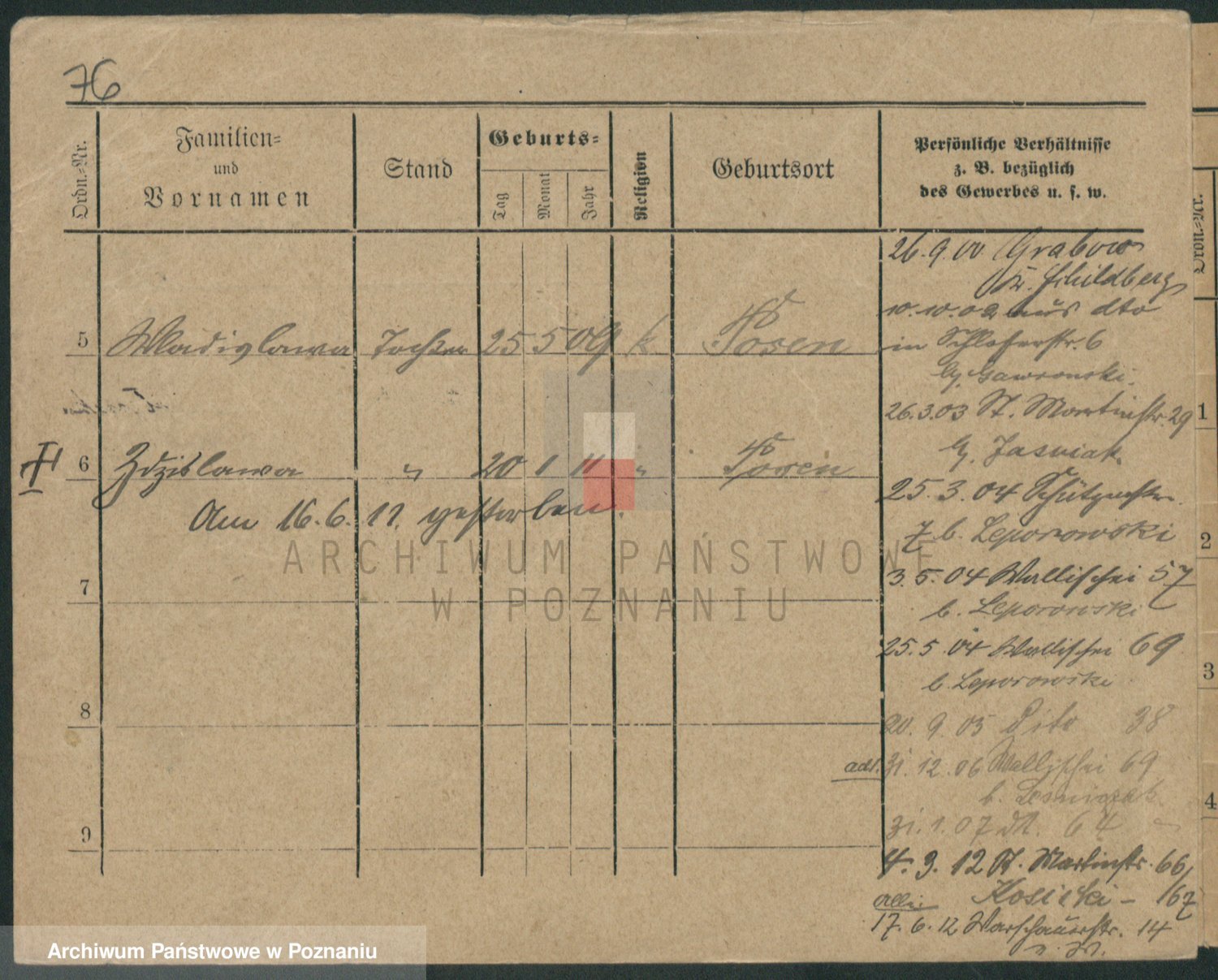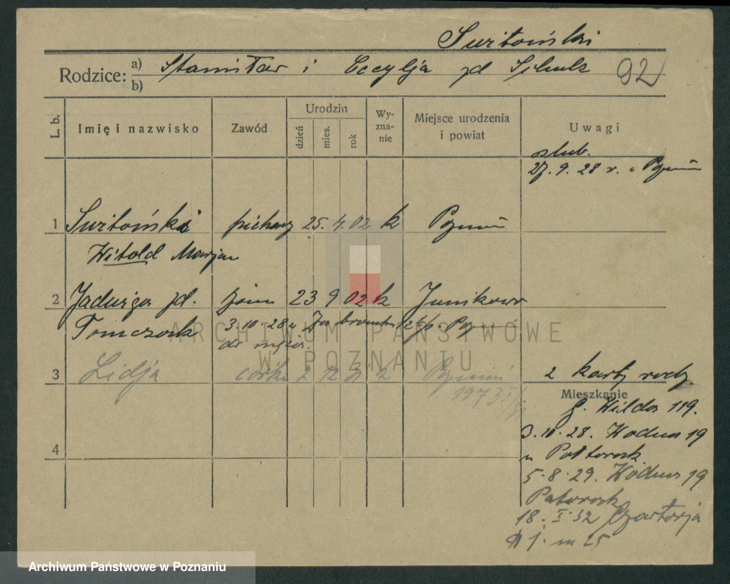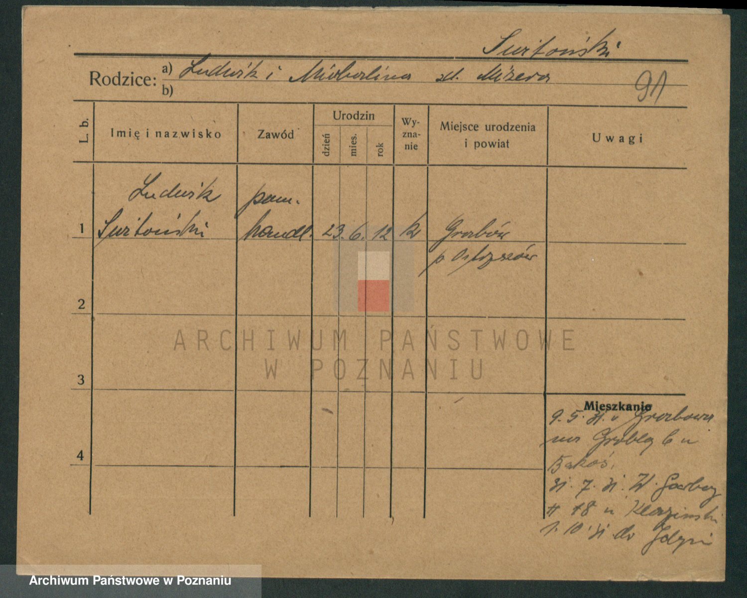 Podgląd karty osobowej dostępny jest po kliknięciu na nazwisko lub ikonkę karty. Można dokonywać powiększenia (ikony na górze) lub przechodzić między kolejnymi skanami (strzałki po bokach).
