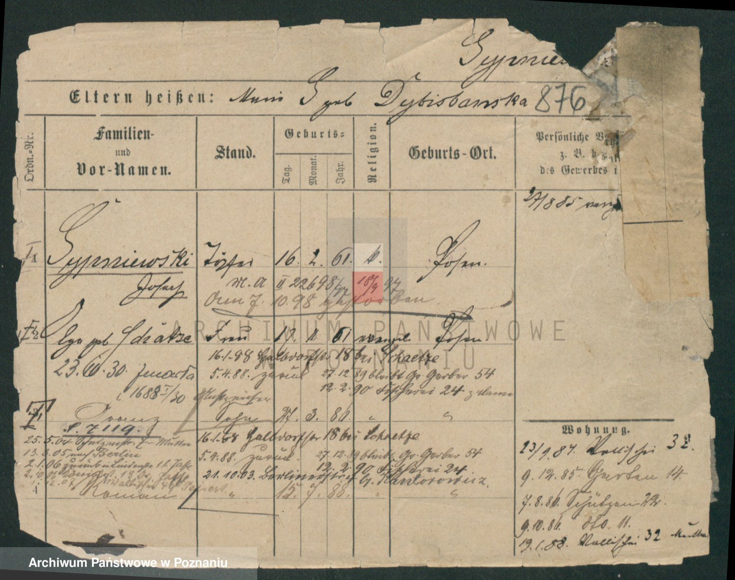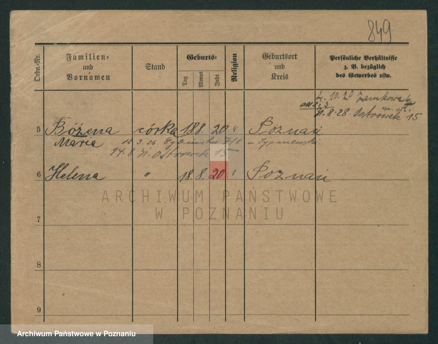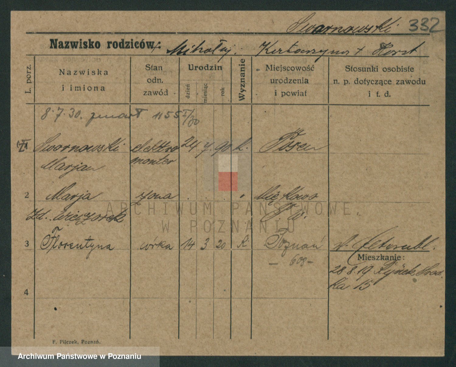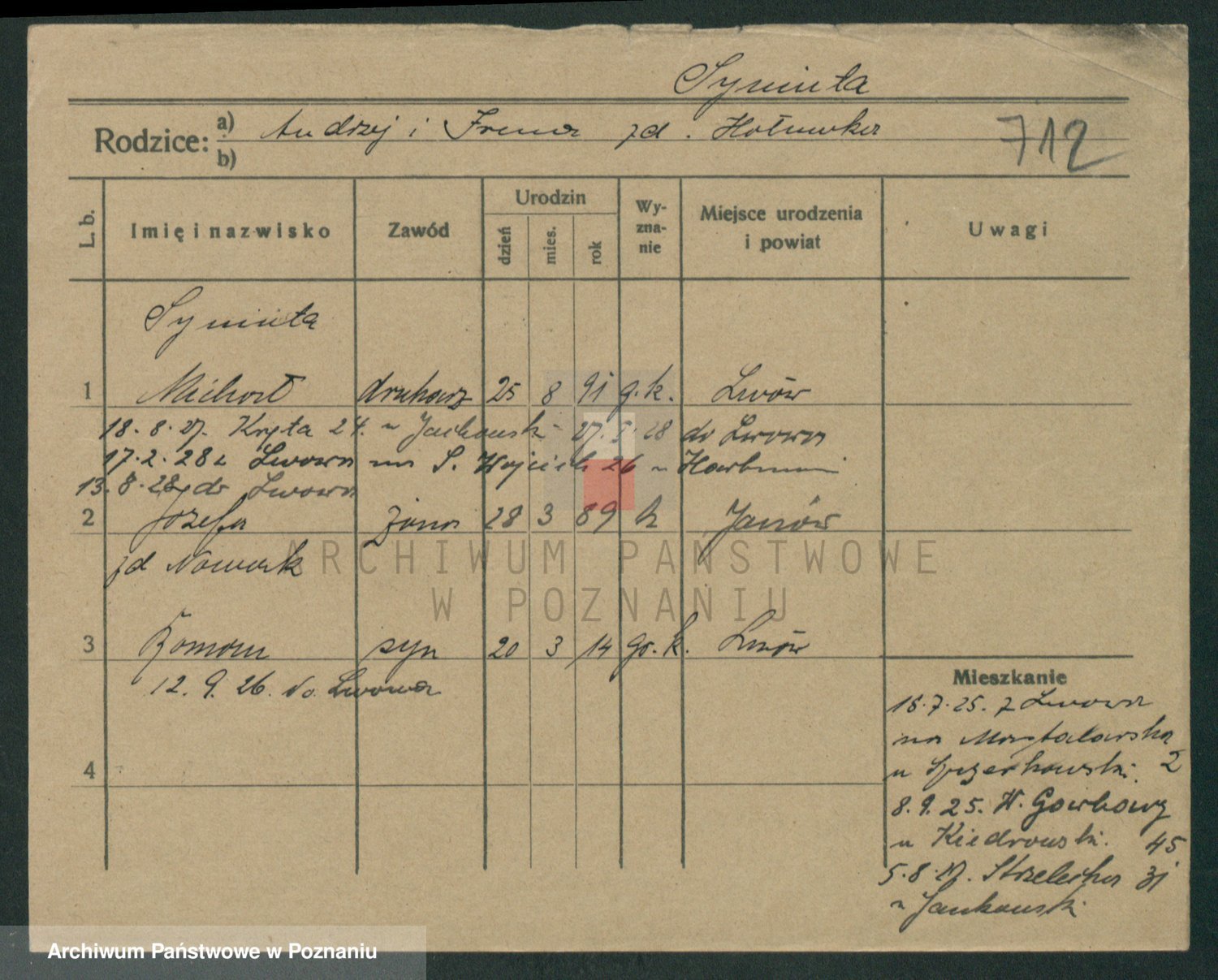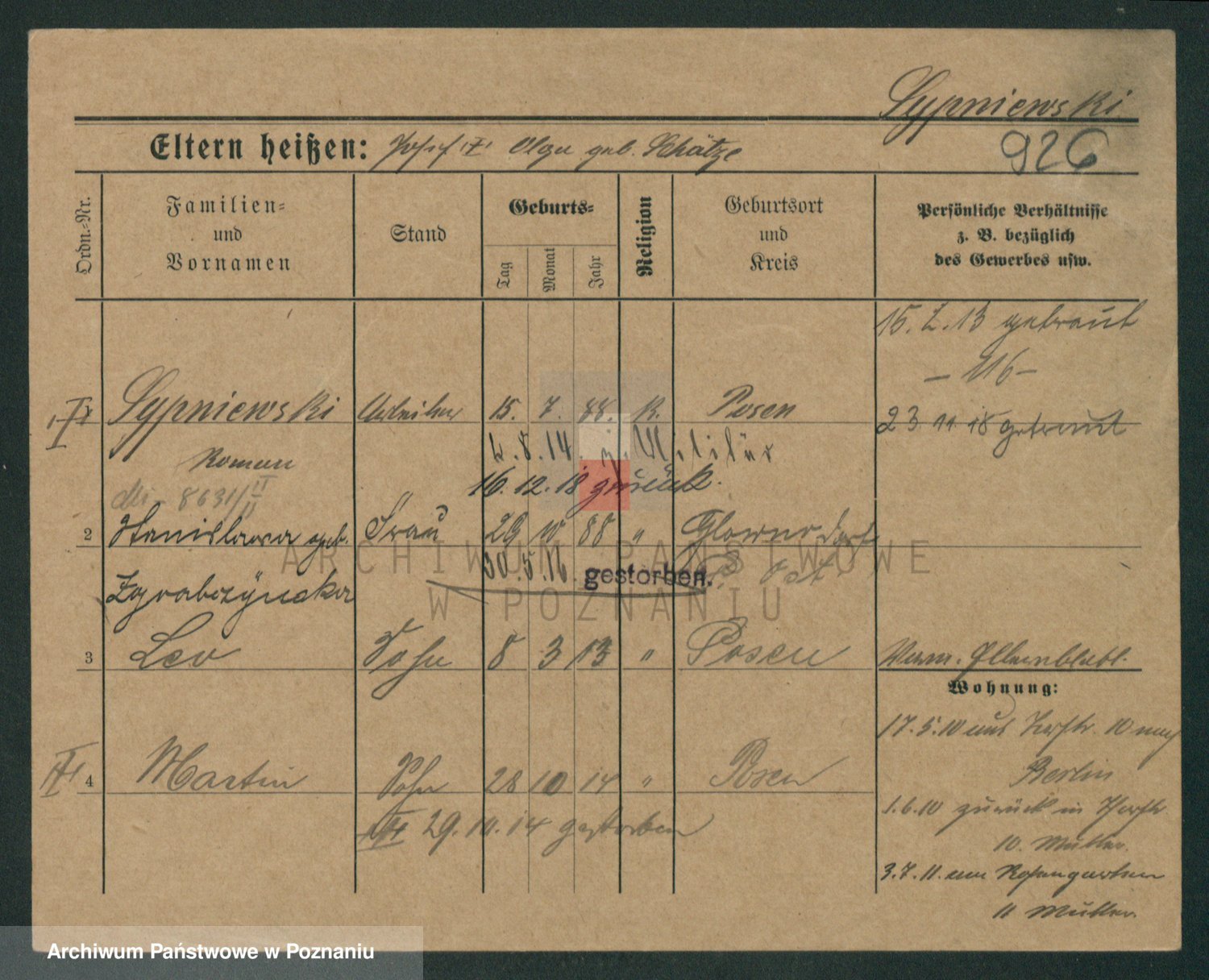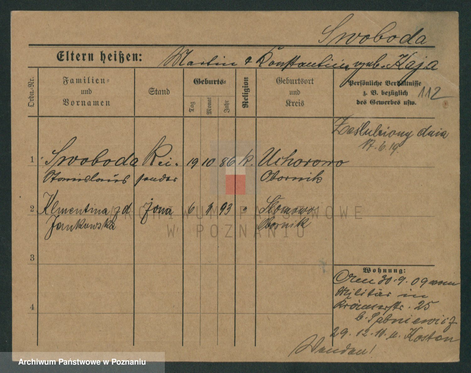 Podgląd karty osobowej dostępny jest po kliknięciu na nazwisko lub ikonkę karty. Można dokonywać powiększenia (ikony na górze) lub przechodzić między kolejnymi skanami (strzałki po bokach).