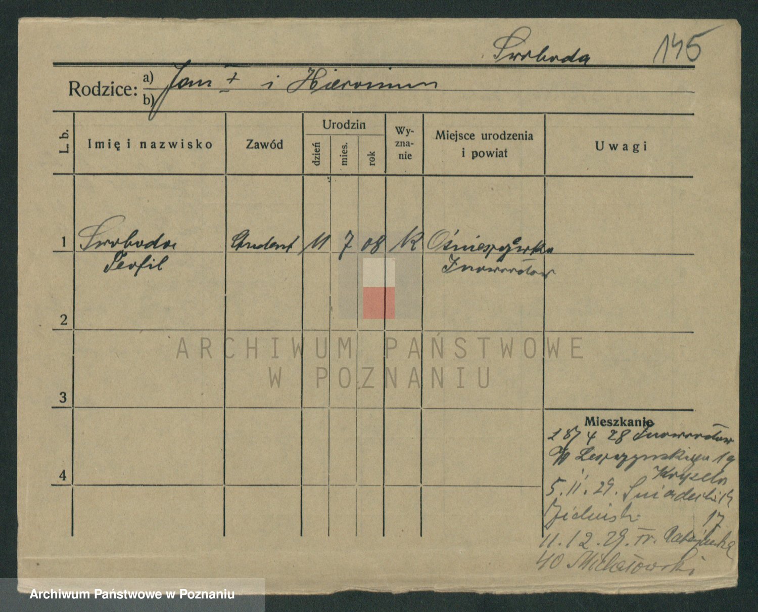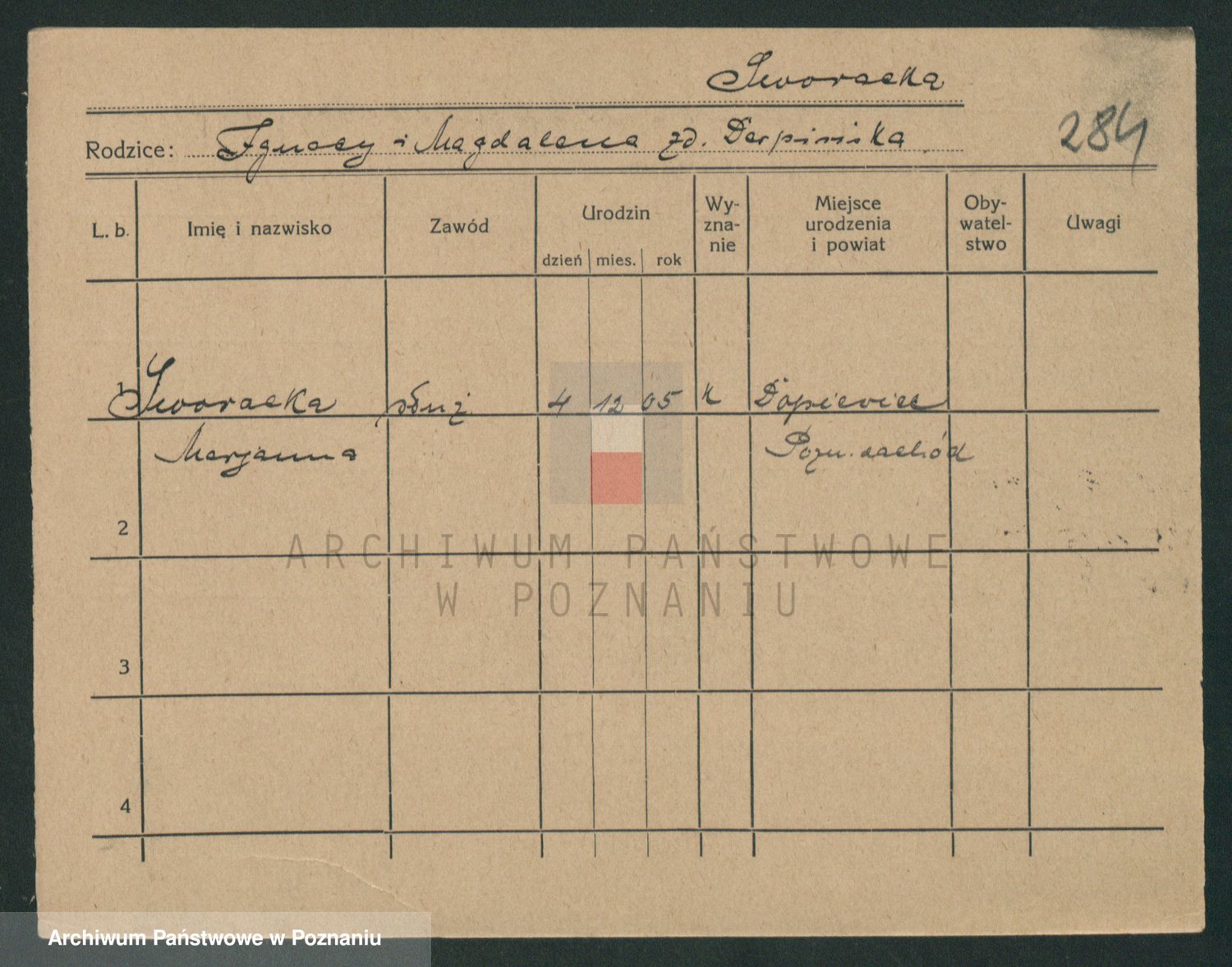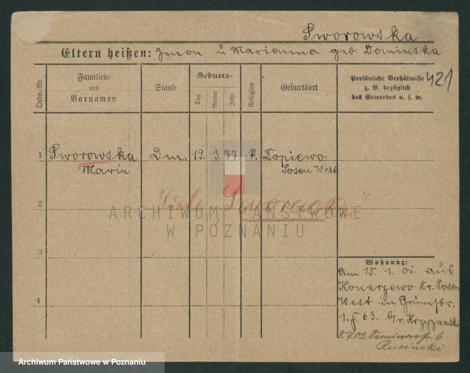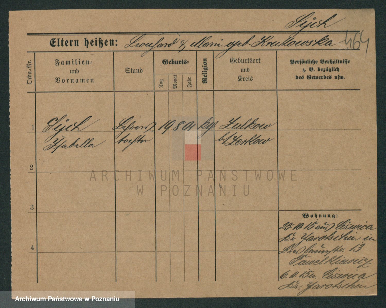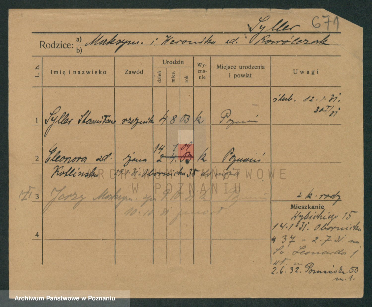 Podgląd karty osobowej dostępny jest po kliknięciu na nazwisko lub ikonkę karty. Można dokonywać powiększenia (ikony na górze) lub przechodzić między kolejnymi skanami (strzałki po bokach).