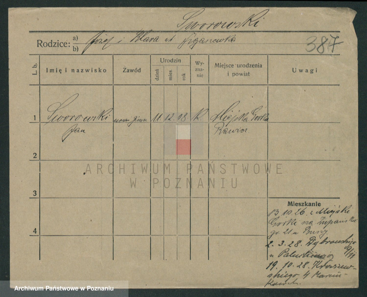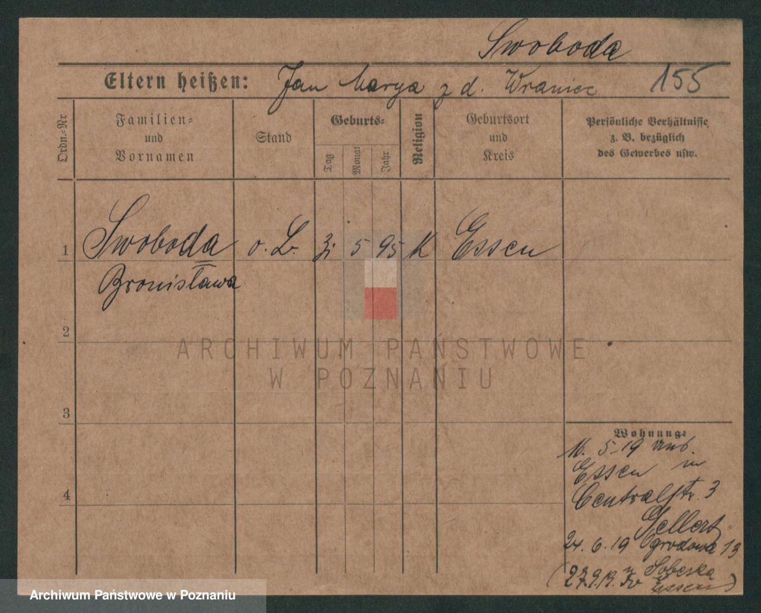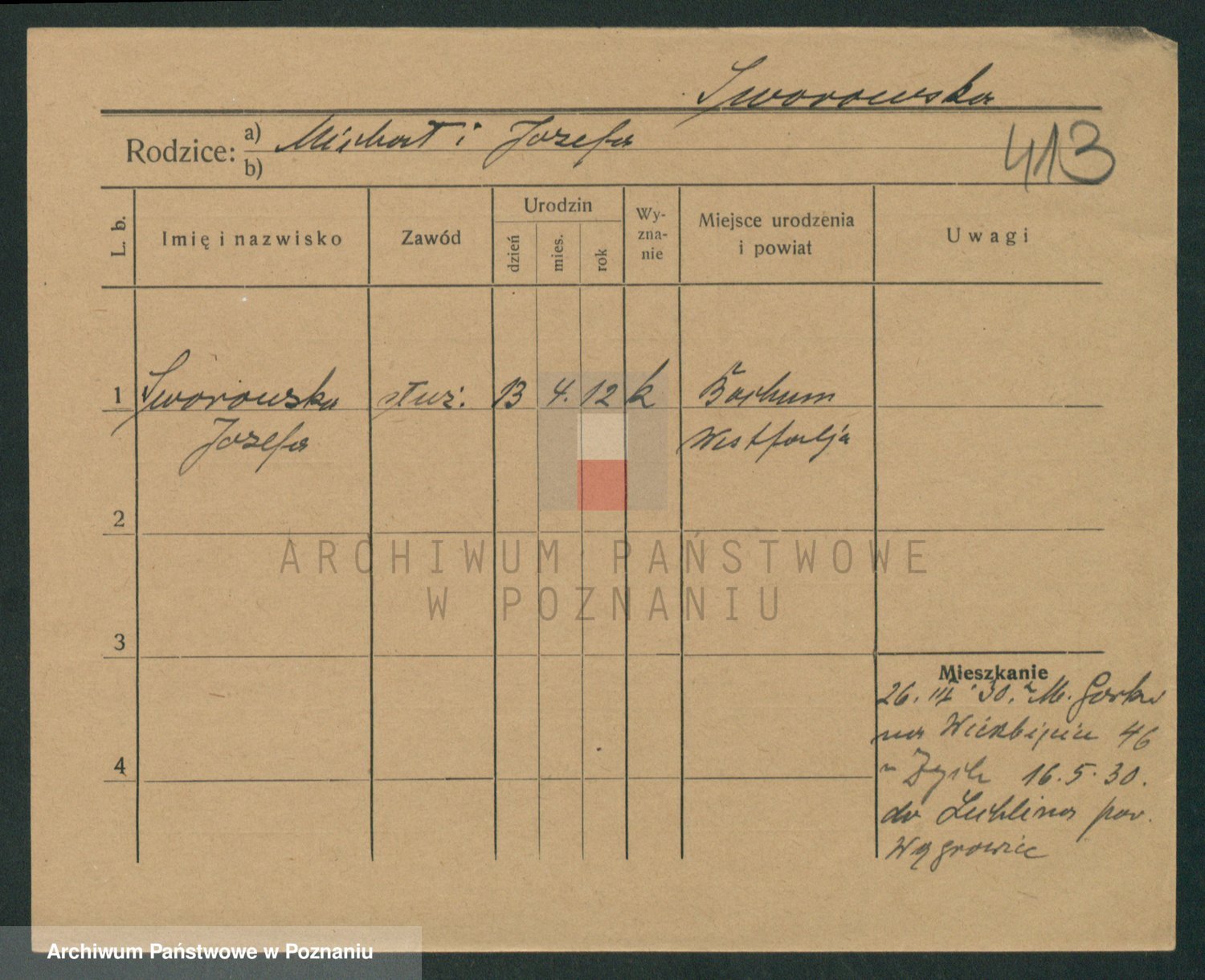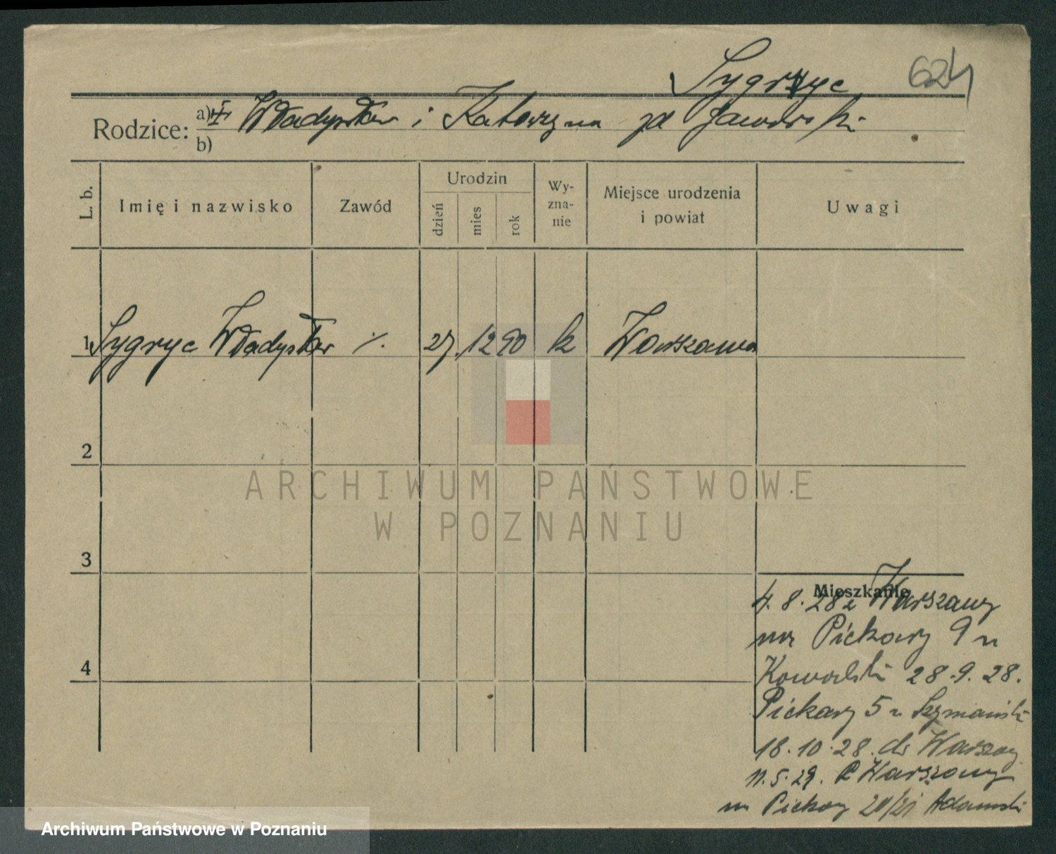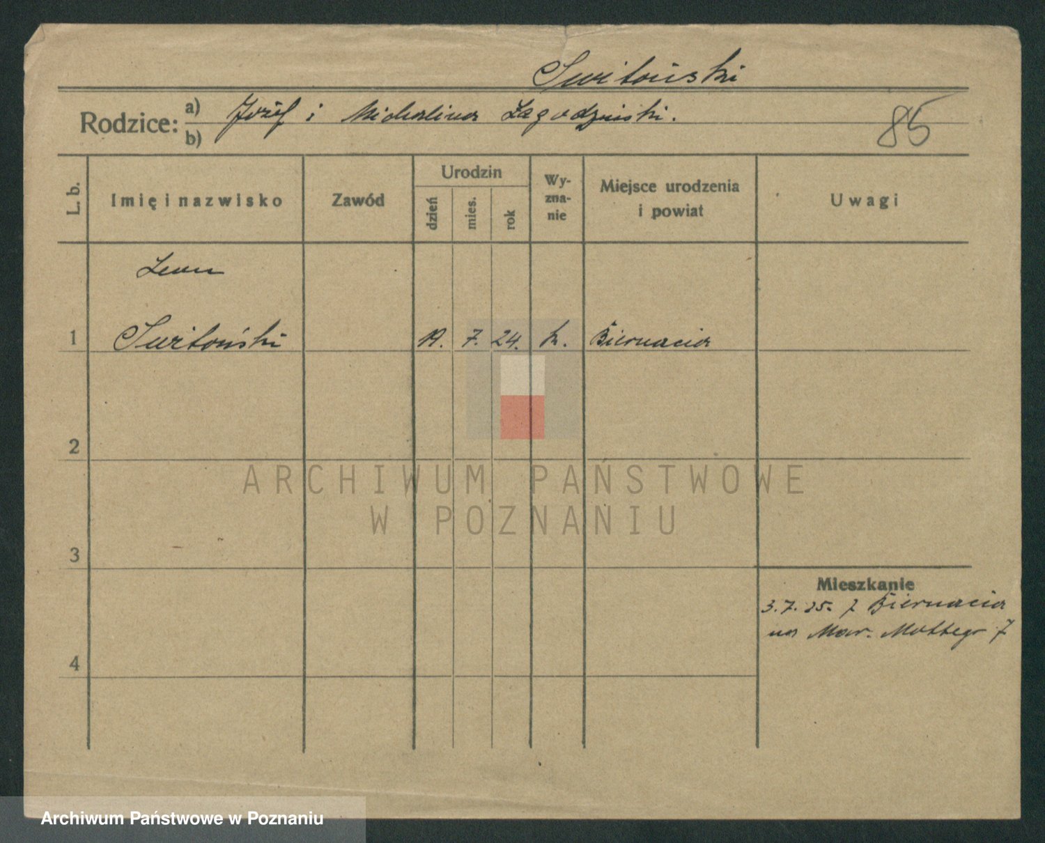 Podgląd karty osobowej dostępny jest po kliknięciu na nazwisko lub ikonkę karty. Można dokonywać powiększenia (ikony na górze) lub przechodzić między kolejnymi skanami (strzałki po bokach).