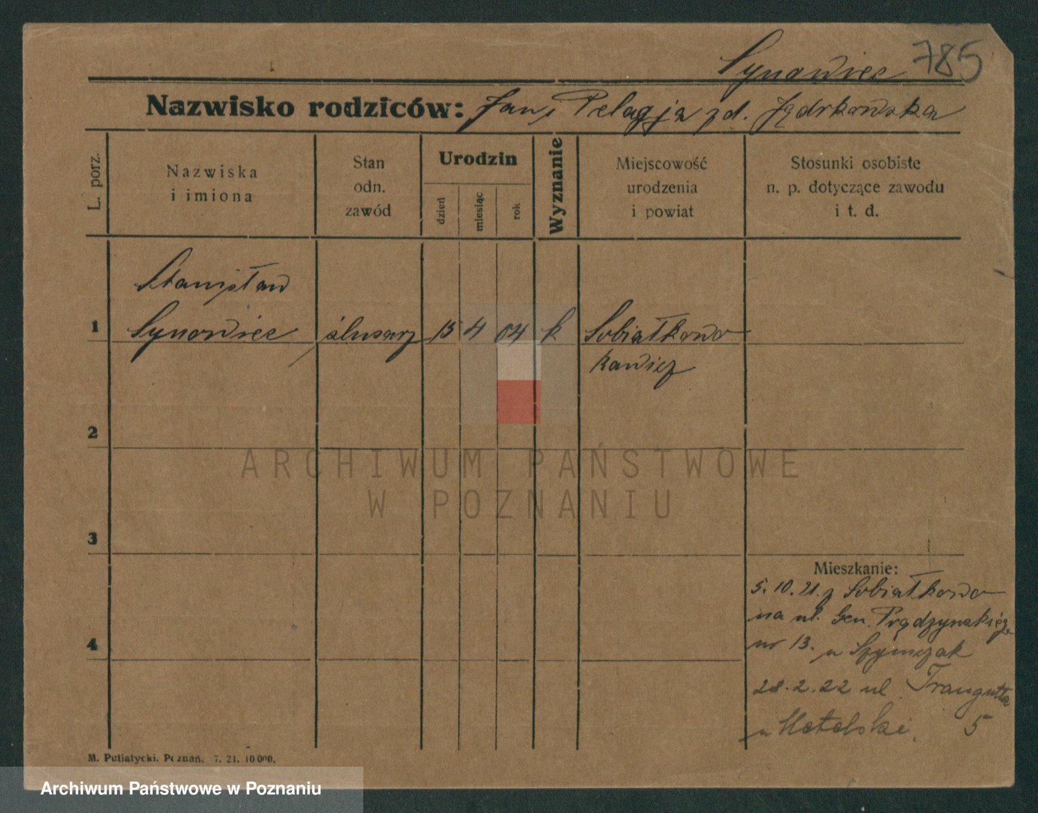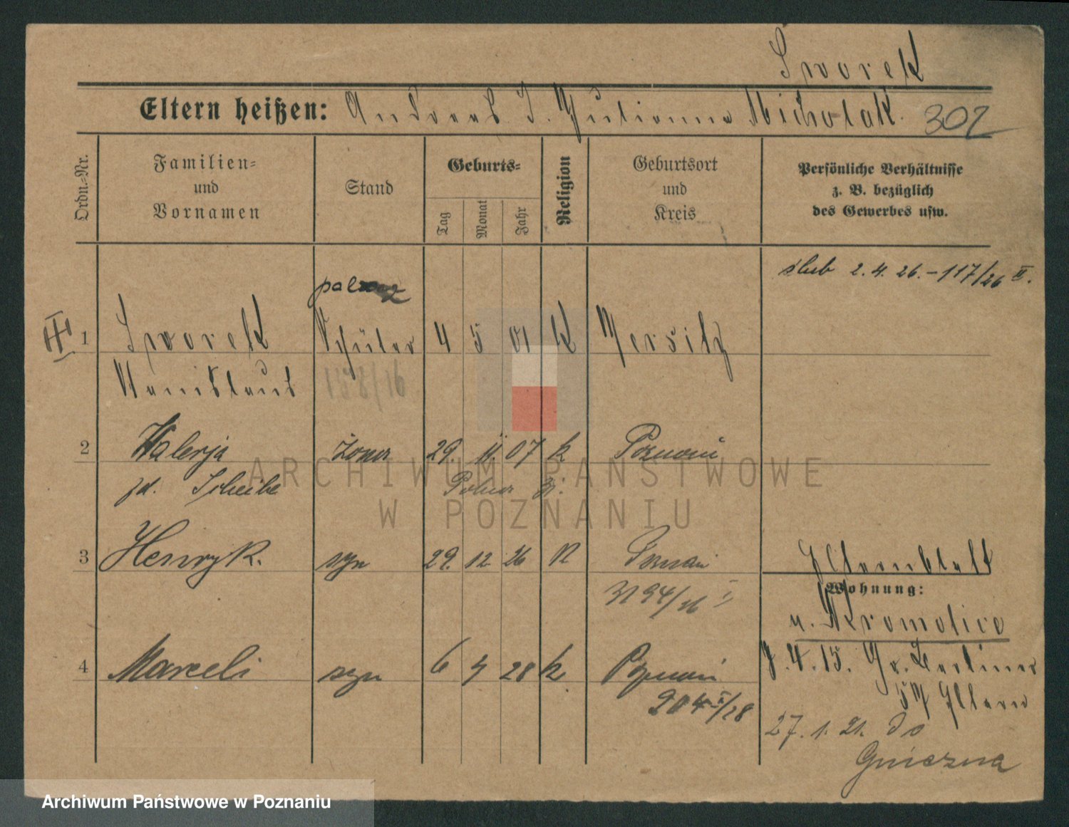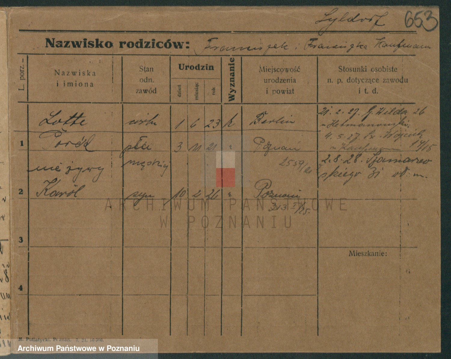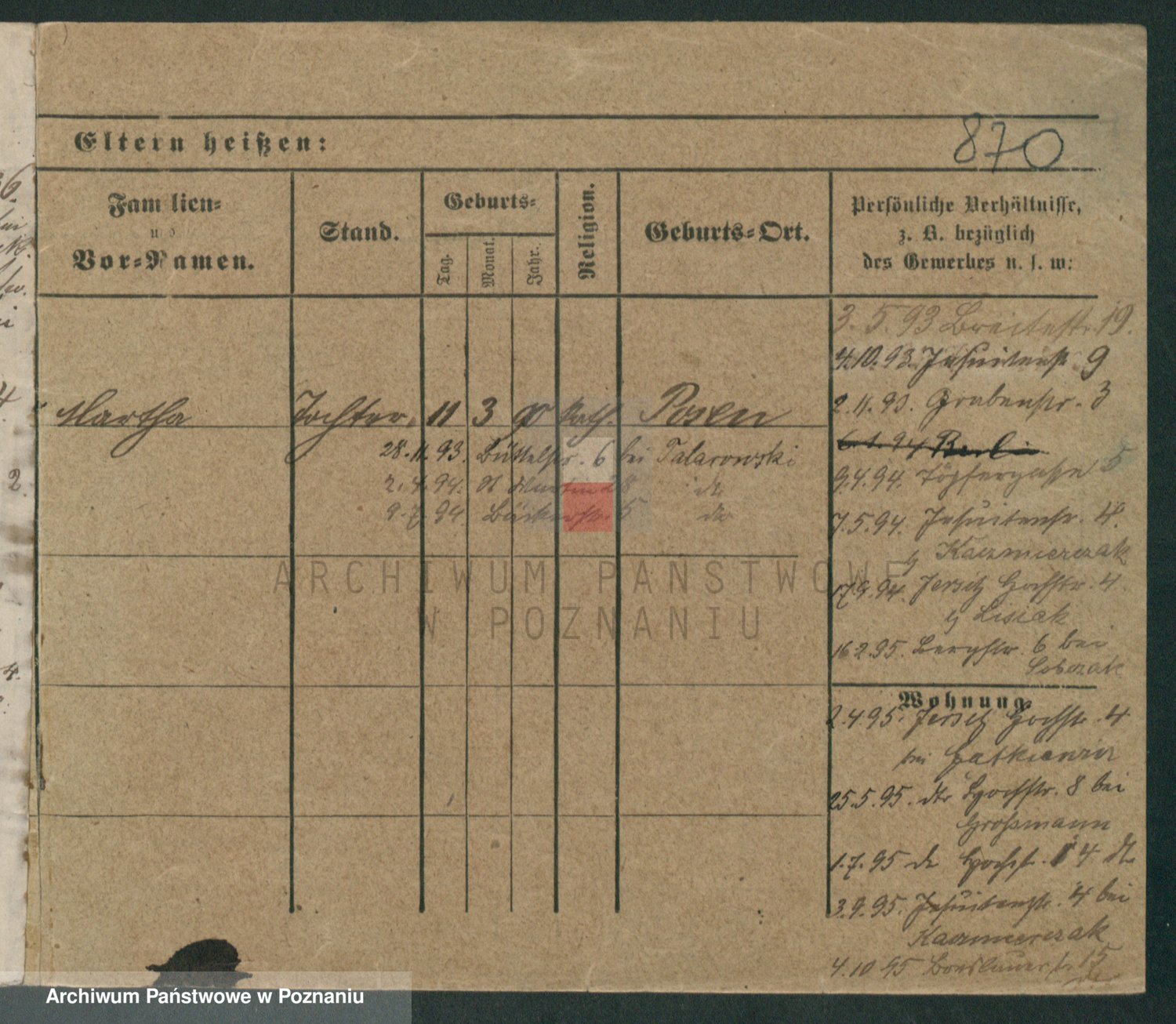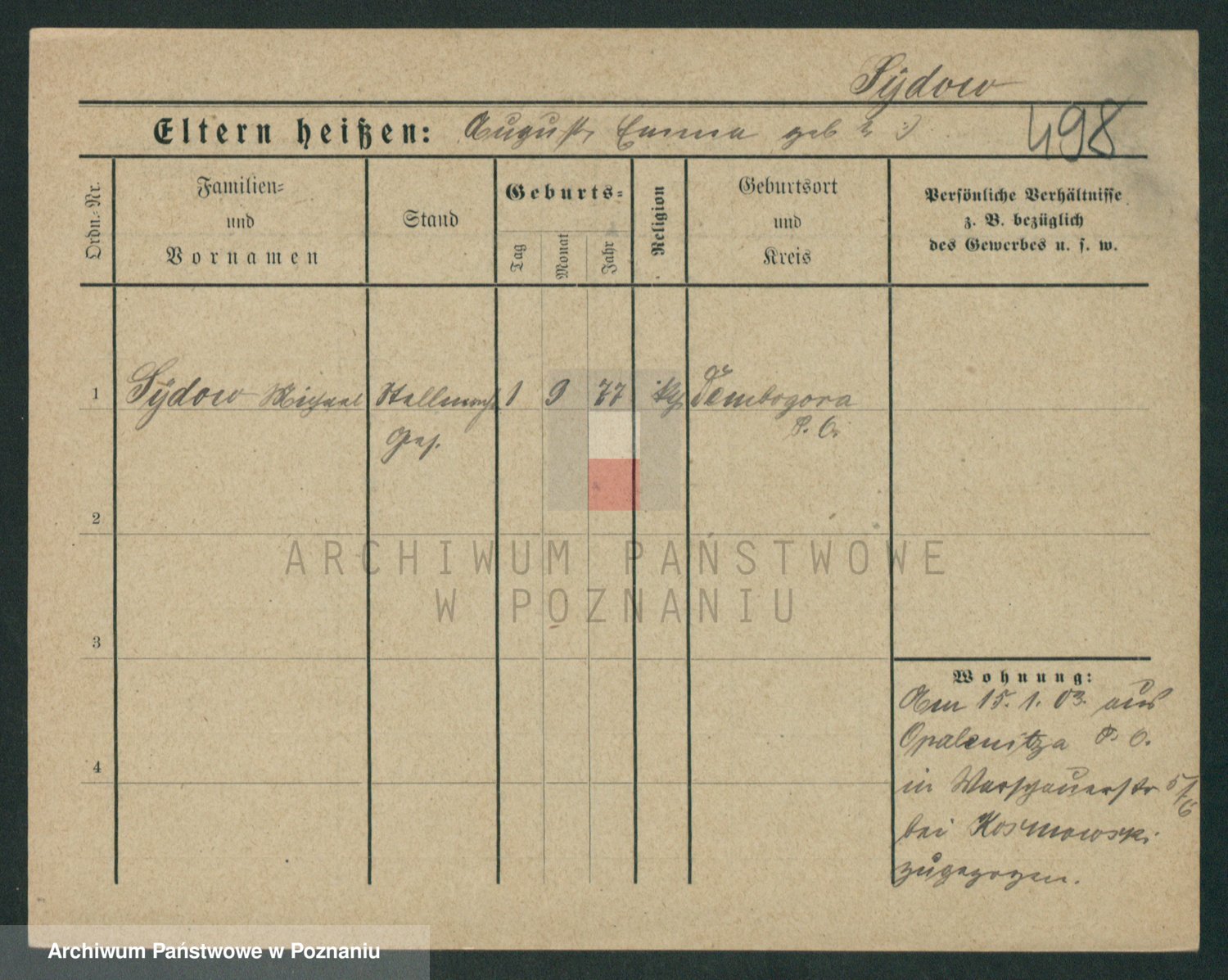 Podgląd karty osobowej dostępny jest po kliknięciu na nazwisko lub ikonkę karty. Można dokonywać powiększenia (ikony na górze) lub przechodzić między kolejnymi skanami (strzałki po bokach).