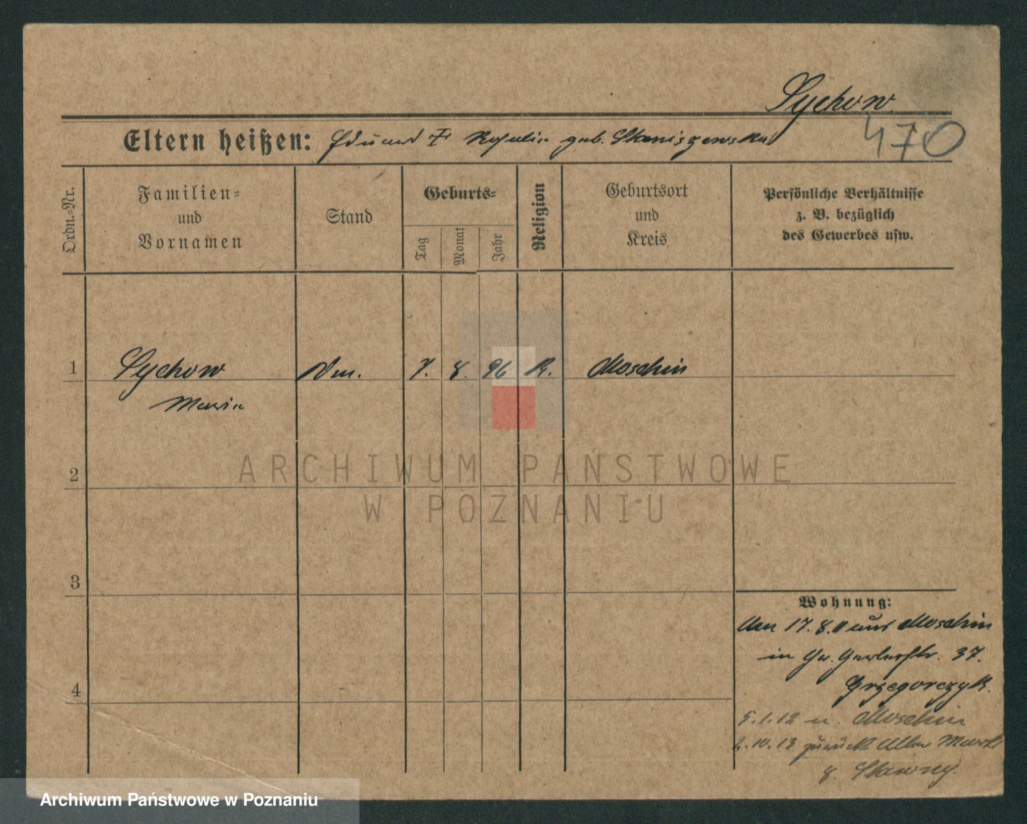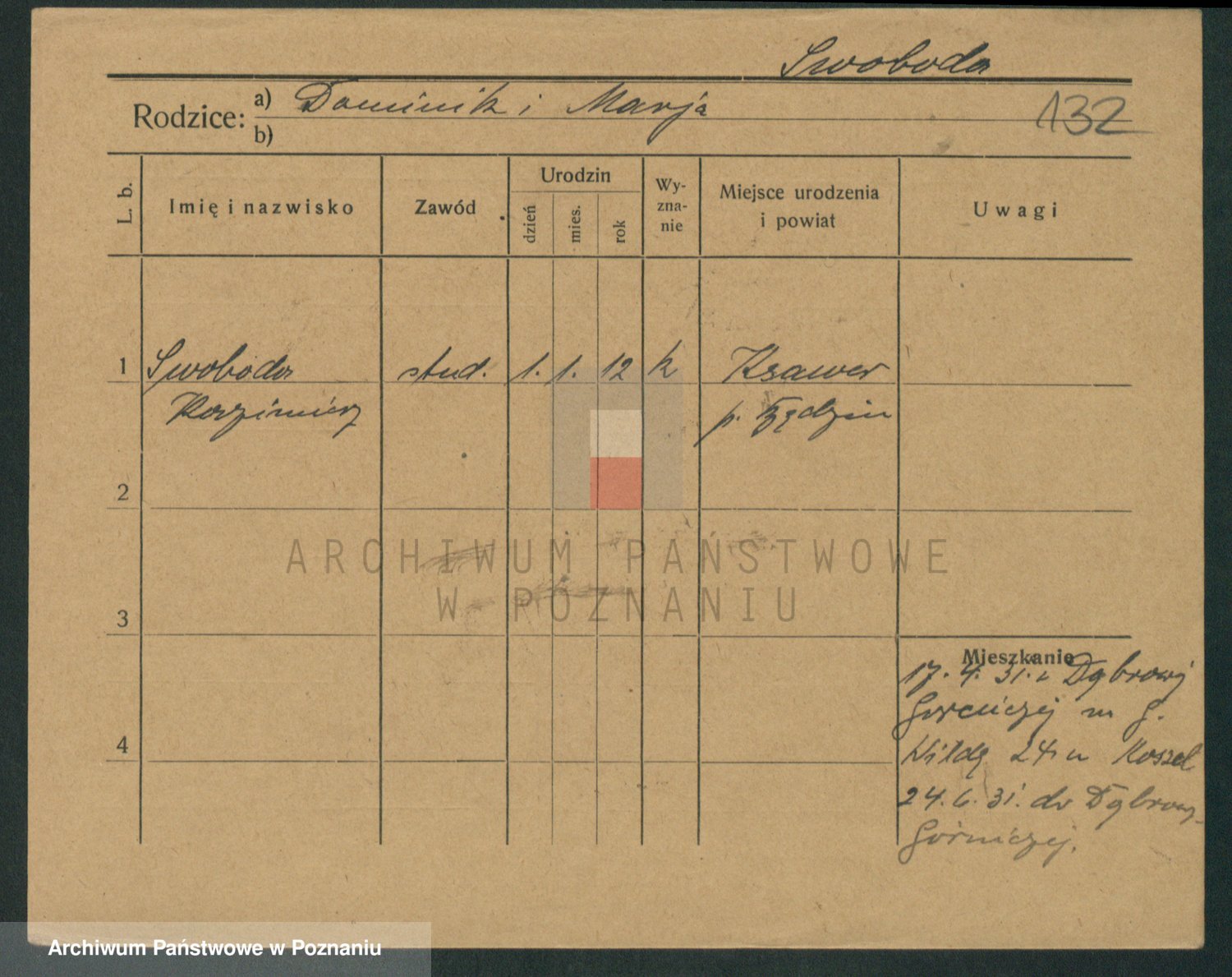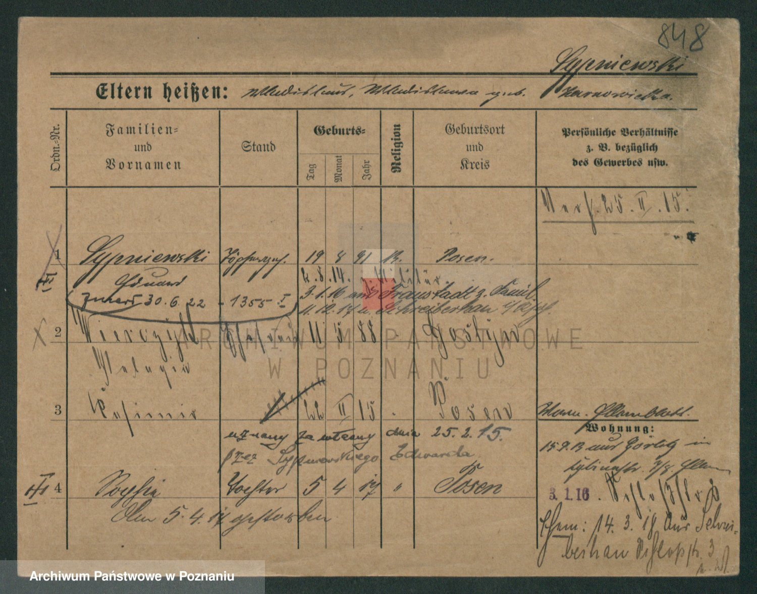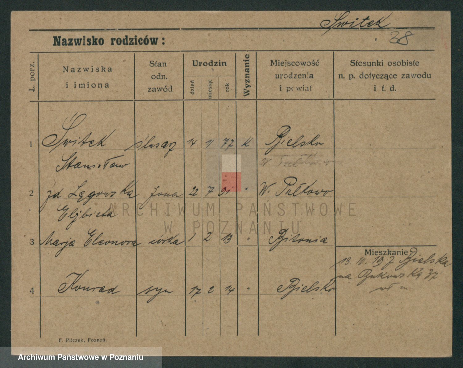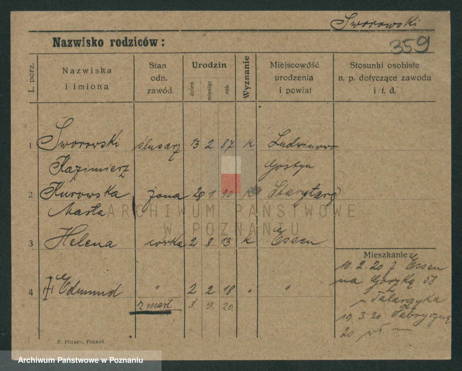 Podgląd karty osobowej dostępny jest po kliknięciu na nazwisko lub ikonkę karty. Można dokonywać powiększenia (ikony na górze) lub przechodzić między kolejnymi skanami (strzałki po bokach).