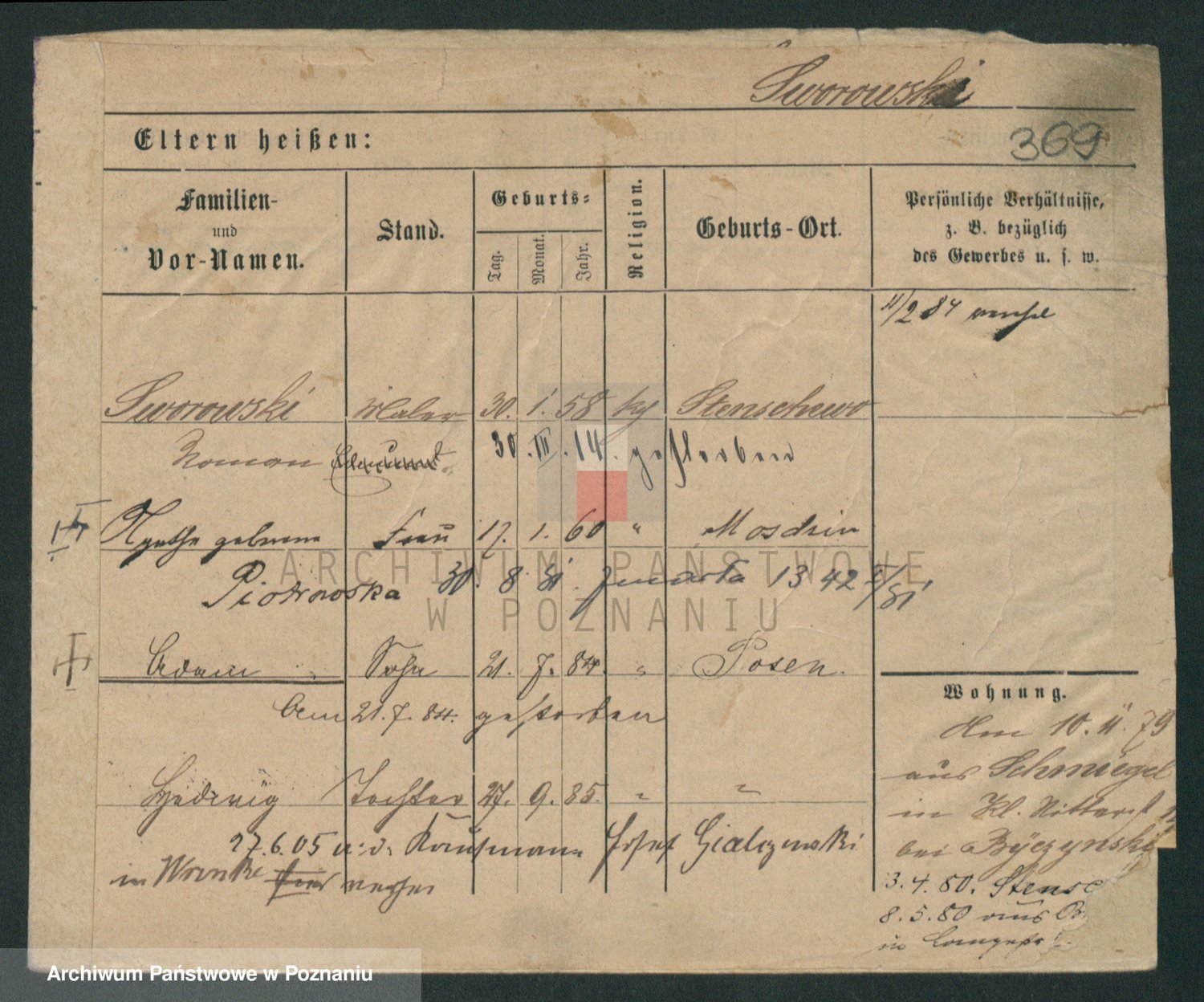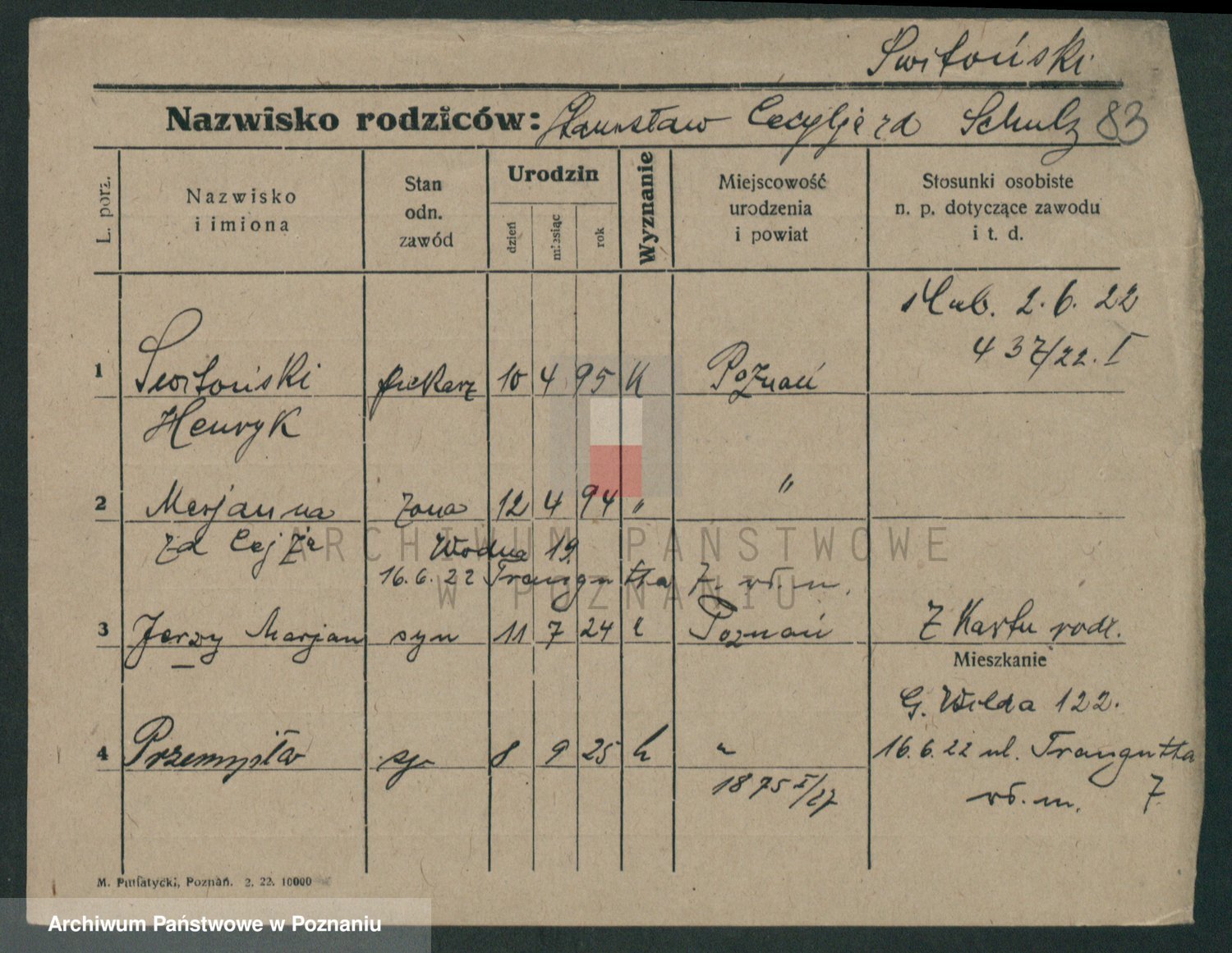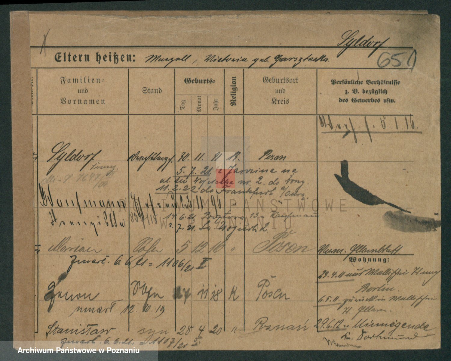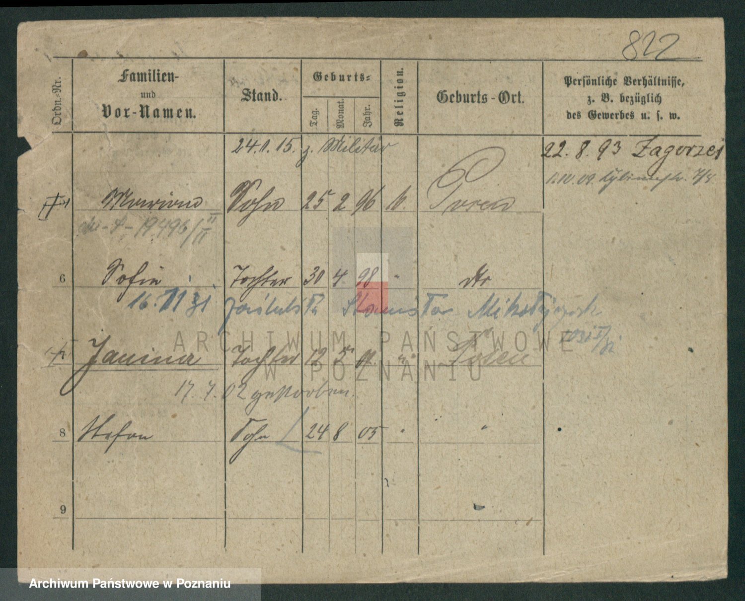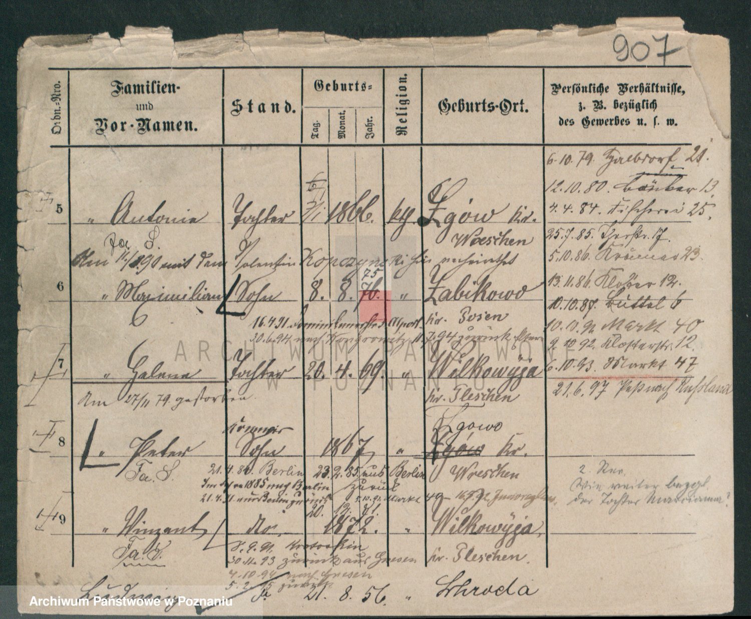 Podgląd karty osobowej dostępny jest po kliknięciu na nazwisko lub ikonkę karty. Można dokonywać powiększenia (ikony na górze) lub przechodzić między kolejnymi skanami (strzałki po bokach).