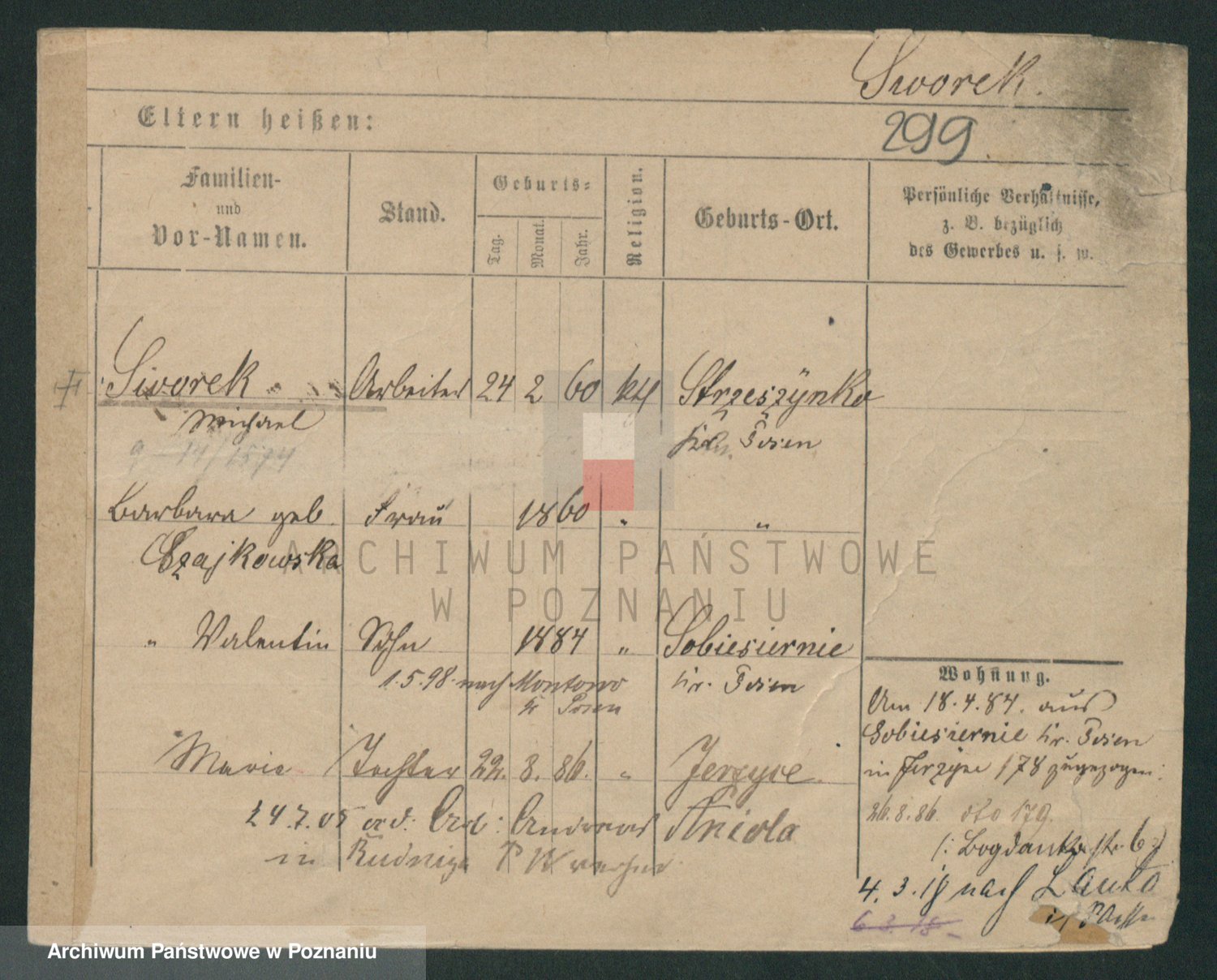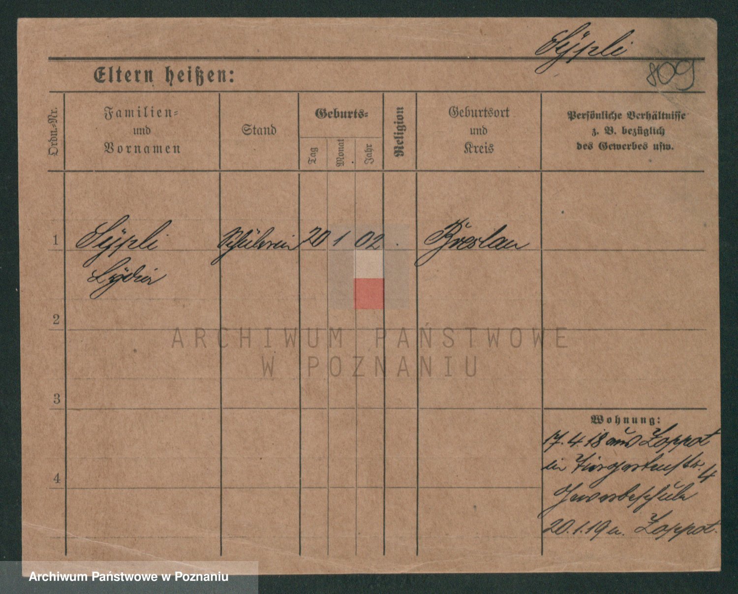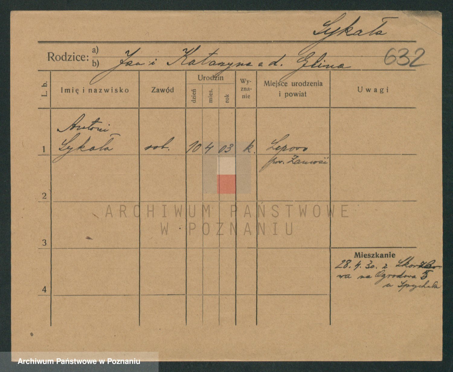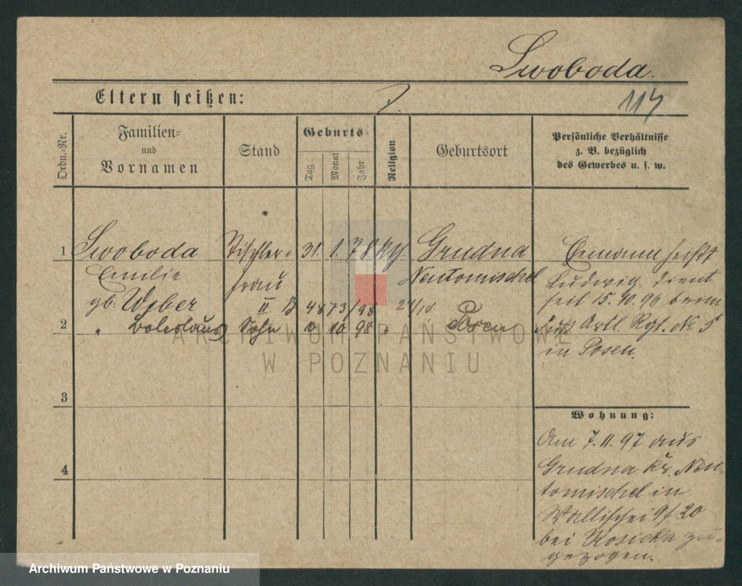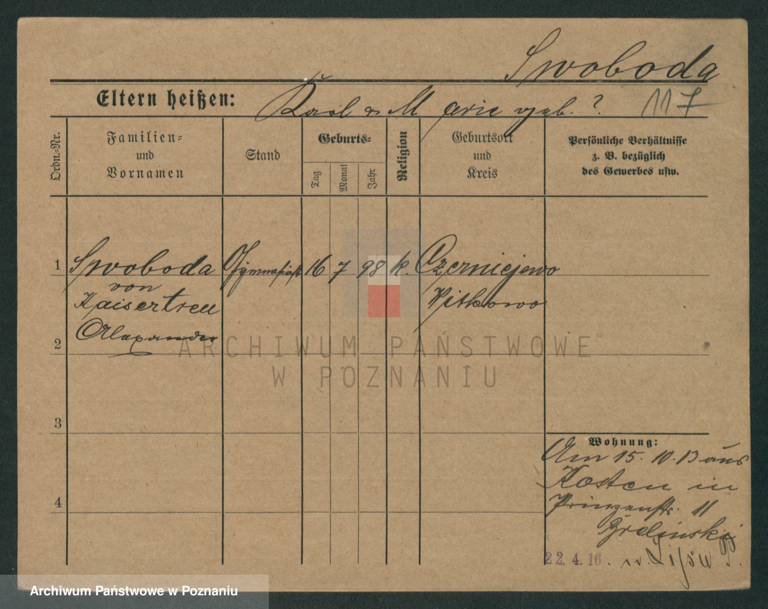 Podgląd karty osobowej dostępny jest po kliknięciu na nazwisko lub ikonkę karty. Można dokonywać powiększenia (ikony na górze) lub przechodzić między kolejnymi skanami (strzałki po bokach).