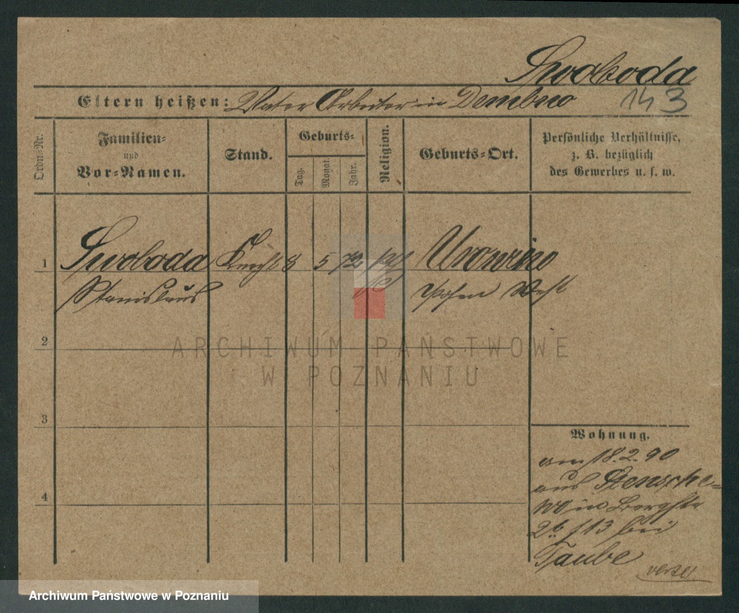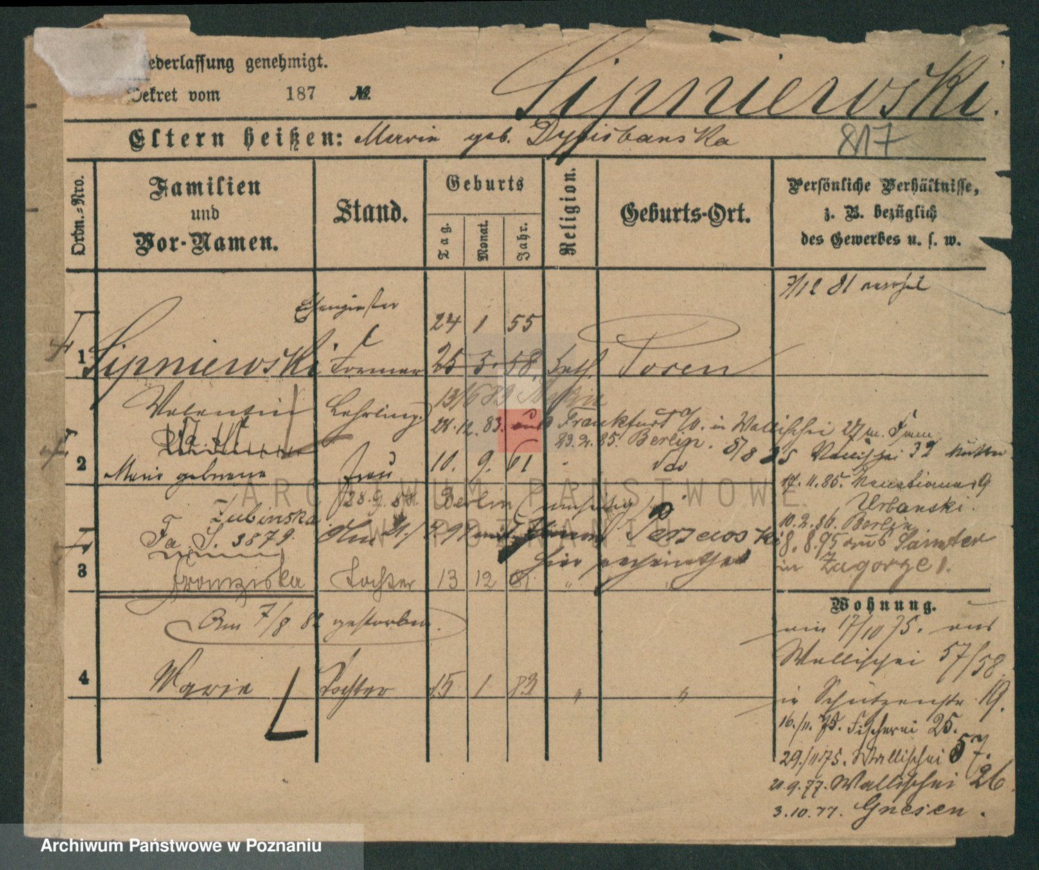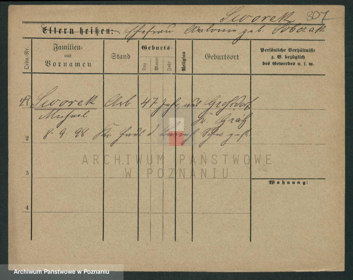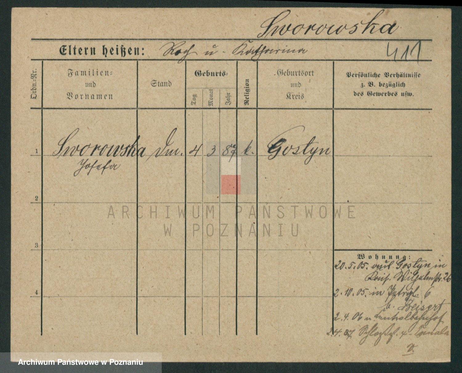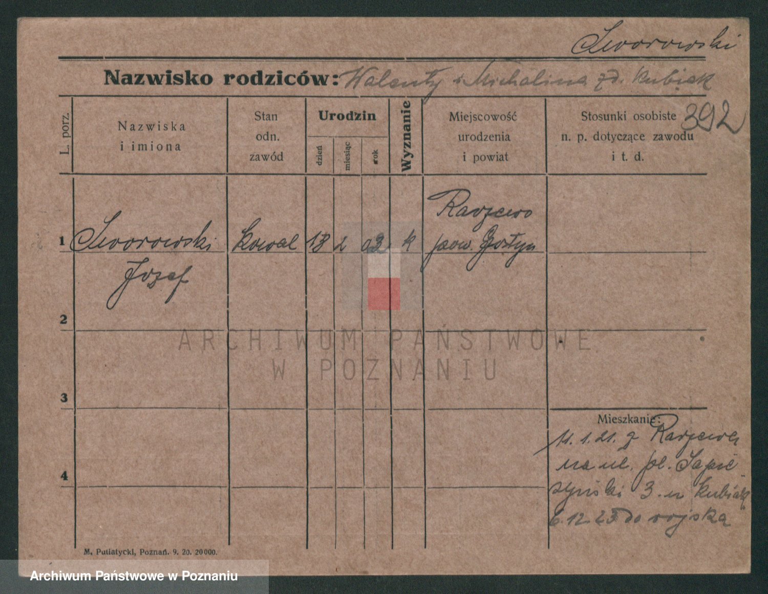 Podgląd karty osobowej dostępny jest po kliknięciu na nazwisko lub ikonkę karty. Można dokonywać powiększenia (ikony na górze) lub przechodzić między kolejnymi skanami (strzałki po bokach).