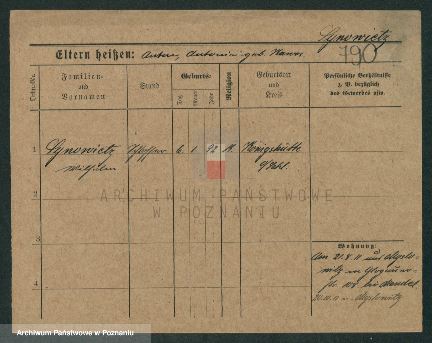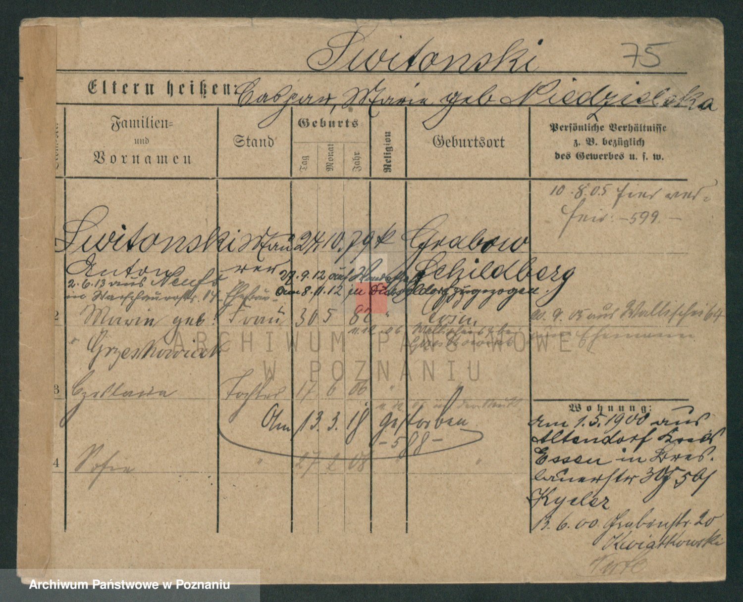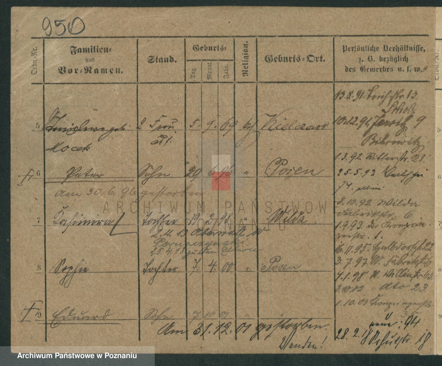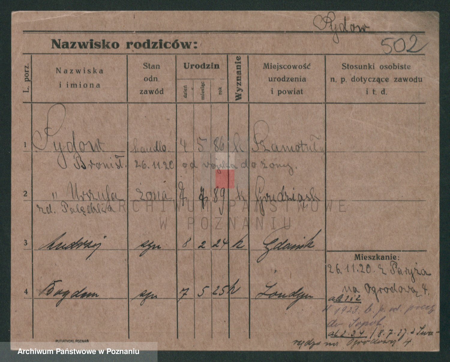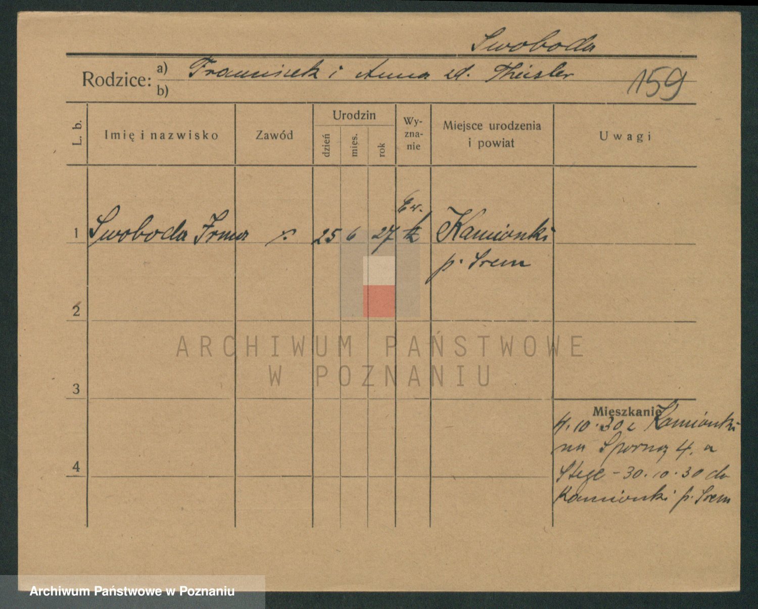 Podgląd karty osobowej dostępny jest po kliknięciu na nazwisko lub ikonkę karty. Można dokonywać powiększenia (ikony na górze) lub przechodzić między kolejnymi skanami (strzałki po bokach).