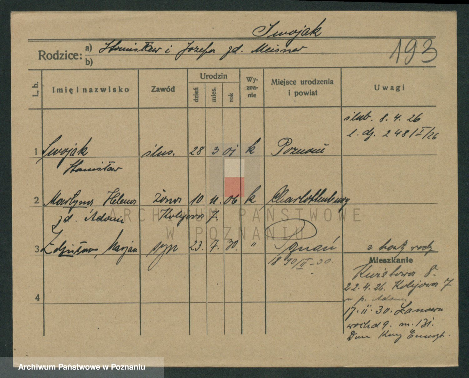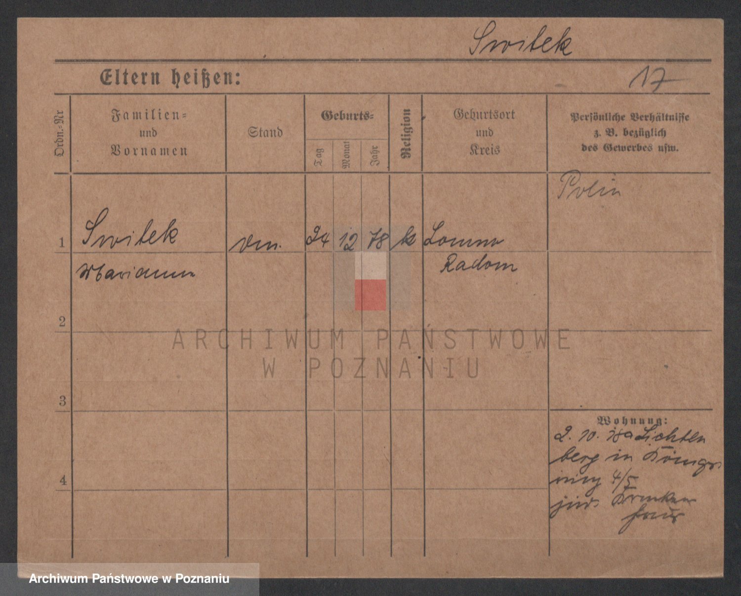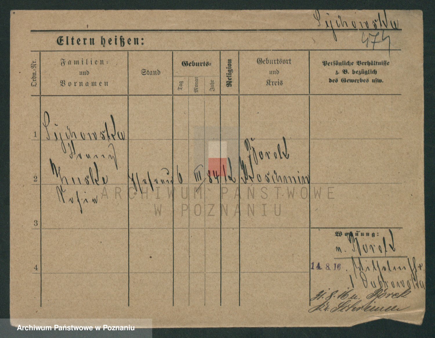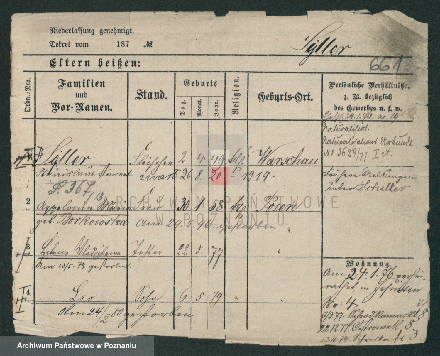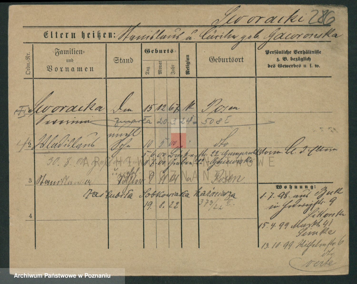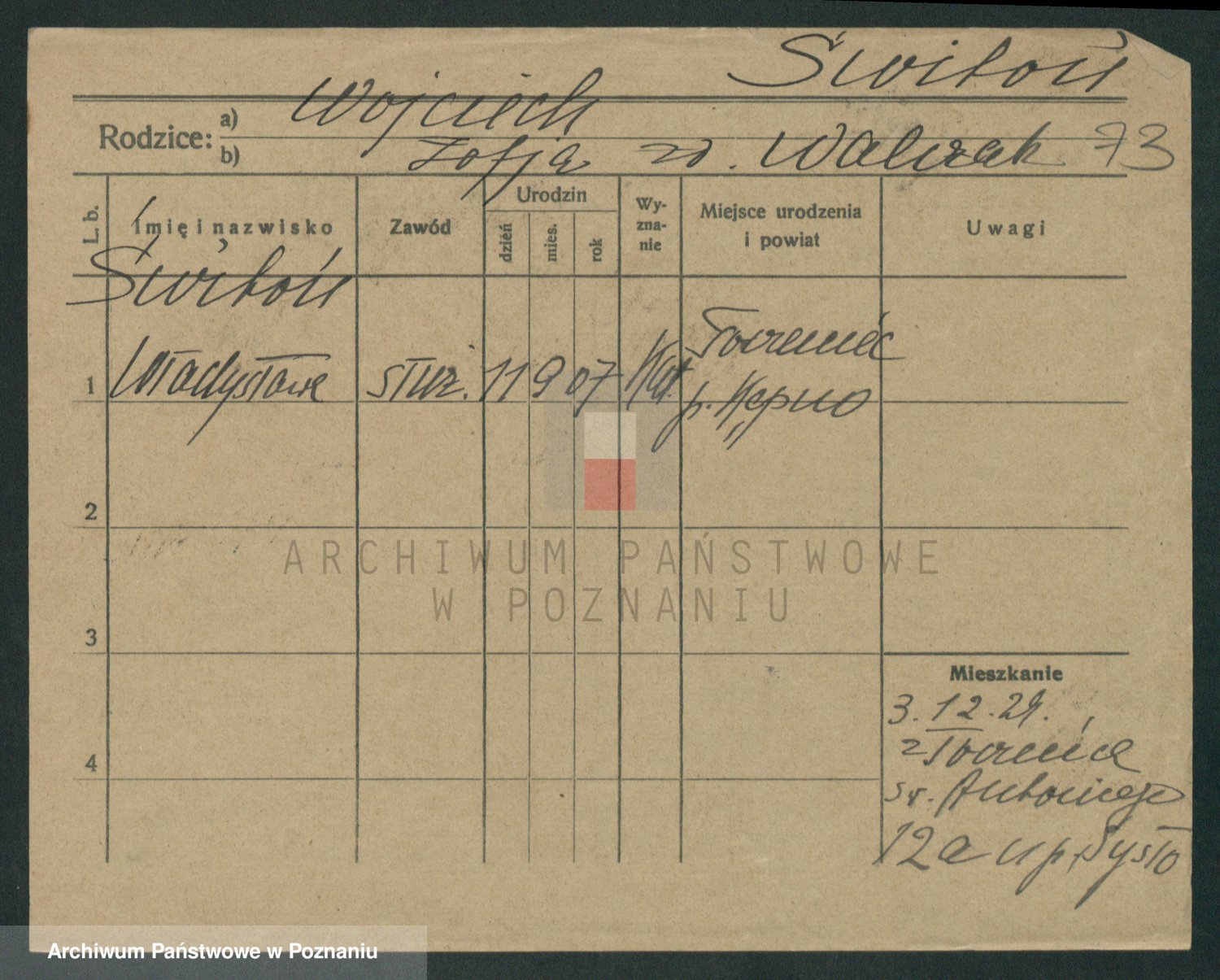 Podgląd karty osobowej dostępny jest po kliknięciu na nazwisko lub ikonkę karty. Można dokonywać powiększenia (ikony na górze) lub przechodzić między kolejnymi skanami (strzałki po bokach).