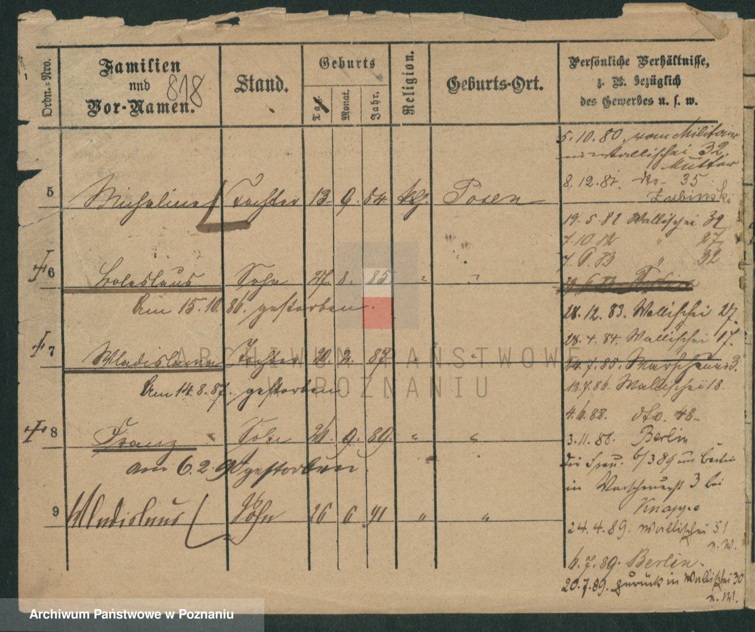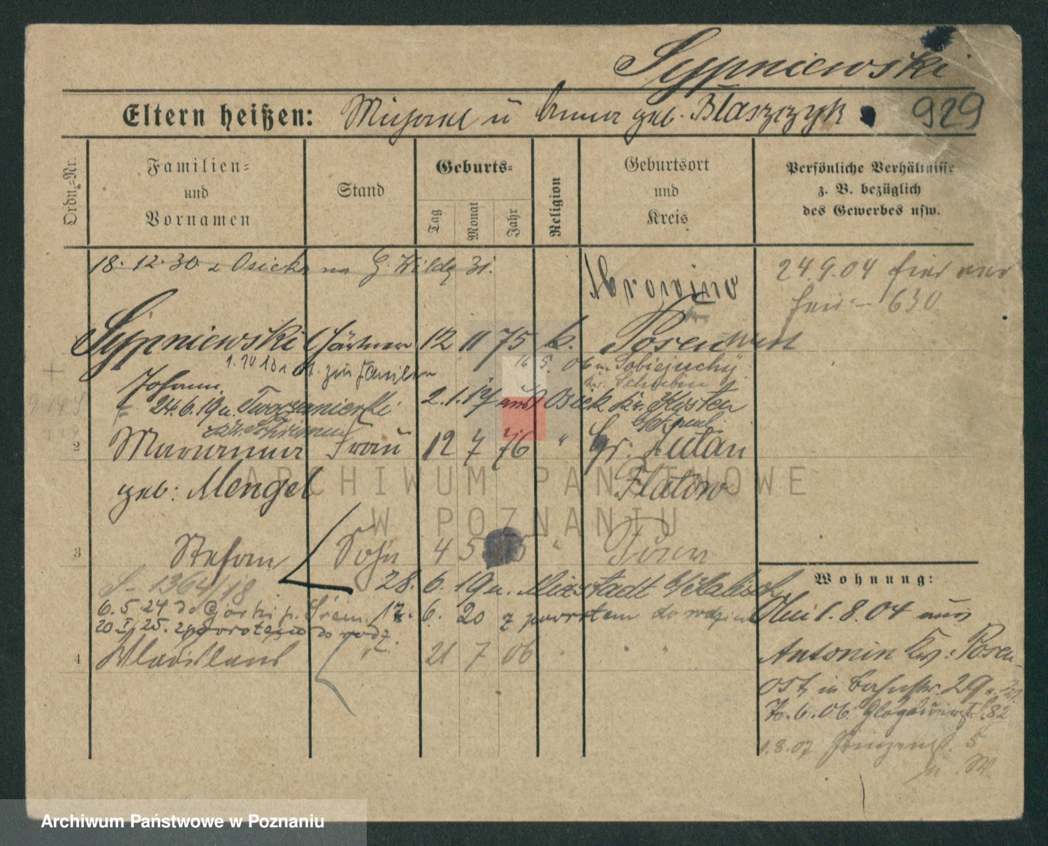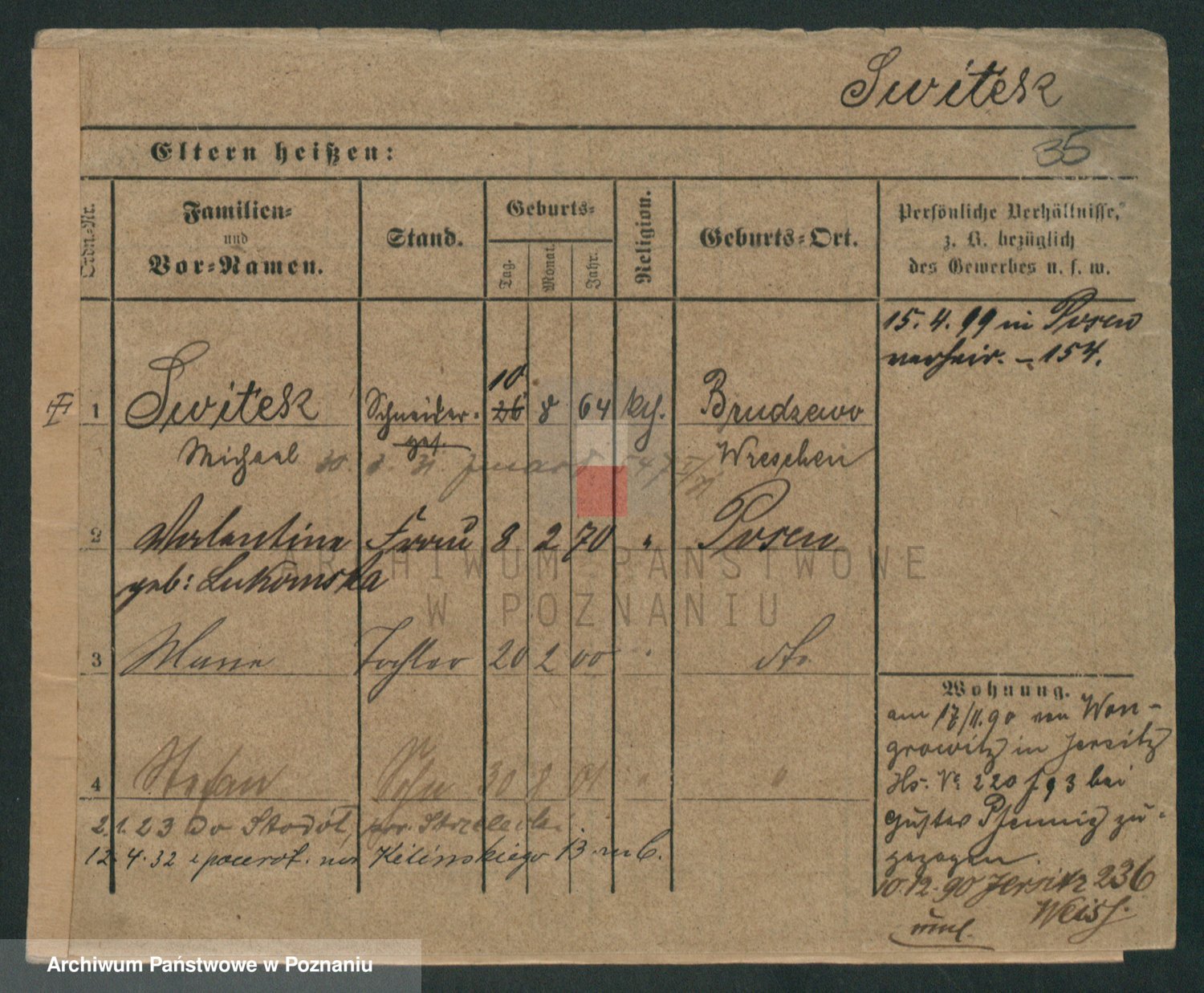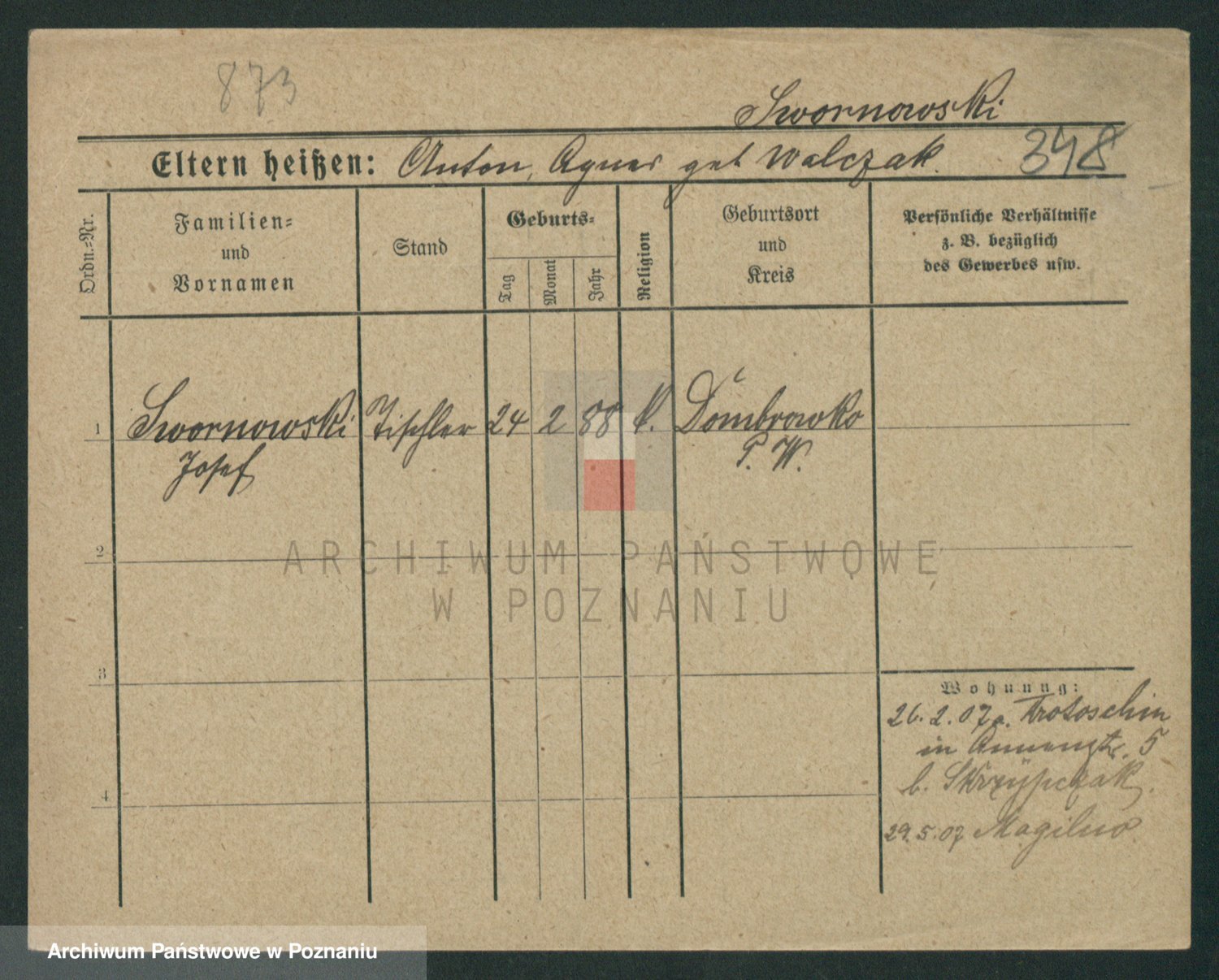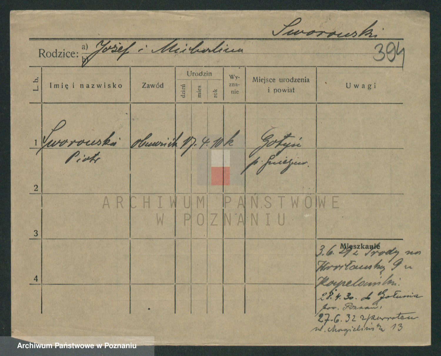 Podgląd karty osobowej dostępny jest po kliknięciu na nazwisko lub ikonkę karty. Można dokonywać powiększenia (ikony na górze) lub przechodzić między kolejnymi skanami (strzałki po bokach).