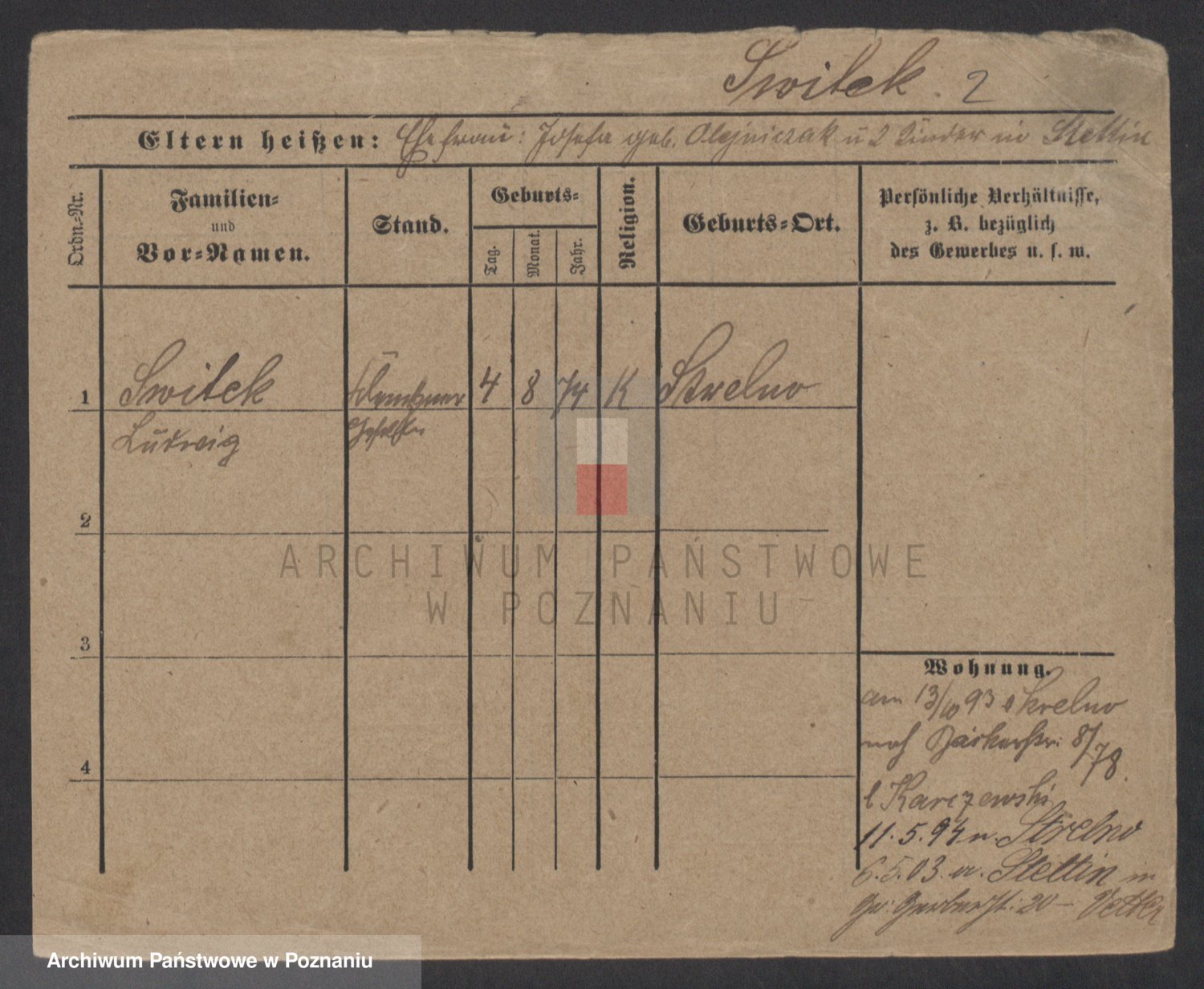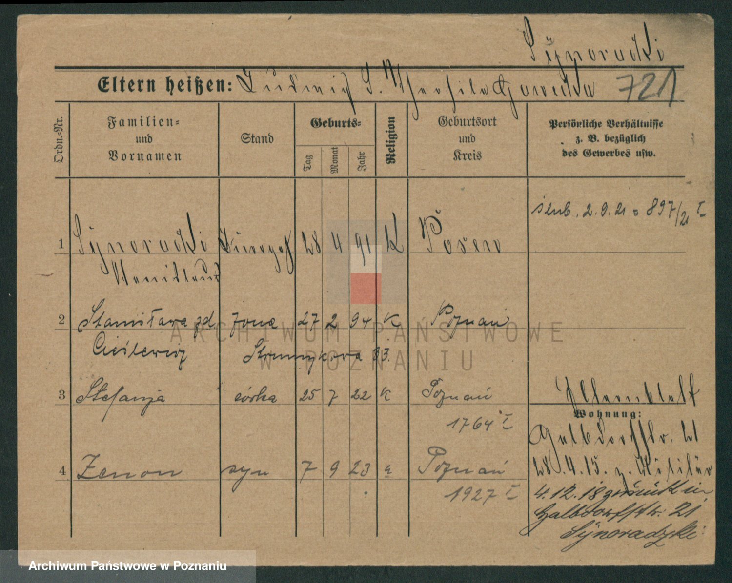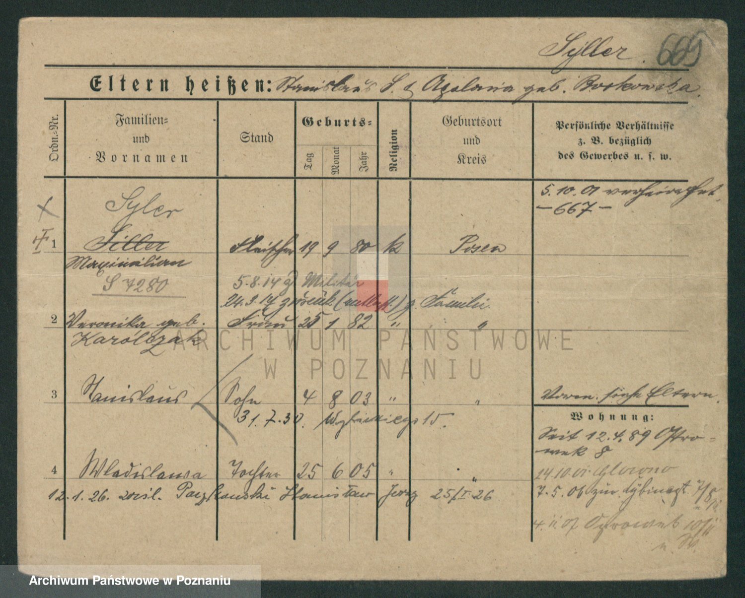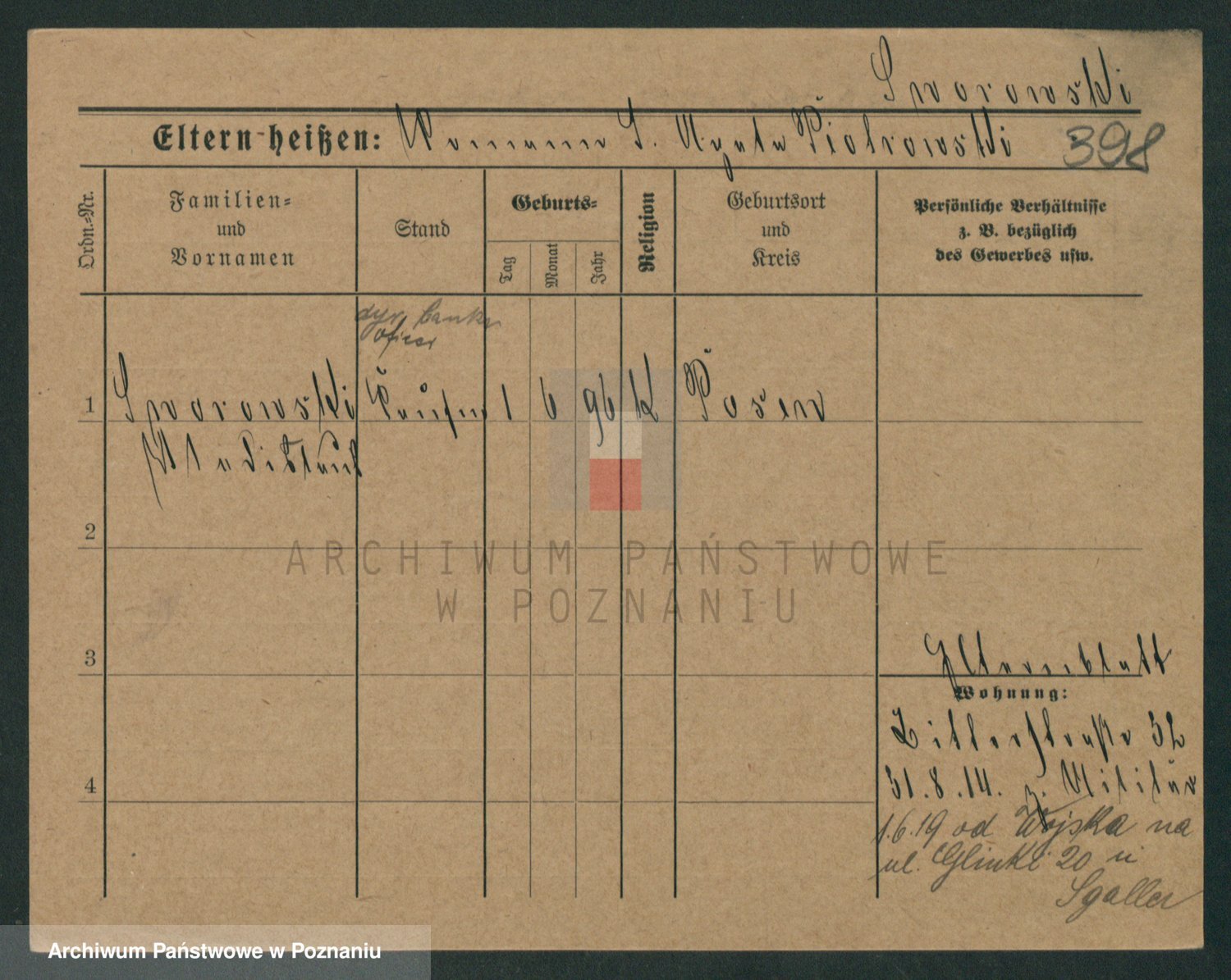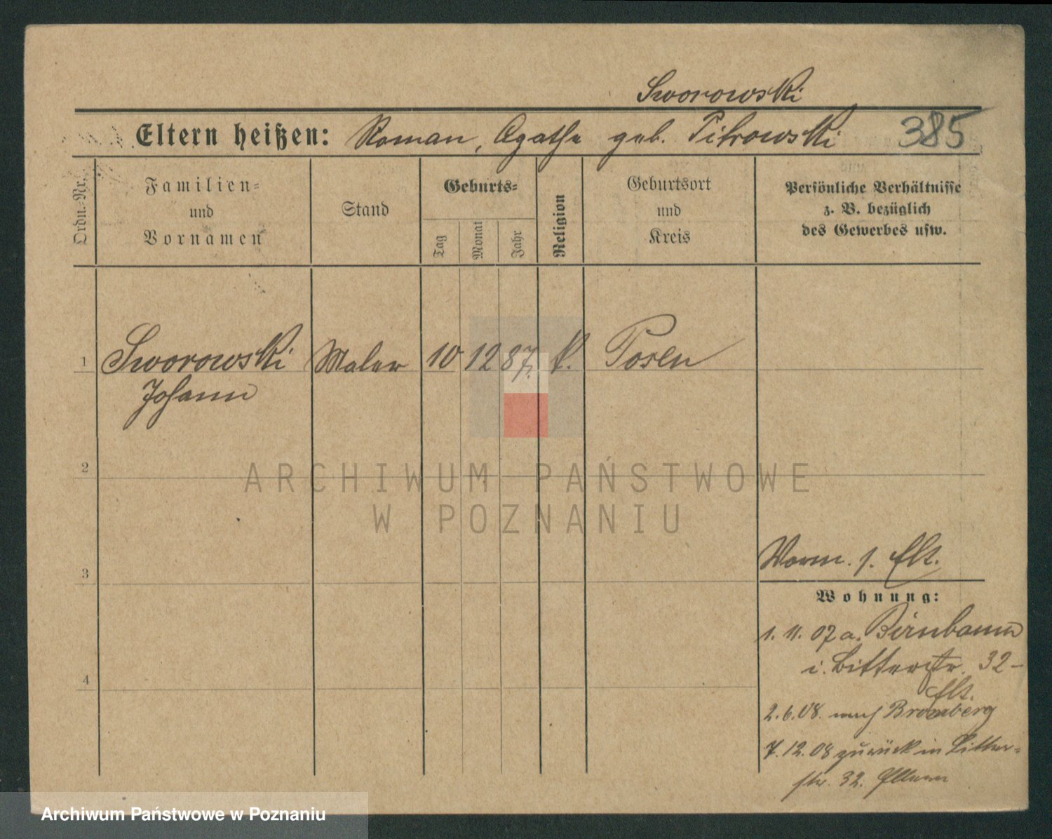 Podgląd karty osobowej dostępny jest po kliknięciu na nazwisko lub ikonkę karty. Można dokonywać powiększenia (ikony na górze) lub przechodzić między kolejnymi skanami (strzałki po bokach).