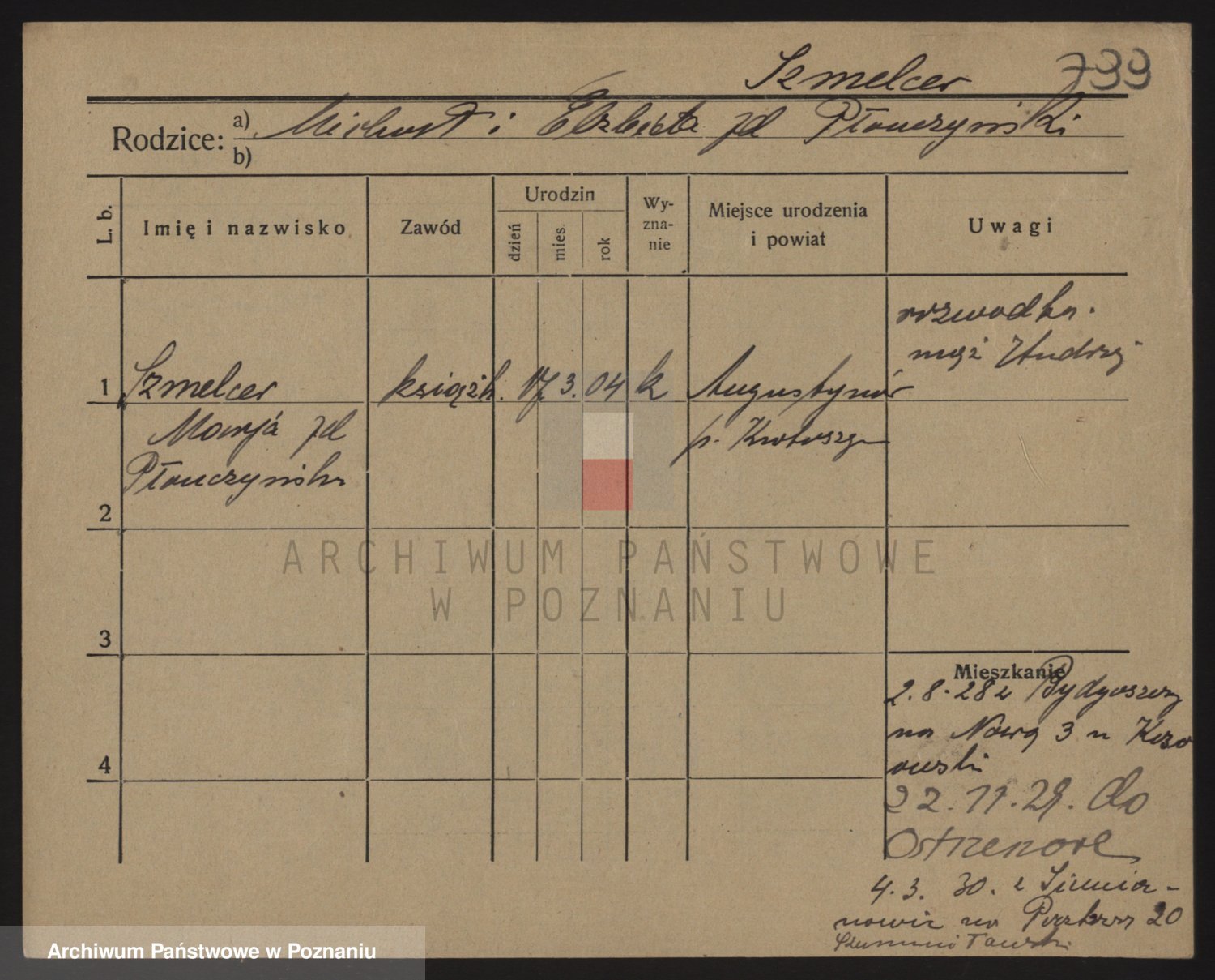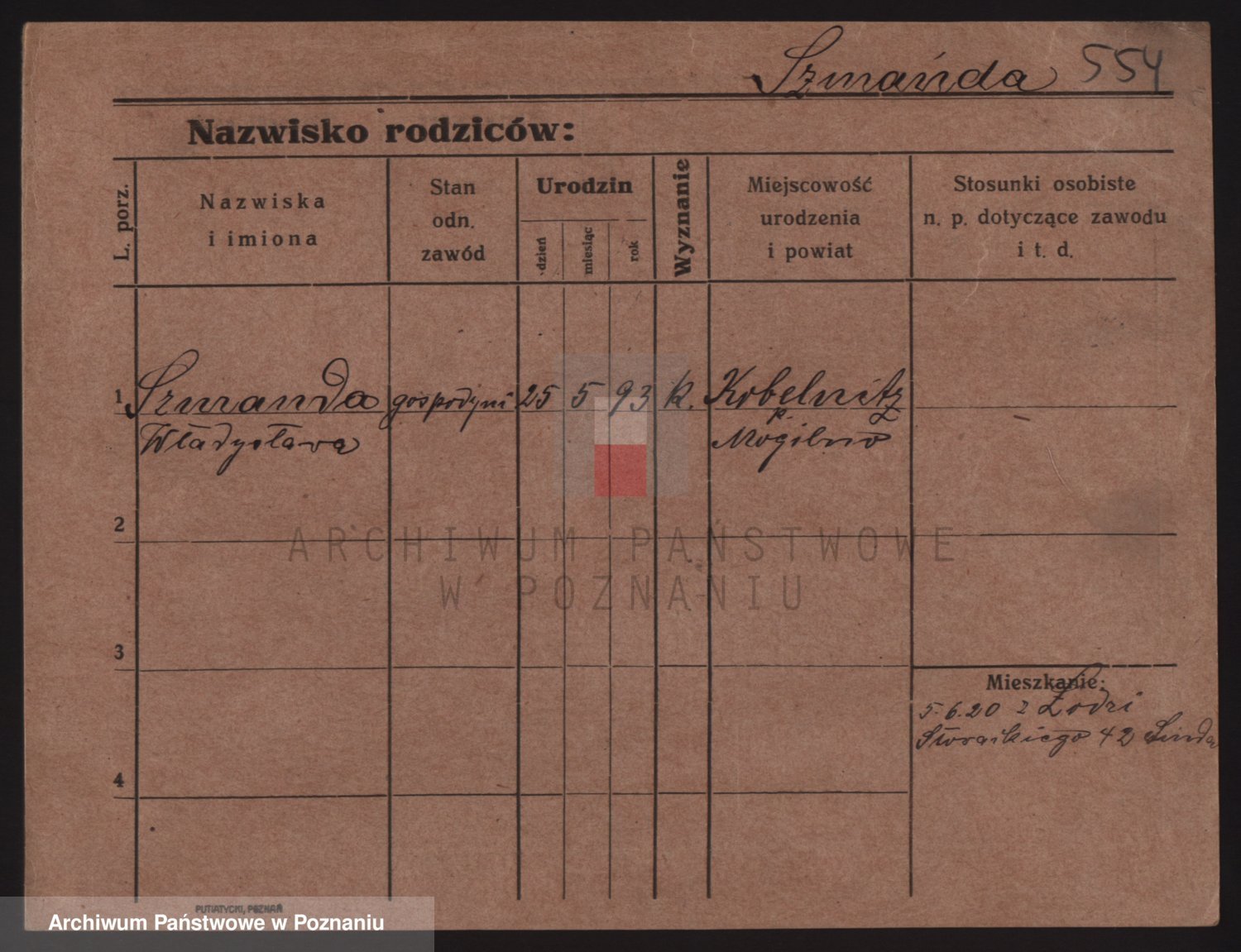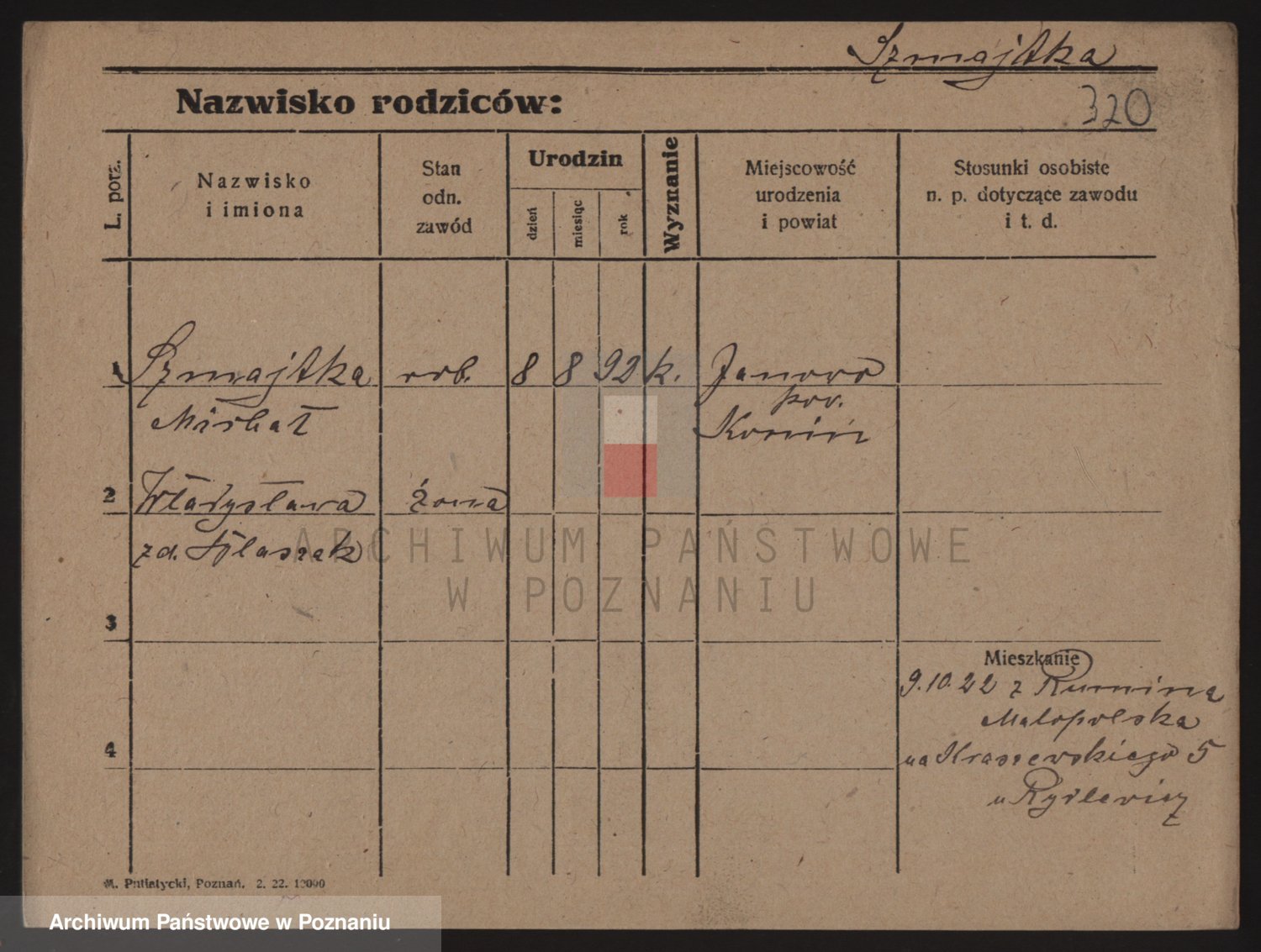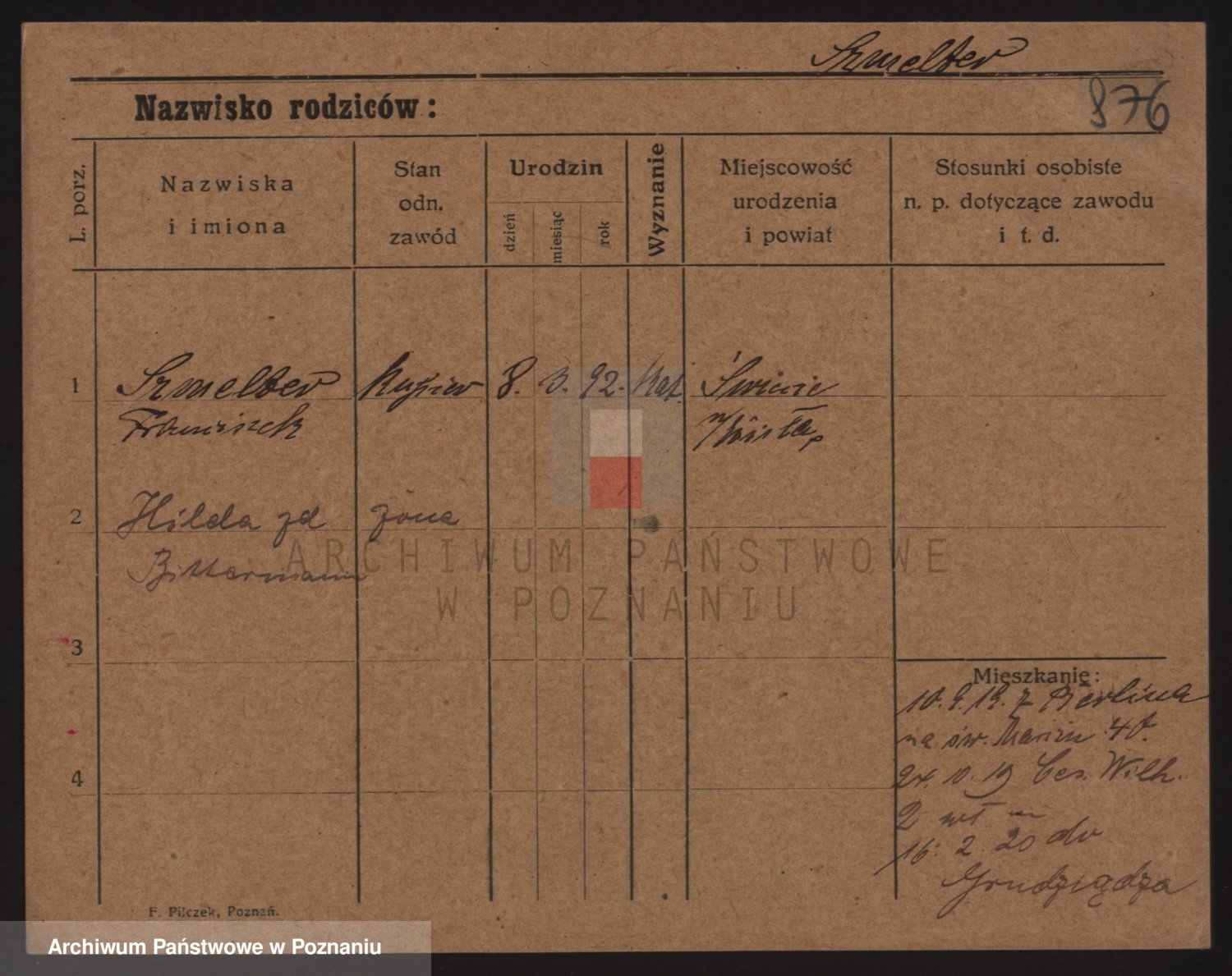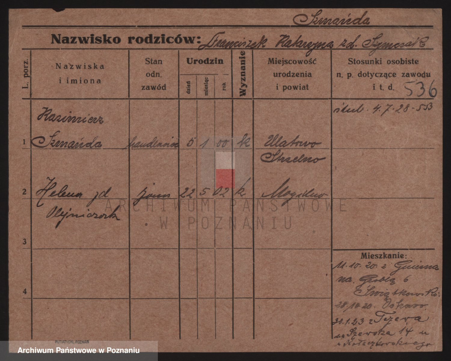 Podgląd karty osobowej dostępny jest po kliknięciu na nazwisko lub ikonkę karty. Można dokonywać powiększenia (ikony na górze) lub przechodzić między kolejnymi skanami (strzałki po bokach).