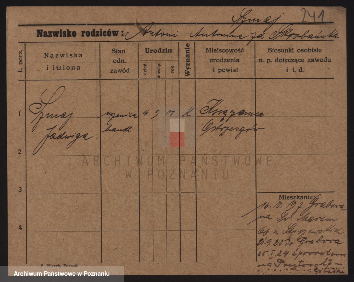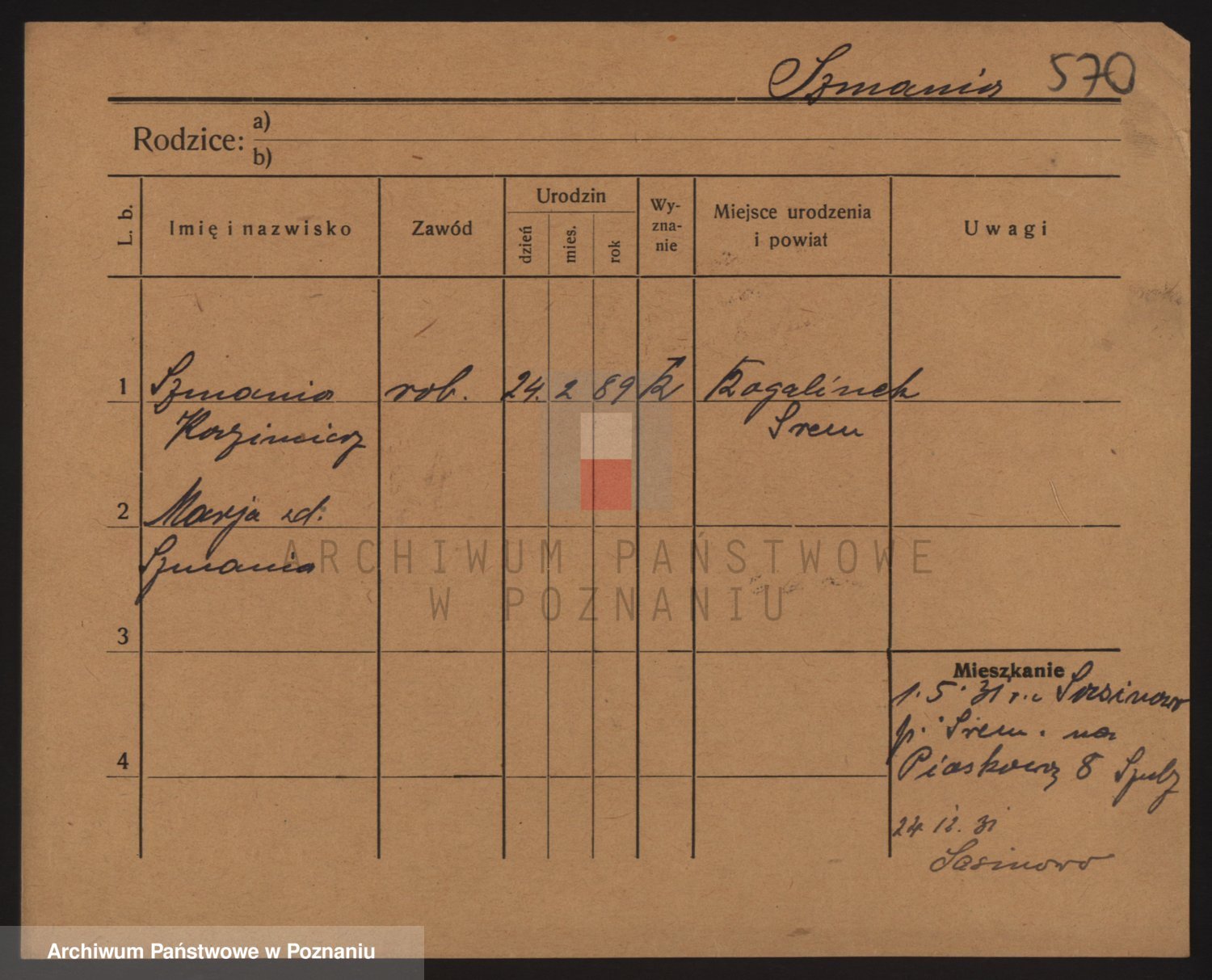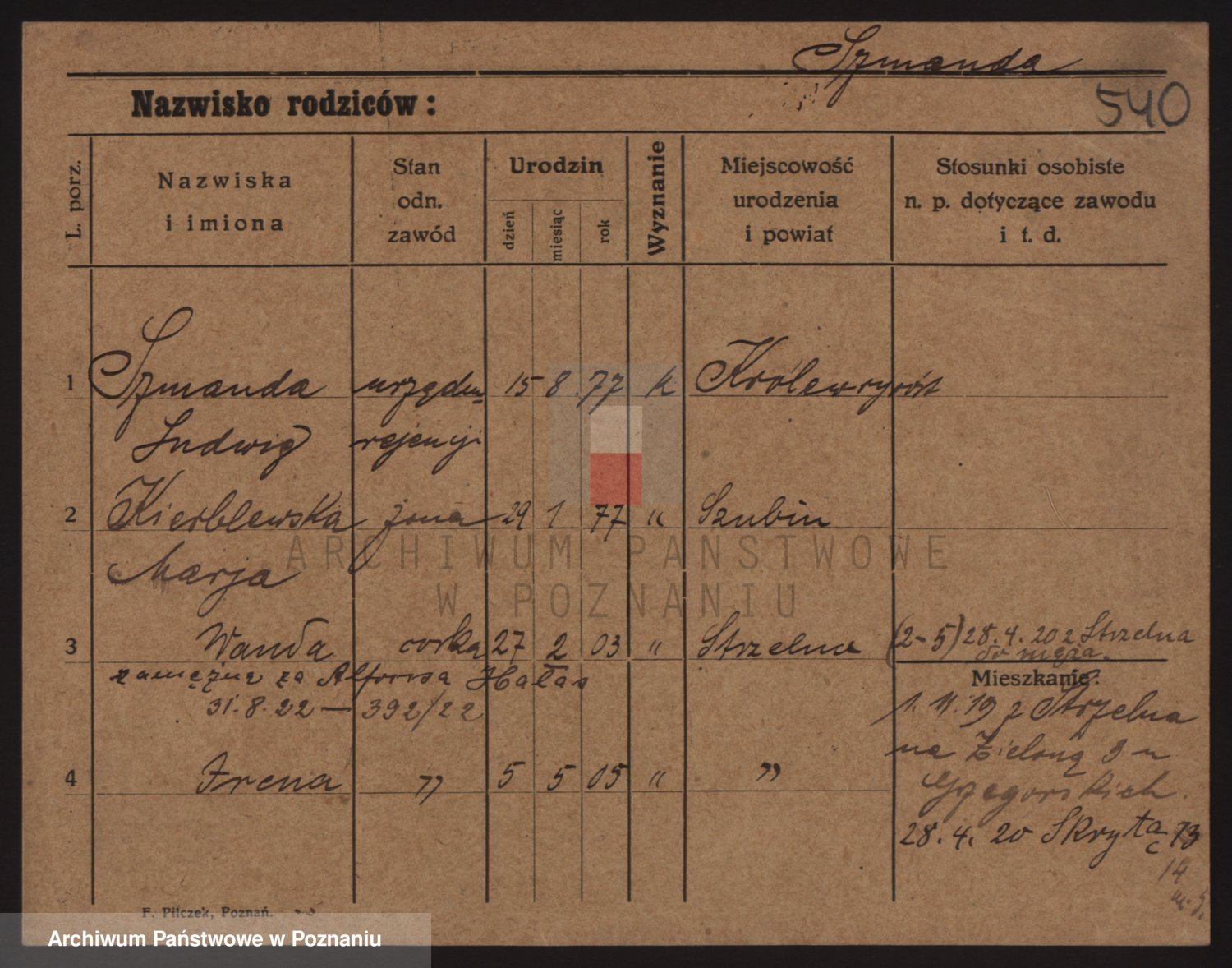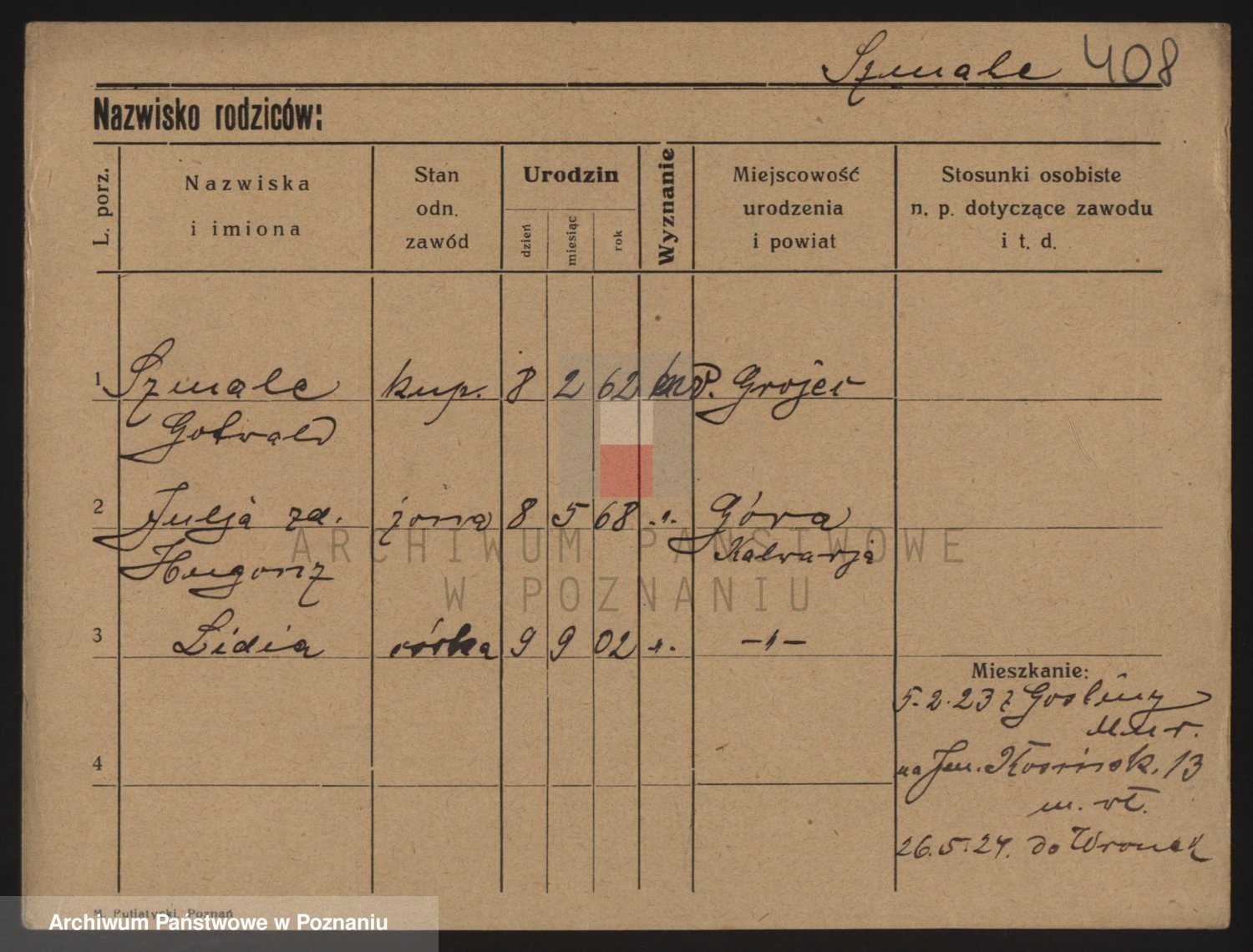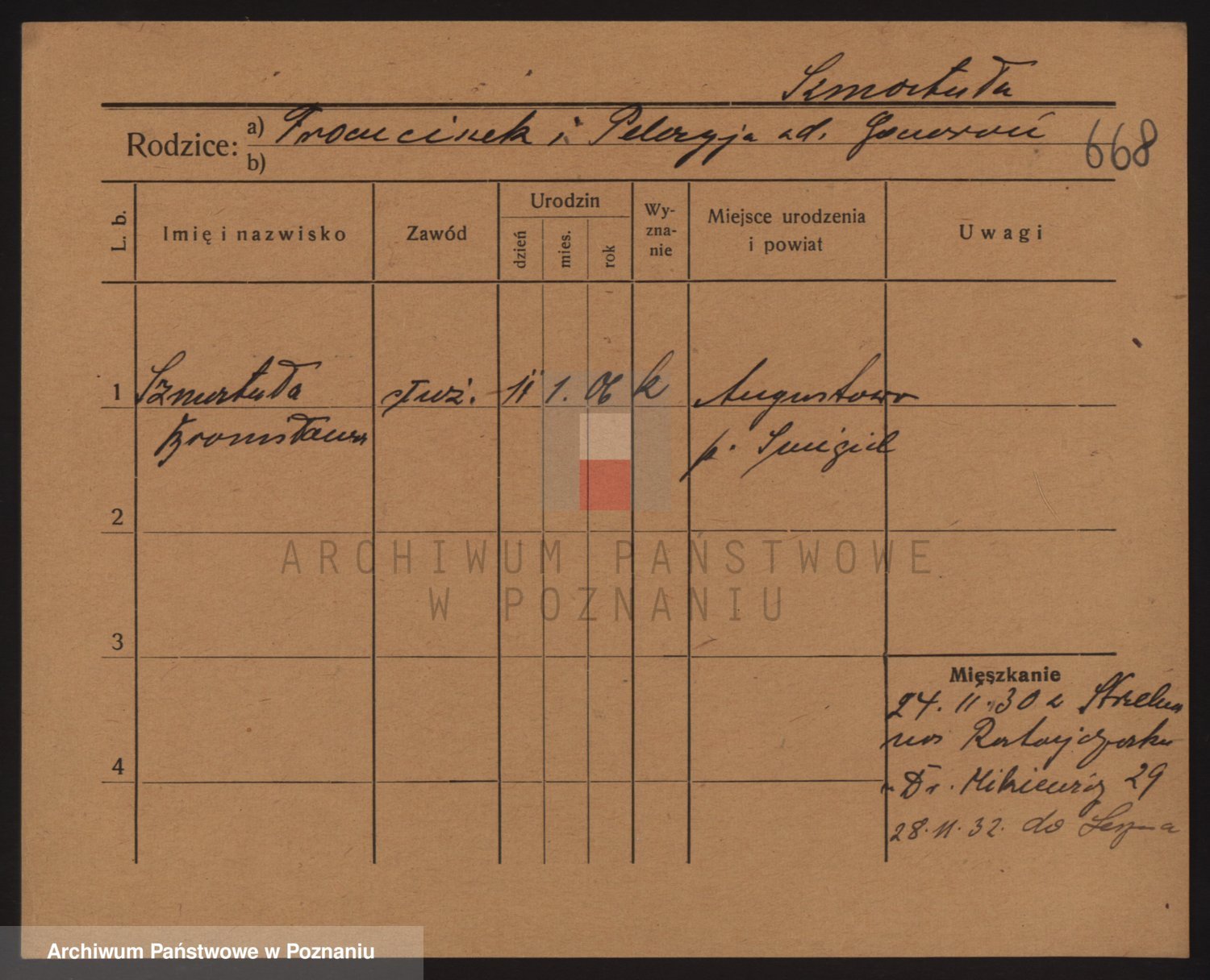 Podgląd karty osobowej dostępny jest po kliknięciu na nazwisko lub ikonkę karty. Można dokonywać powiększenia (ikony na górze) lub przechodzić między kolejnymi skanami (strzałki po bokach).