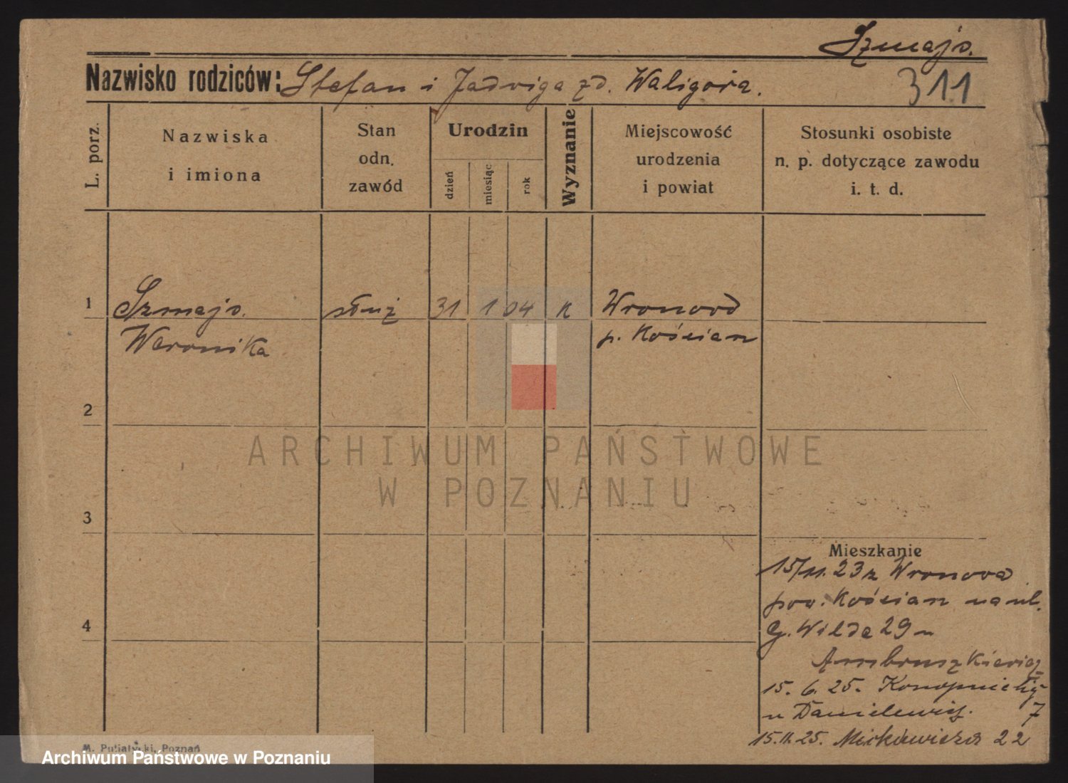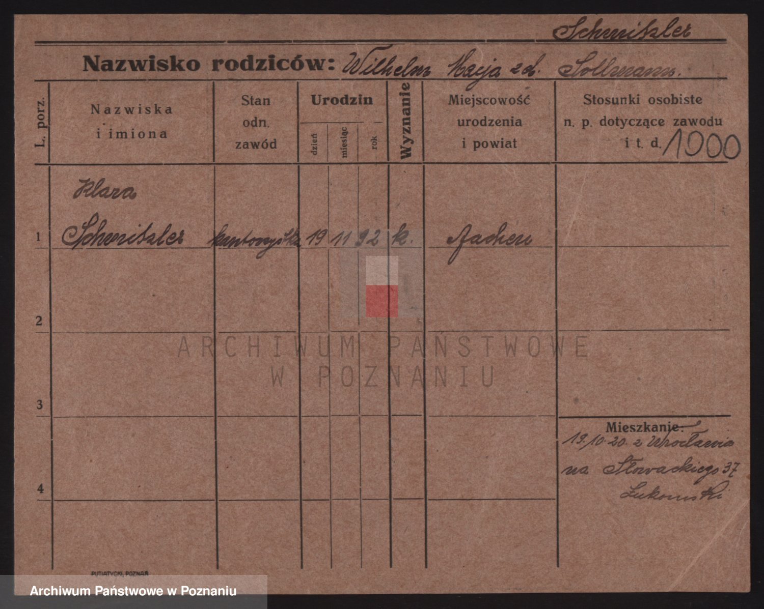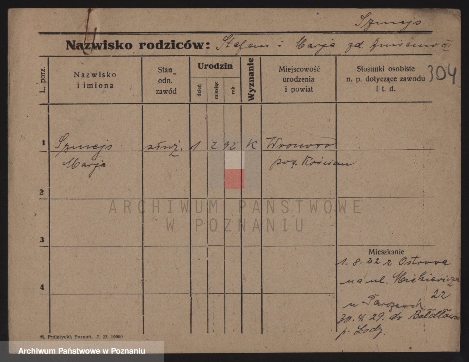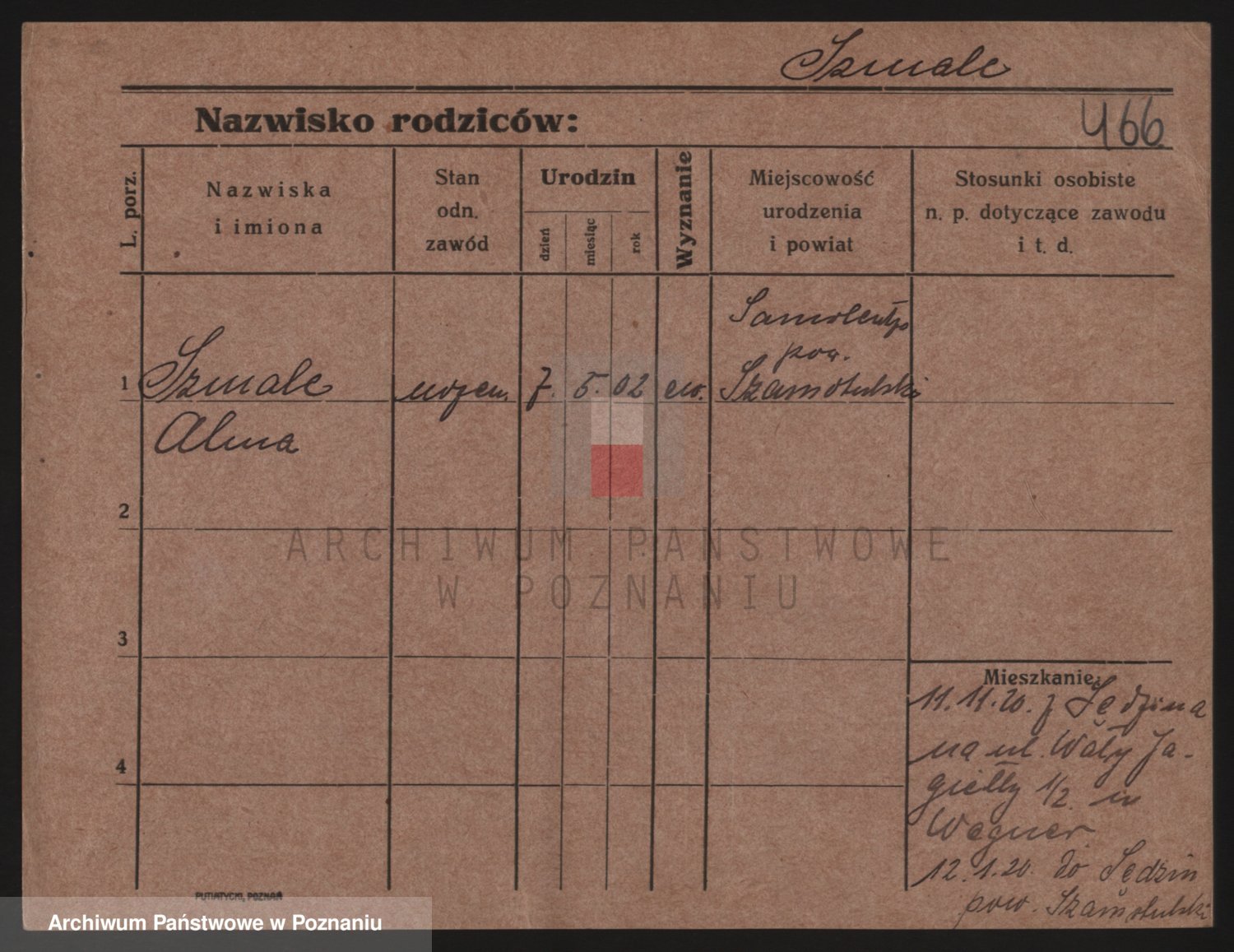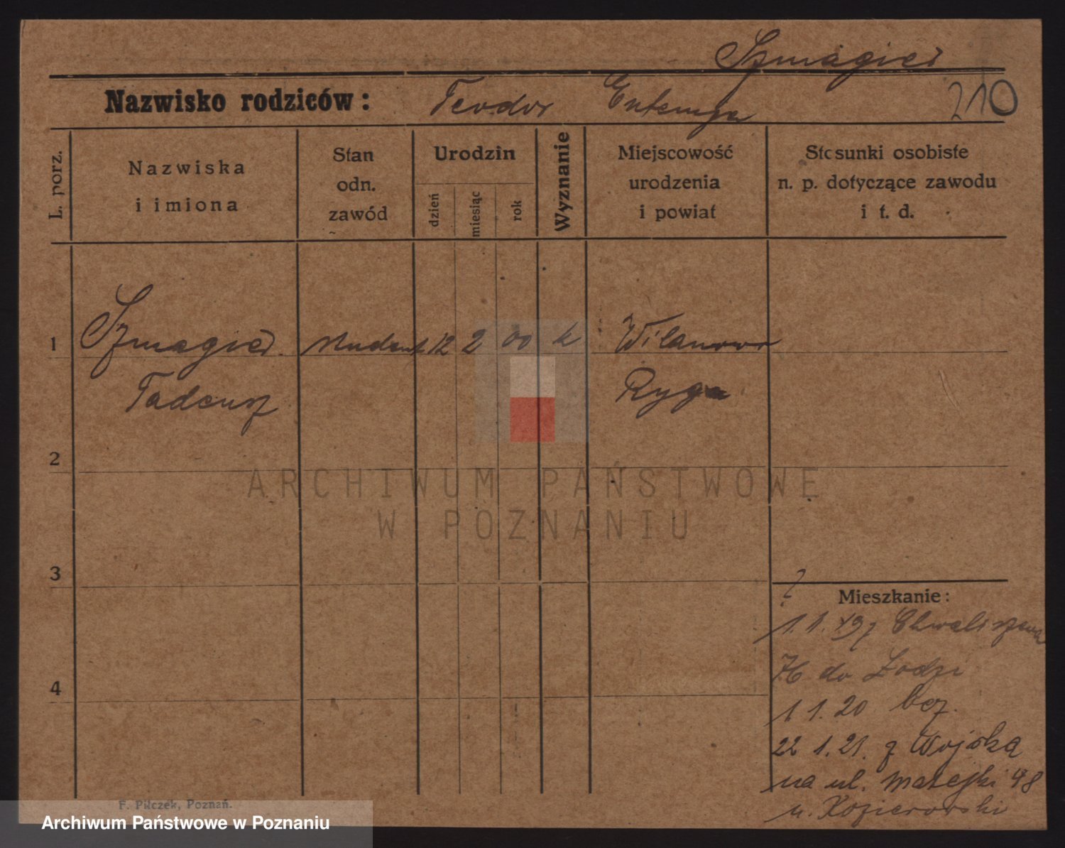 Podgląd karty osobowej dostępny jest po kliknięciu na nazwisko lub ikonkę karty. Można dokonywać powiększenia (ikony na górze) lub przechodzić między kolejnymi skanami (strzałki po bokach).