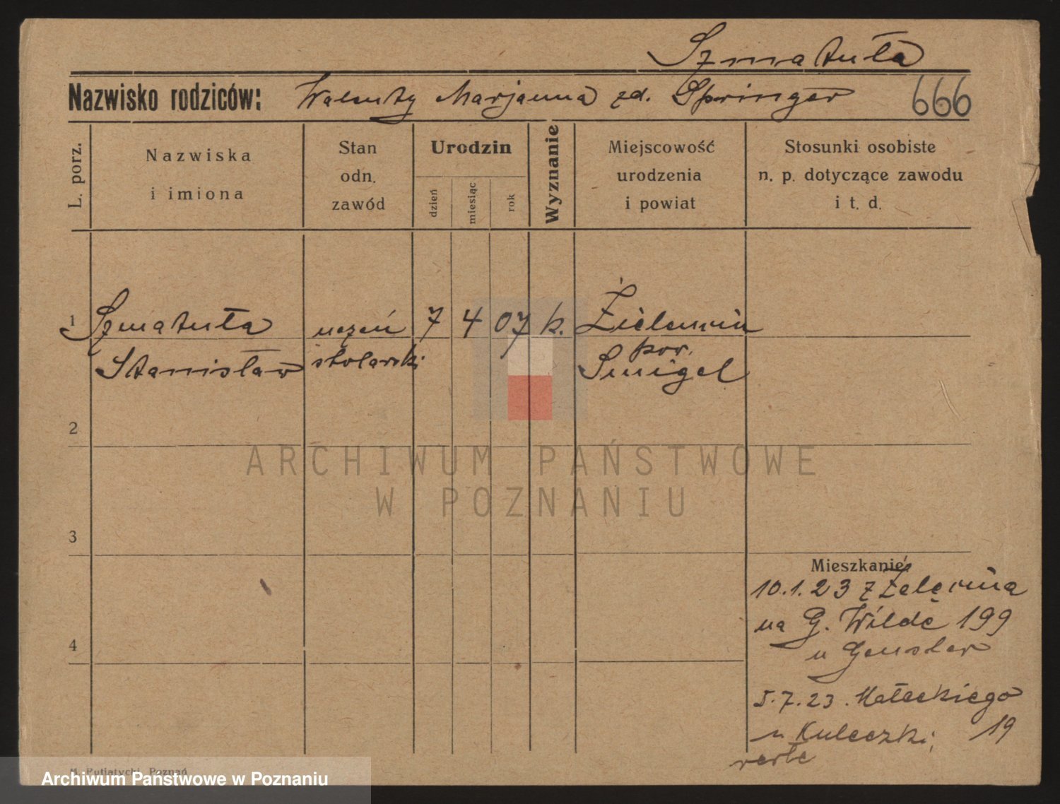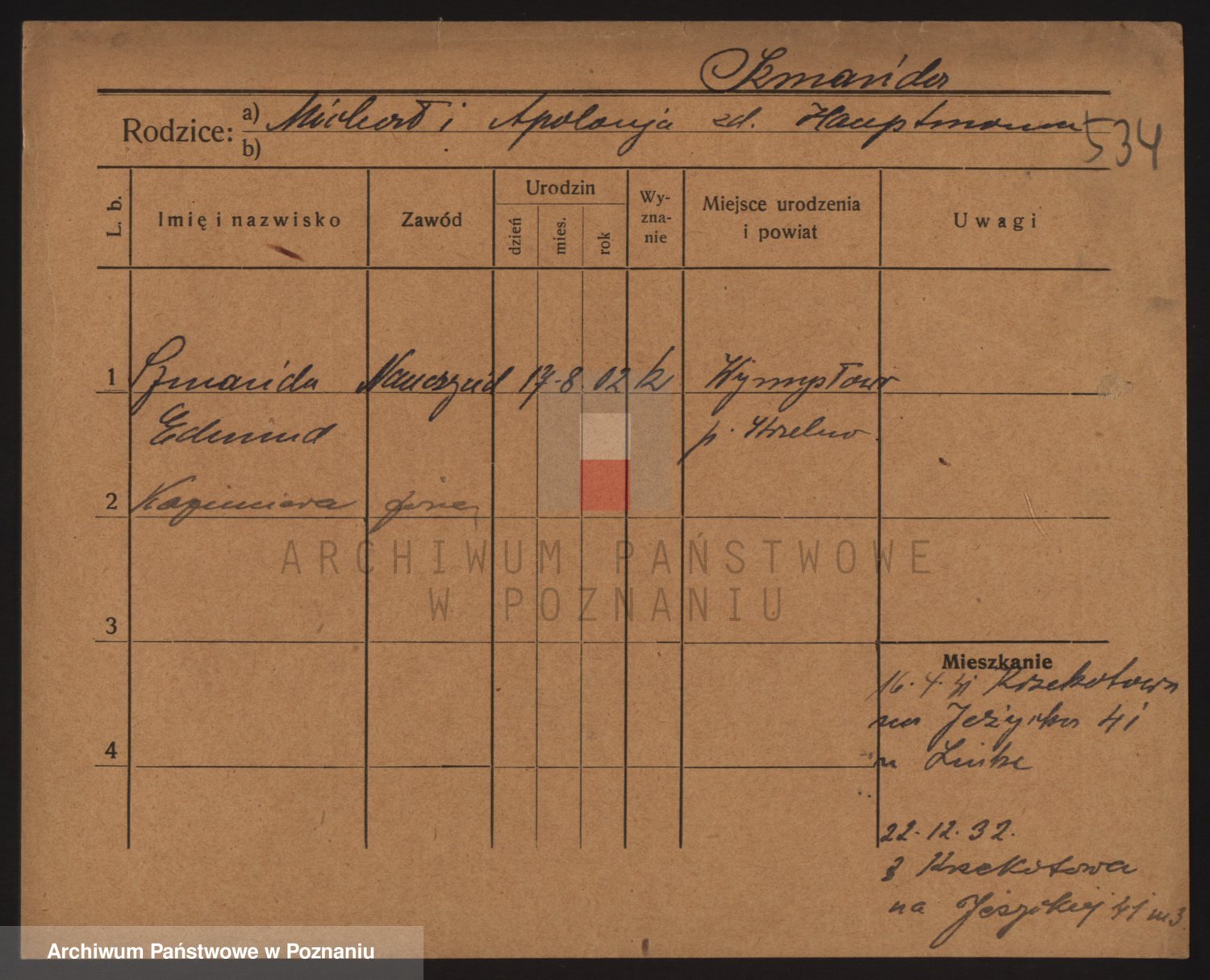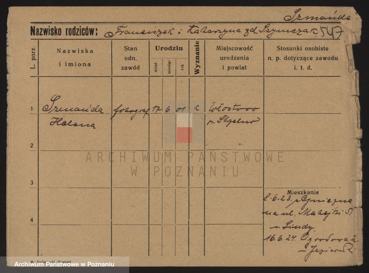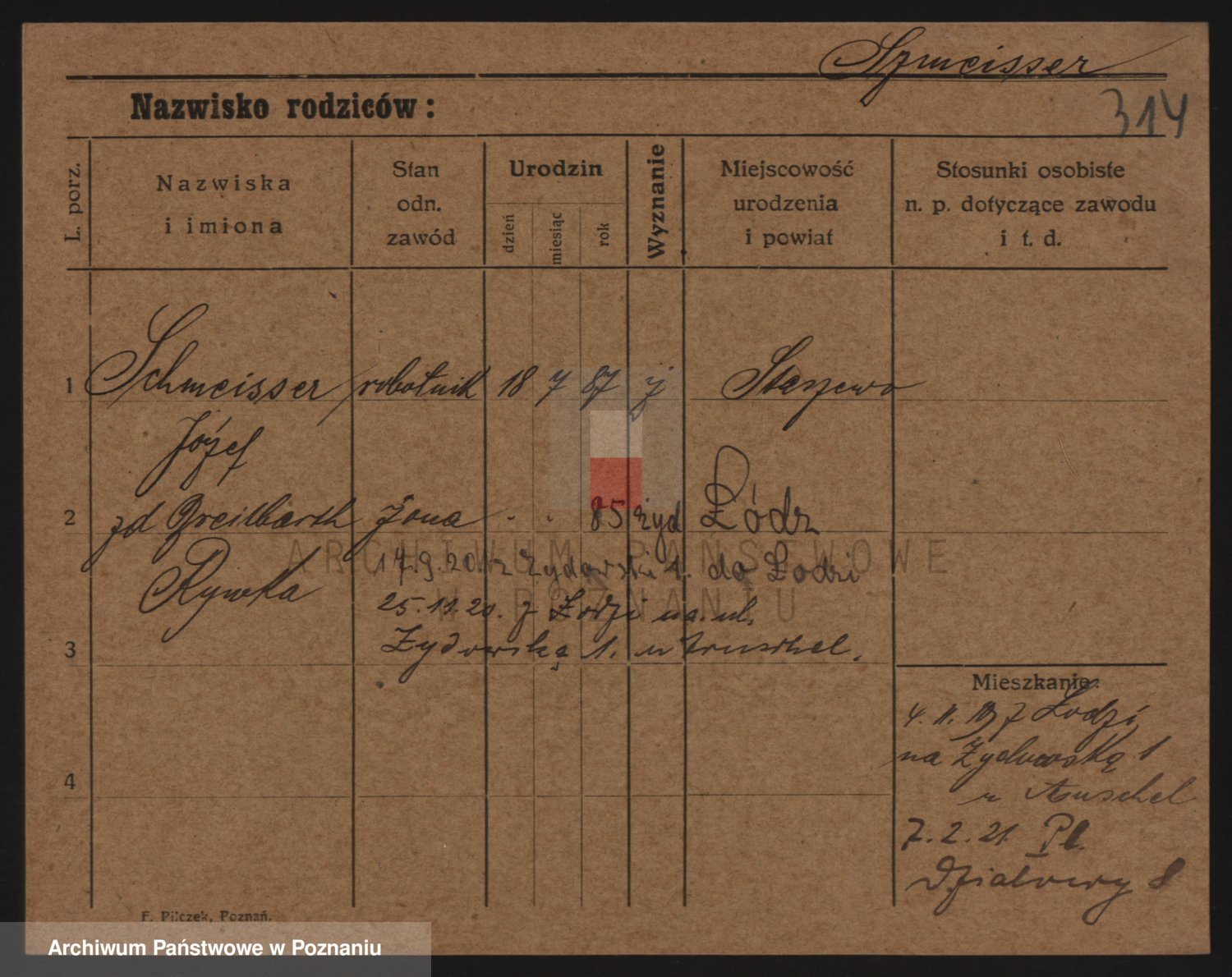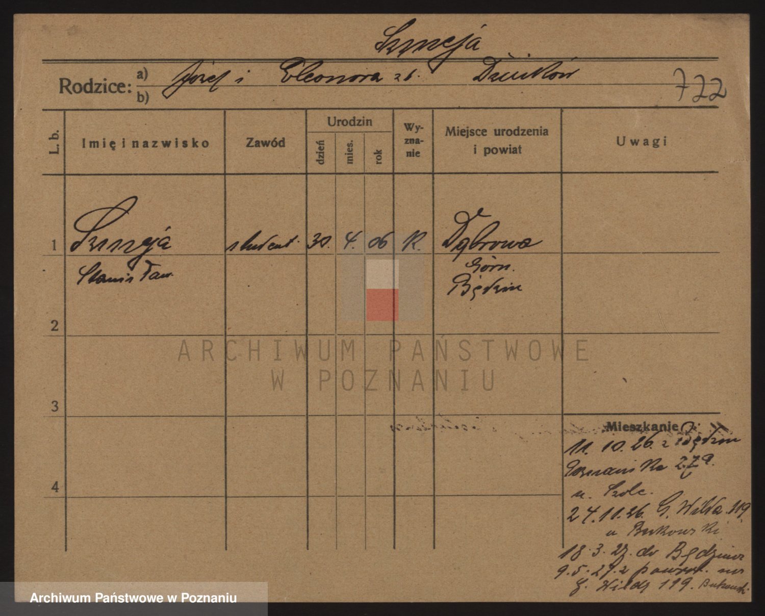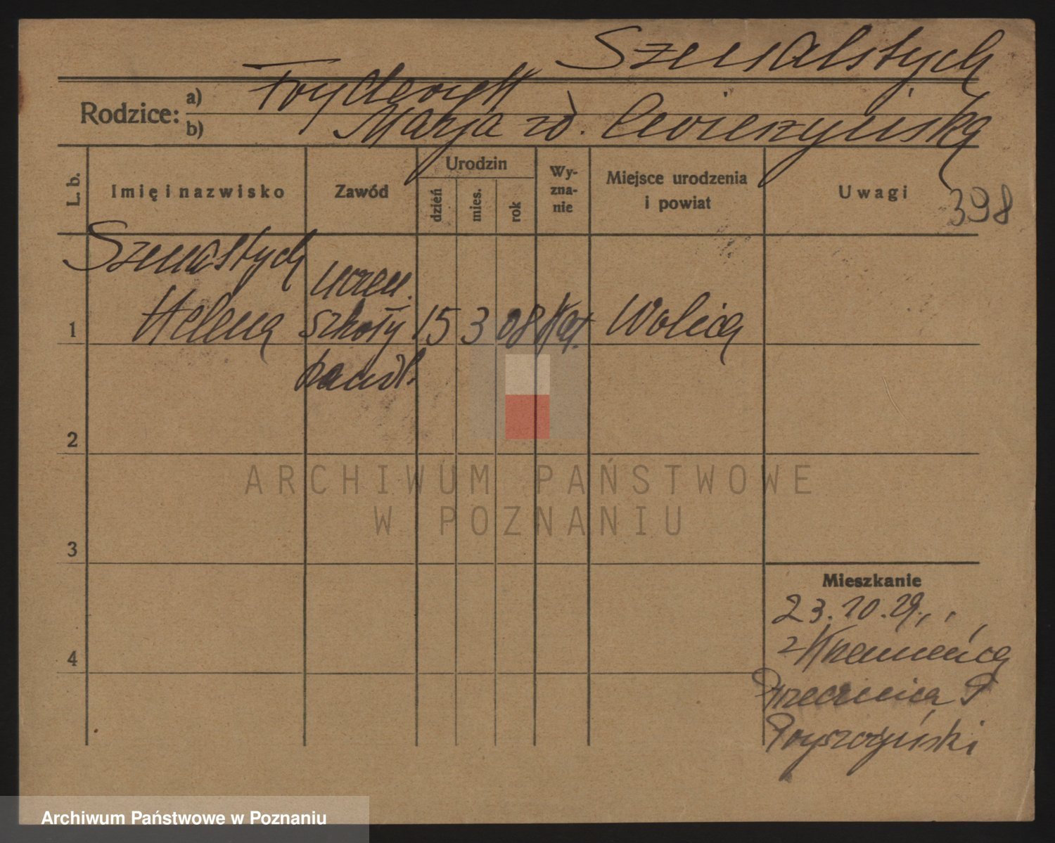 Podgląd karty osobowej dostępny jest po kliknięciu na nazwisko lub ikonkę karty. Można dokonywać powiększenia (ikony na górze) lub przechodzić między kolejnymi skanami (strzałki po bokach).