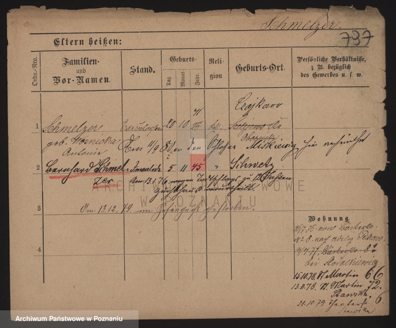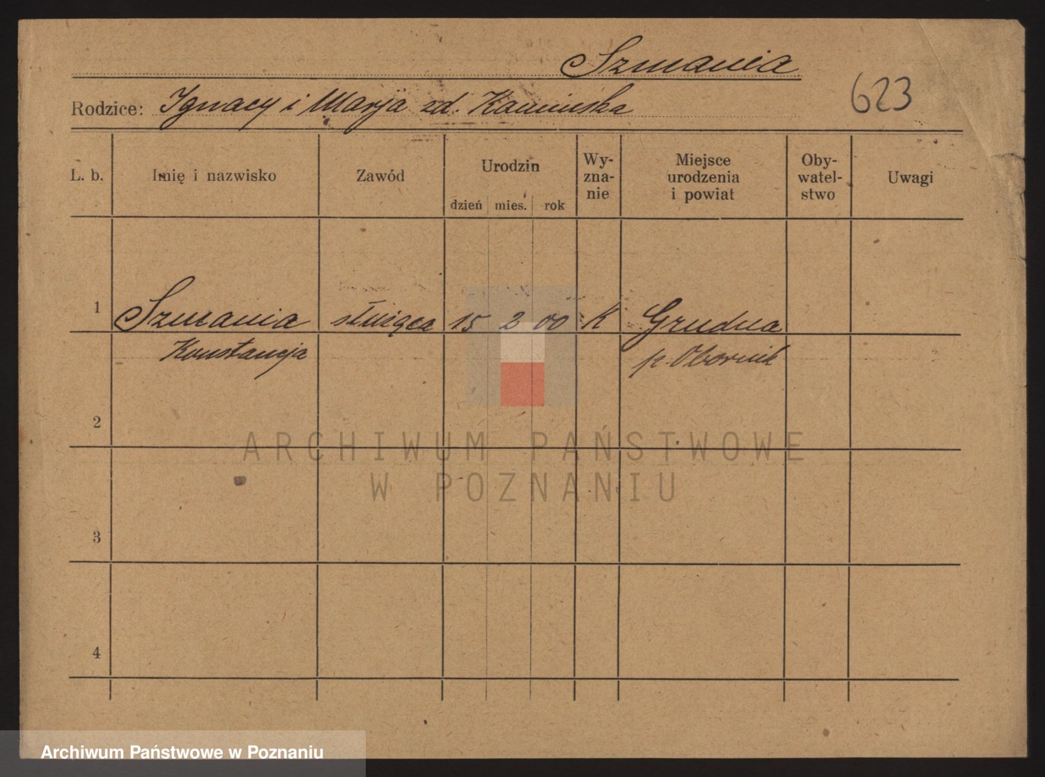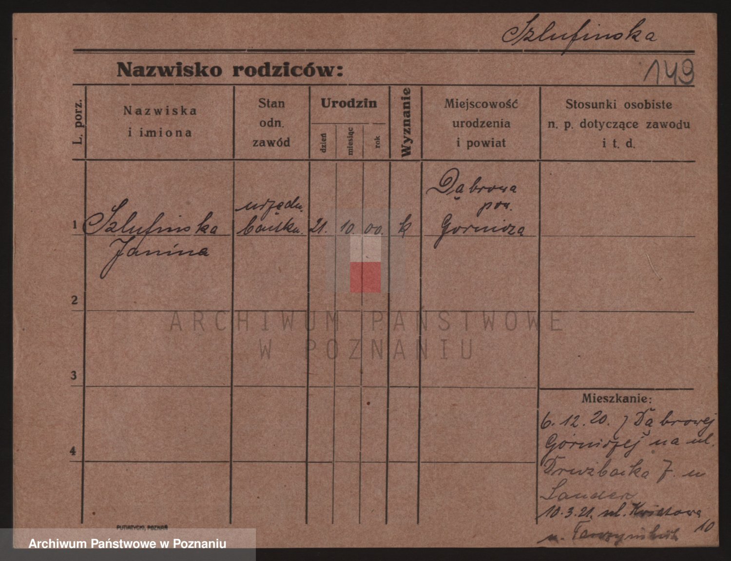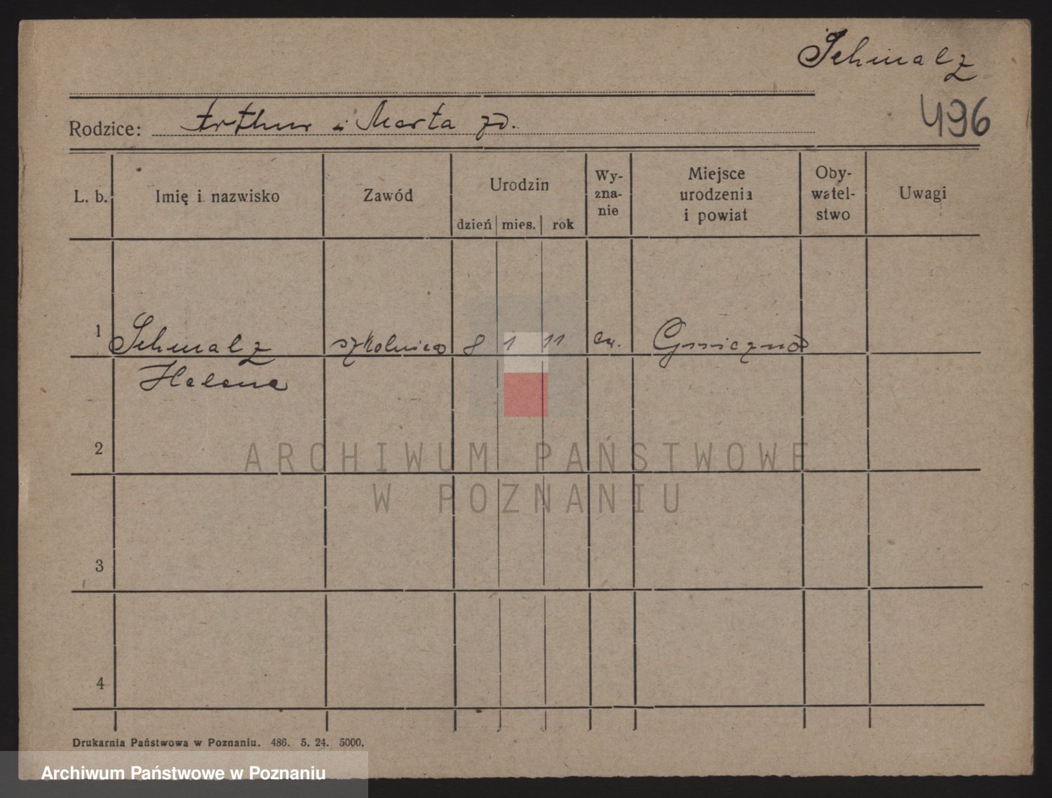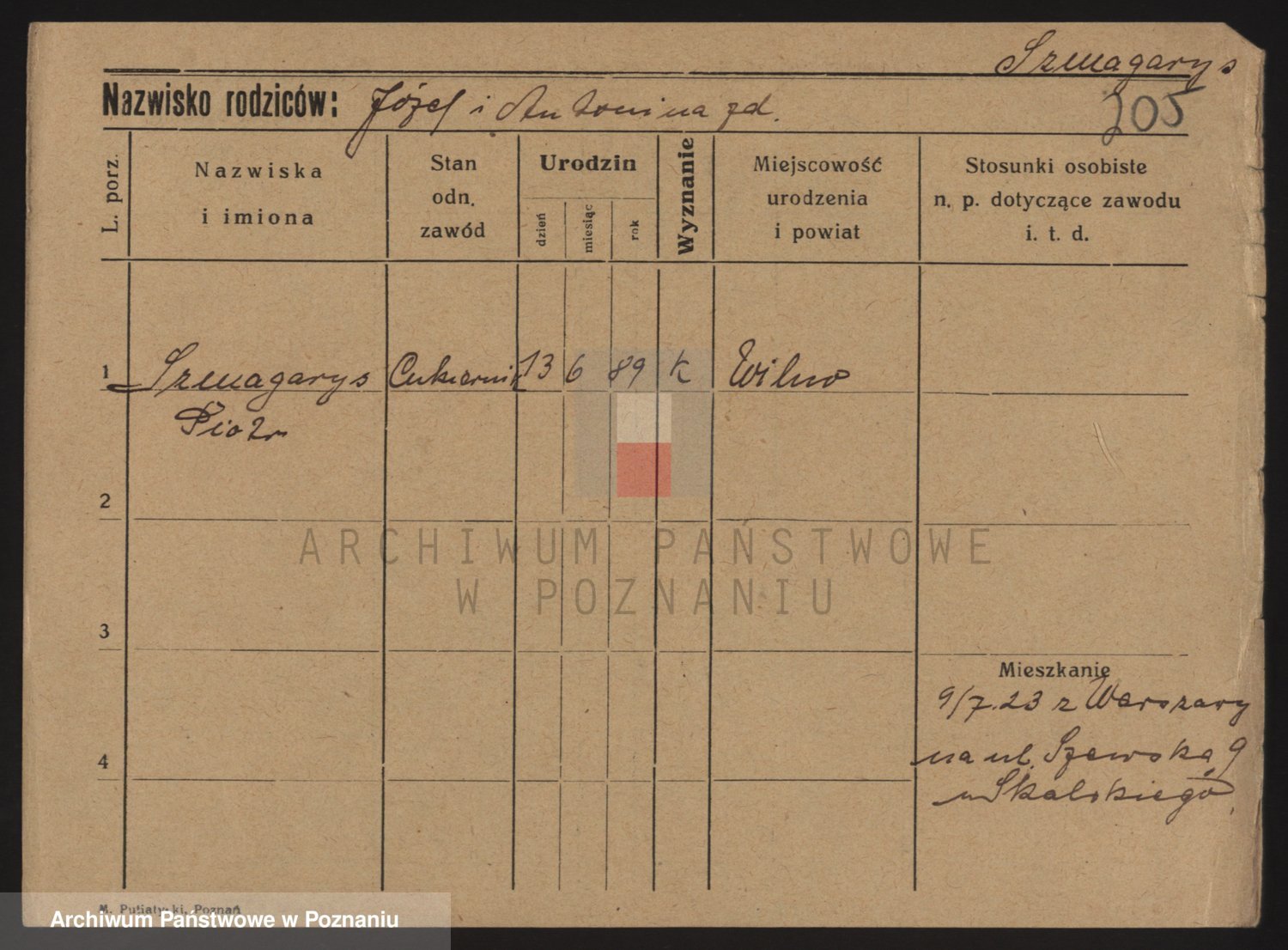 Podgląd karty osobowej dostępny jest po kliknięciu na nazwisko lub ikonkę karty. Można dokonywać powiększenia (ikony na górze) lub przechodzić między kolejnymi skanami (strzałki po bokach).