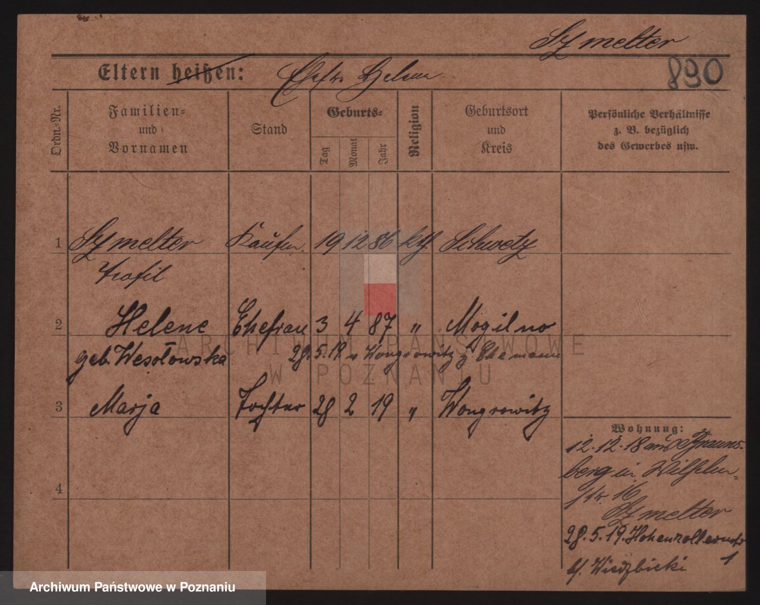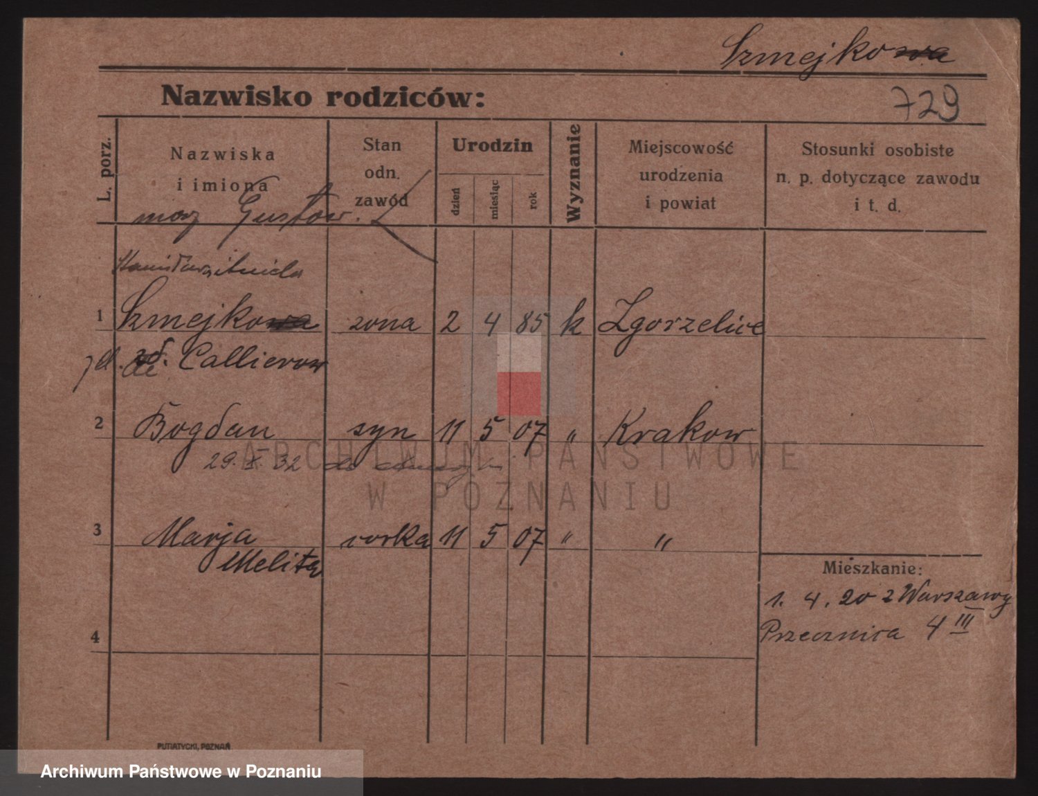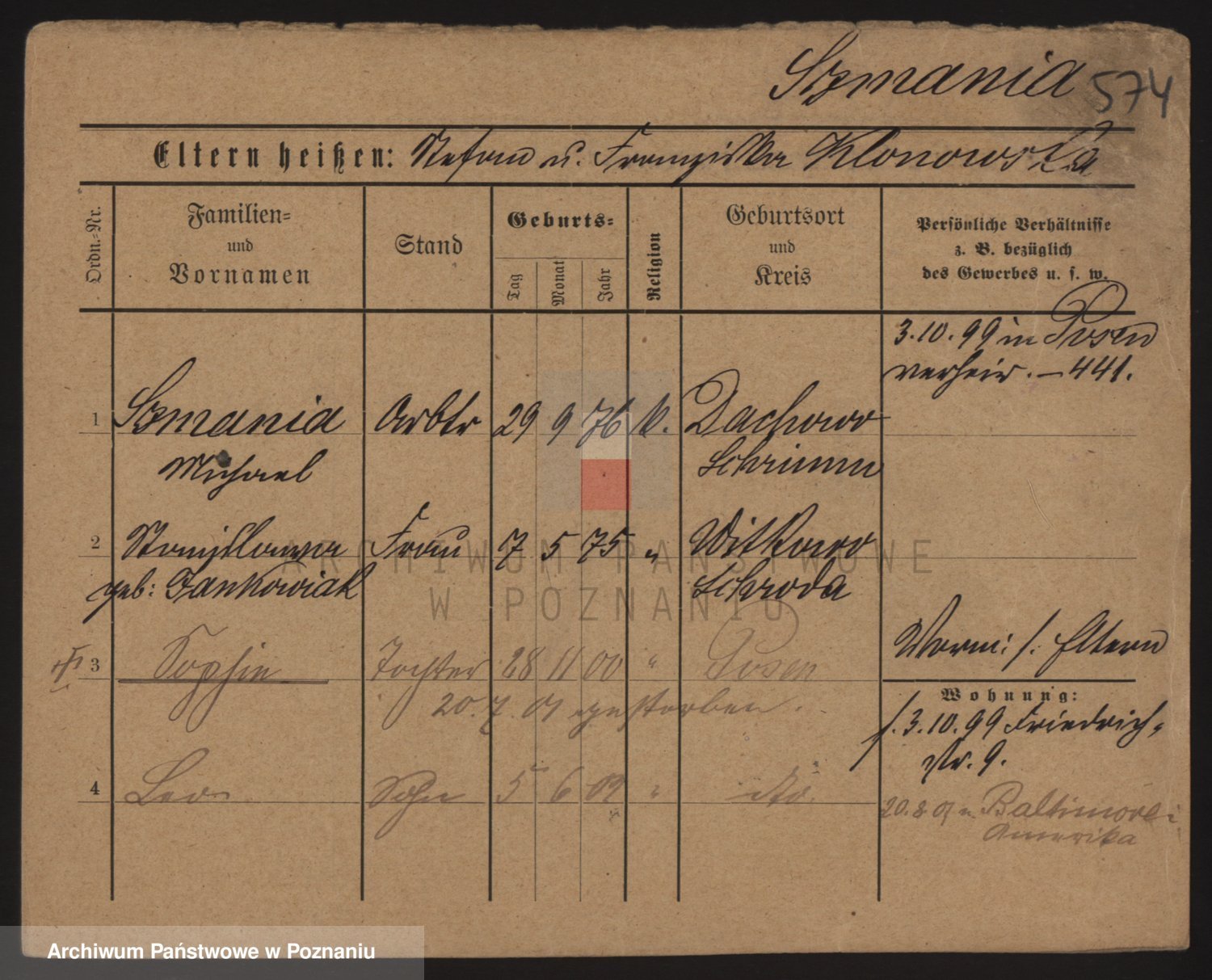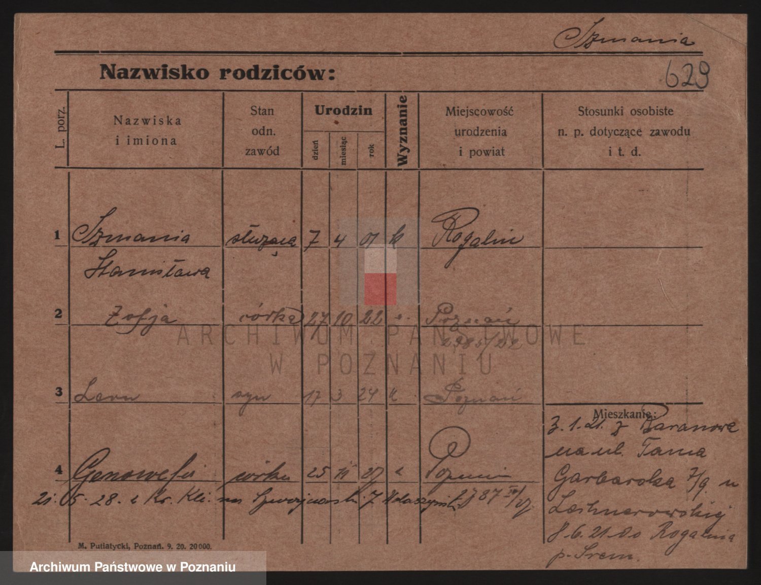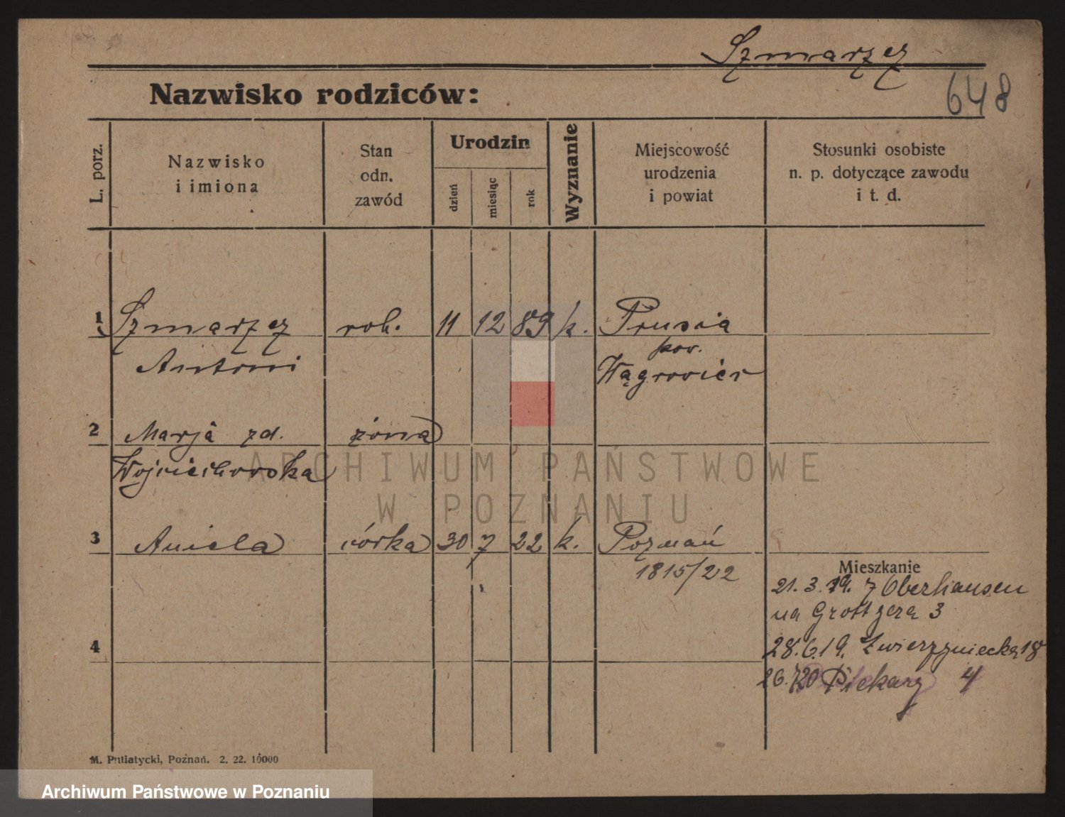 Podgląd karty osobowej dostępny jest po kliknięciu na nazwisko lub ikonkę karty. Można dokonywać powiększenia (ikony na górze) lub przechodzić między kolejnymi skanami (strzałki po bokach).
