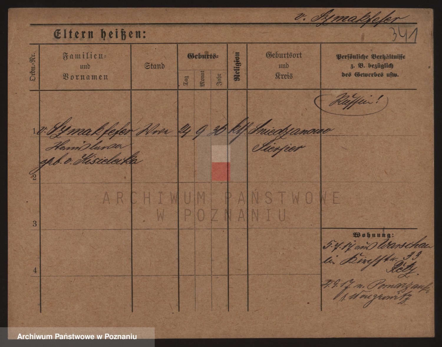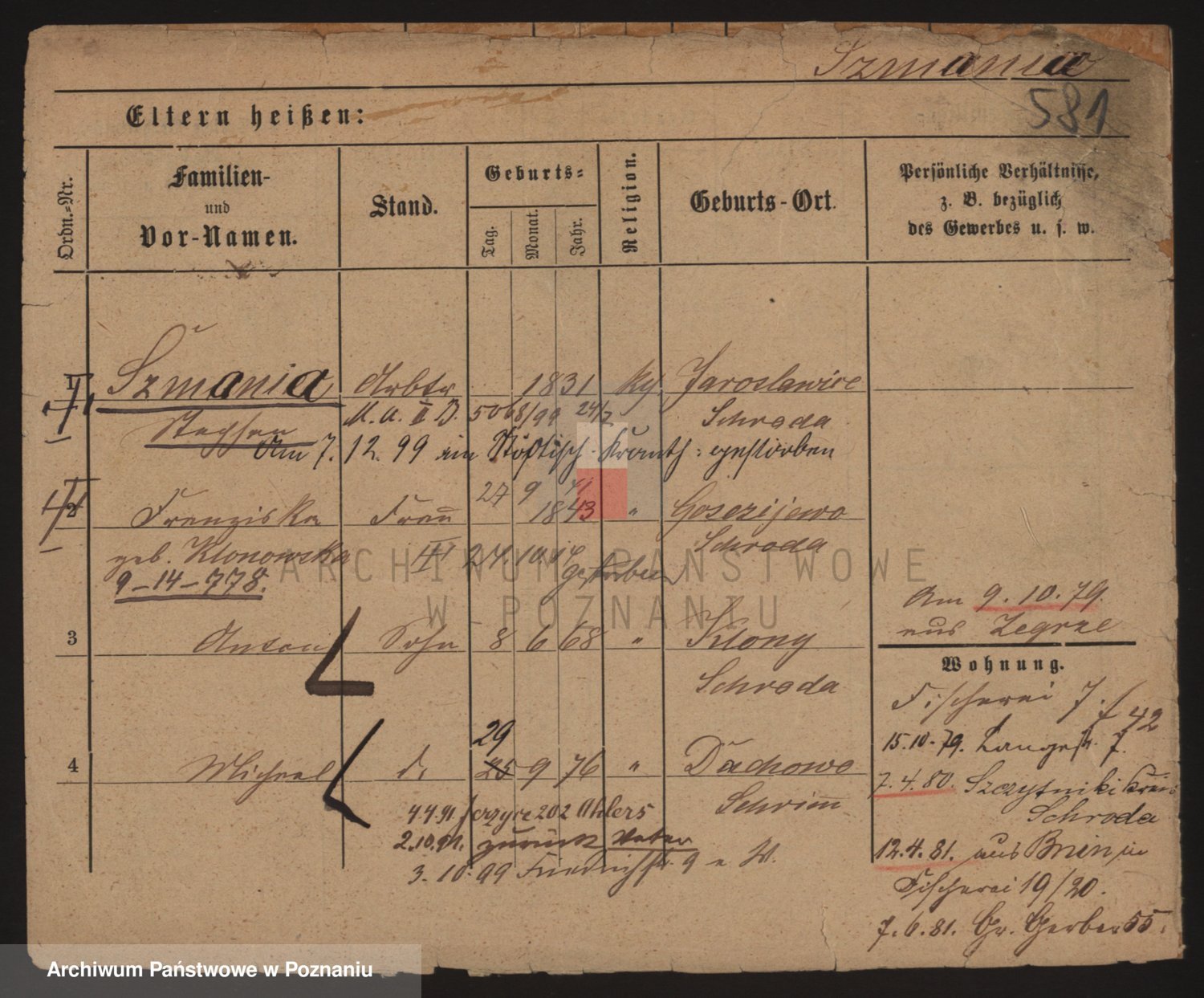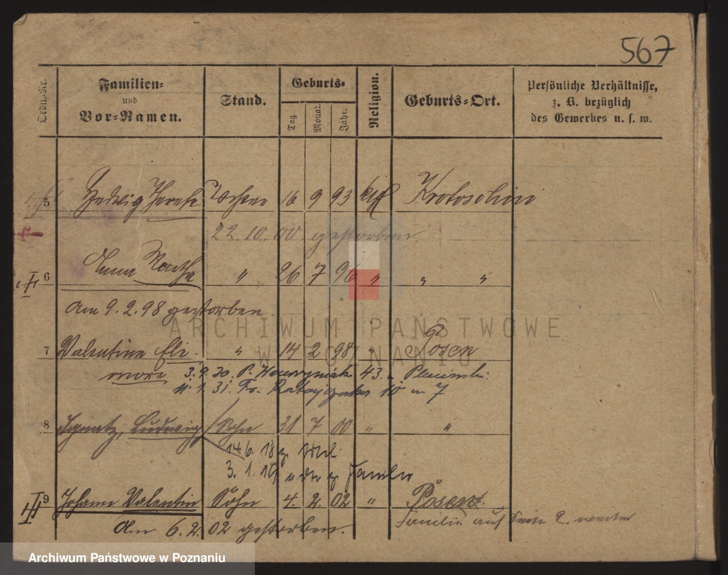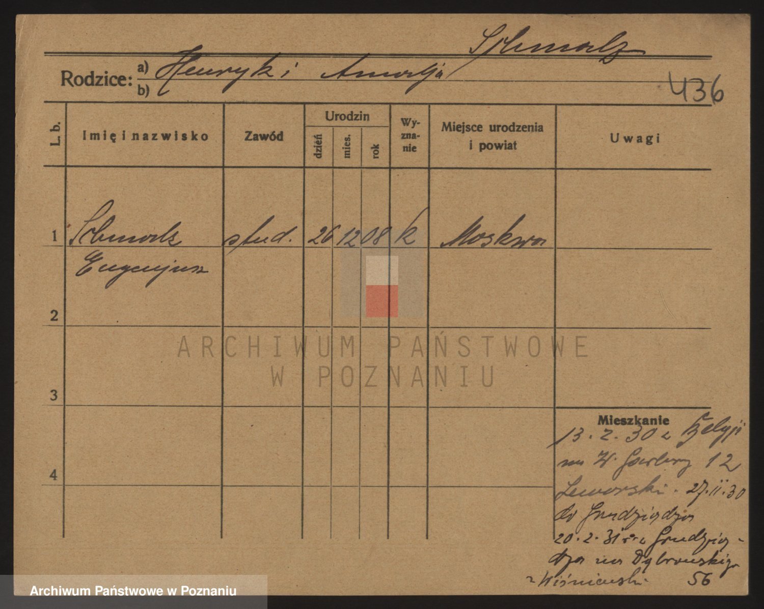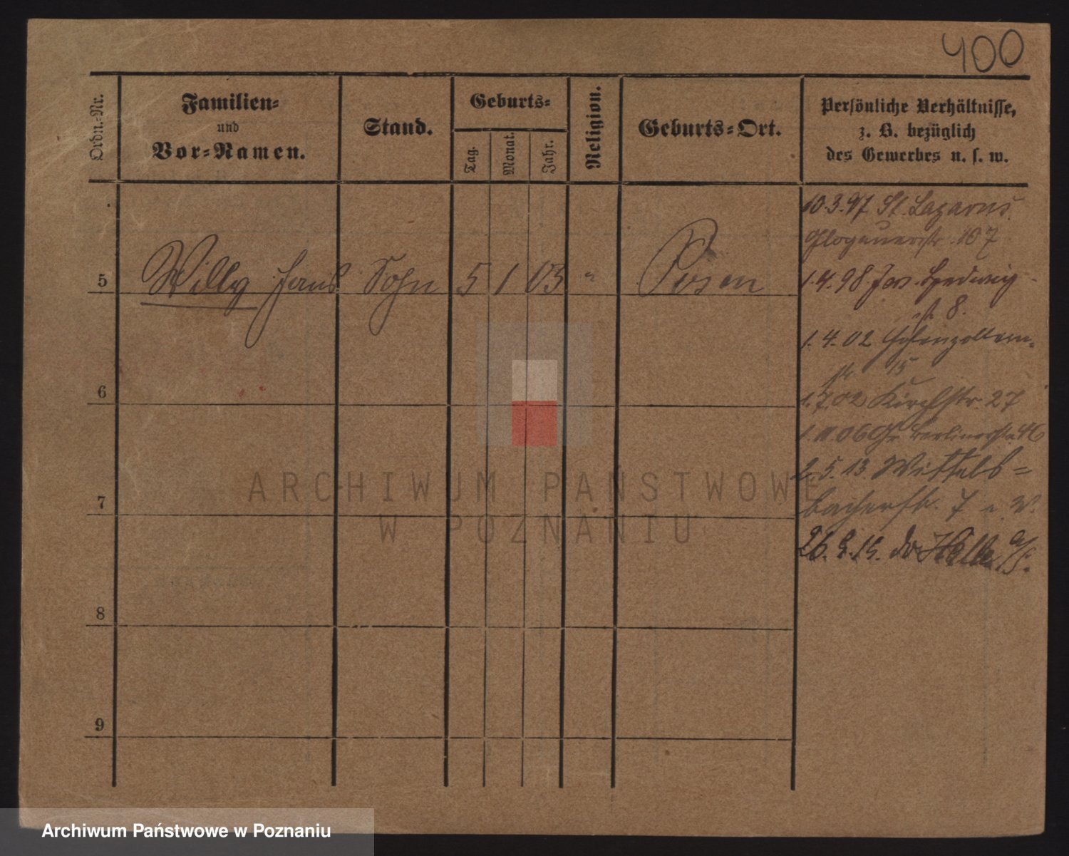 Podgląd karty osobowej dostępny jest po kliknięciu na nazwisko lub ikonkę karty. Można dokonywać powiększenia (ikony na górze) lub przechodzić między kolejnymi skanami (strzałki po bokach).