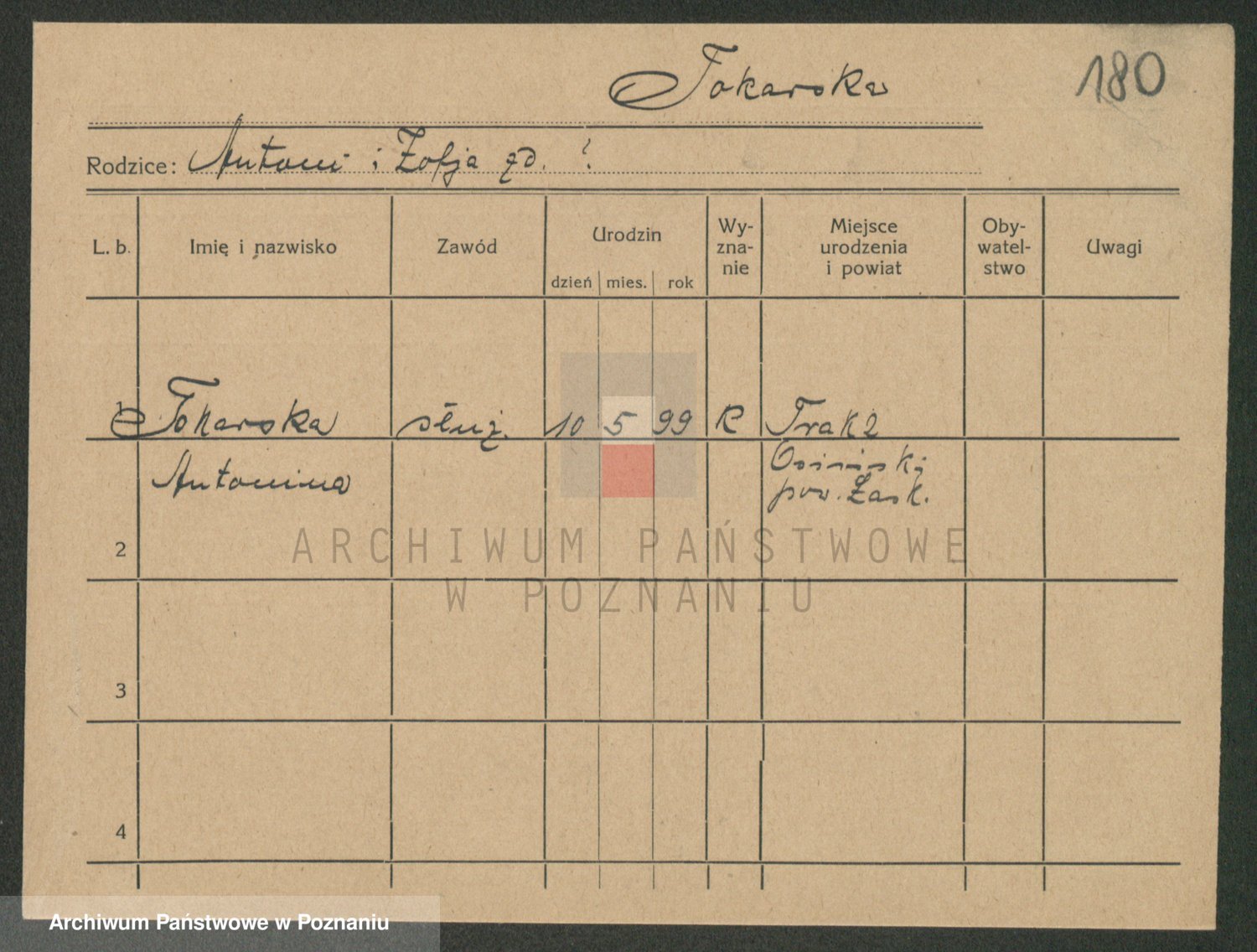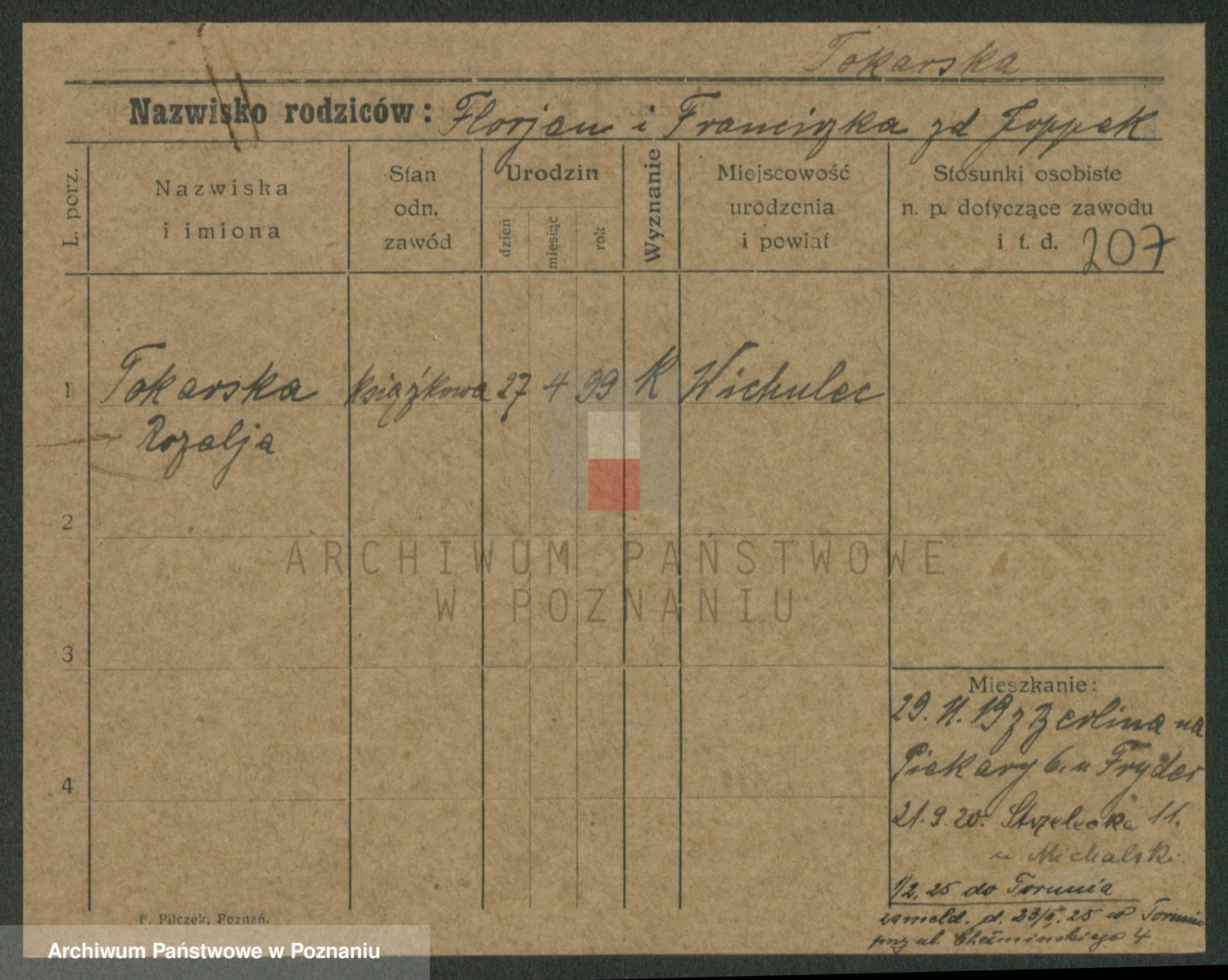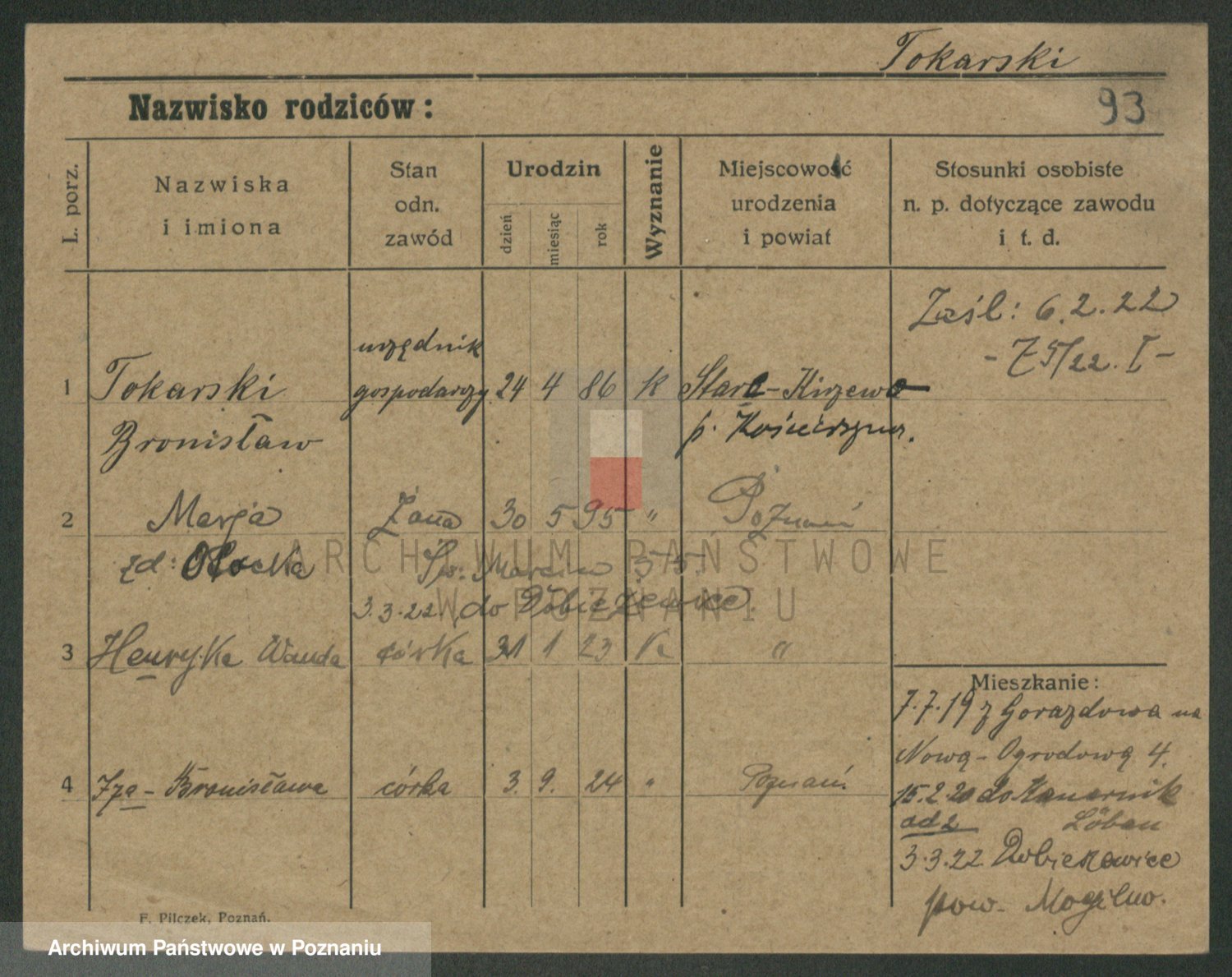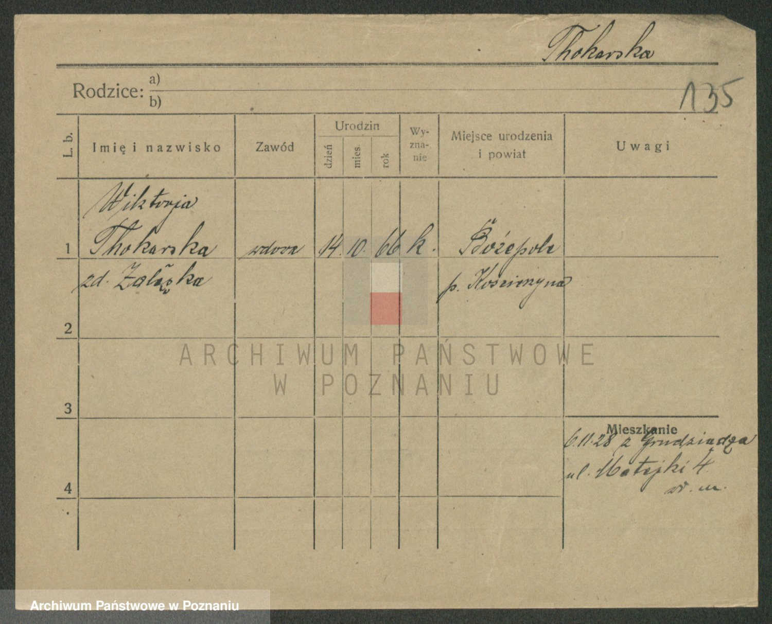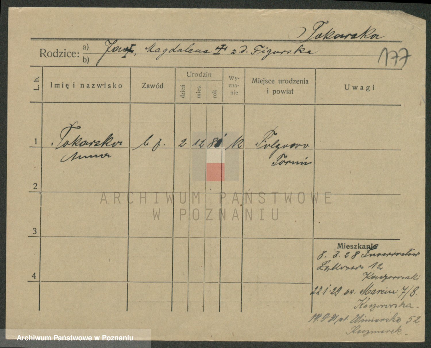 Podgląd karty osobowej dostępny jest po kliknięciu na nazwisko lub ikonkę karty. Można dokonywać powiększenia (ikony na górze) lub przechodzić między kolejnymi skanami (strzałki po bokach).