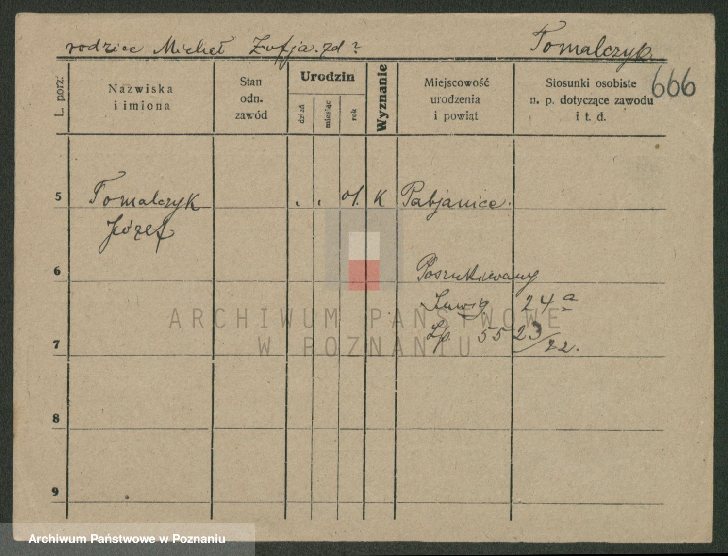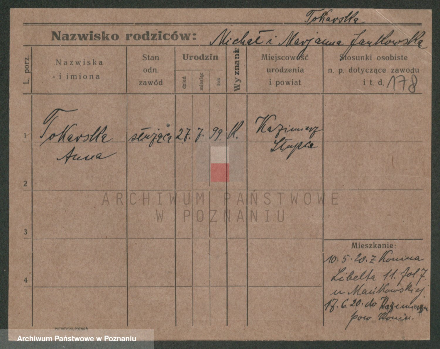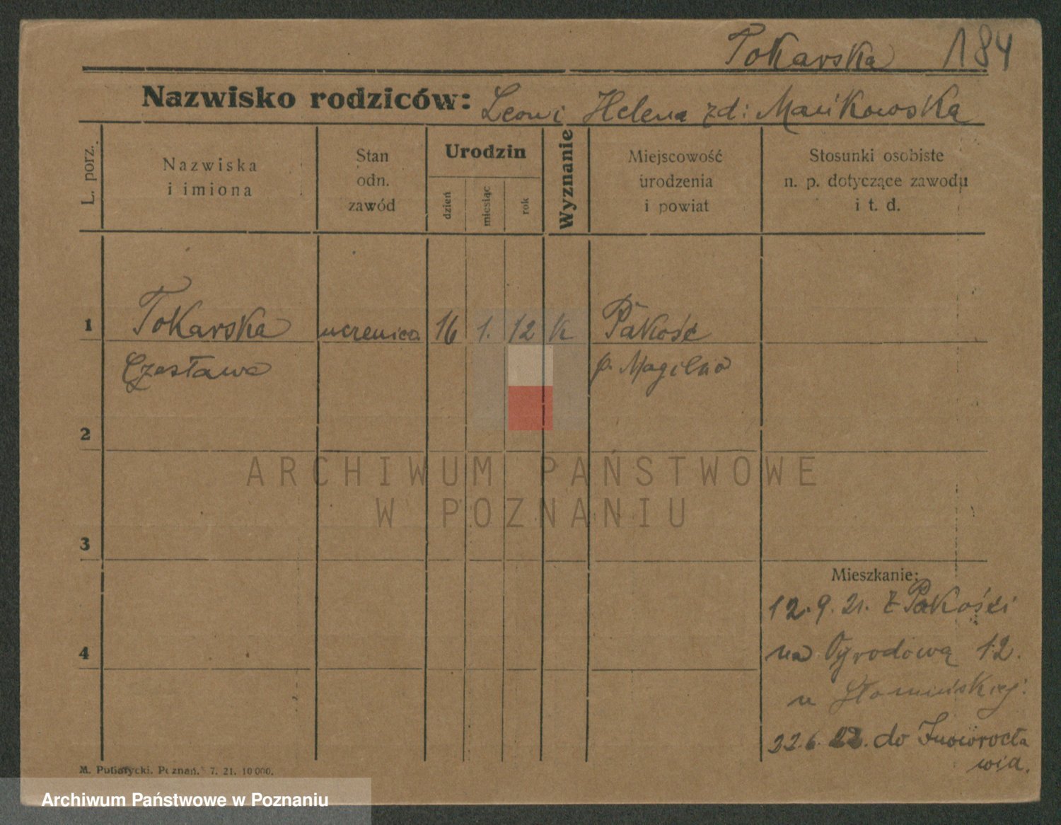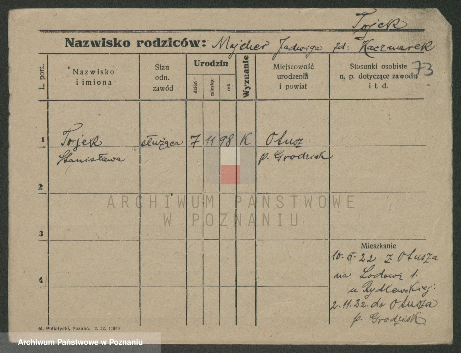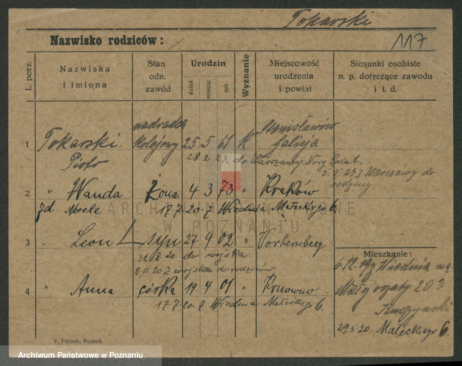 Podgląd karty osobowej dostępny jest po kliknięciu na nazwisko lub ikonkę karty. Można dokonywać powiększenia (ikony na górze) lub przechodzić między kolejnymi skanami (strzałki po bokach).