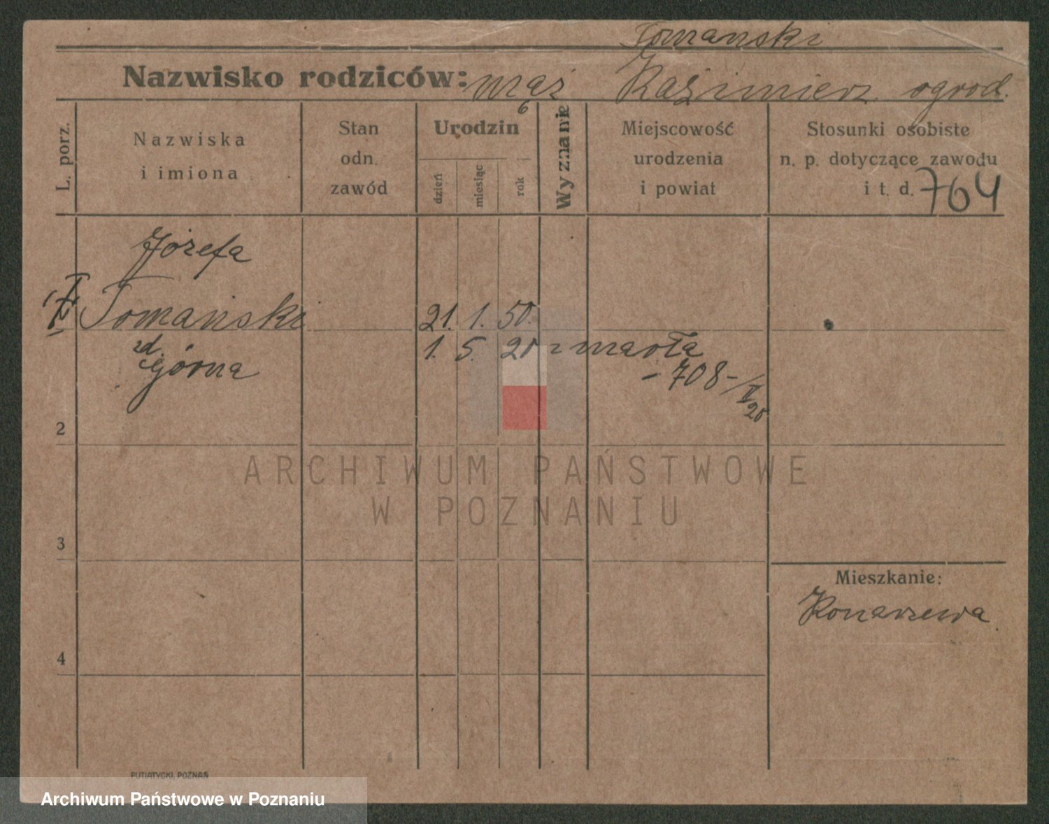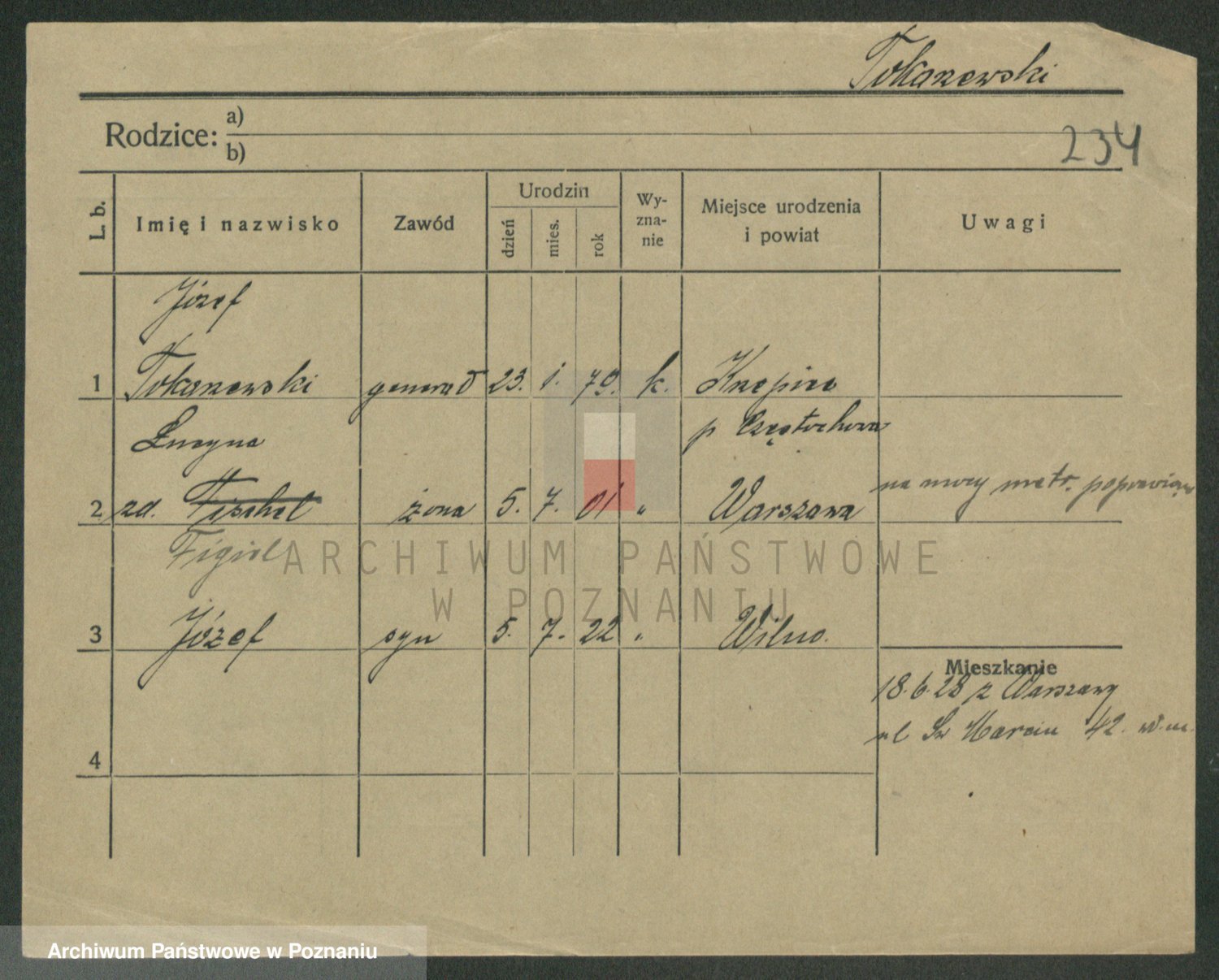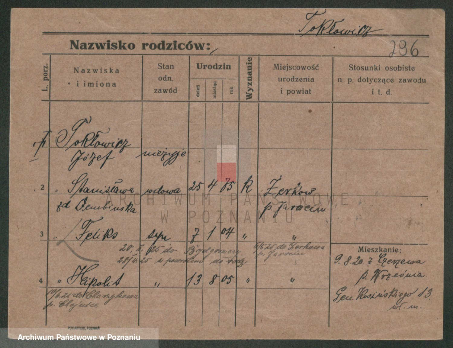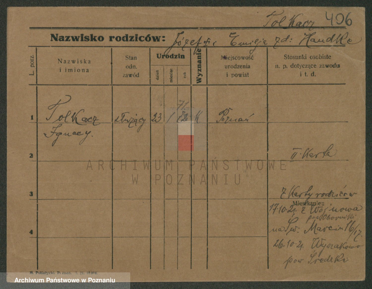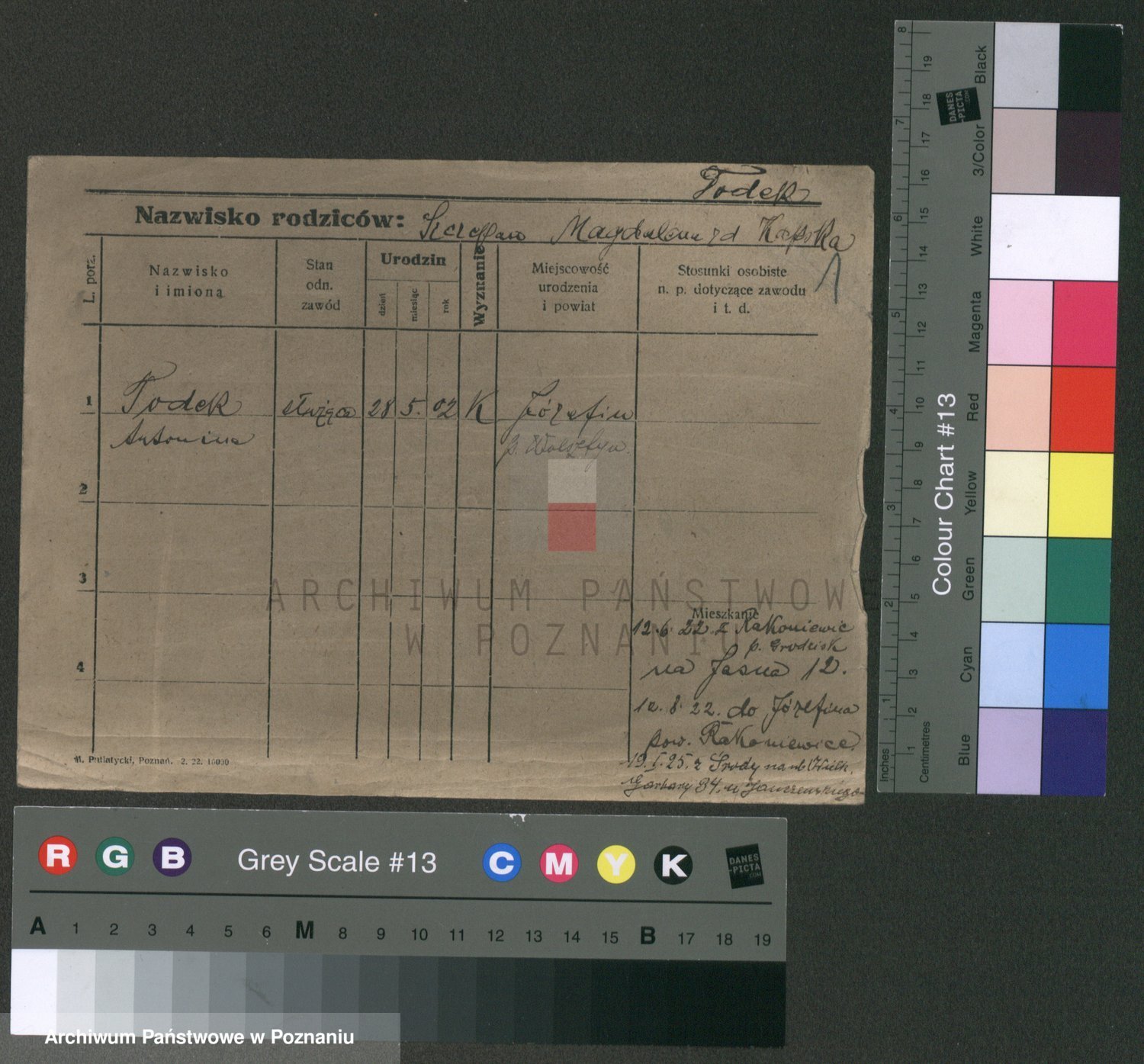 Podgląd karty osobowej dostępny jest po kliknięciu na nazwisko lub ikonkę karty. Można dokonywać powiększenia (ikony na górze) lub przechodzić między kolejnymi skanami (strzałki po bokach).