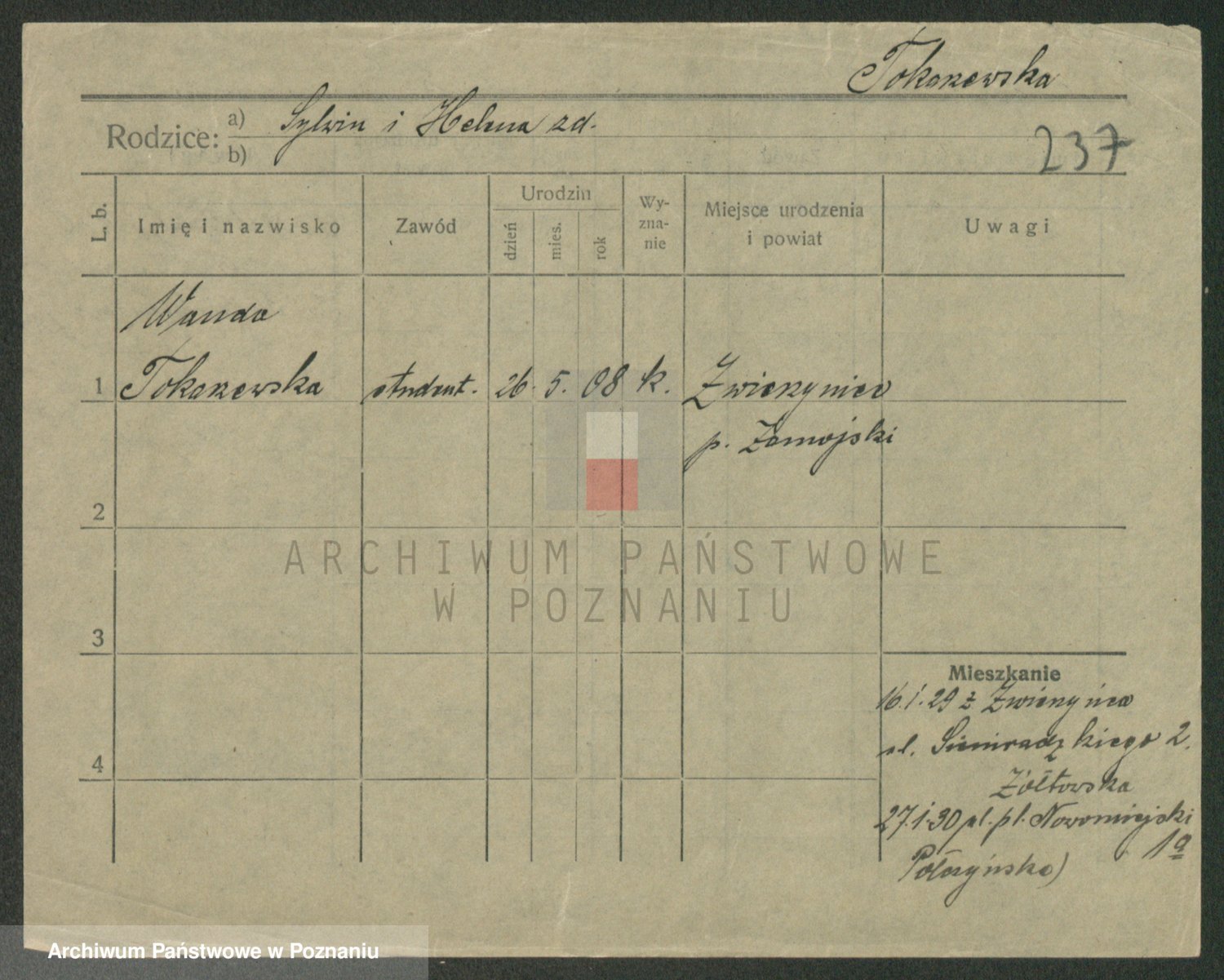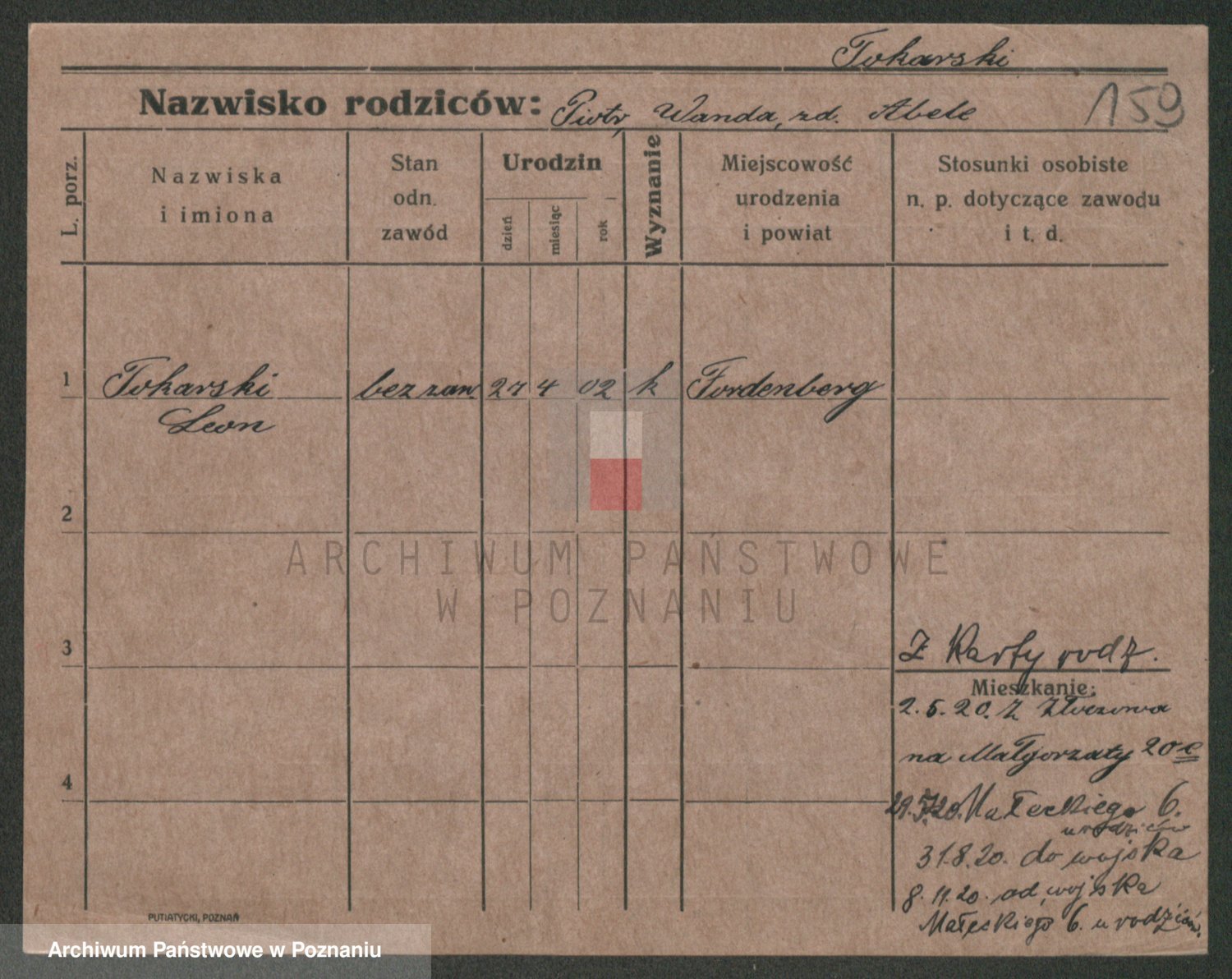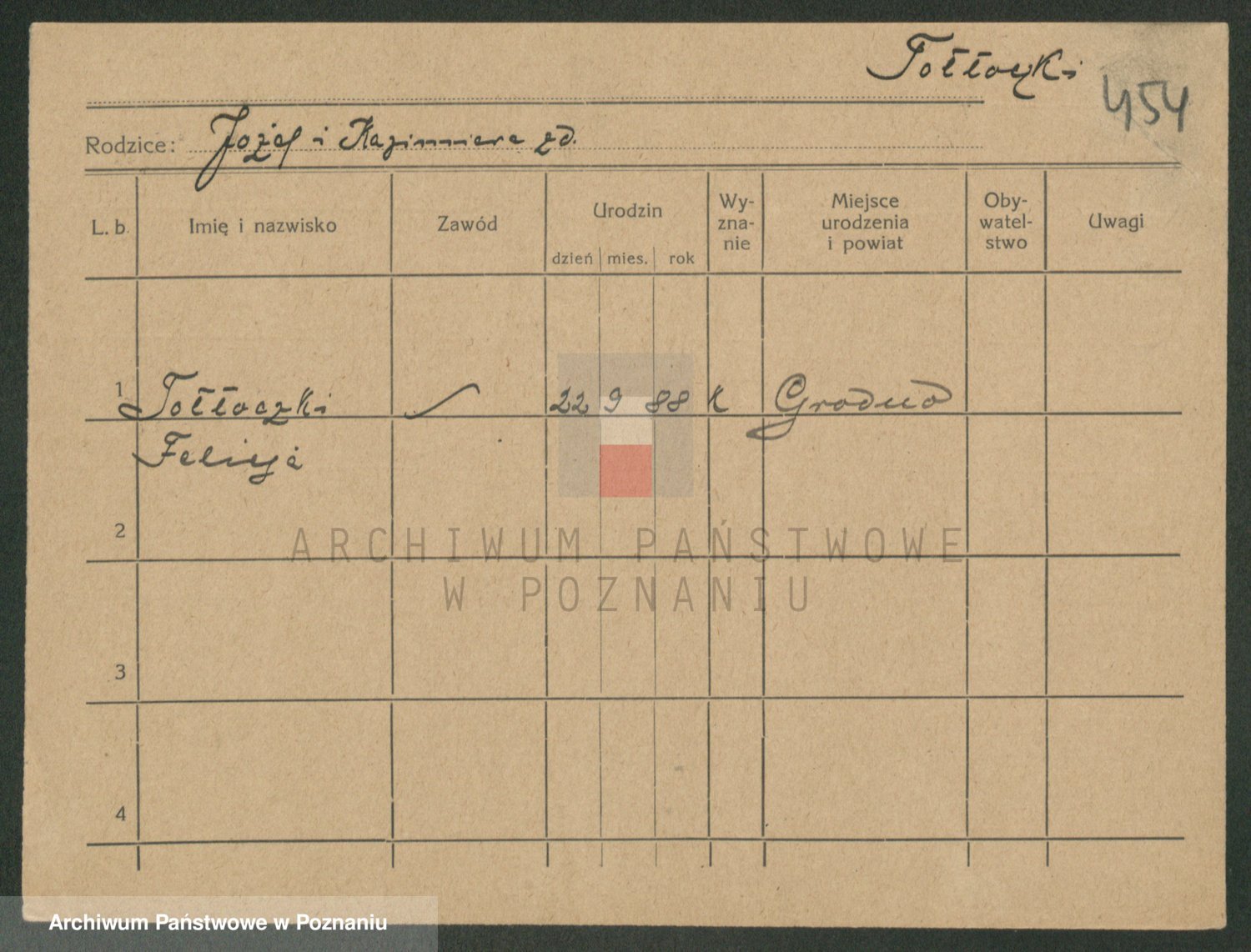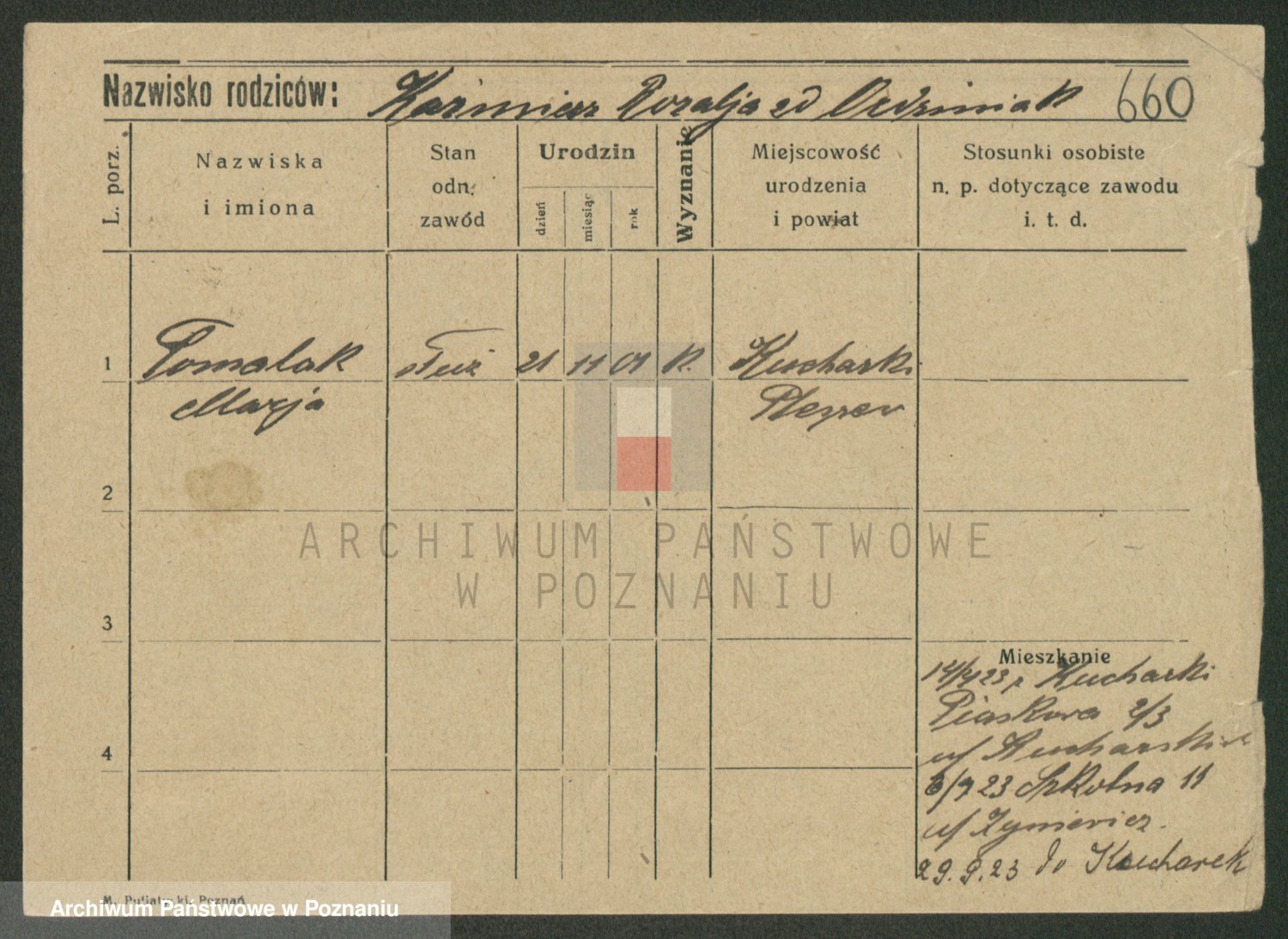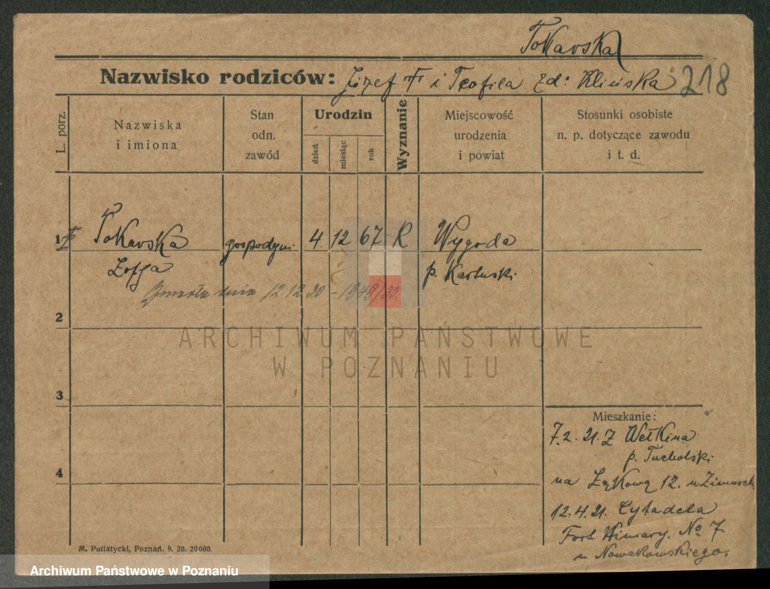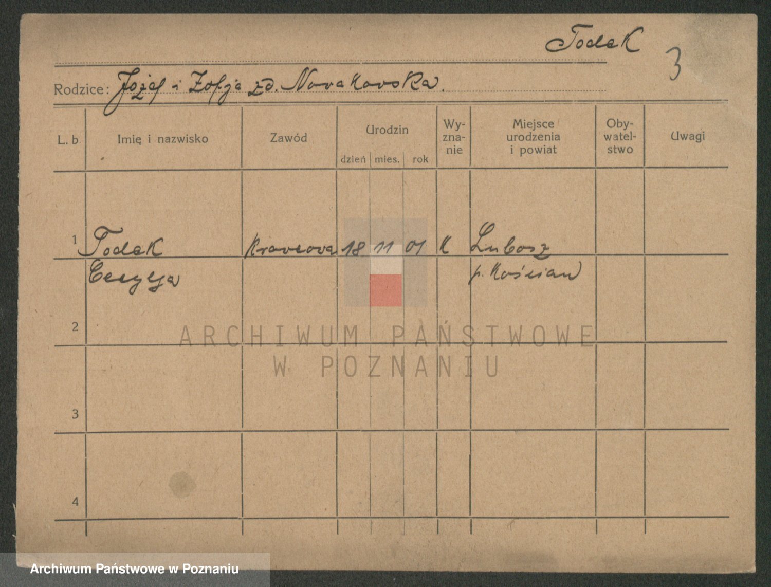 Podgląd karty osobowej dostępny jest po kliknięciu na nazwisko lub ikonkę karty. Można dokonywać powiększenia (ikony na górze) lub przechodzić między kolejnymi skanami (strzałki po bokach).