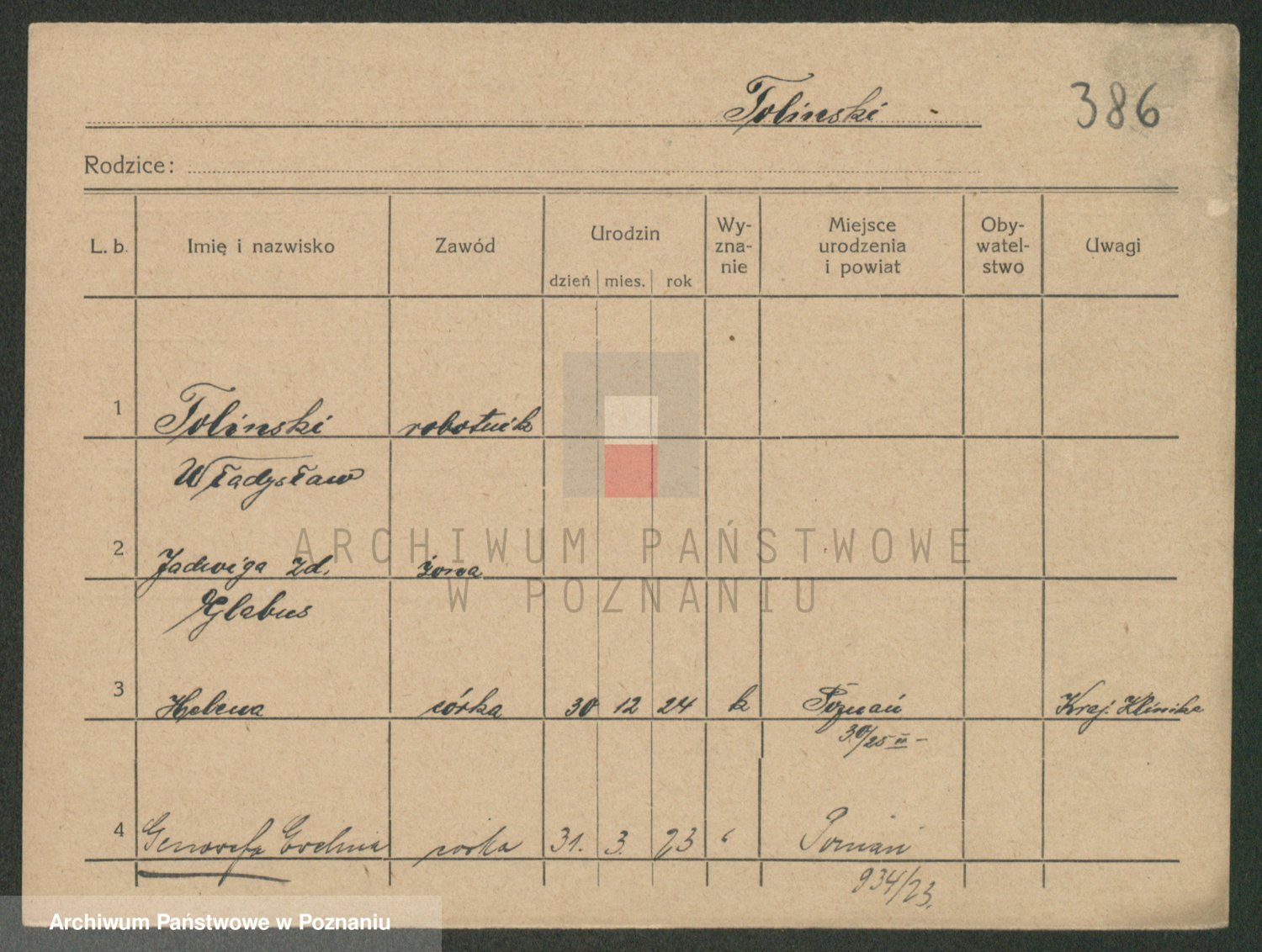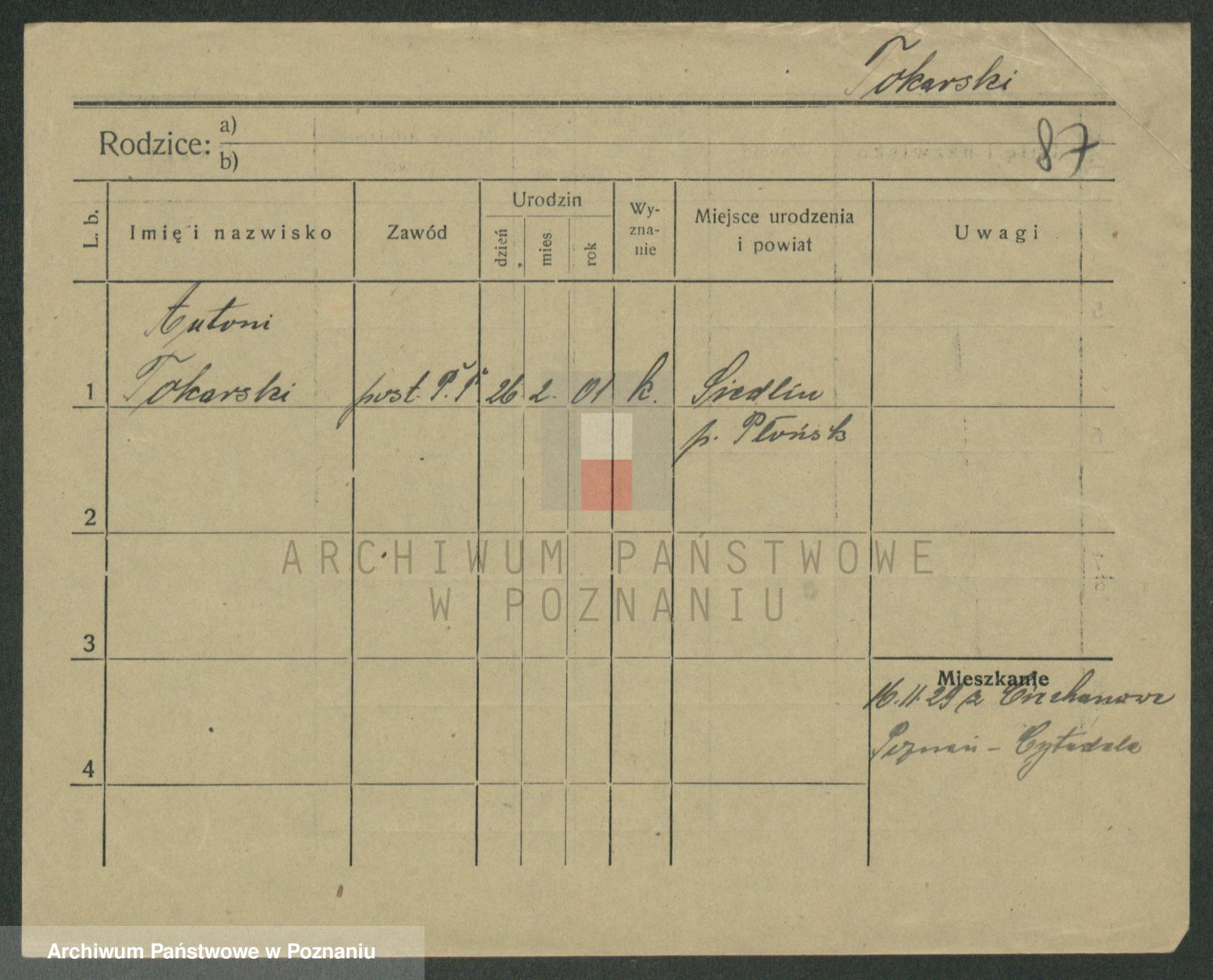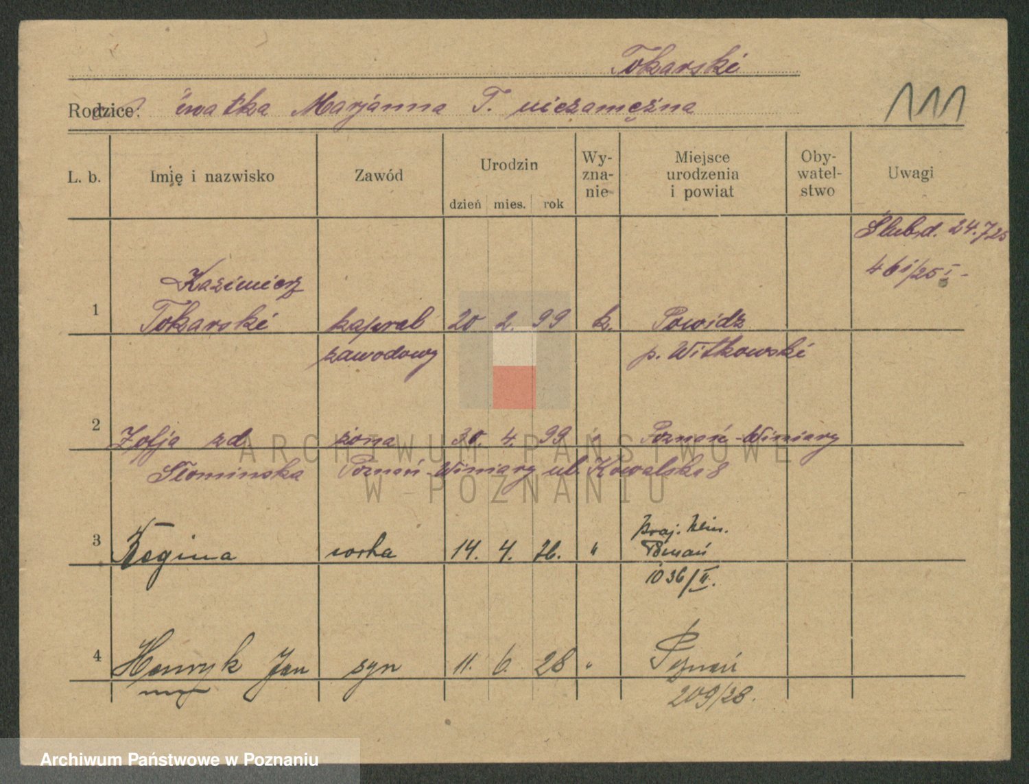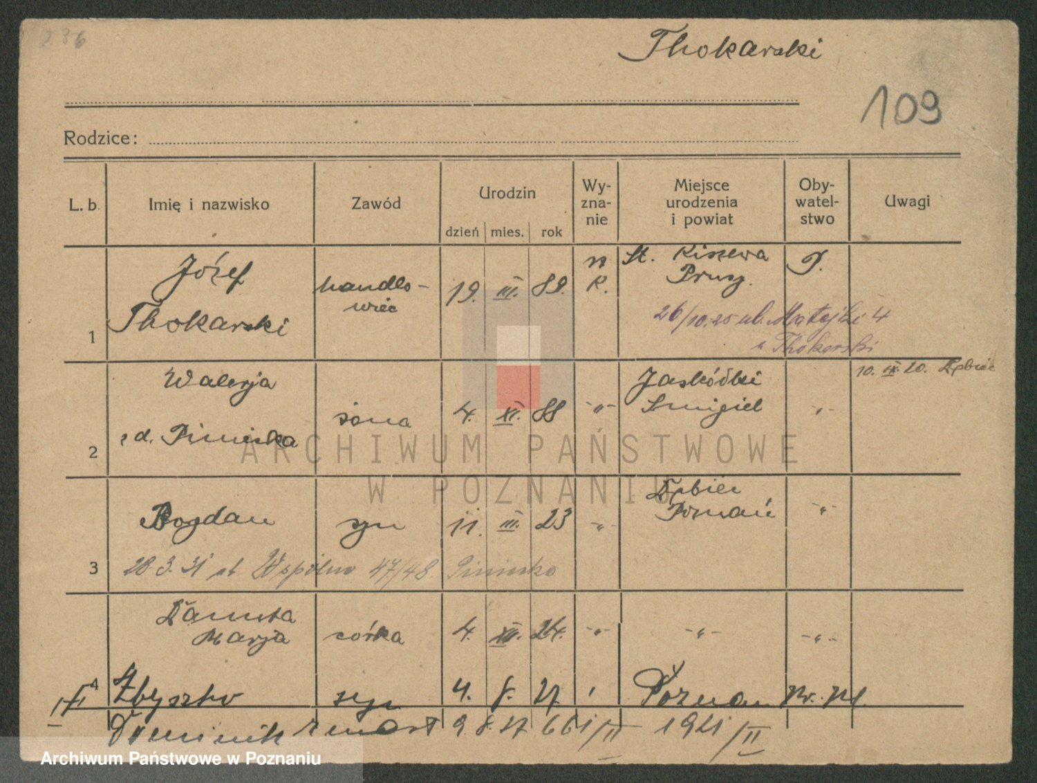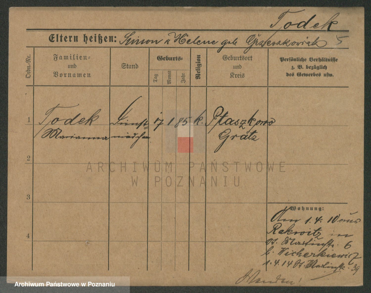 Podgląd karty osobowej dostępny jest po kliknięciu na nazwisko lub ikonkę karty. Można dokonywać powiększenia (ikony na górze) lub przechodzić między kolejnymi skanami (strzałki po bokach).