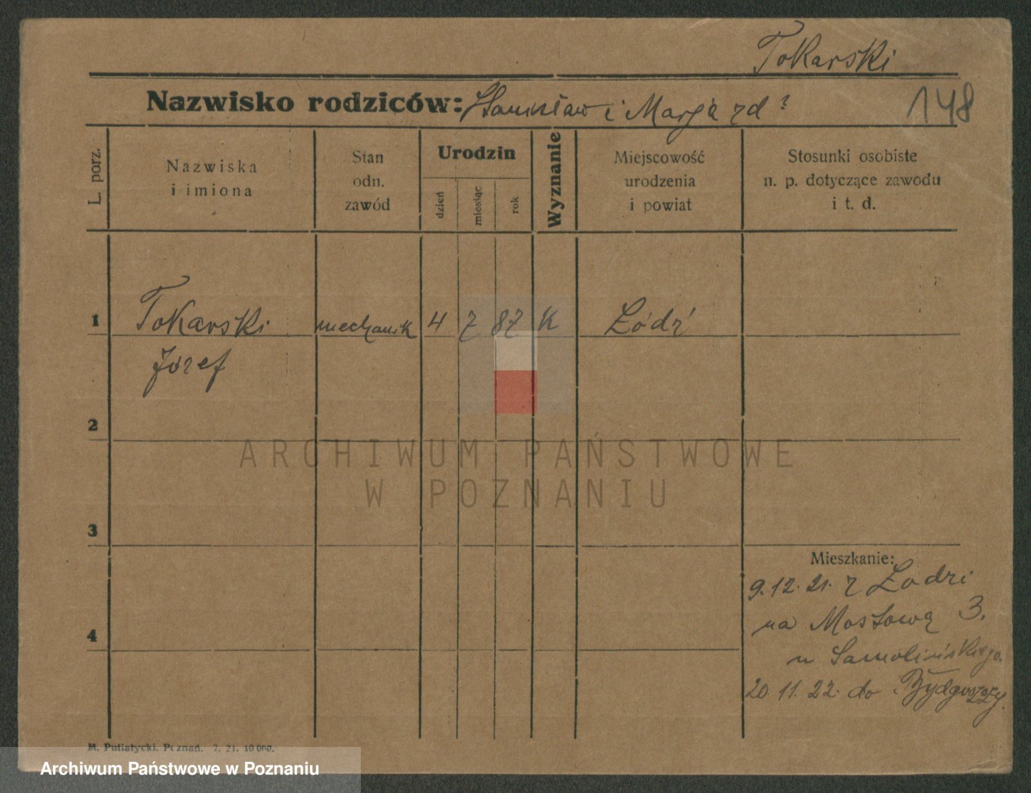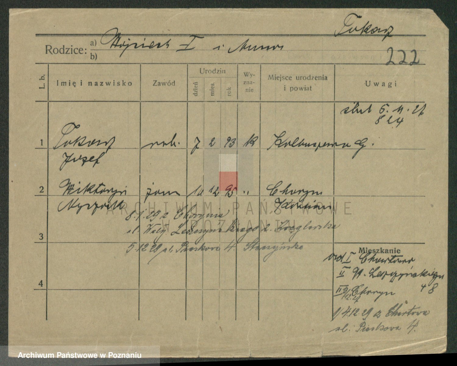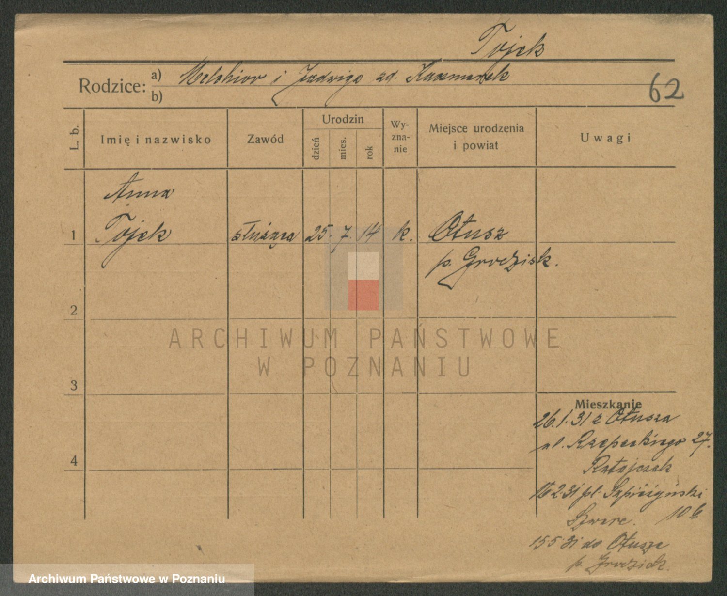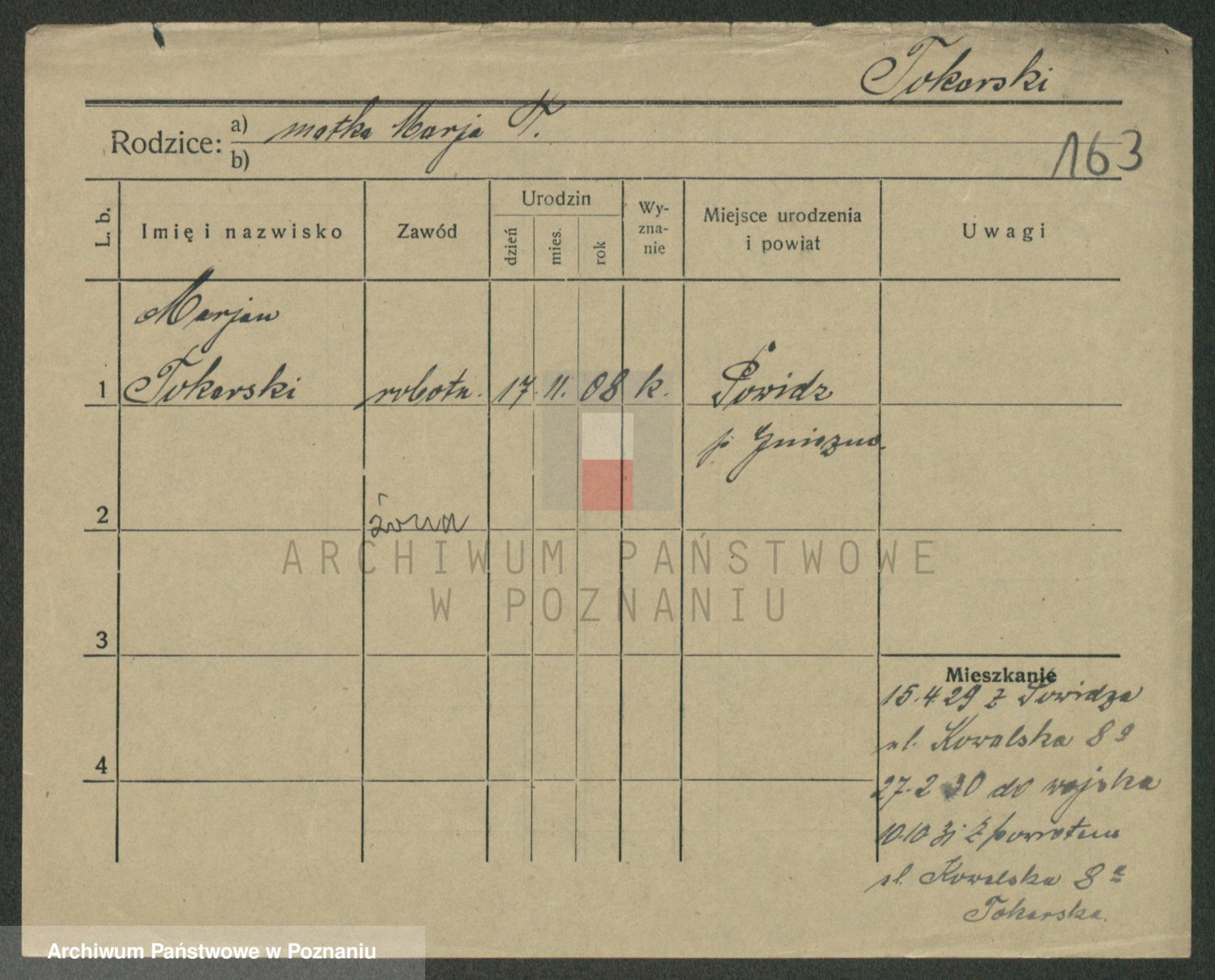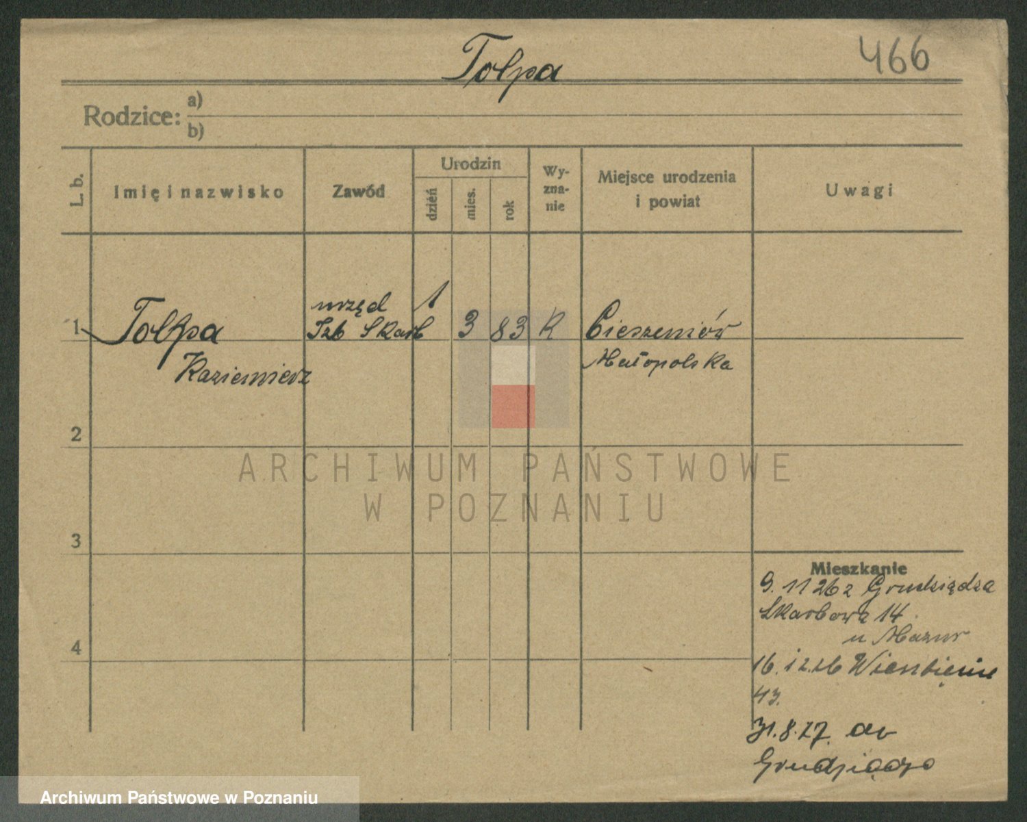 Podgląd karty osobowej dostępny jest po kliknięciu na nazwisko lub ikonkę karty. Można dokonywać powiększenia (ikony na górze) lub przechodzić między kolejnymi skanami (strzałki po bokach).
