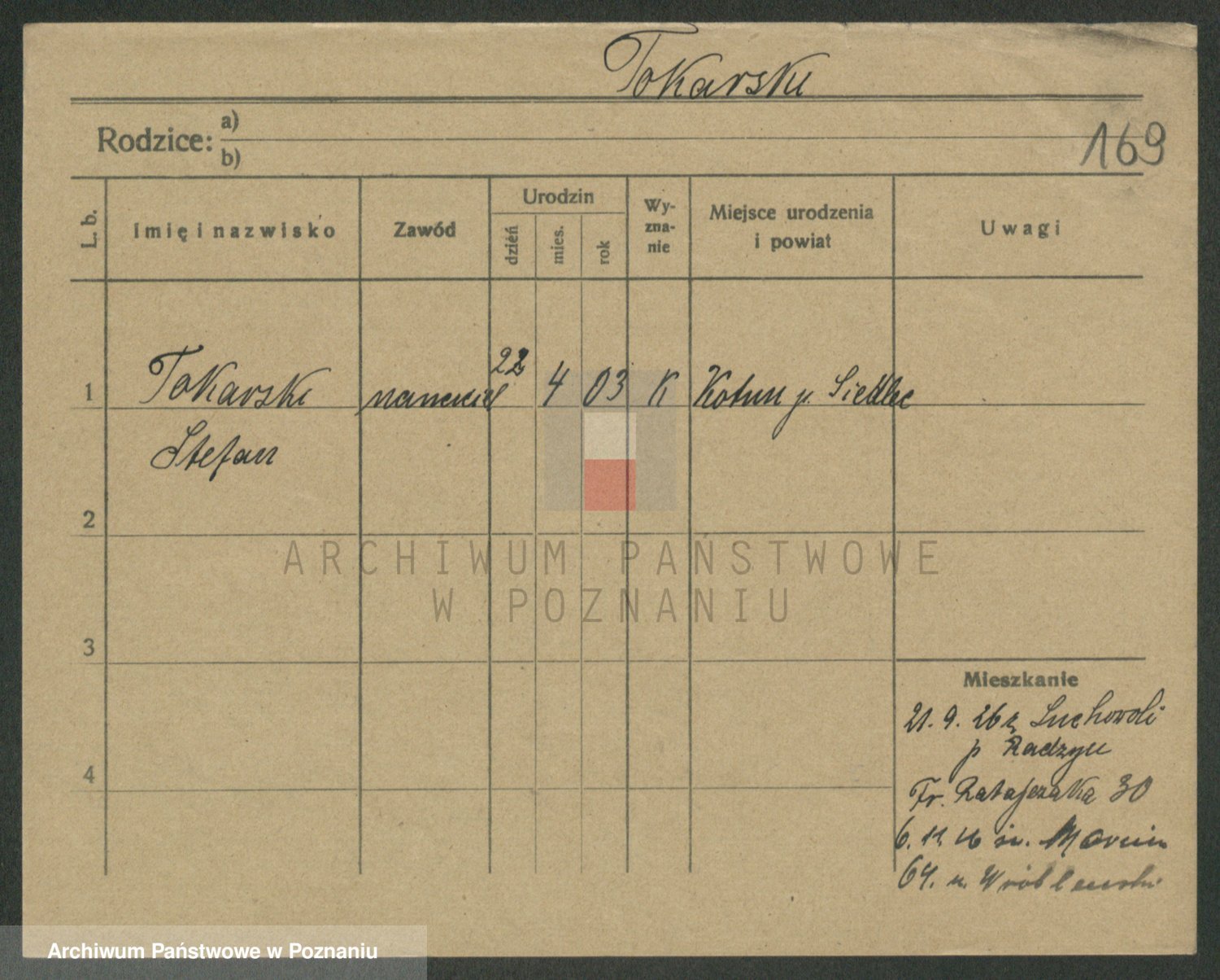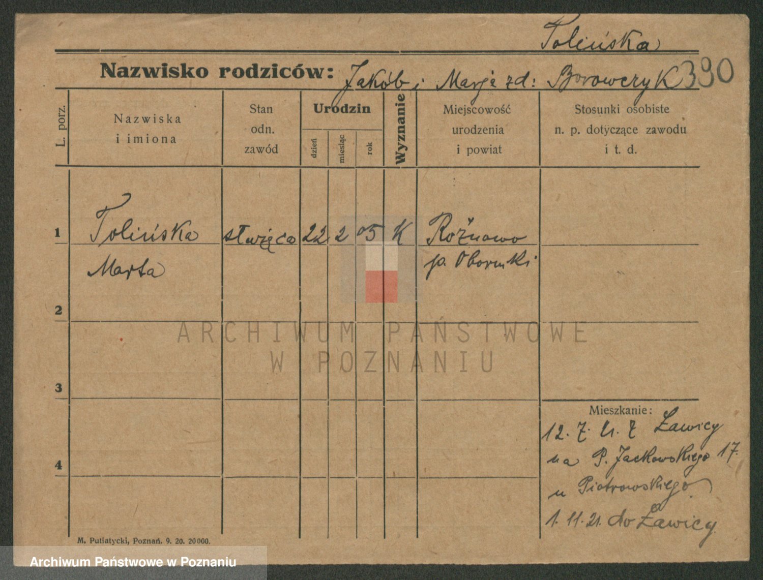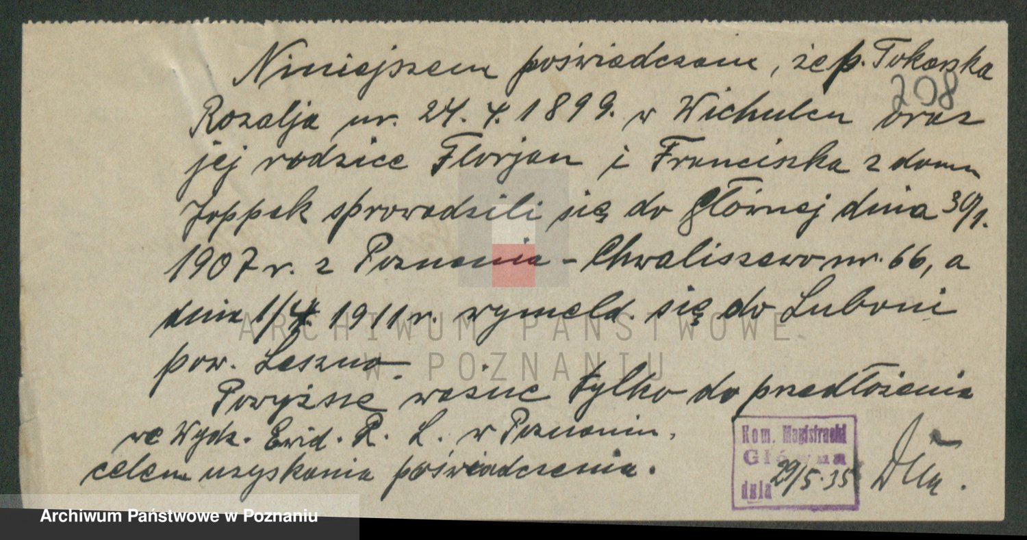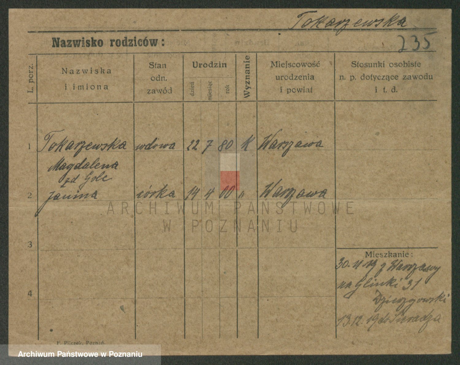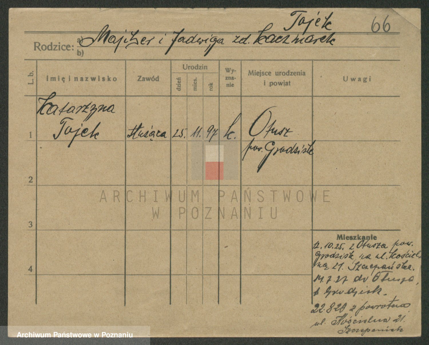 Podgląd karty osobowej dostępny jest po kliknięciu na nazwisko lub ikonkę karty. Można dokonywać powiększenia (ikony na górze) lub przechodzić między kolejnymi skanami (strzałki po bokach).