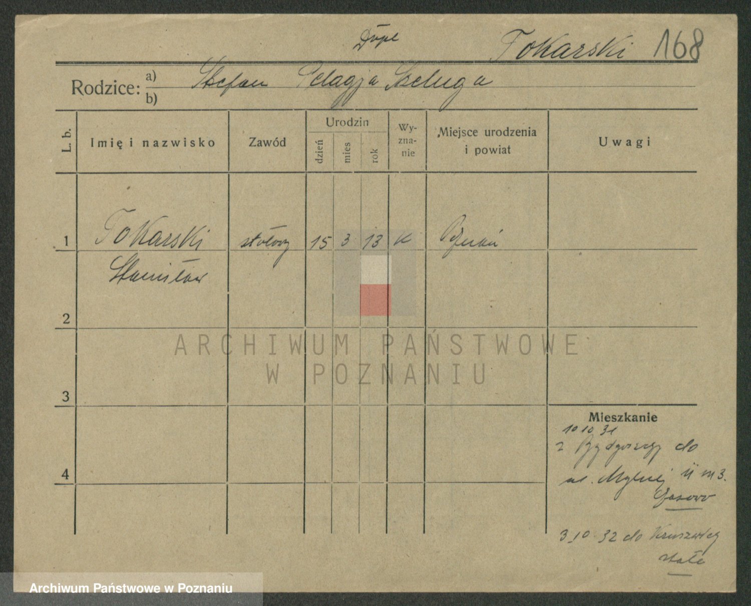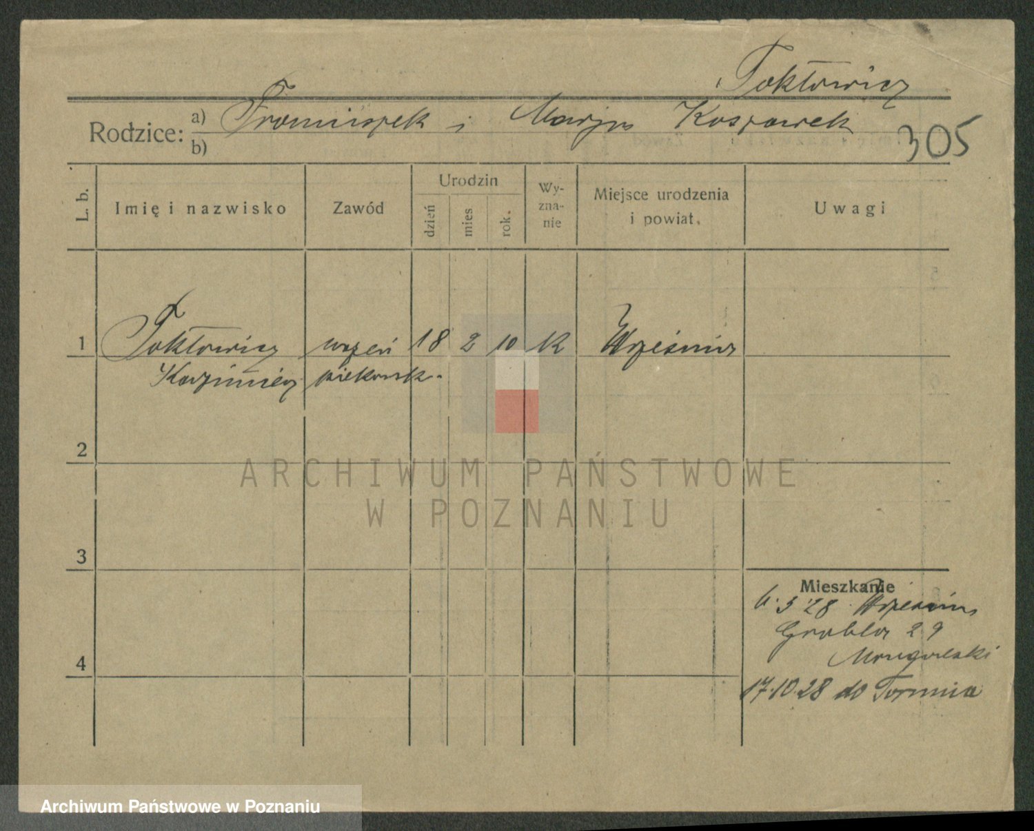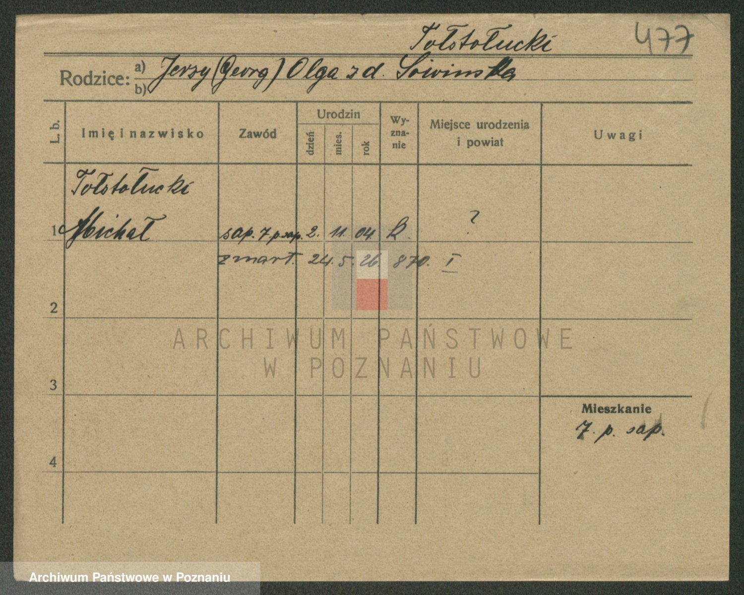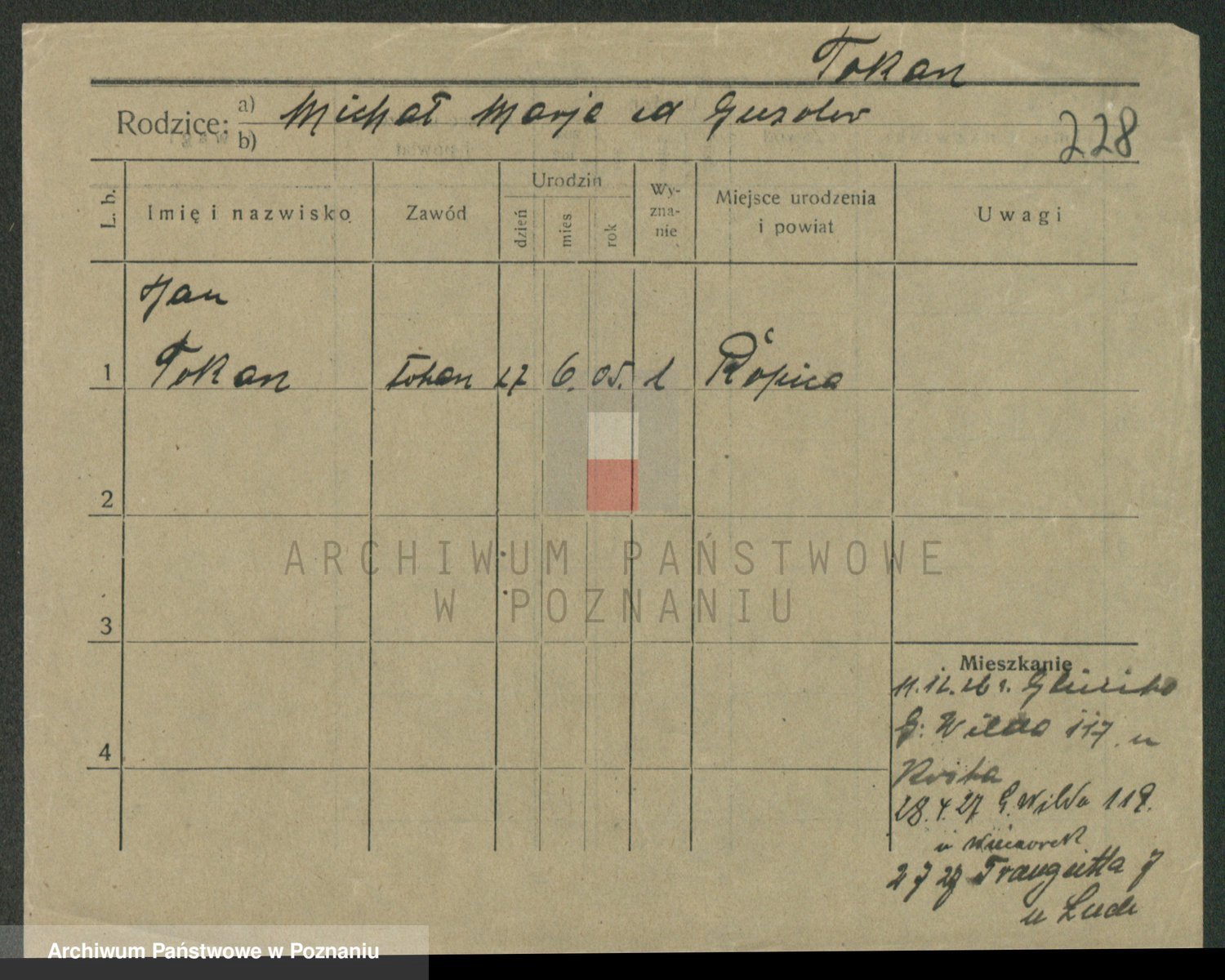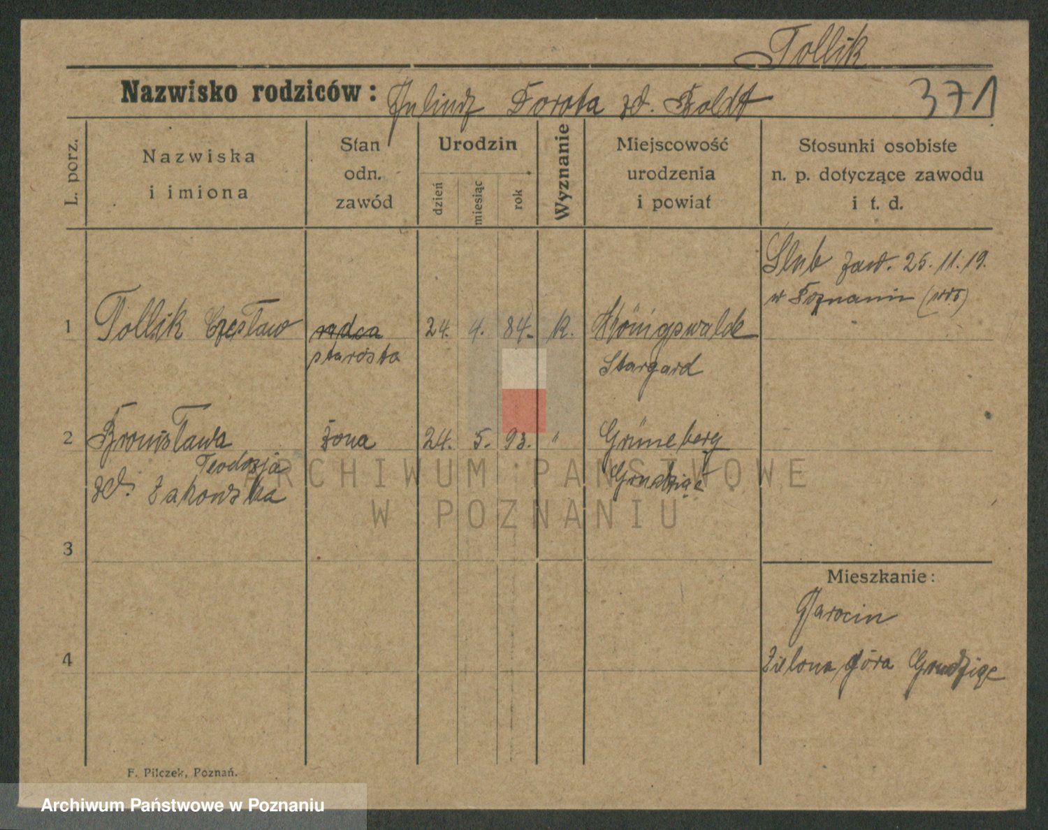 Podgląd karty osobowej dostępny jest po kliknięciu na nazwisko lub ikonkę karty. Można dokonywać powiększenia (ikony na górze) lub przechodzić między kolejnymi skanami (strzałki po bokach).