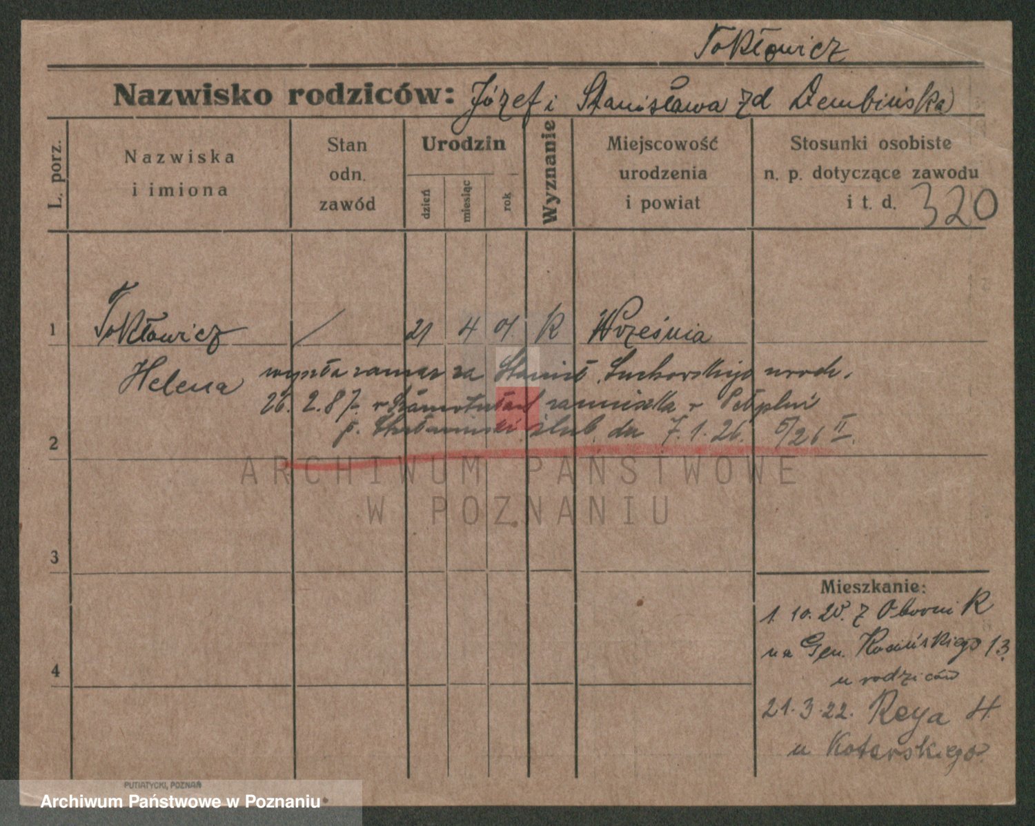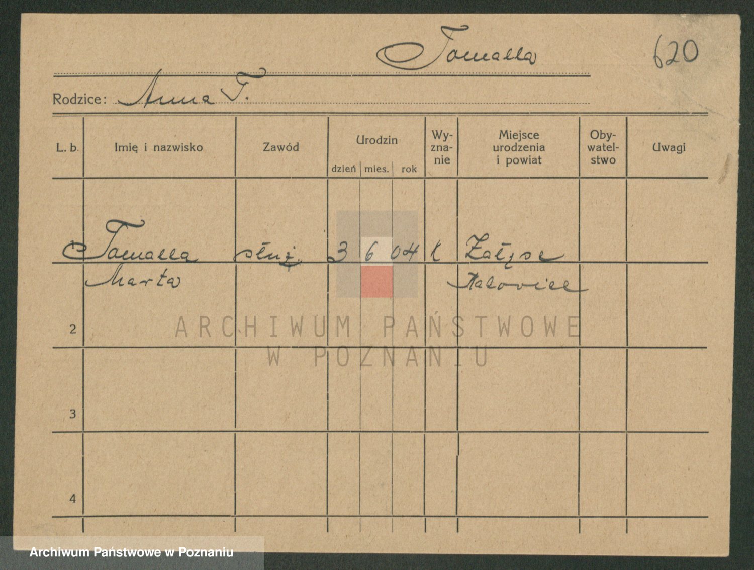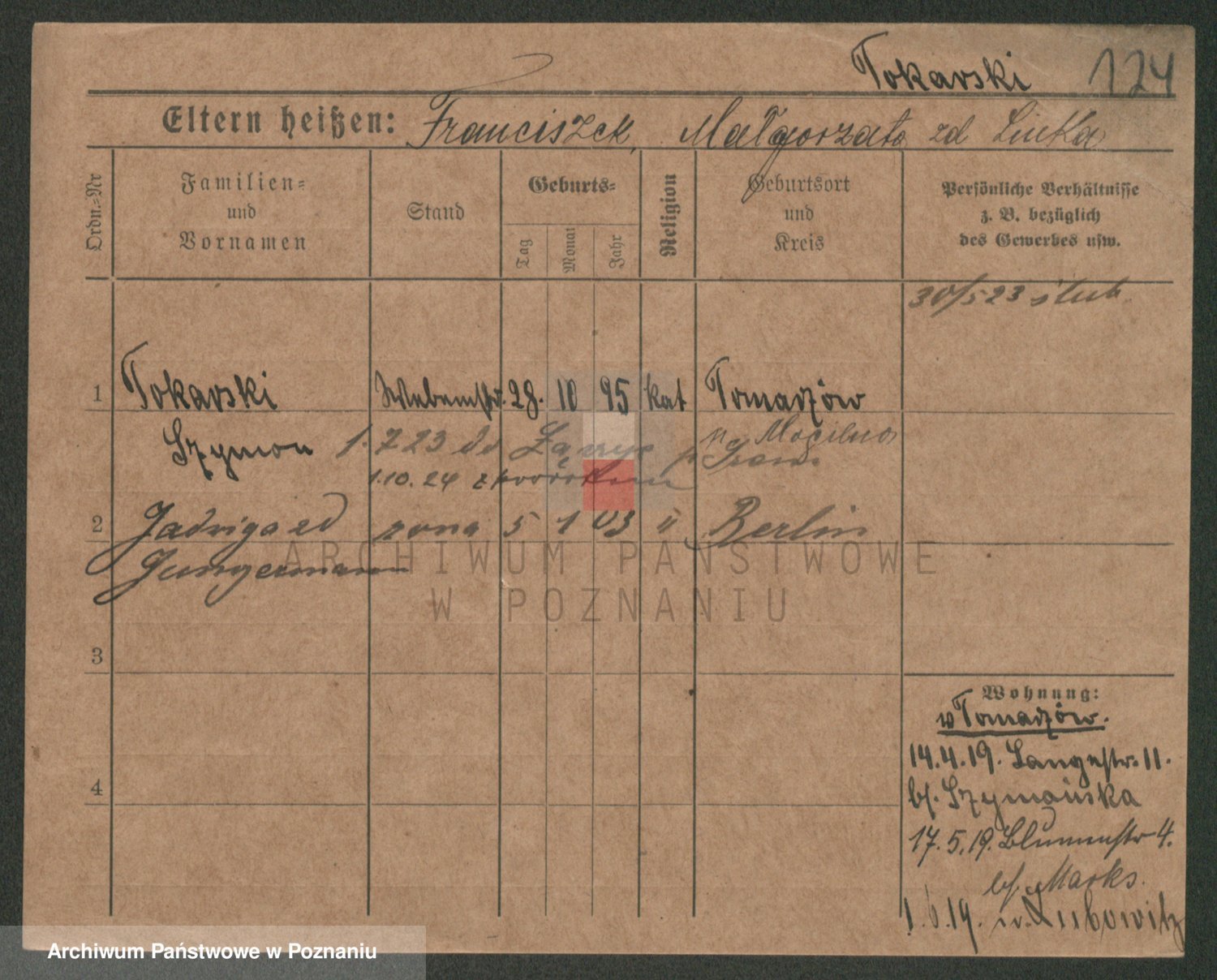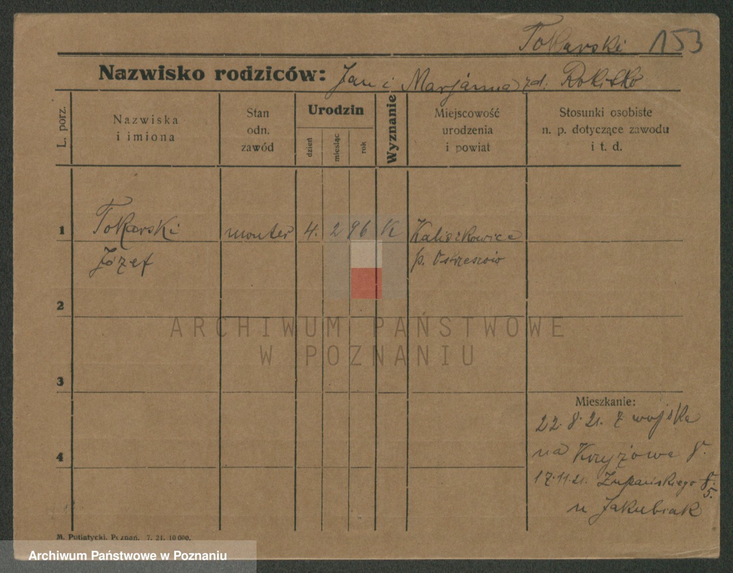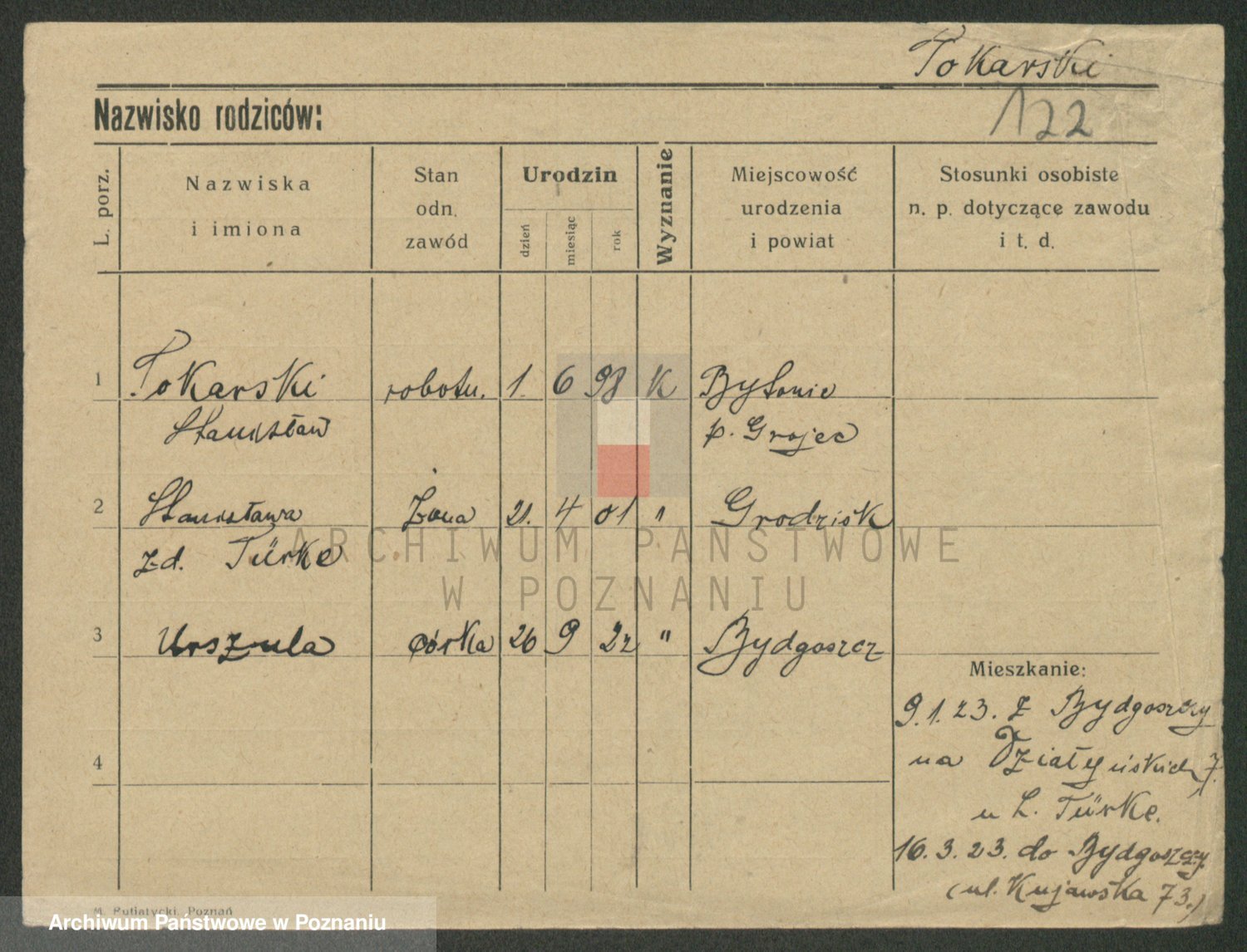 Podgląd karty osobowej dostępny jest po kliknięciu na nazwisko lub ikonkę karty. Można dokonywać powiększenia (ikony na górze) lub przechodzić między kolejnymi skanami (strzałki po bokach).