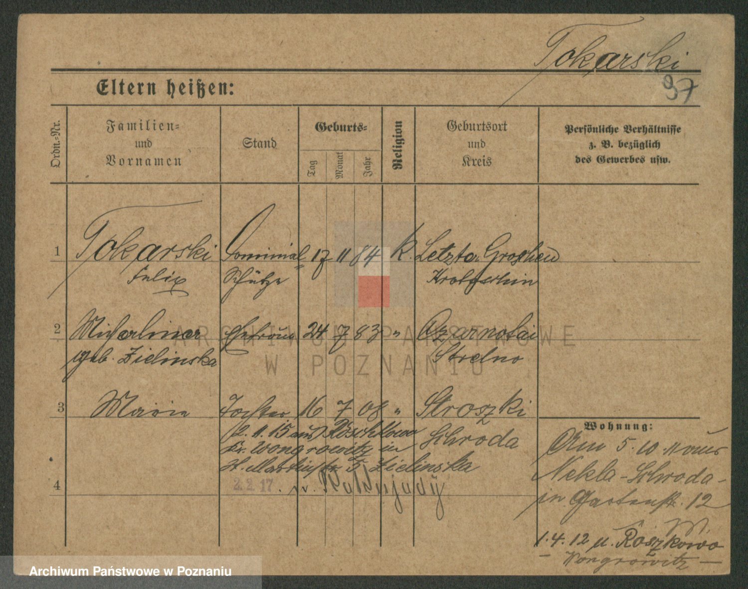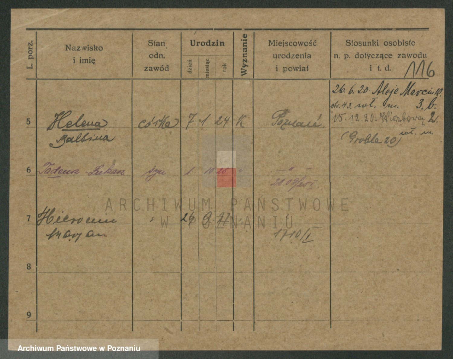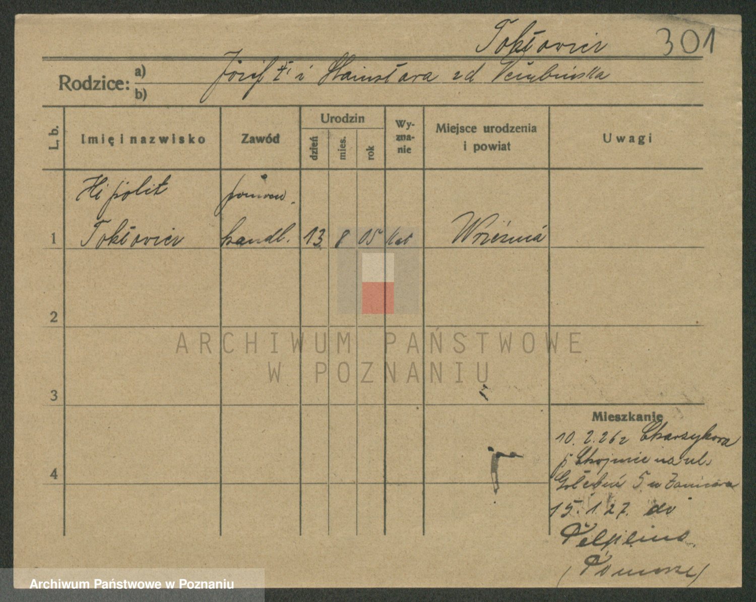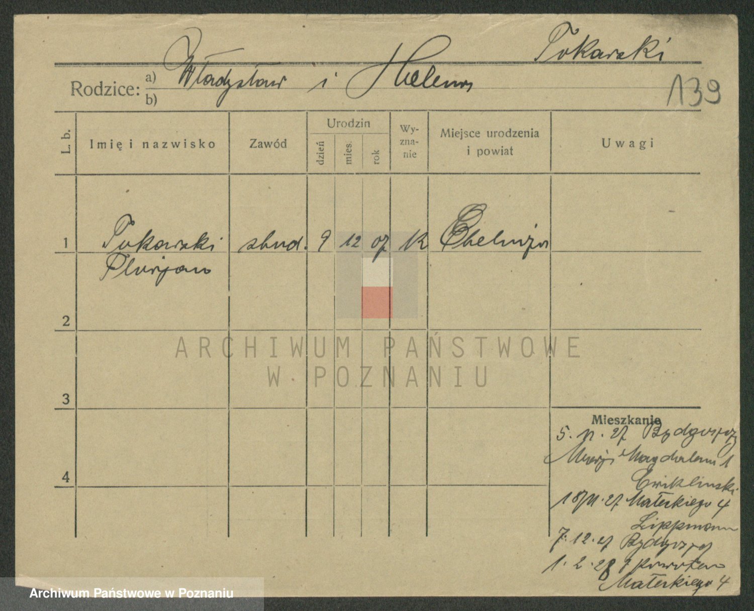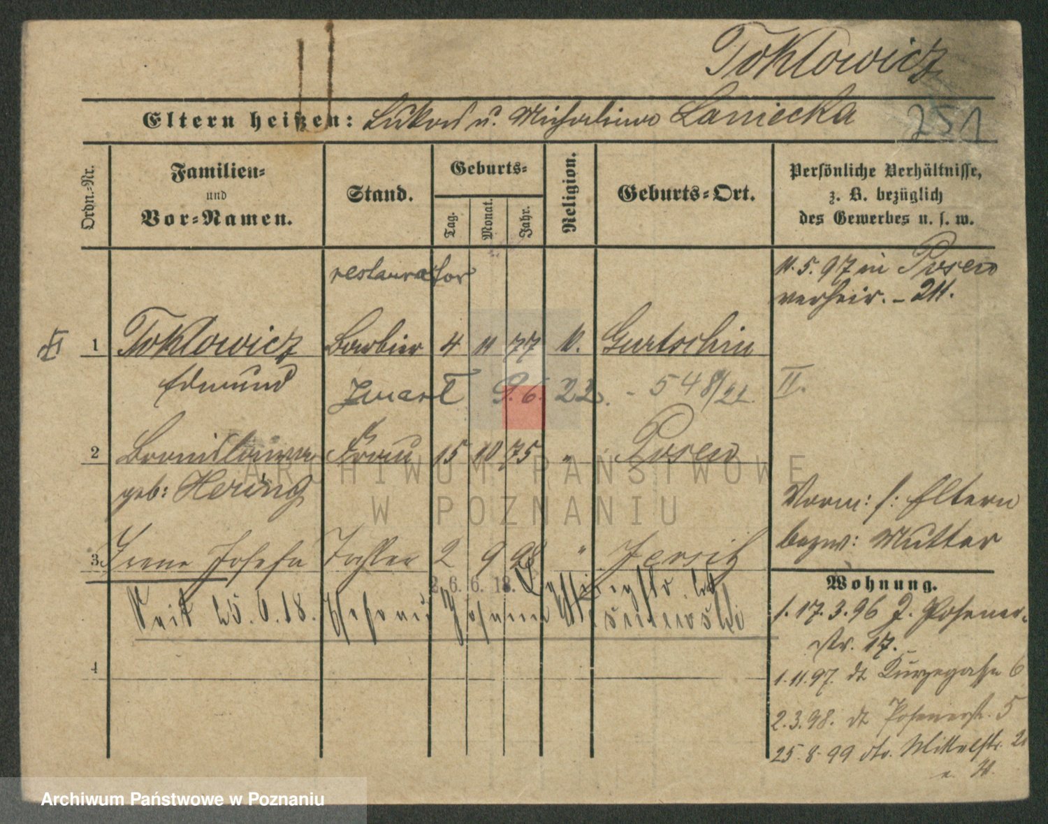 Podgląd karty osobowej dostępny jest po kliknięciu na nazwisko lub ikonkę karty. Można dokonywać powiększenia (ikony na górze) lub przechodzić między kolejnymi skanami (strzałki po bokach).
