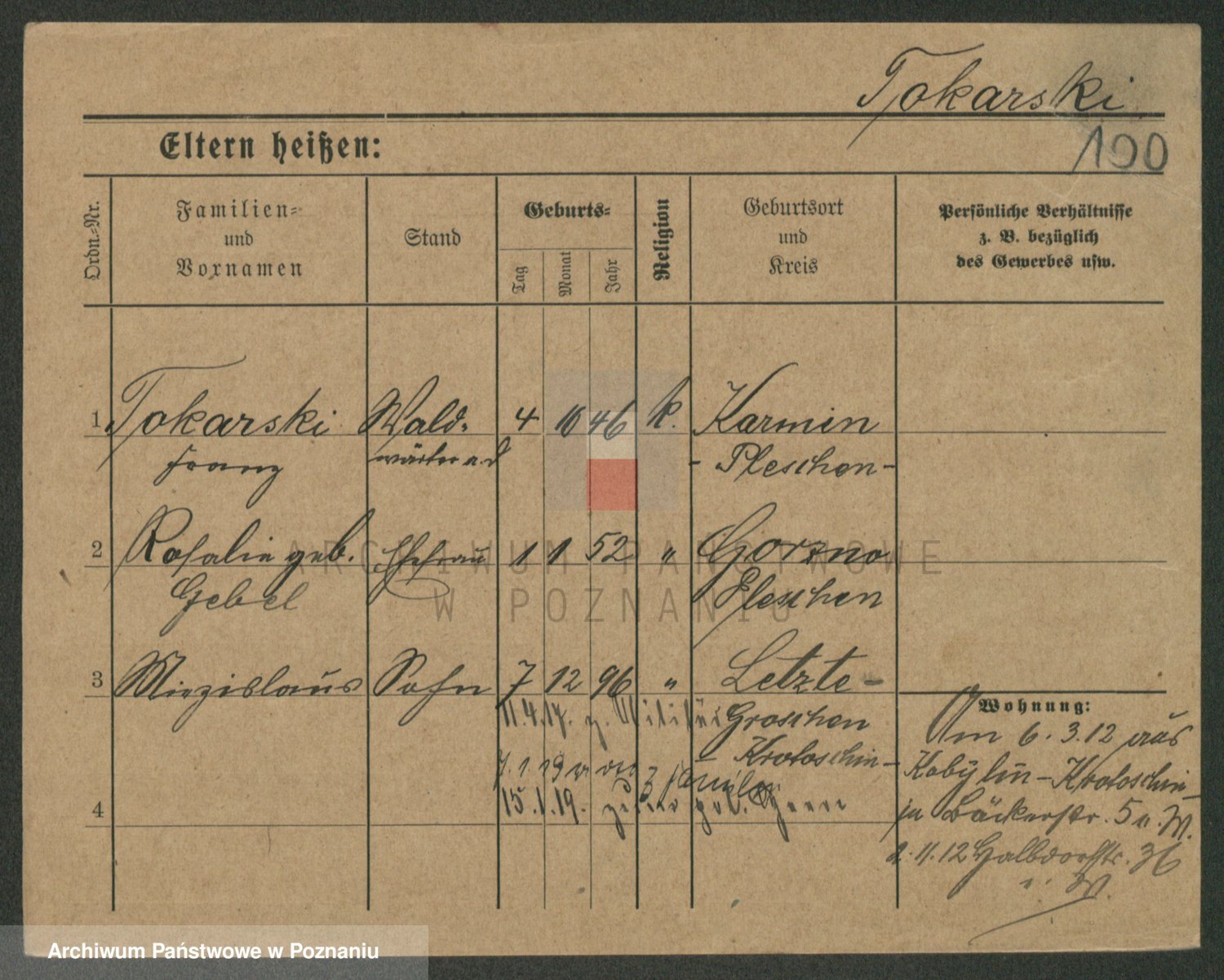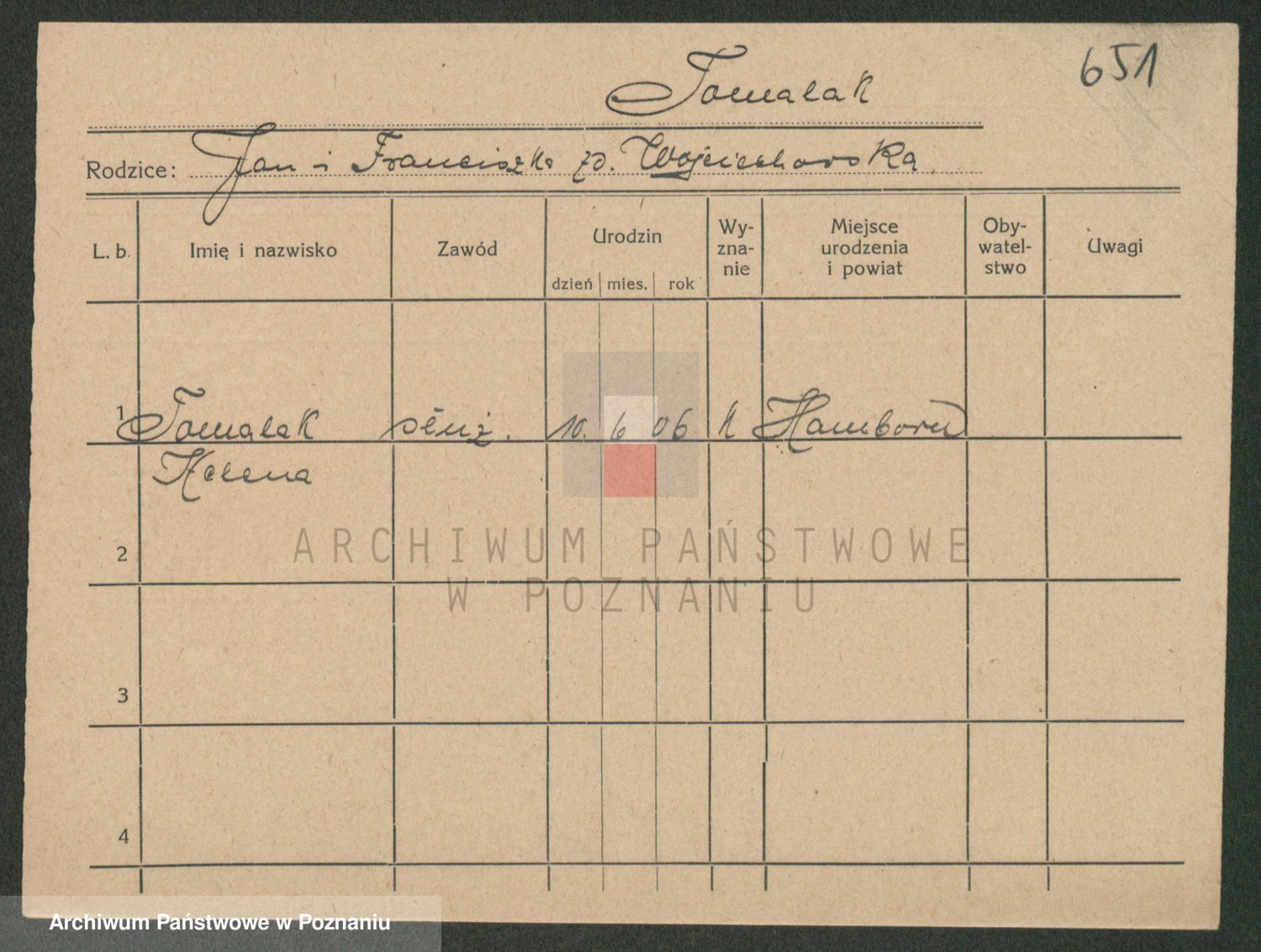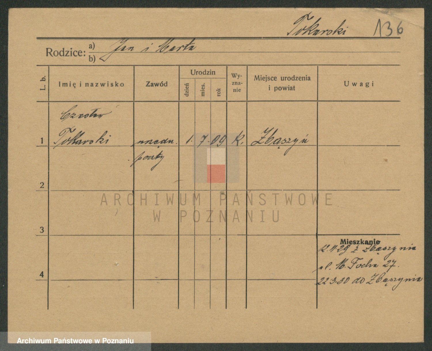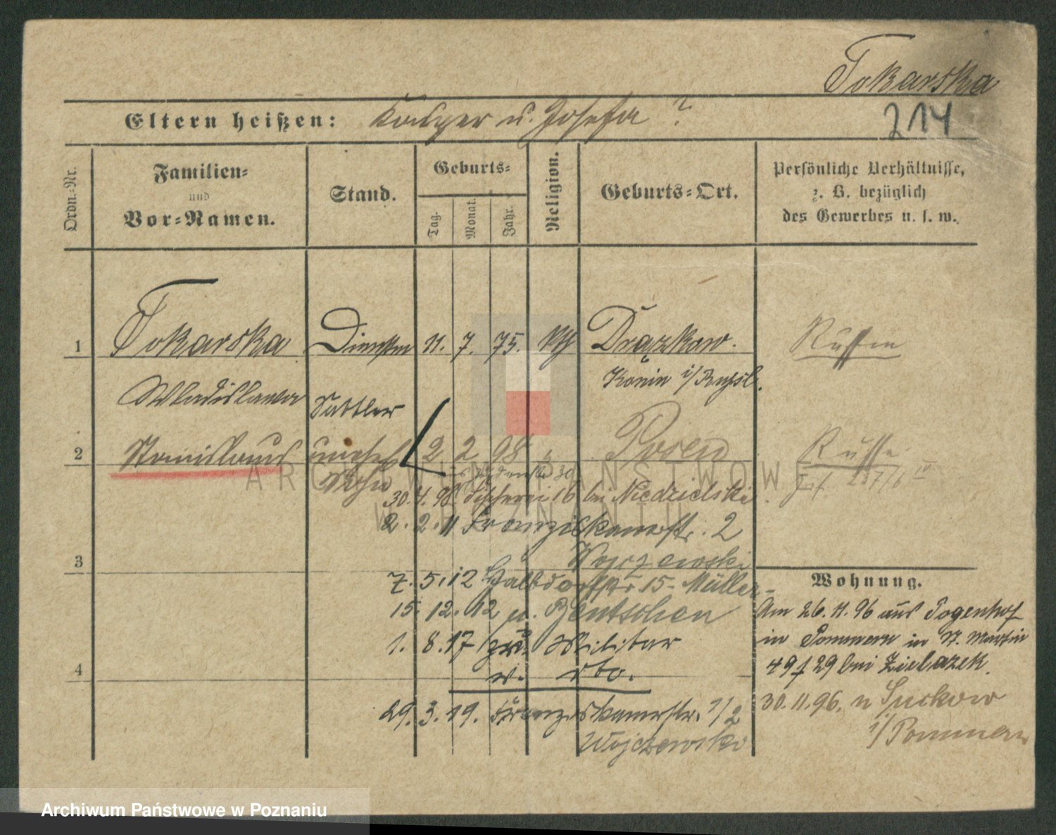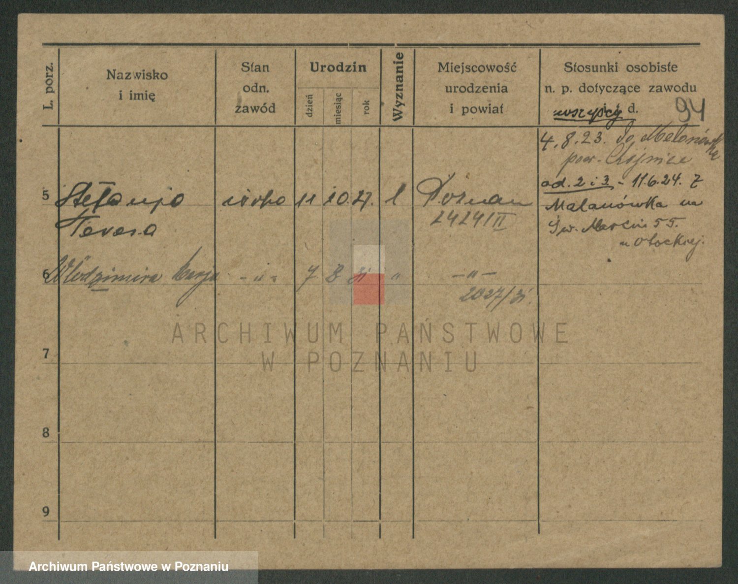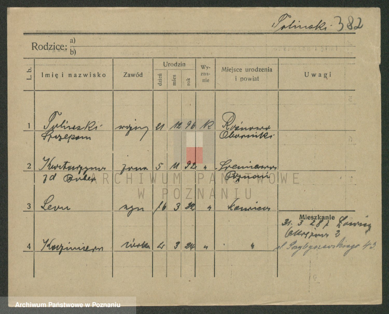Podgląd karty osobowej dostępny jest po kliknięciu na nazwisko lub ikonkę karty. Można dokonywać powiększenia (ikony na górze) lub przechodzić między kolejnymi skanami (strzałki po bokach).