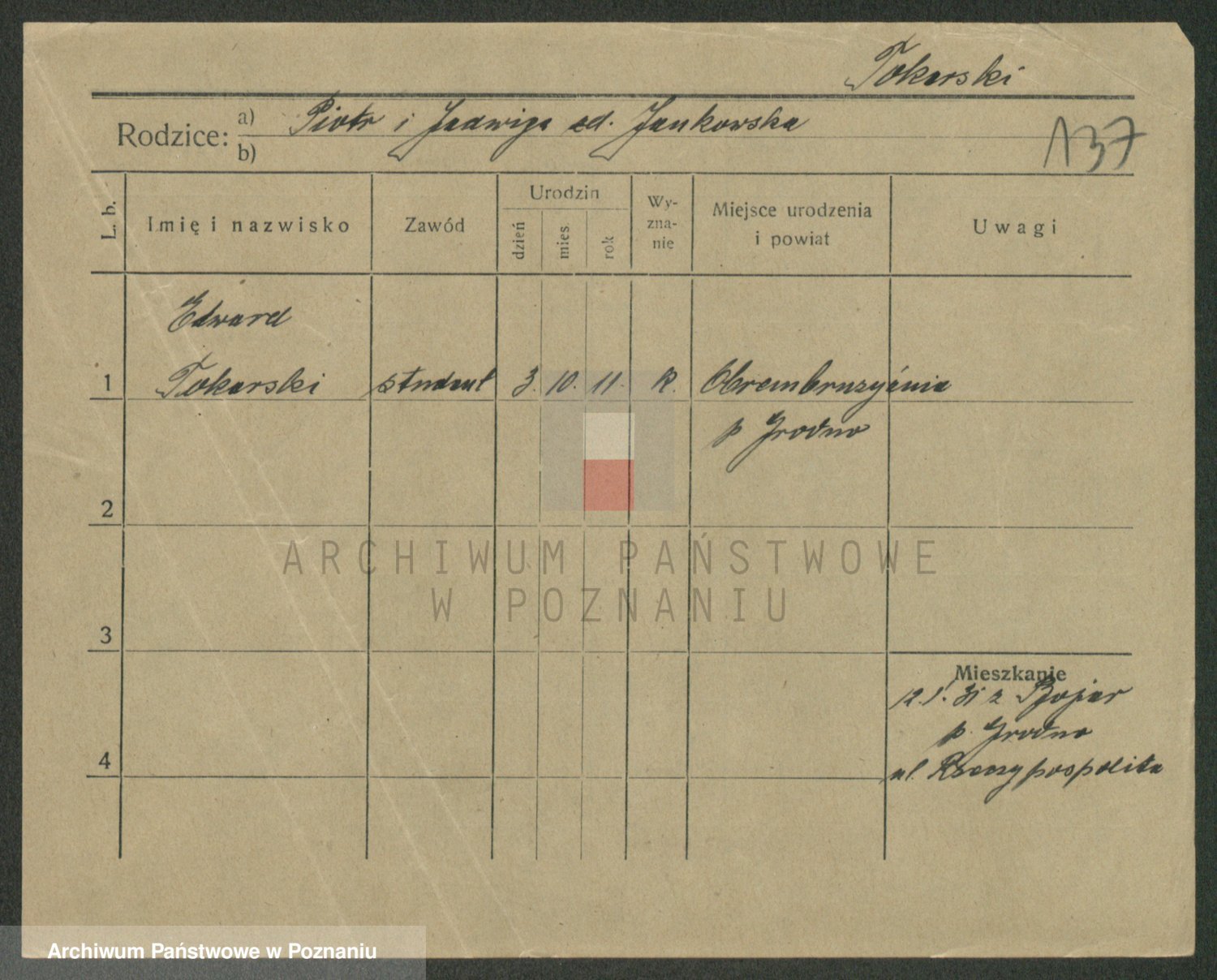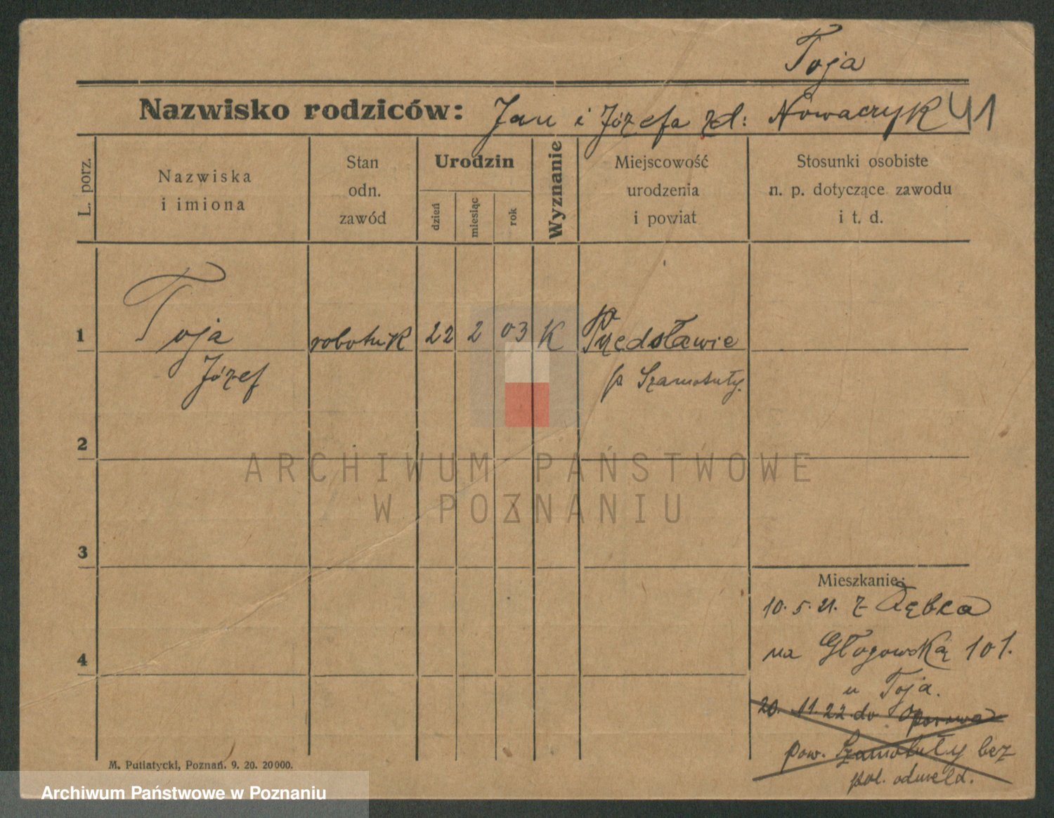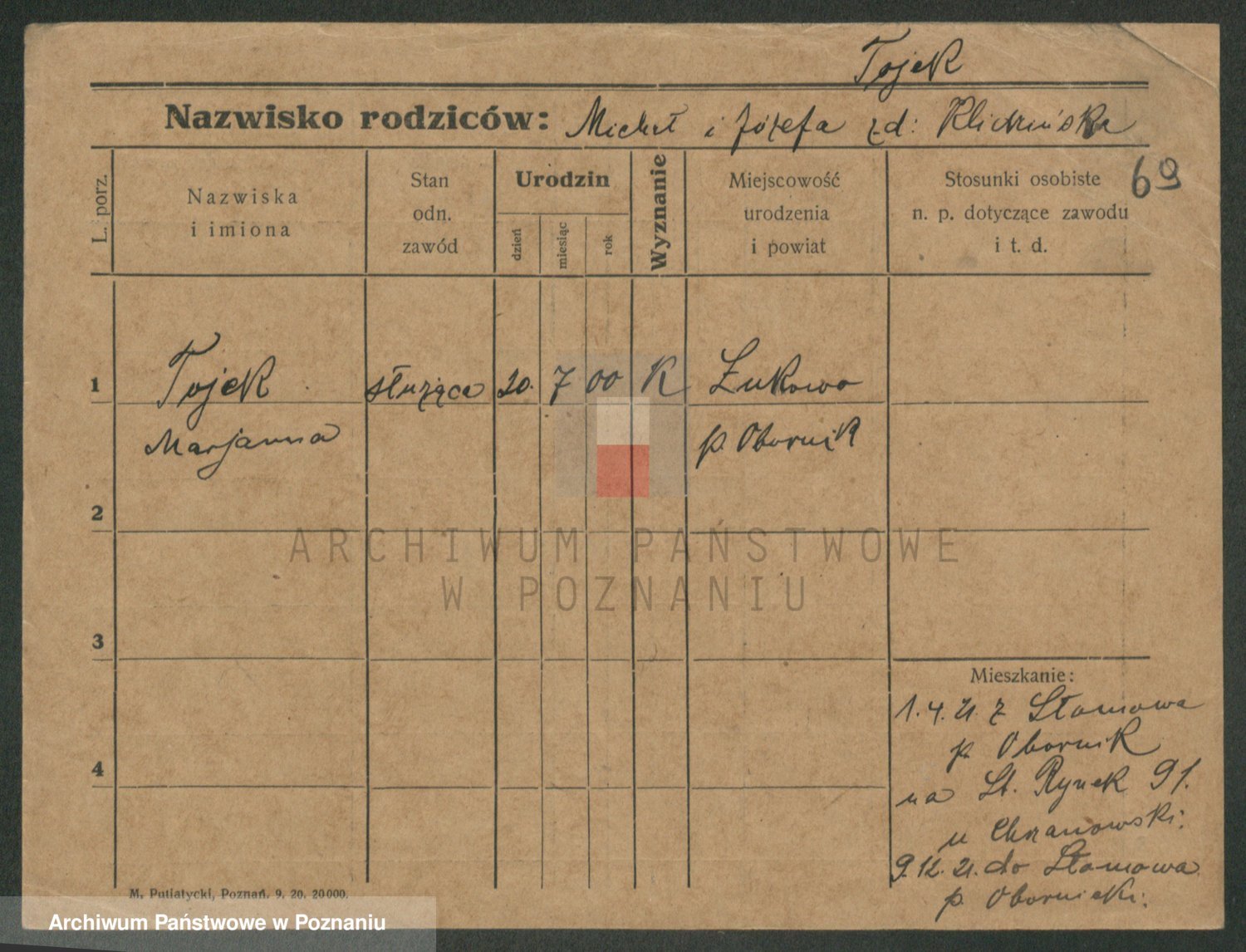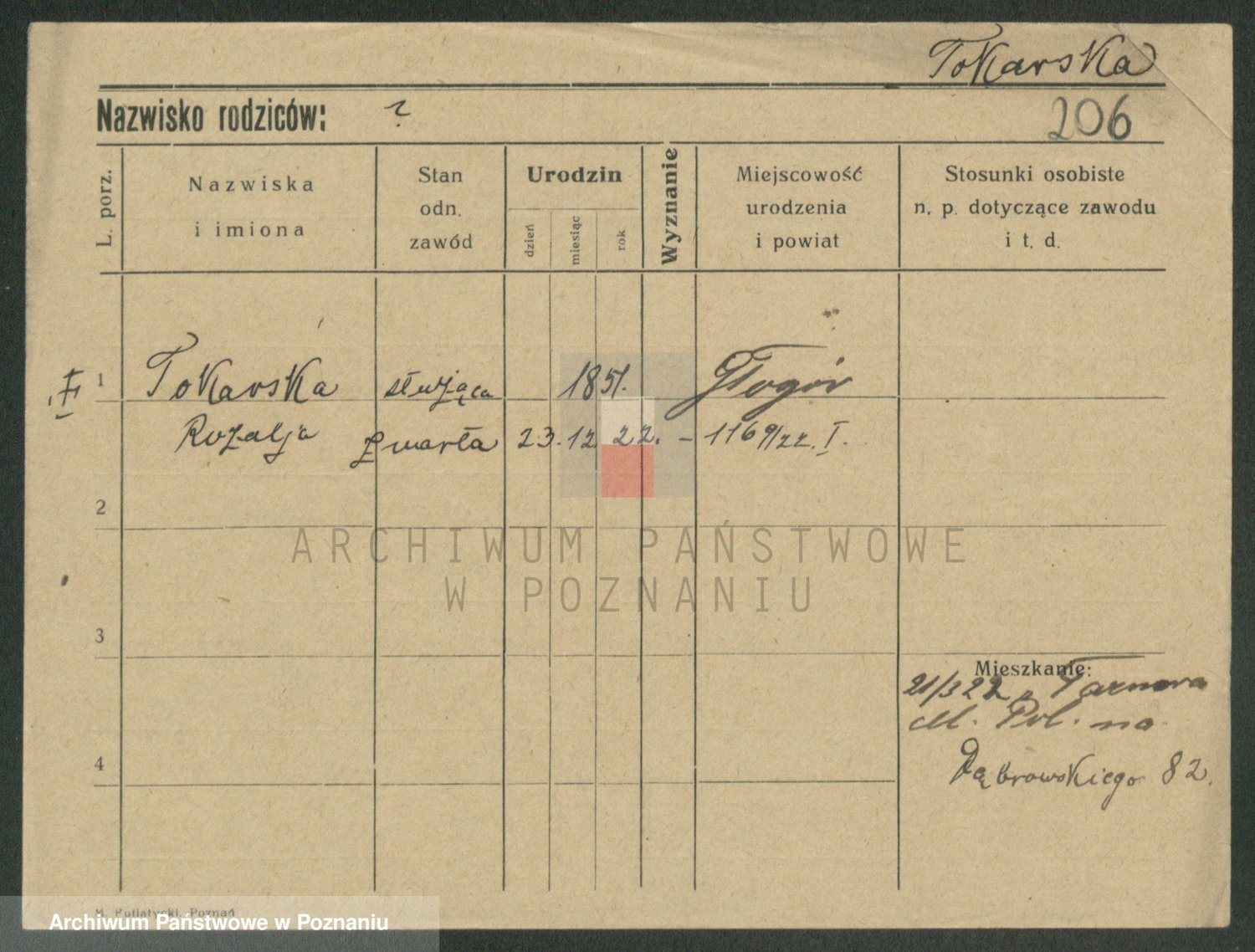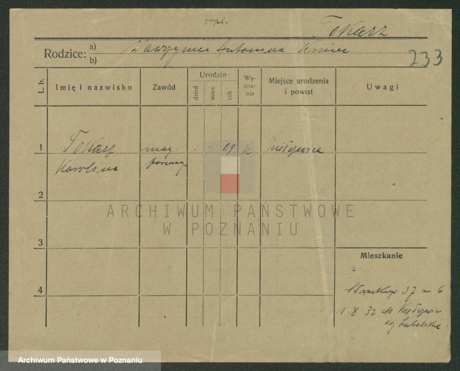 Podgląd karty osobowej dostępny jest po kliknięciu na nazwisko lub ikonkę karty. Można dokonywać powiększenia (ikony na górze) lub przechodzić między kolejnymi skanami (strzałki po bokach).