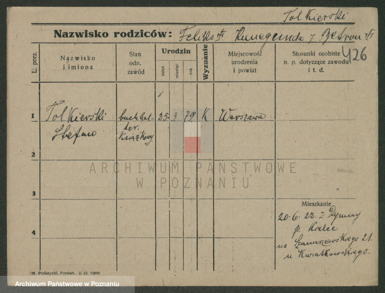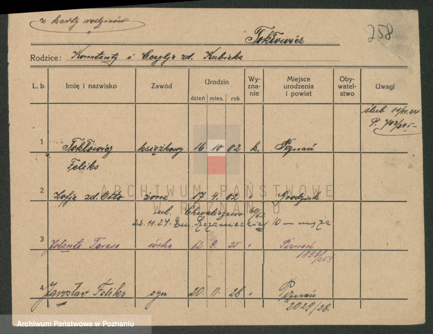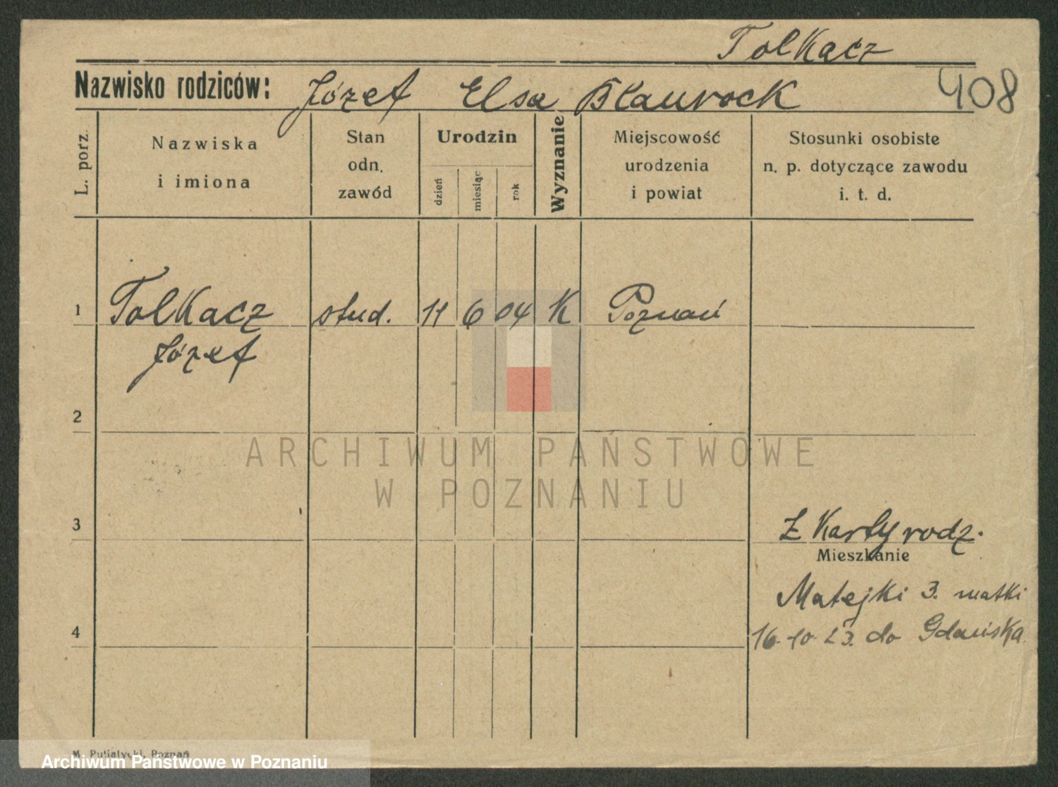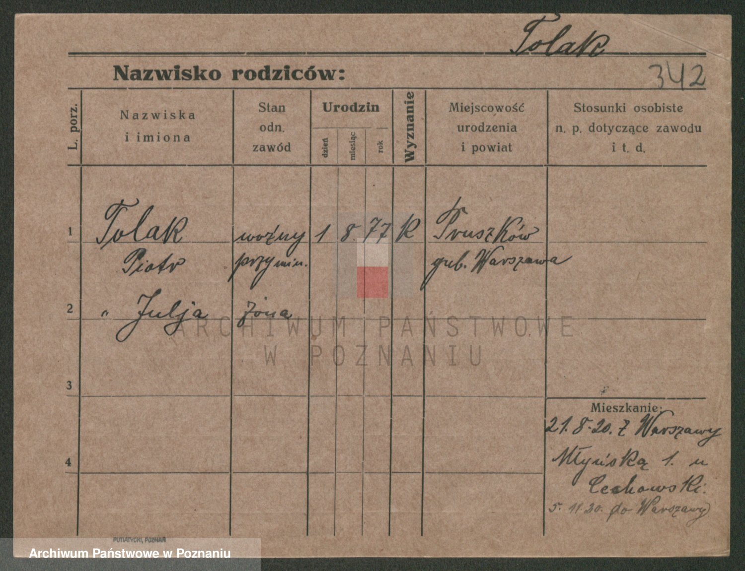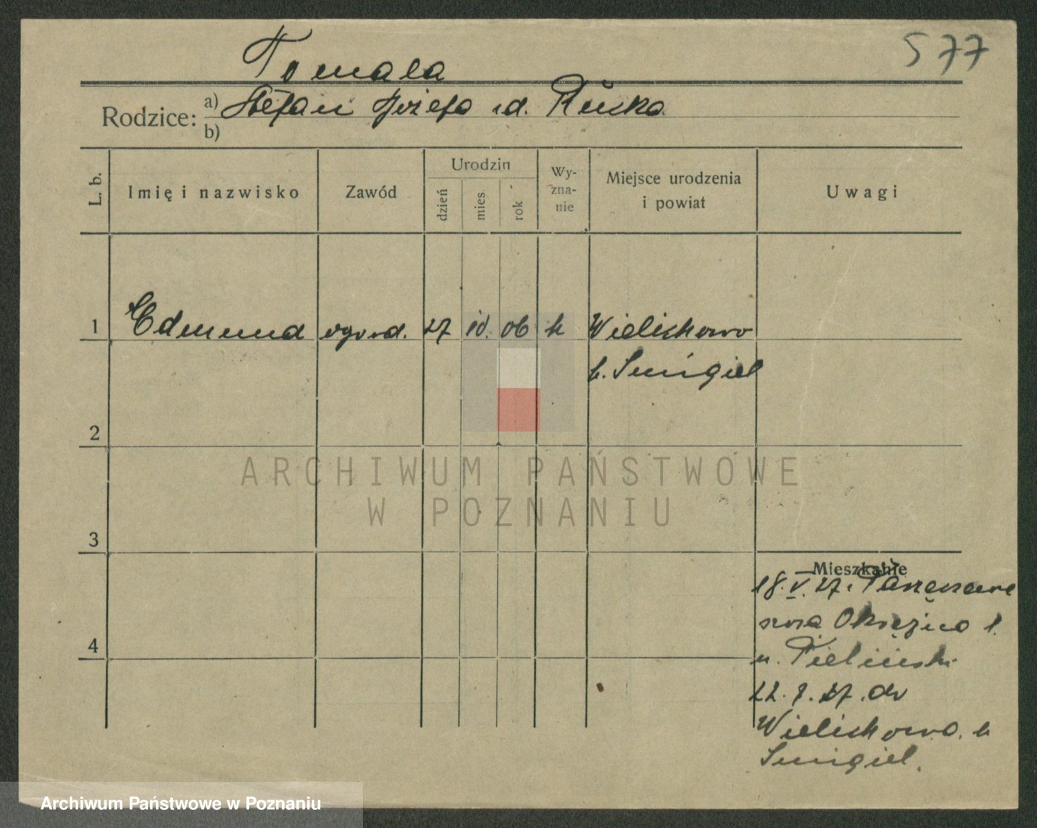 Podgląd karty osobowej dostępny jest po kliknięciu na nazwisko lub ikonkę karty. Można dokonywać powiększenia (ikony na górze) lub przechodzić między kolejnymi skanami (strzałki po bokach).